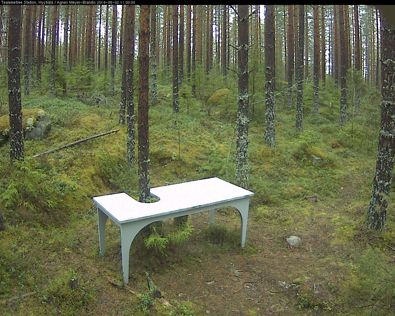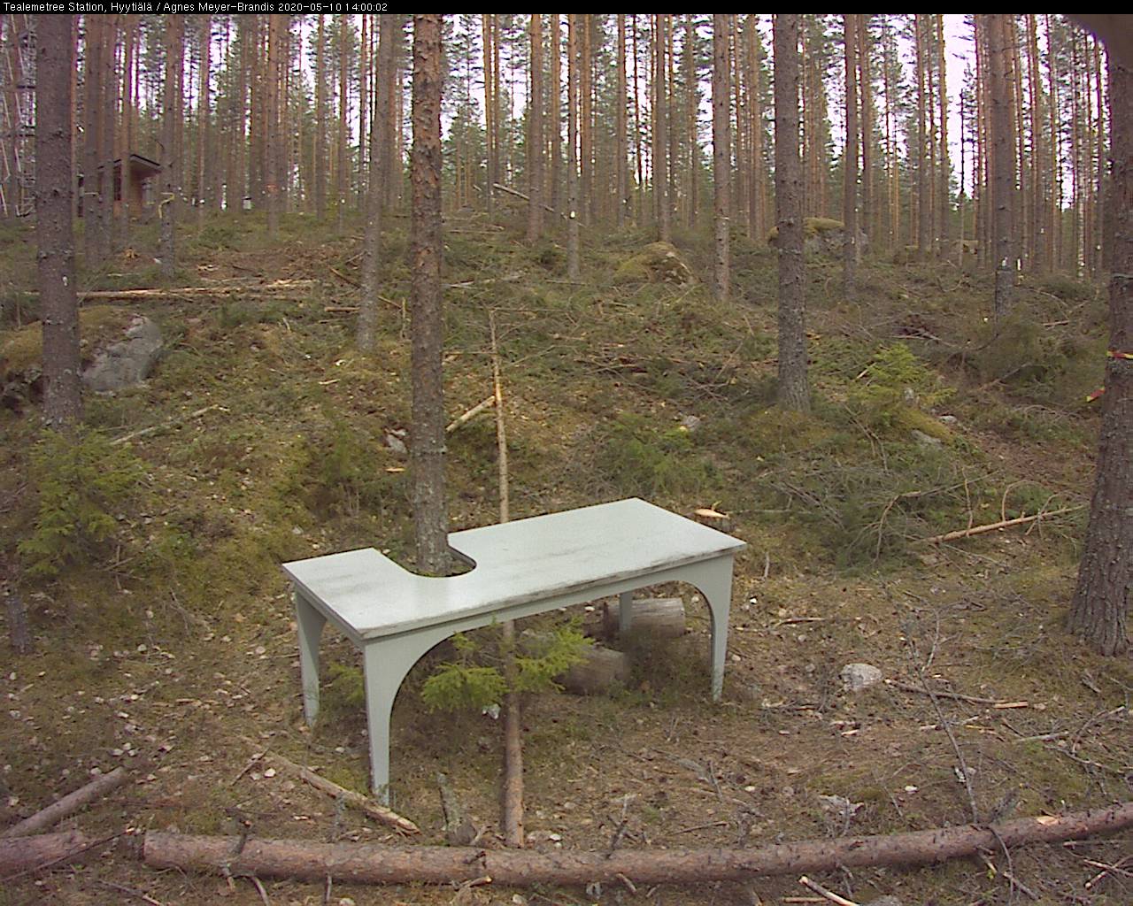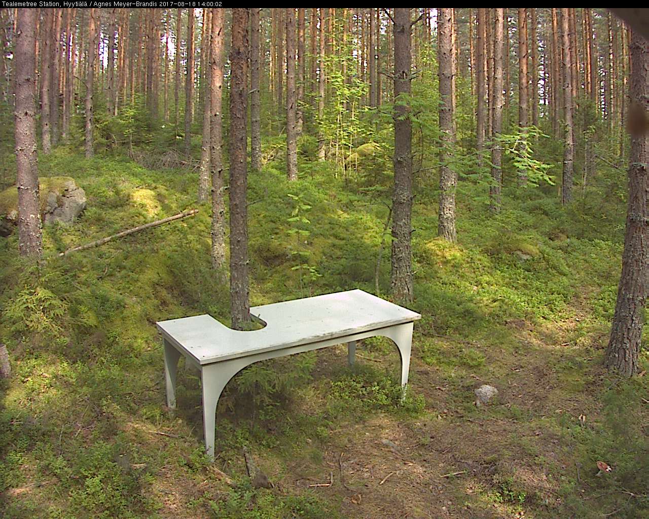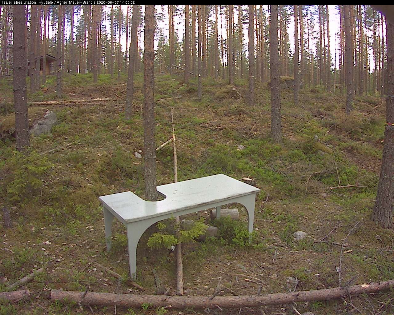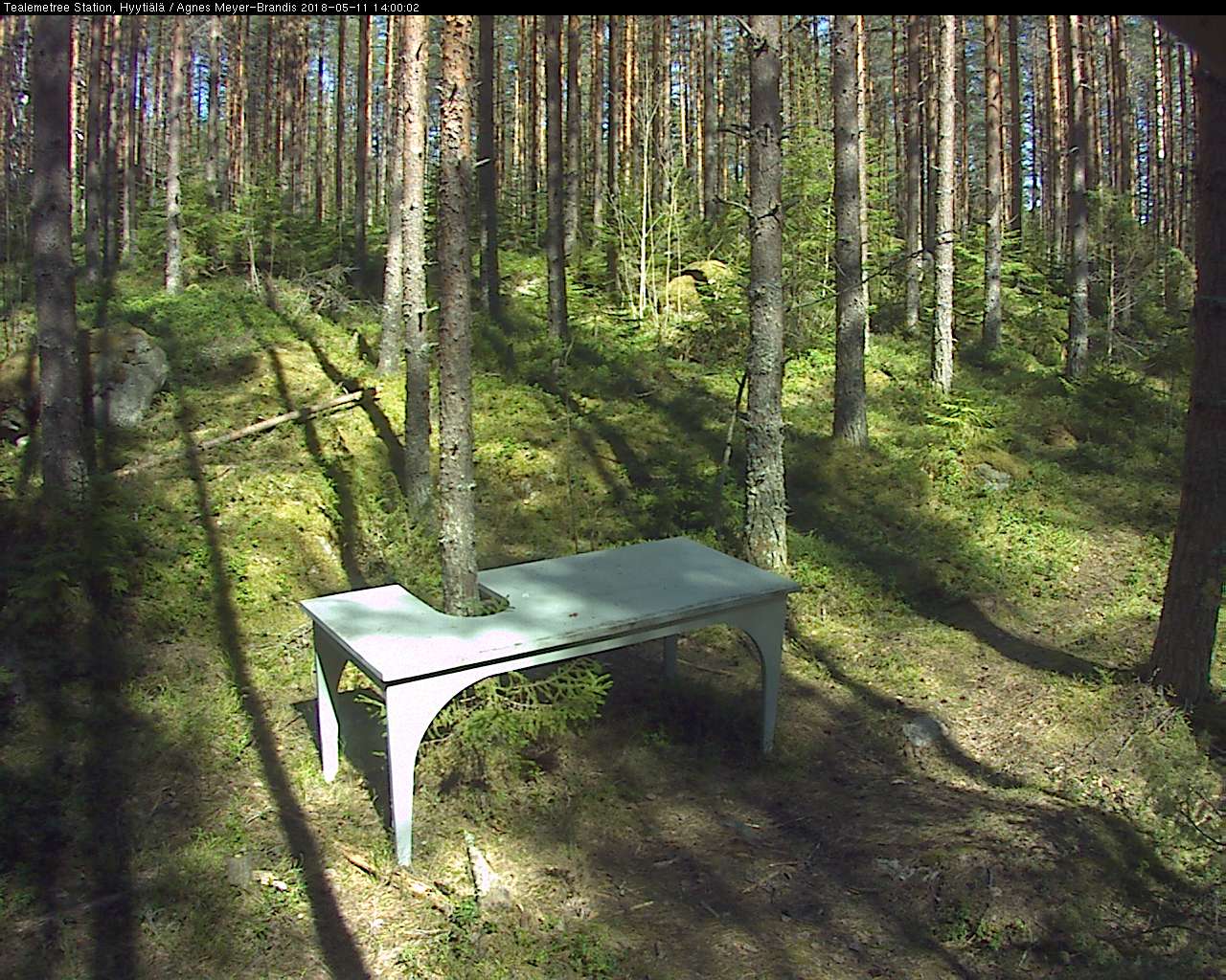 Agnes Meyer-Brandiksen työ Hyytiälässä alkoi tutustumalla aseman muihin tutkijoihin. Pystyäkseen tapaamaan ihmisiä metsässä, hän rakensi pöydän, josta muodostui kohtauspiste ja paikka teehetkille Agneksen ja puun kanssa.