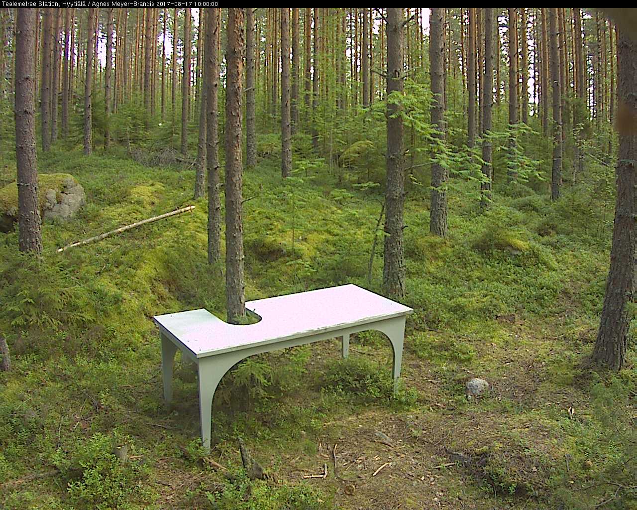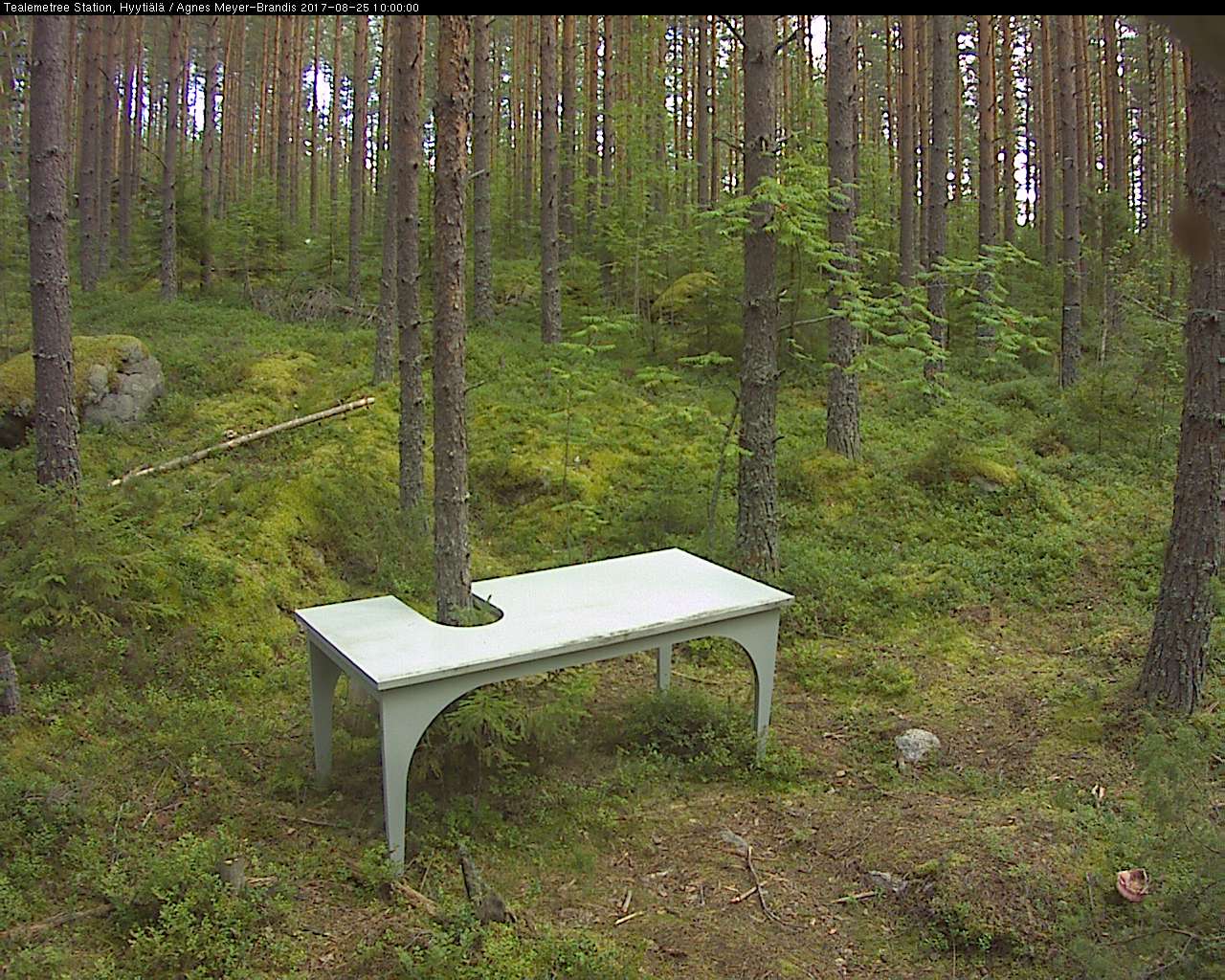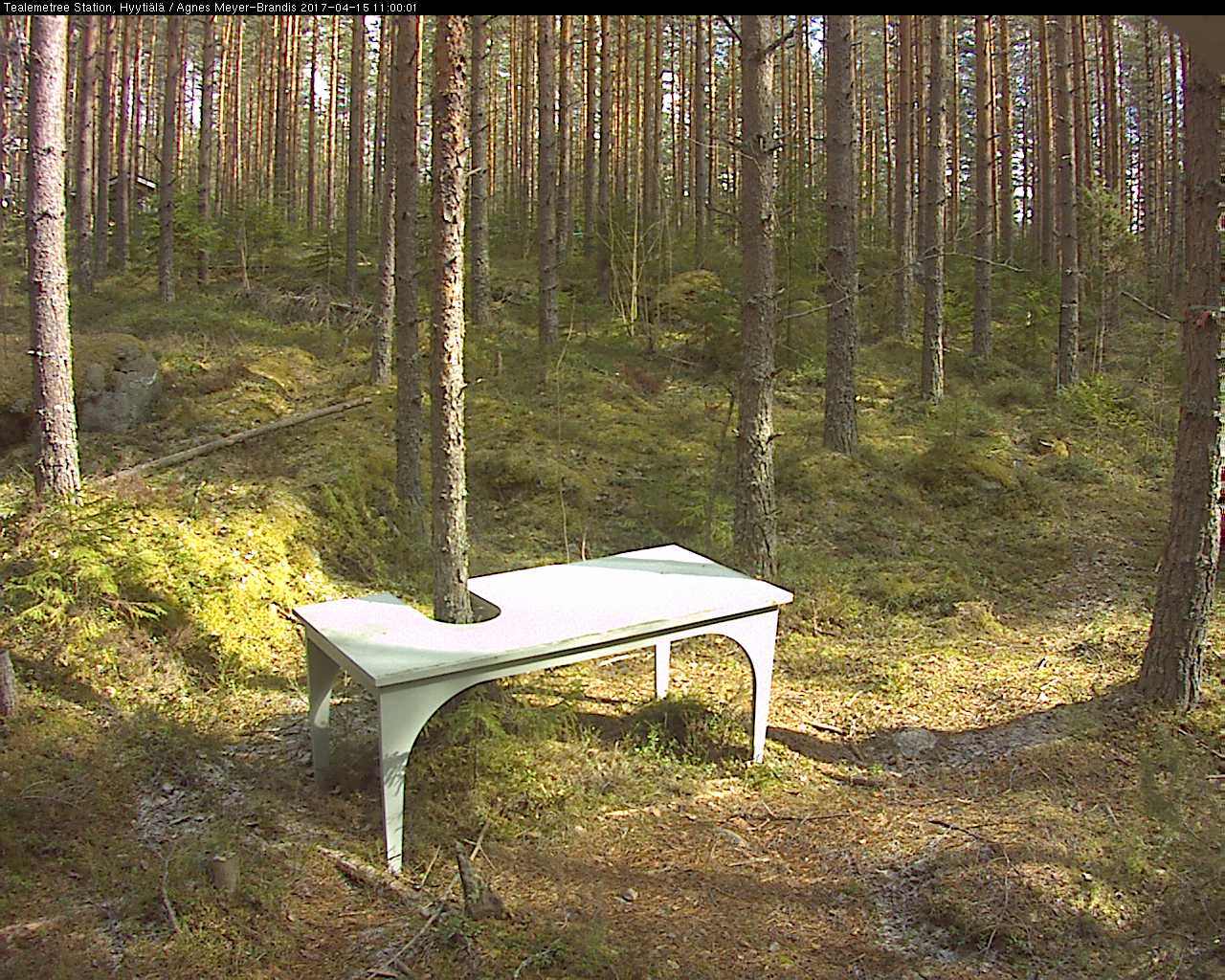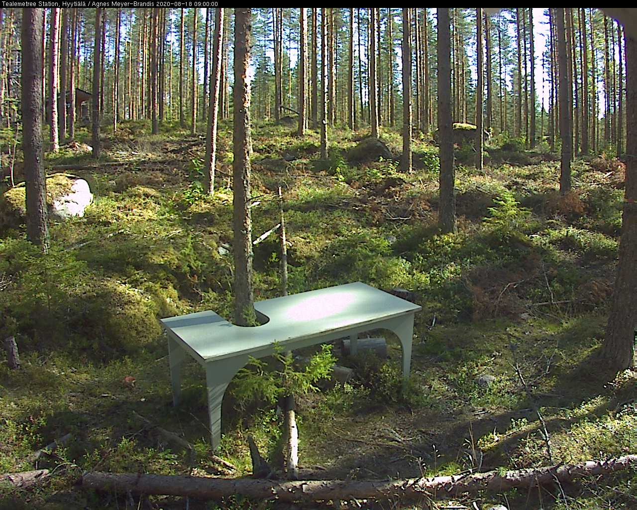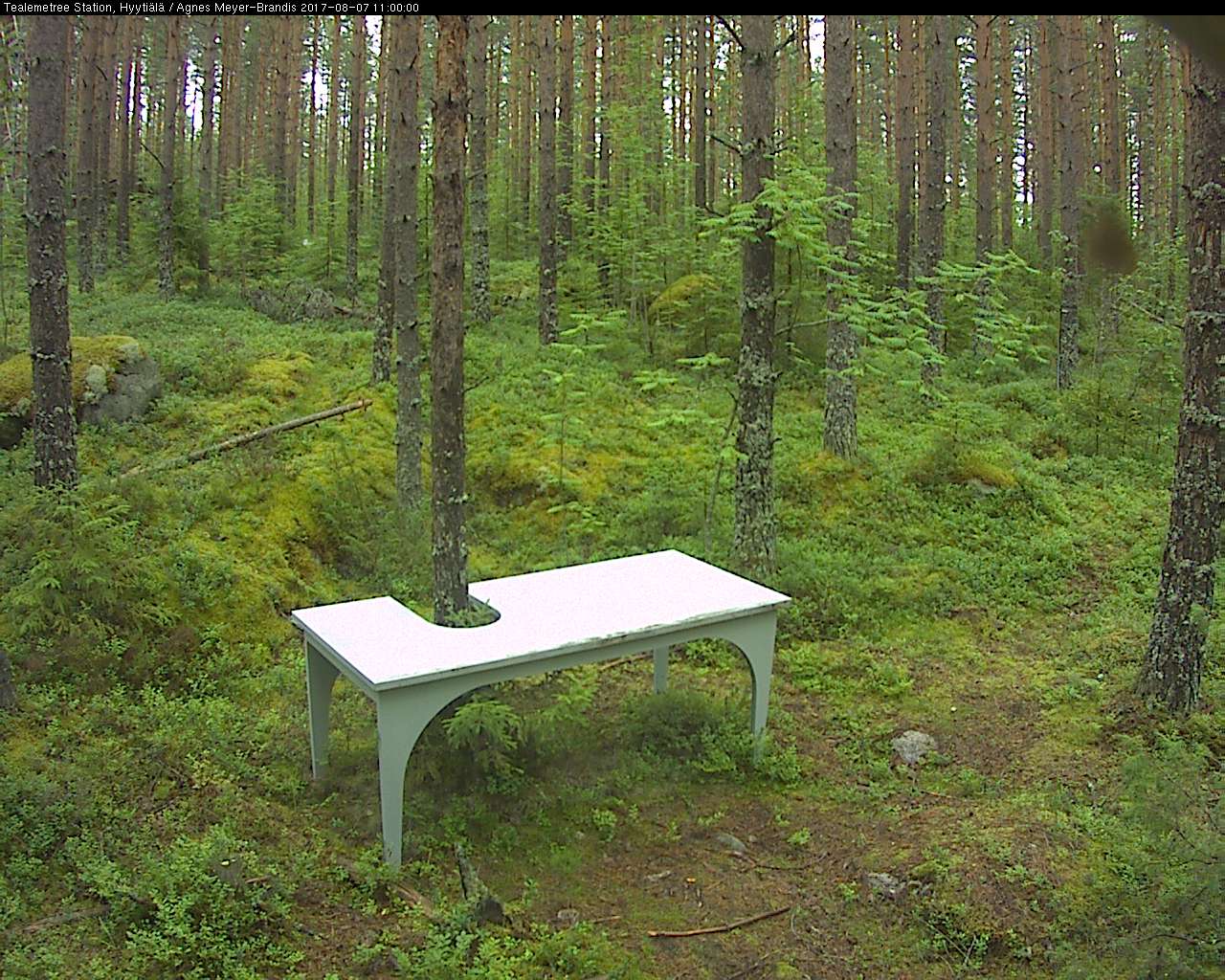 Agnes Meyer-Brandiksen työ Hyytiälässä alkoi tutustumalla aseman muihin tutkijoihin. Pystyäkseen tapaamaan ihmisiä metsässä, hän rakensi pöydän, josta muodostui kohtauspiste ja paikka teehetkille Agneksen ja puun kanssa.