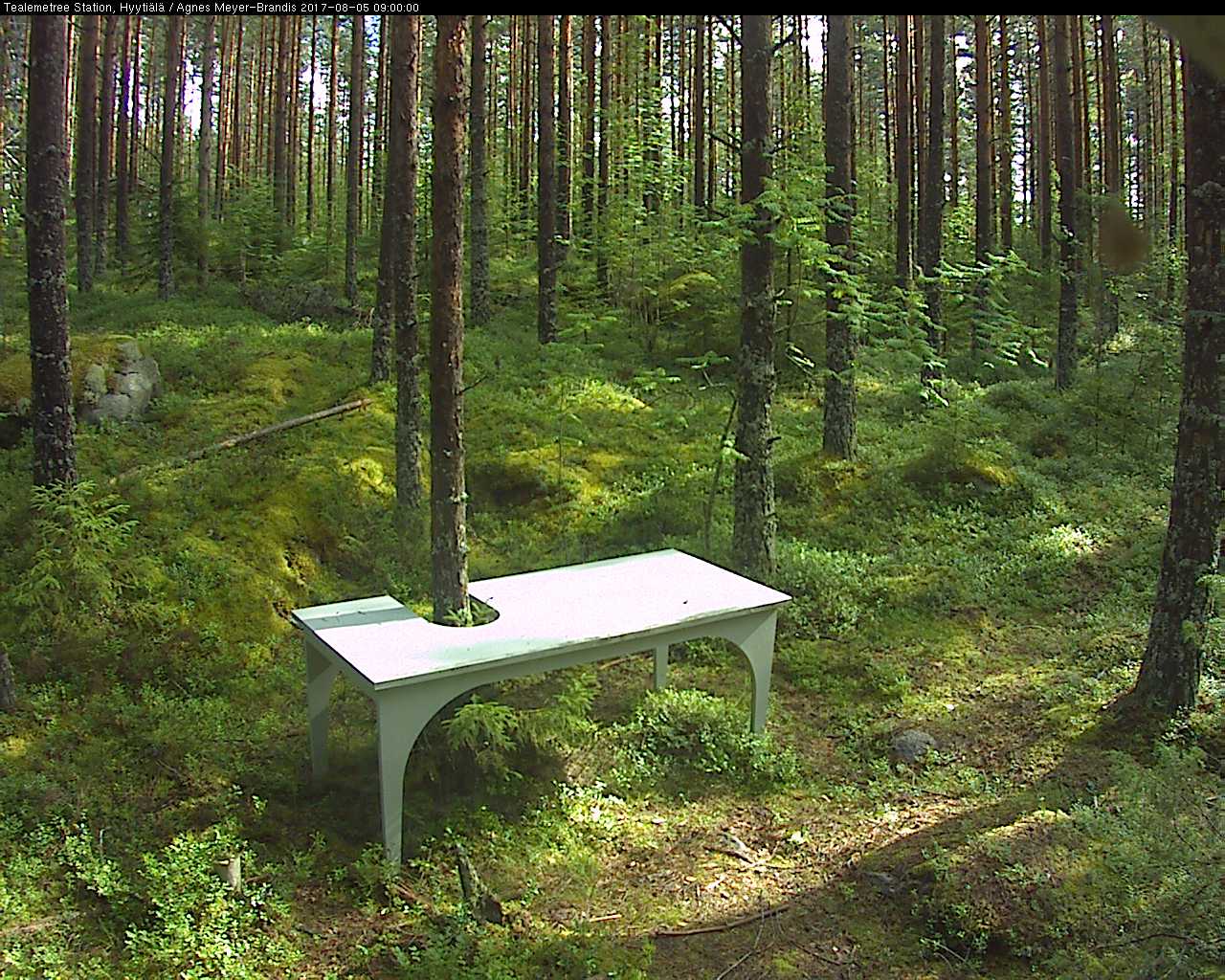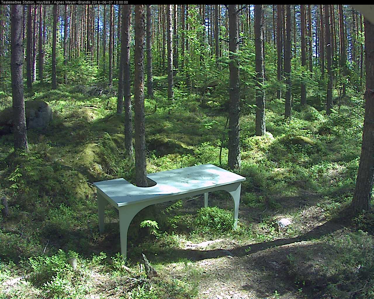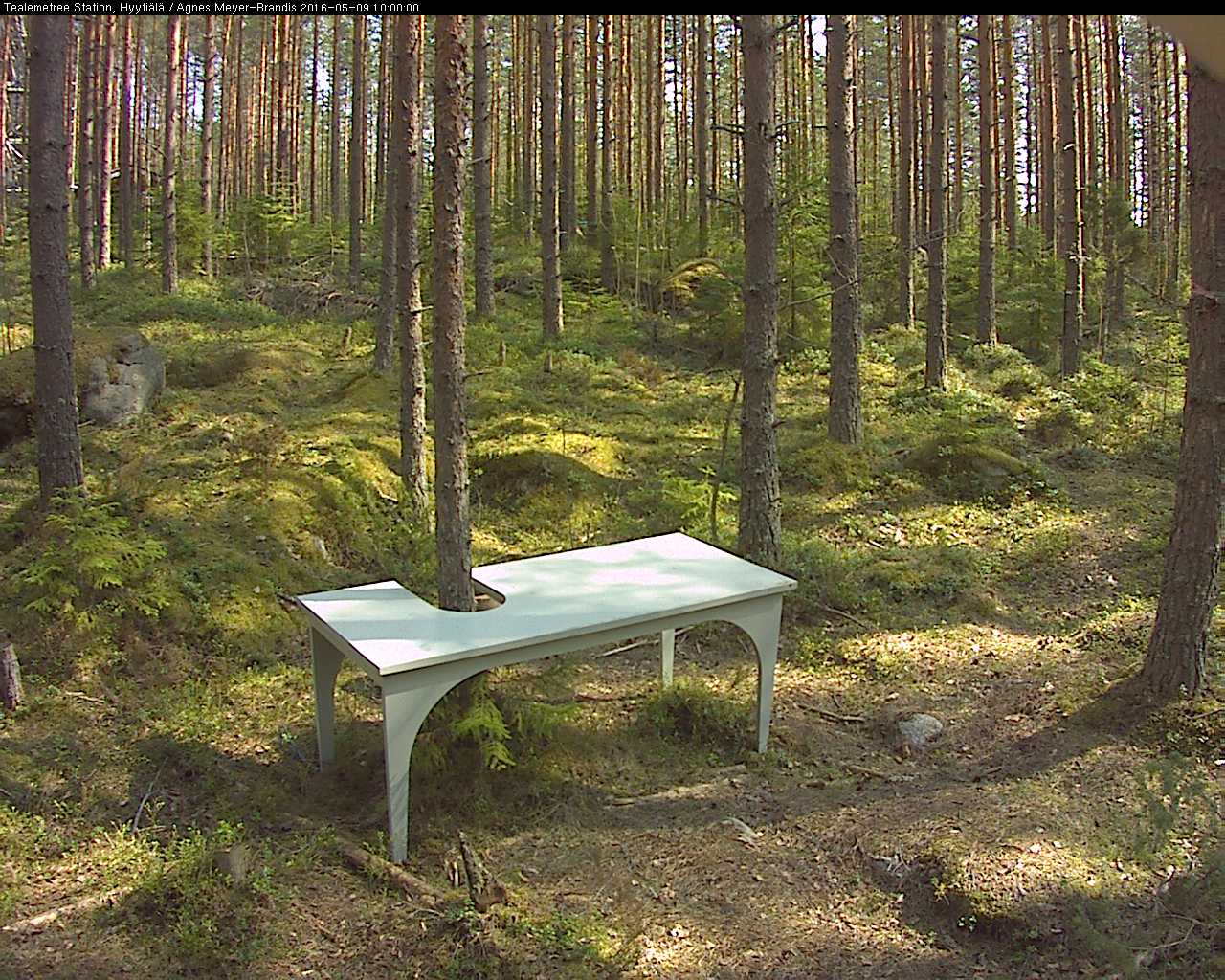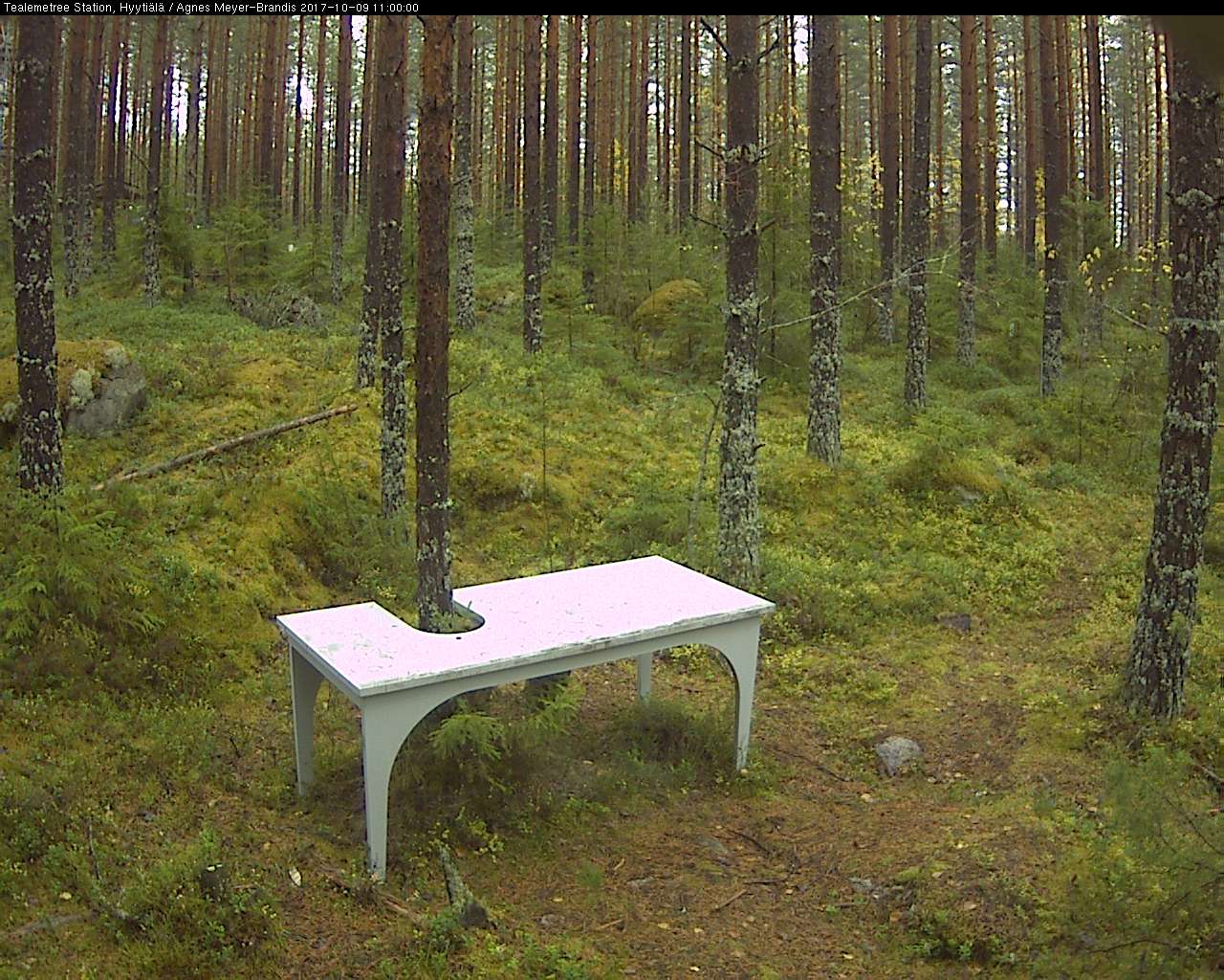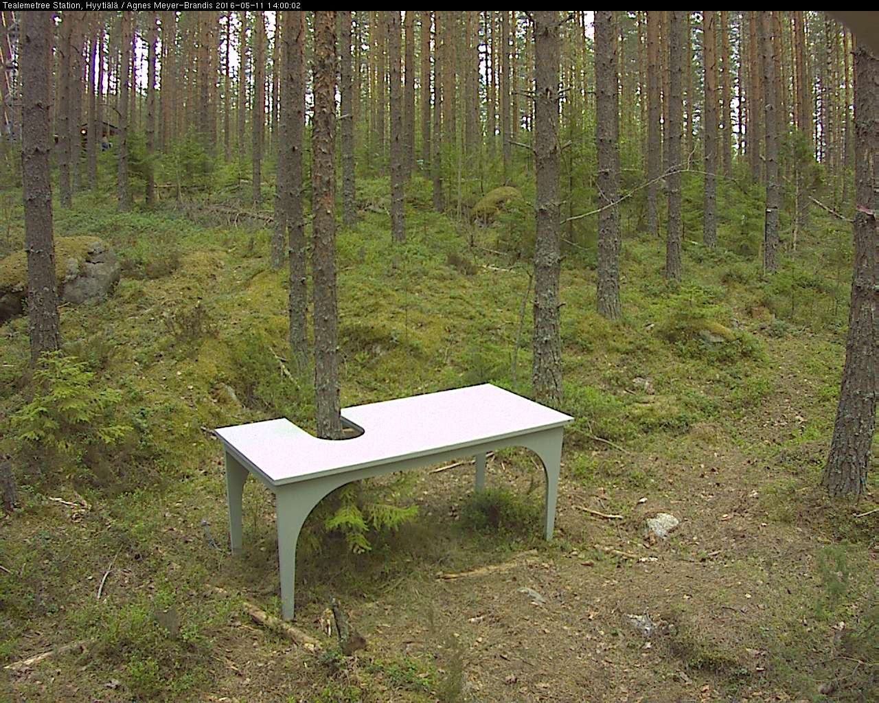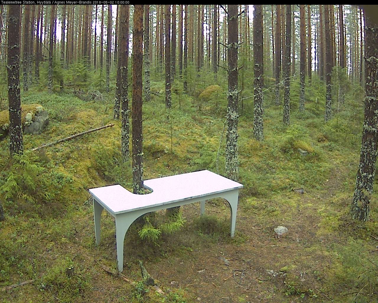 Agnes Meyer-Brandiksen työ Hyytiälässä alkoi tutustumalla aseman muihin tutkijoihin. Pystyäkseen tapaamaan ihmisiä metsässä, hän rakensi pöydän, josta muodostui kohtauspiste ja paikka teehetkille Agneksen ja puun kanssa.