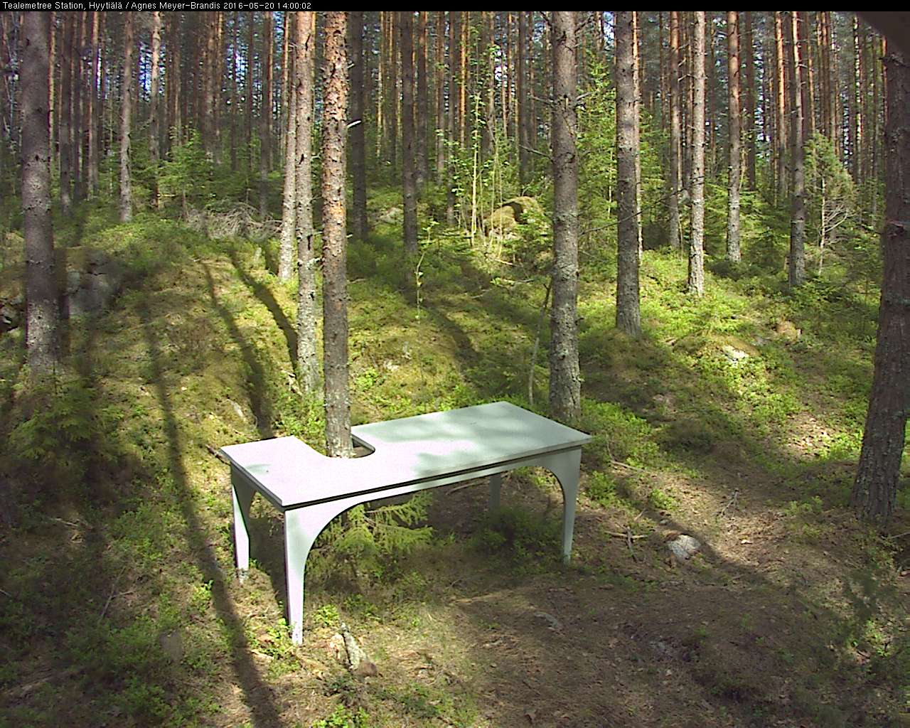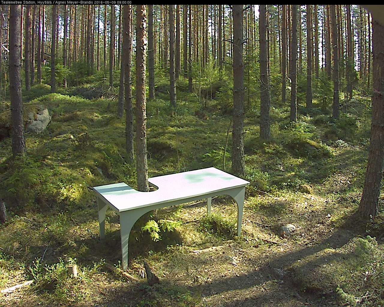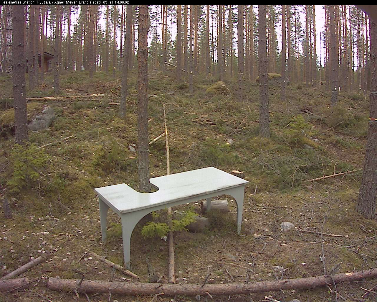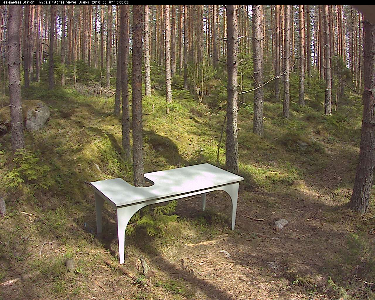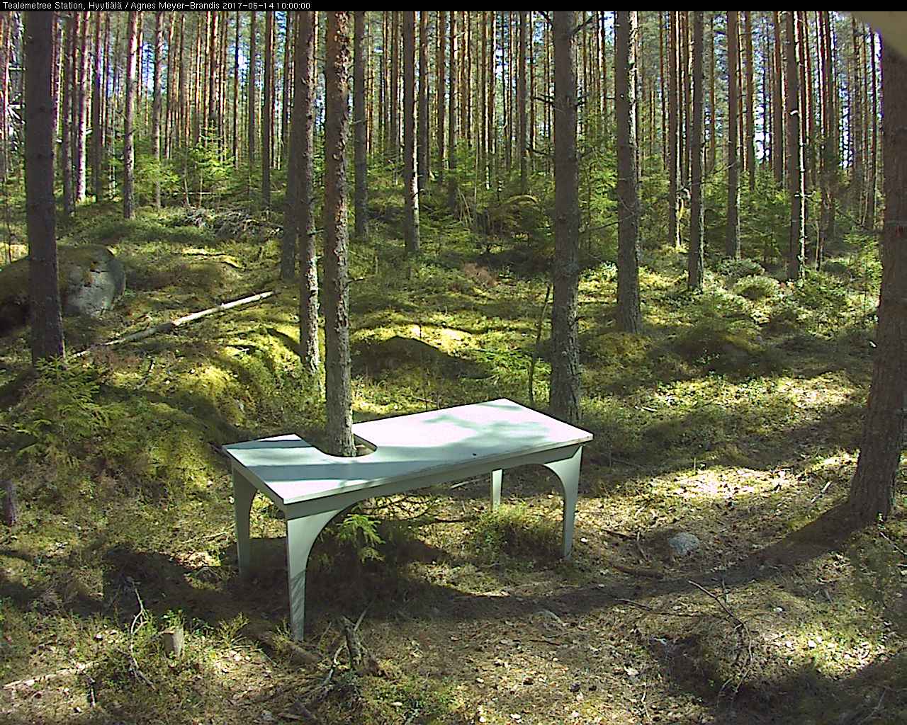 Agnes Meyer-Brandiksen työ Hyytiälässä alkoi tutustumalla aseman muihin tutkijoihin. Pystyäkseen tapaamaan ihmisiä metsässä, hän rakensi pöydän, josta muodostui kohtauspiste ja paikka teehetkille Agneksen ja puun kanssa.
