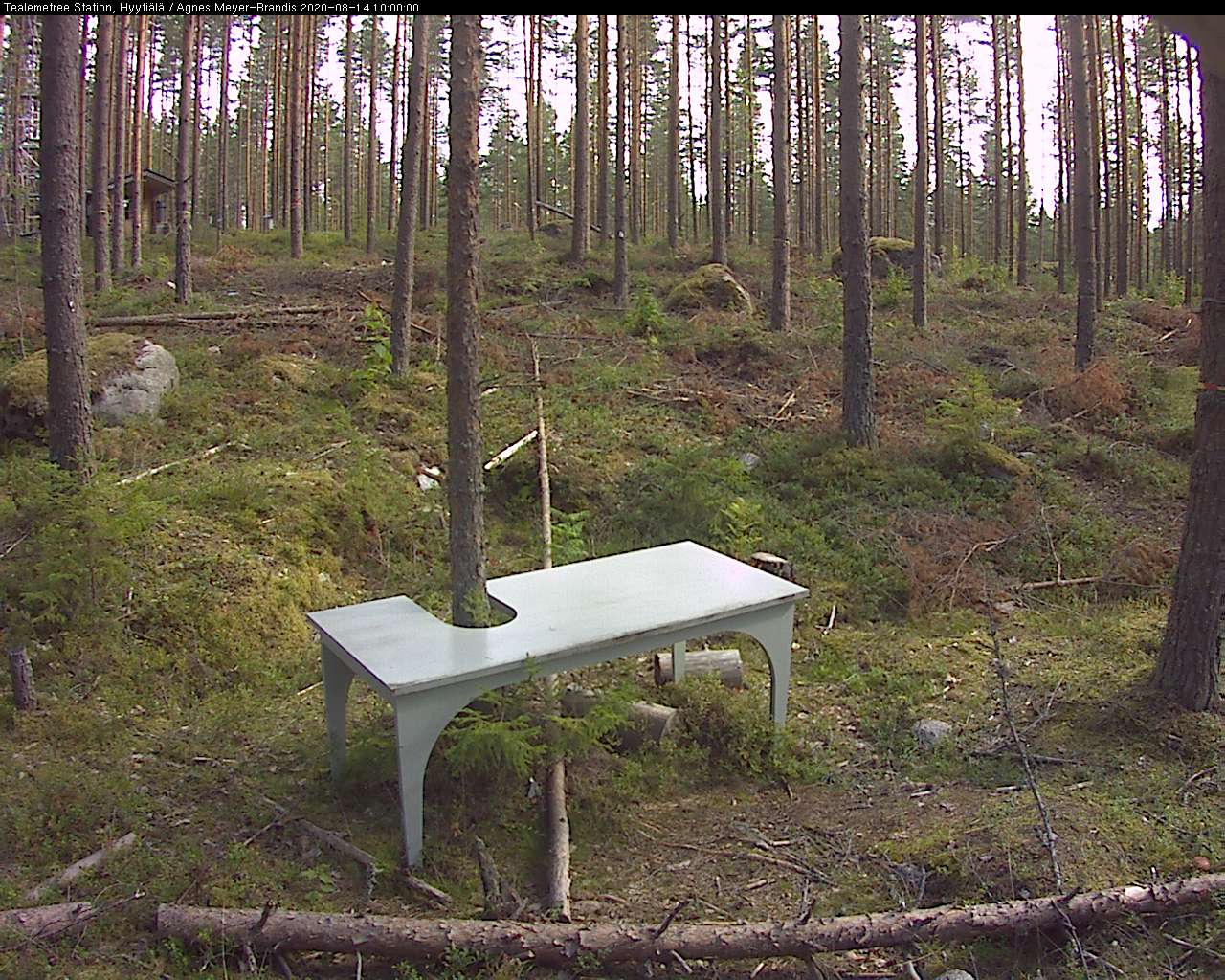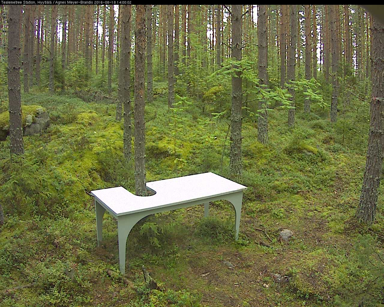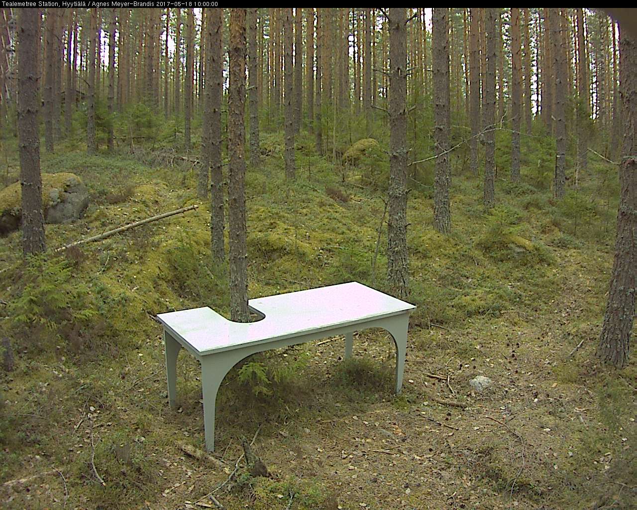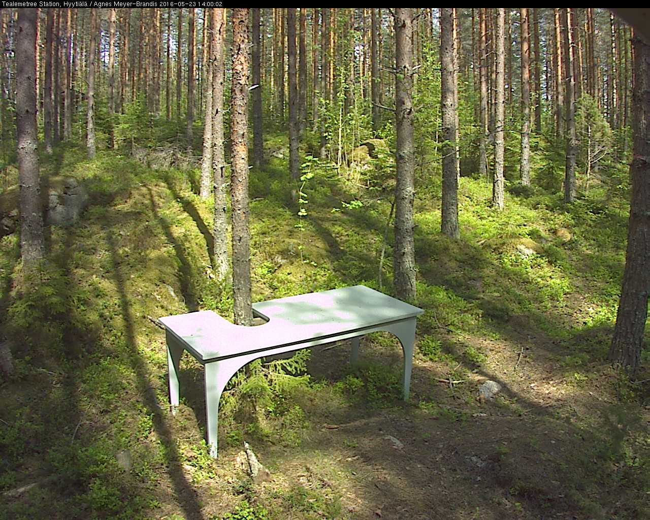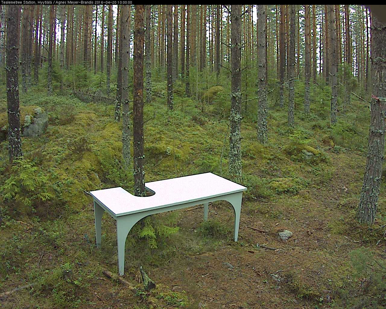 Agnes Meyer-Brandiksen työ Hyytiälässä alkoi tutustumalla aseman muihin tutkijoihin. Pystyäkseen tapaamaan ihmisiä metsässä, hän rakensi pöydän, josta muodostui kohtauspiste ja paikka teehetkille Agneksen ja puun kanssa.