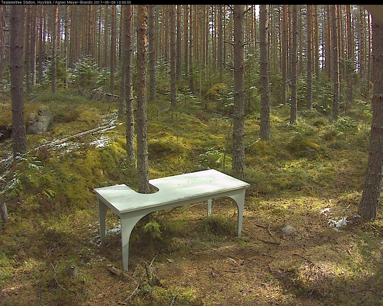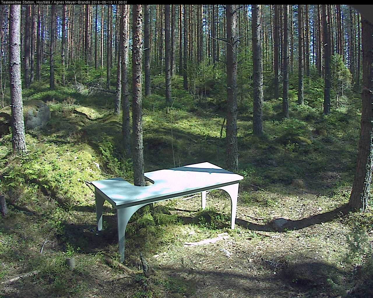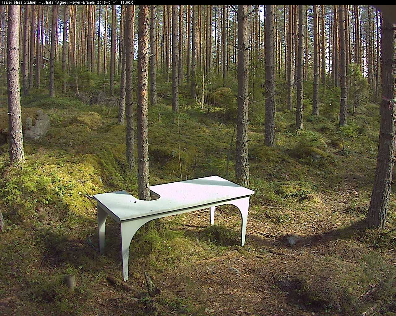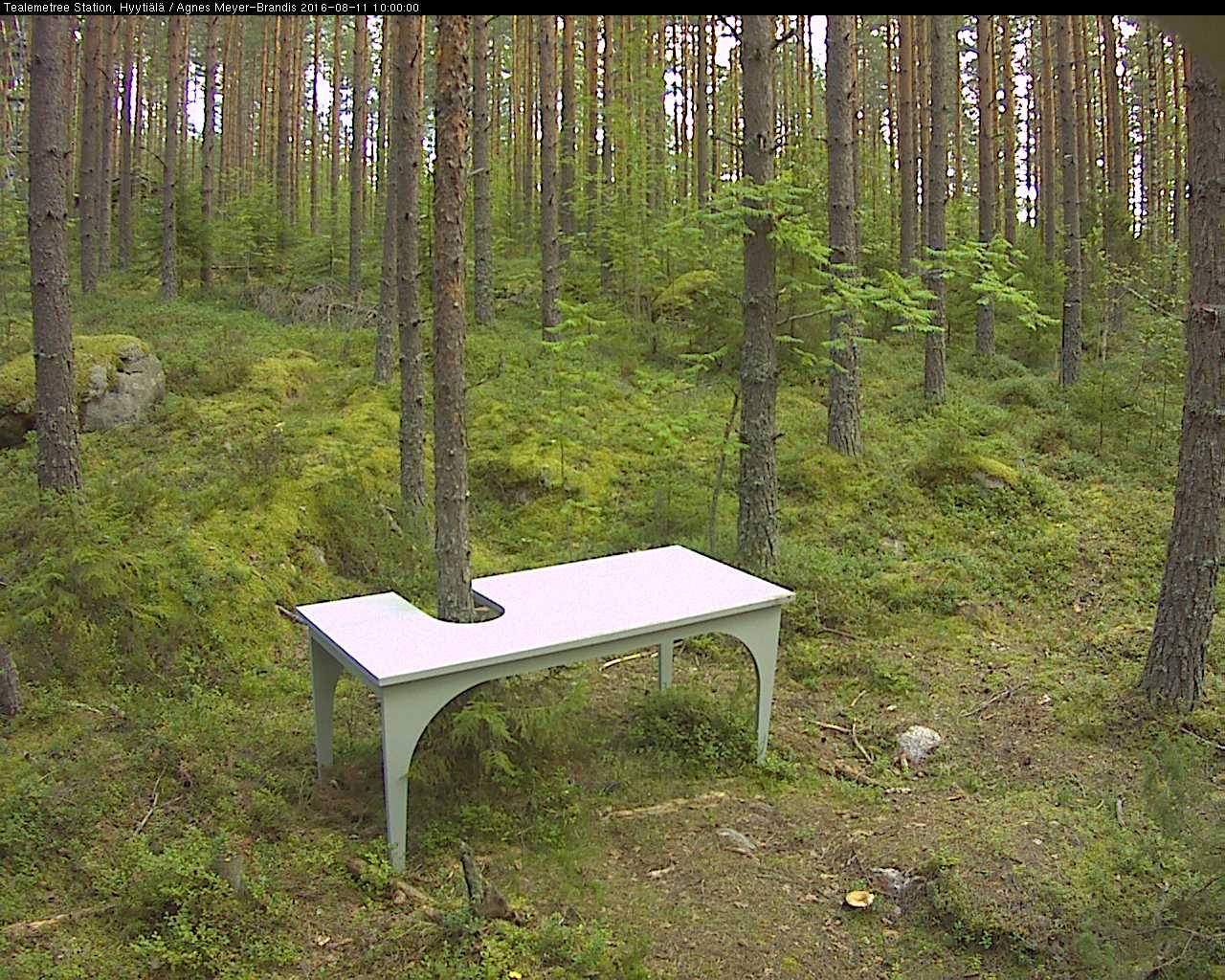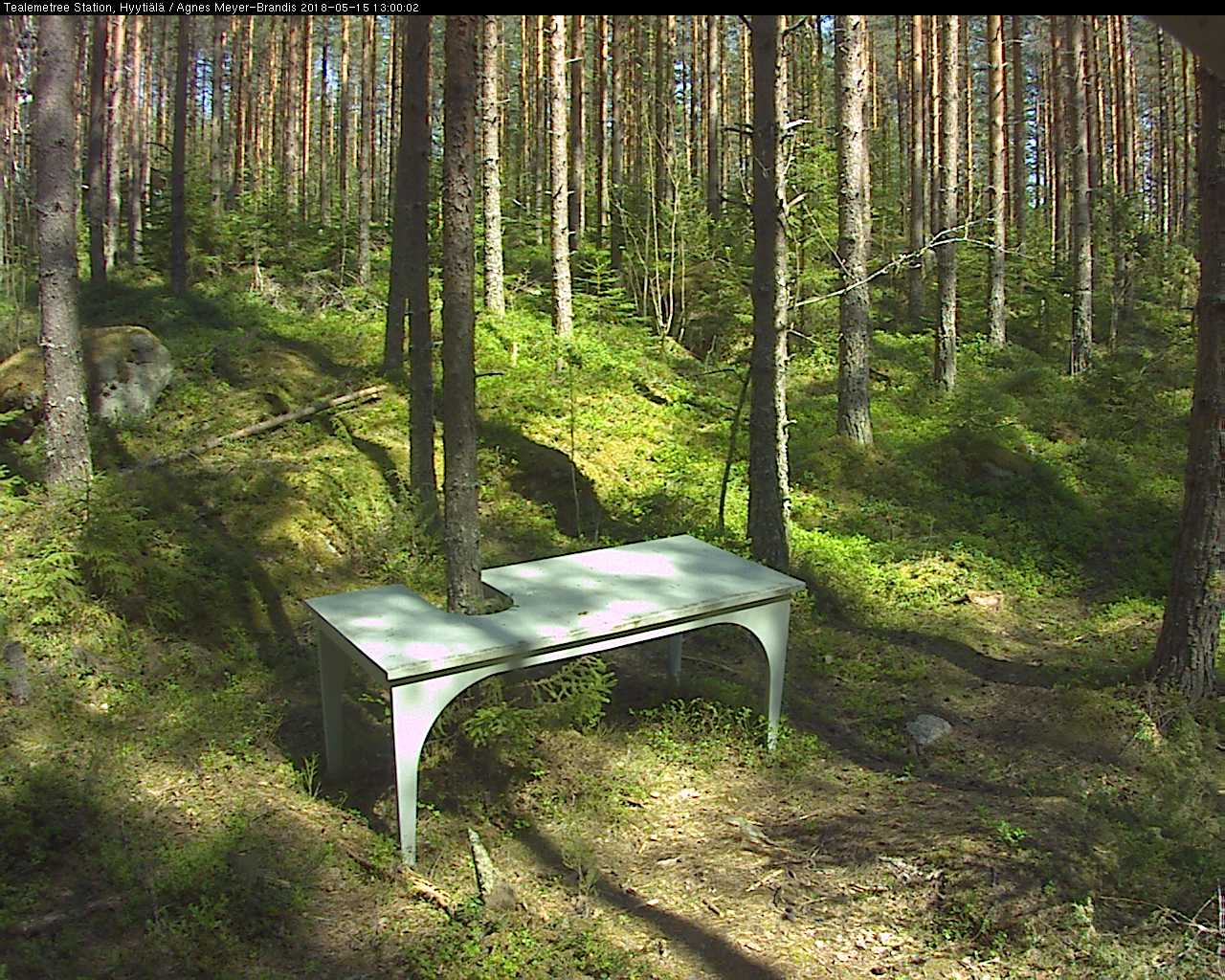 Agnes Meyer-Brandiksen työ Hyytiälässä alkoi tutustumalla aseman muihin tutkijoihin. Pystyäkseen tapaamaan ihmisiä metsässä, hän rakensi pöydän, josta muodostui kohtauspiste ja paikka teehetkille Agneksen ja puun kanssa.