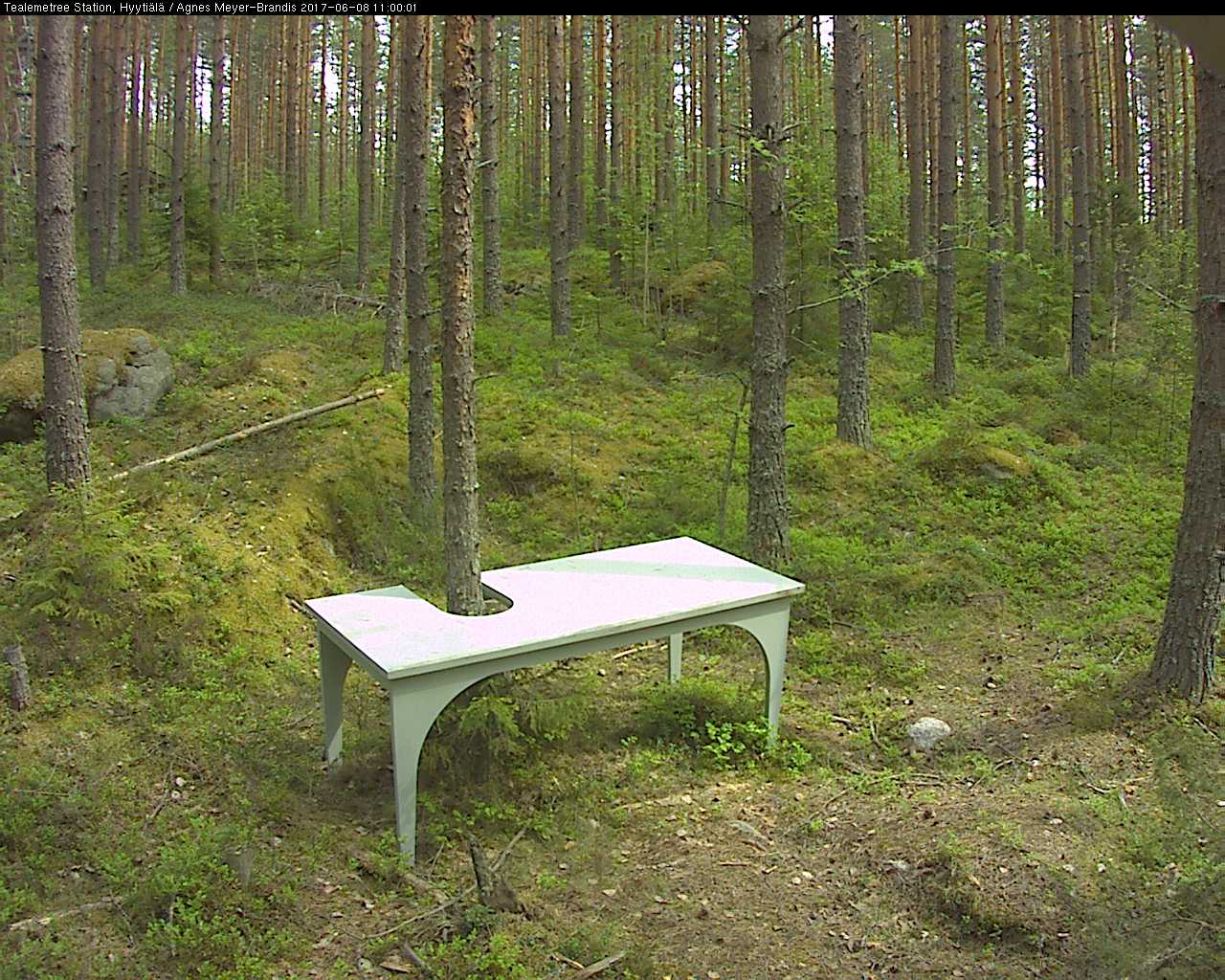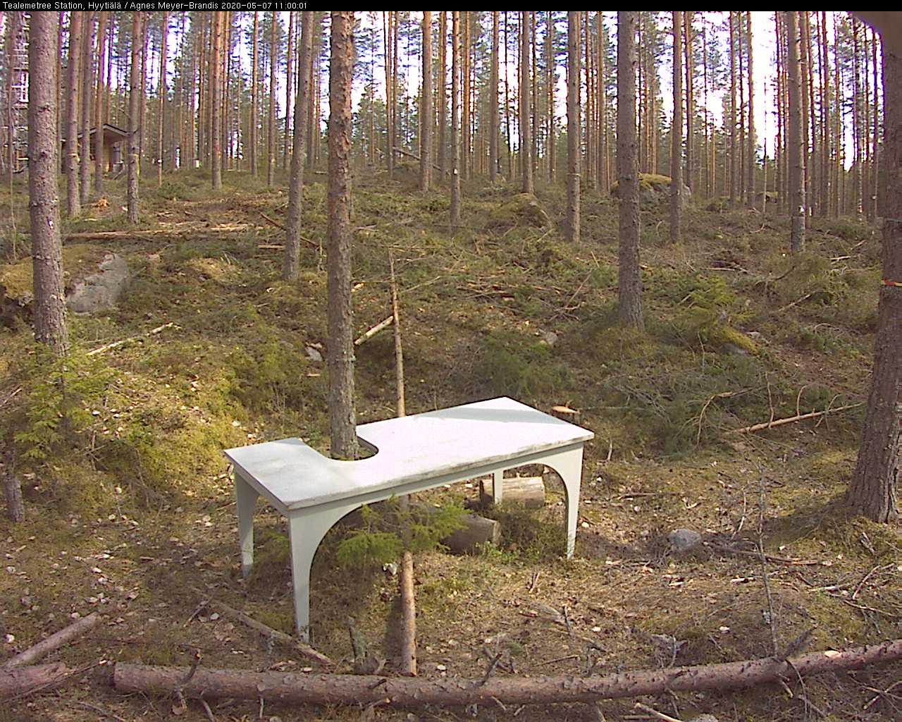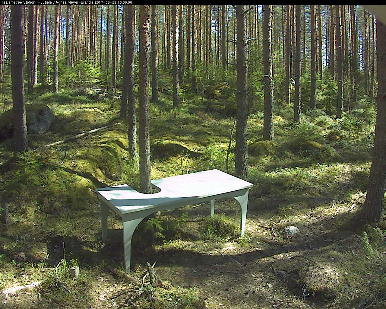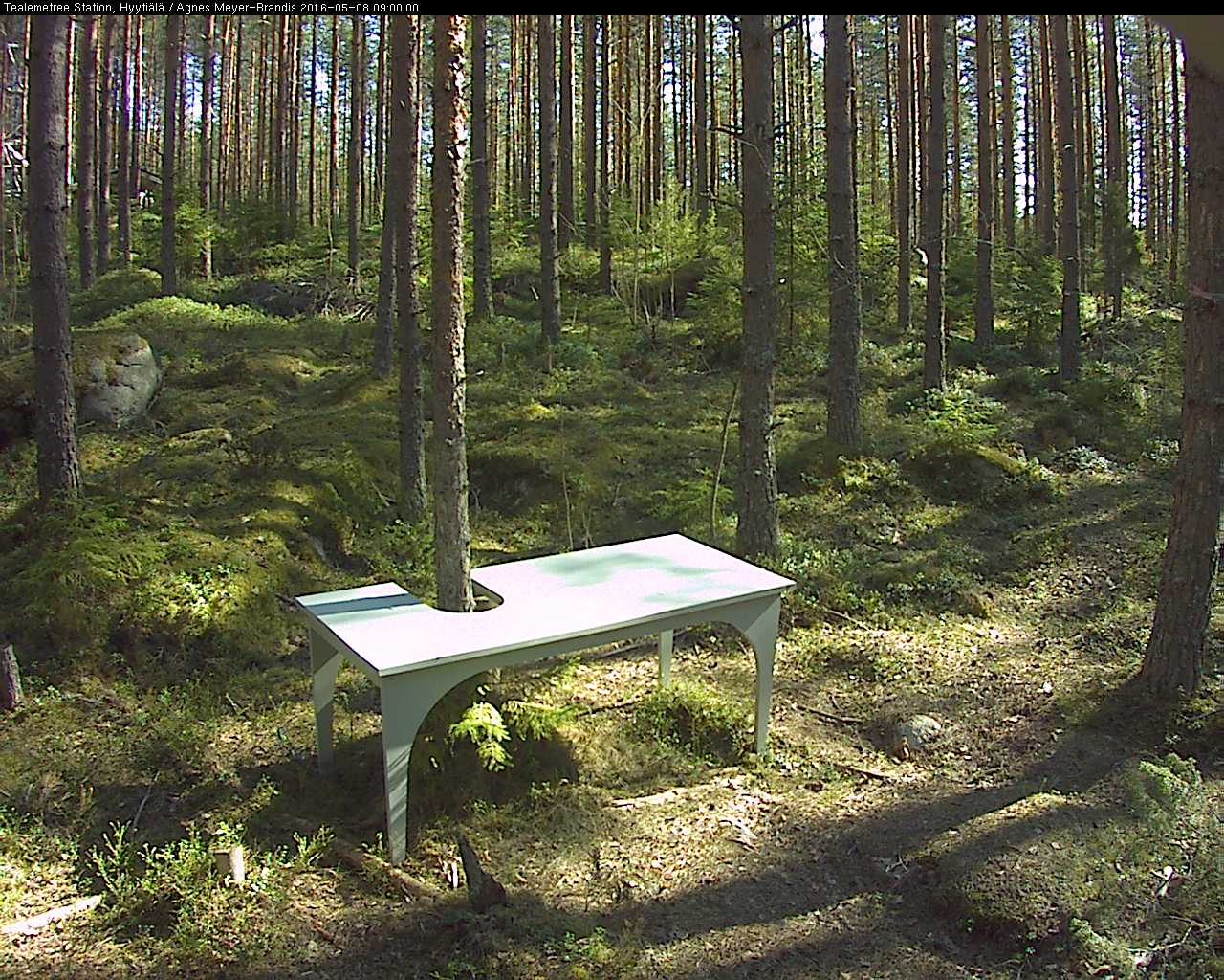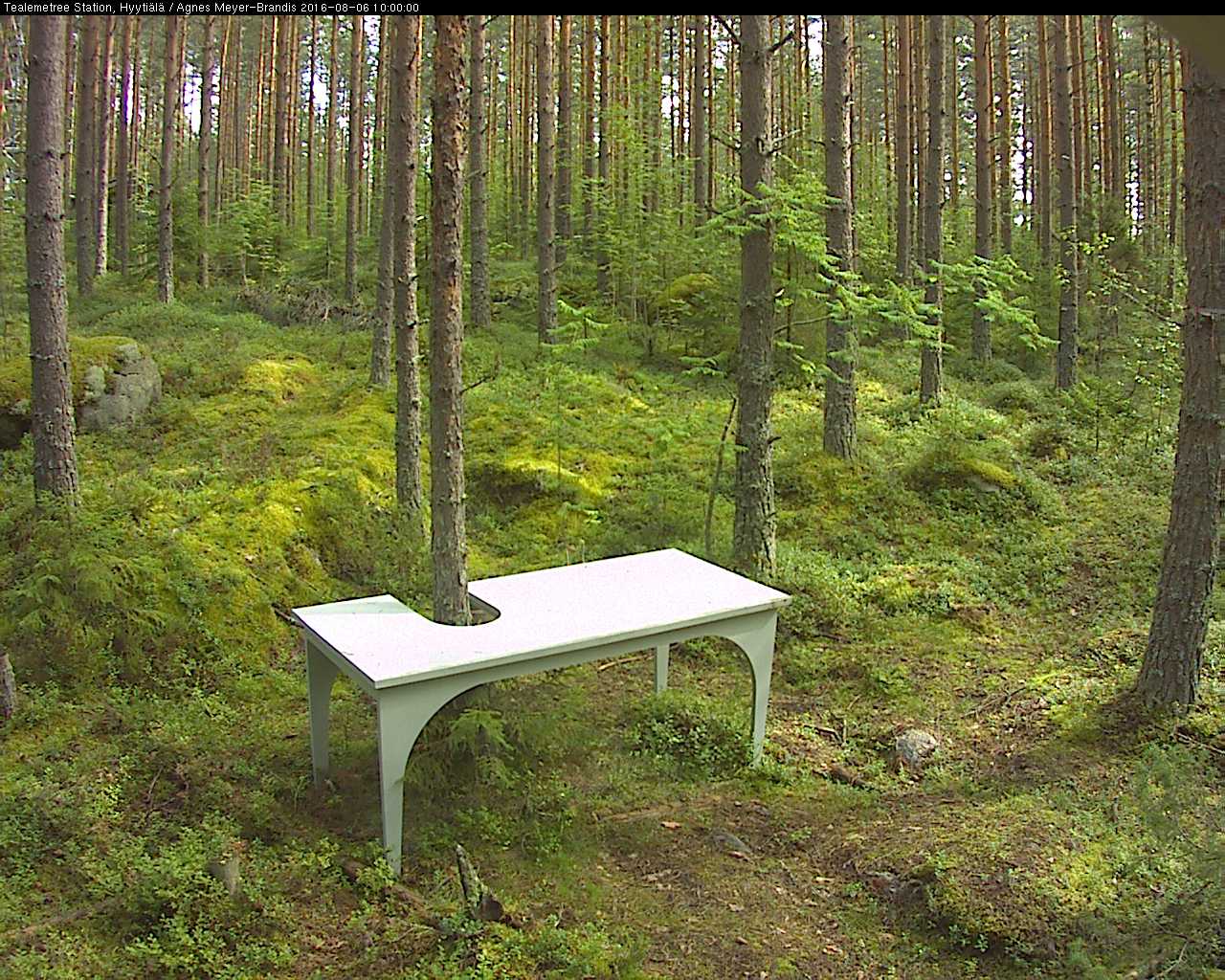 Agnes Meyer-Brandiksen työ Hyytiälässä alkoi tutustumalla aseman muihin tutkijoihin. Pystyäkseen tapaamaan ihmisiä metsässä, hän rakensi pöydän, josta muodostui kohtauspiste ja paikka teehetkille Agneksen ja puun kanssa.