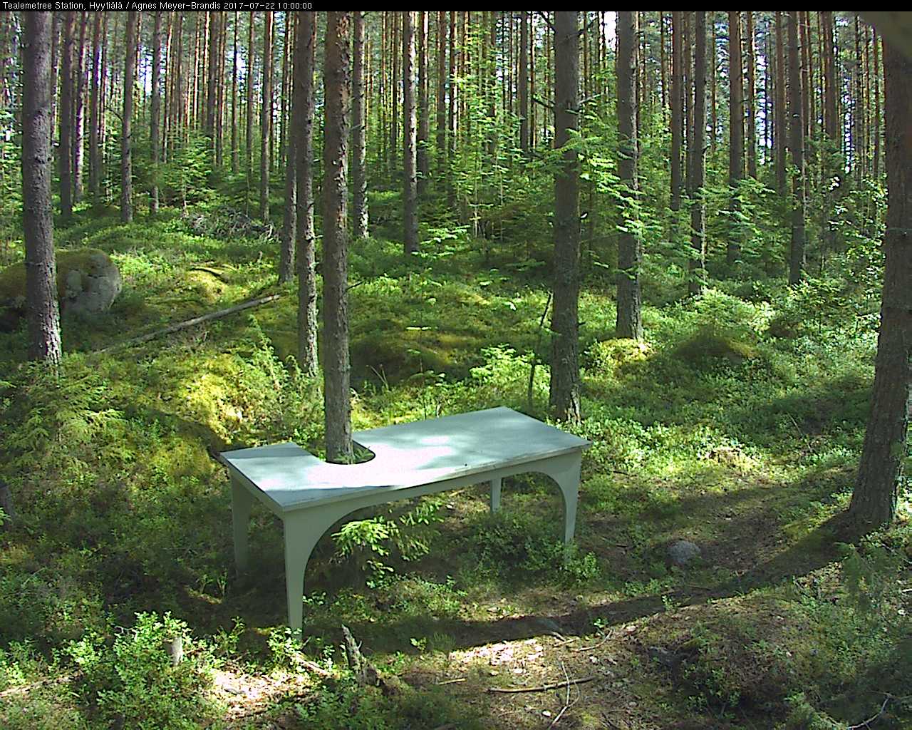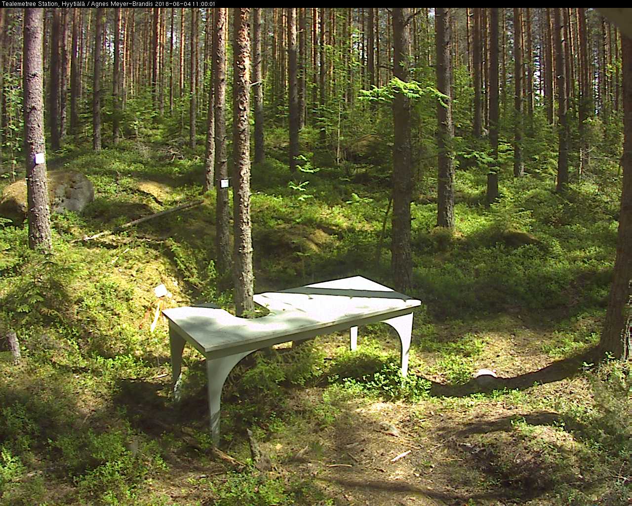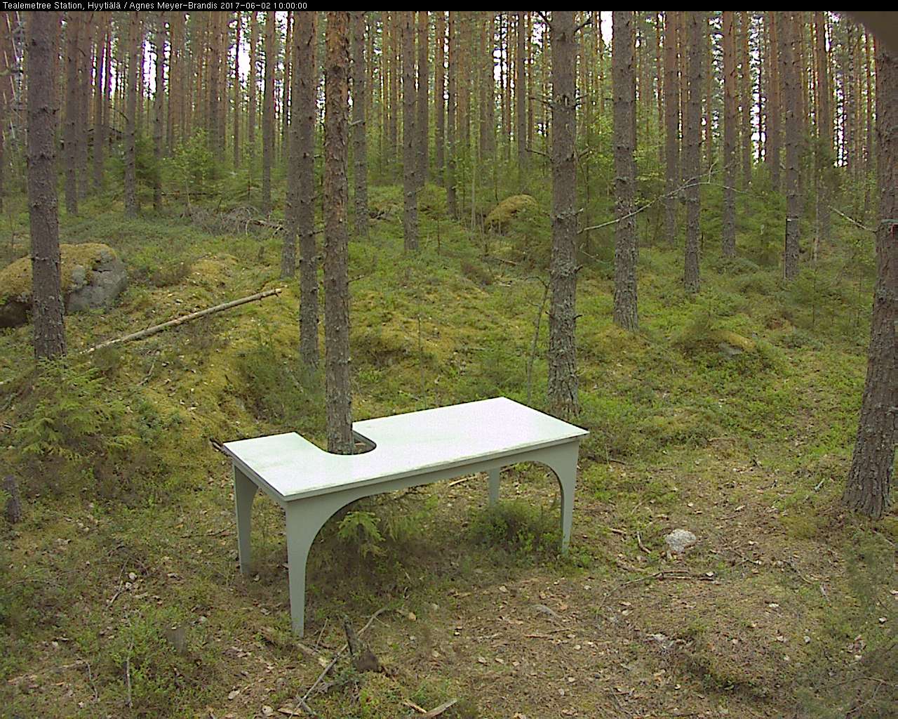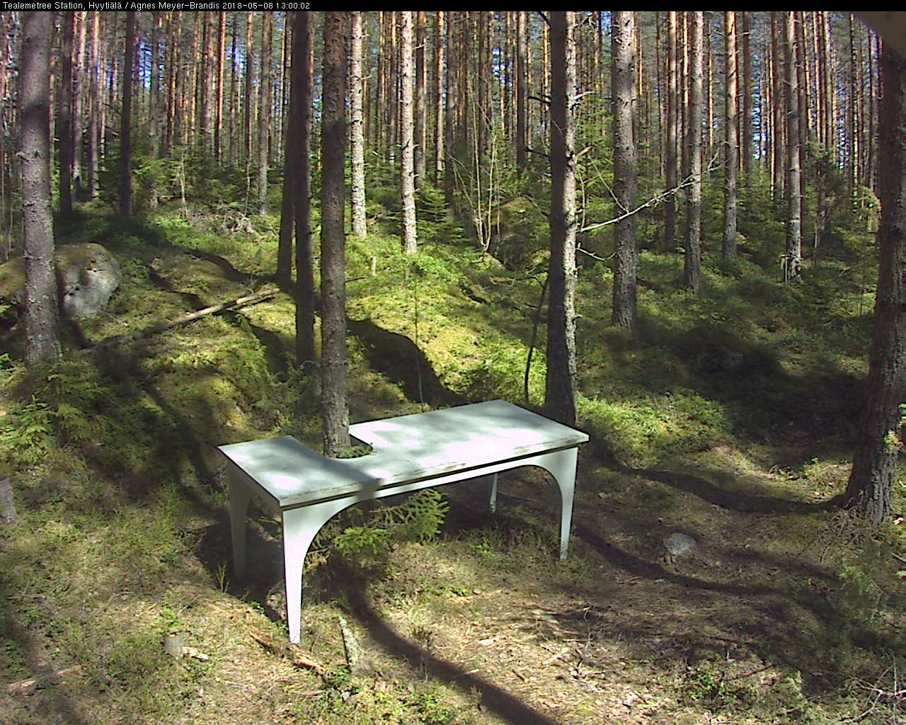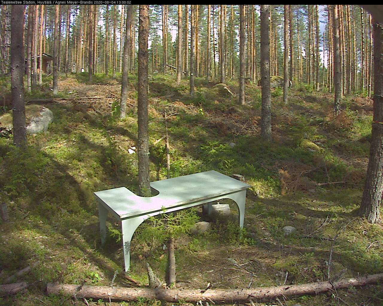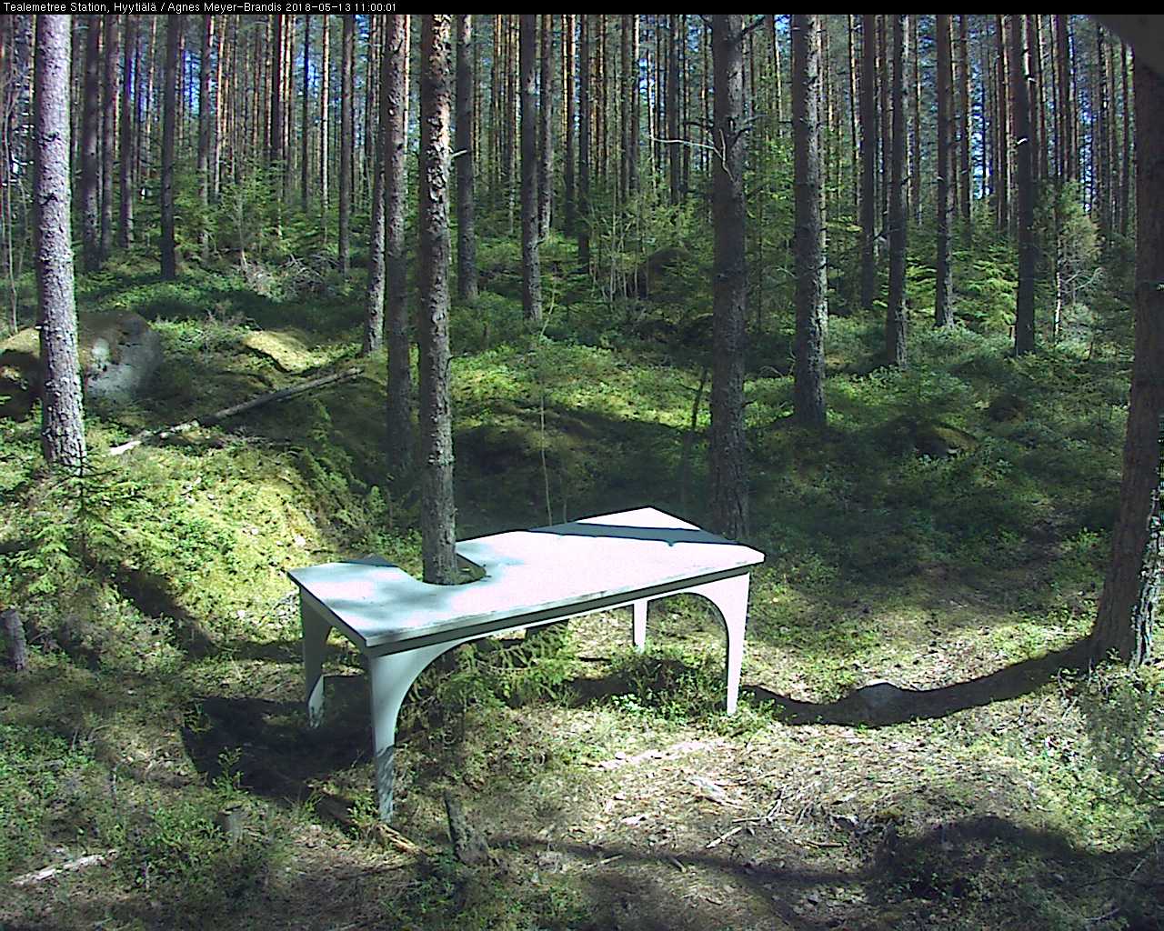 Agnes Meyer-Brandiksen työ Hyytiälässä alkoi tutustumalla aseman muihin tutkijoihin. Pystyäkseen tapaamaan ihmisiä metsässä, hän rakensi pöydän, josta muodostui kohtauspiste ja paikka teehetkille Agneksen ja puun kanssa.