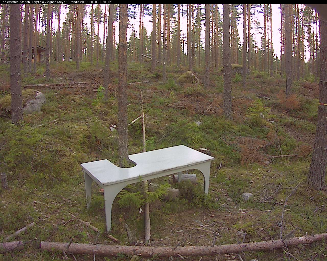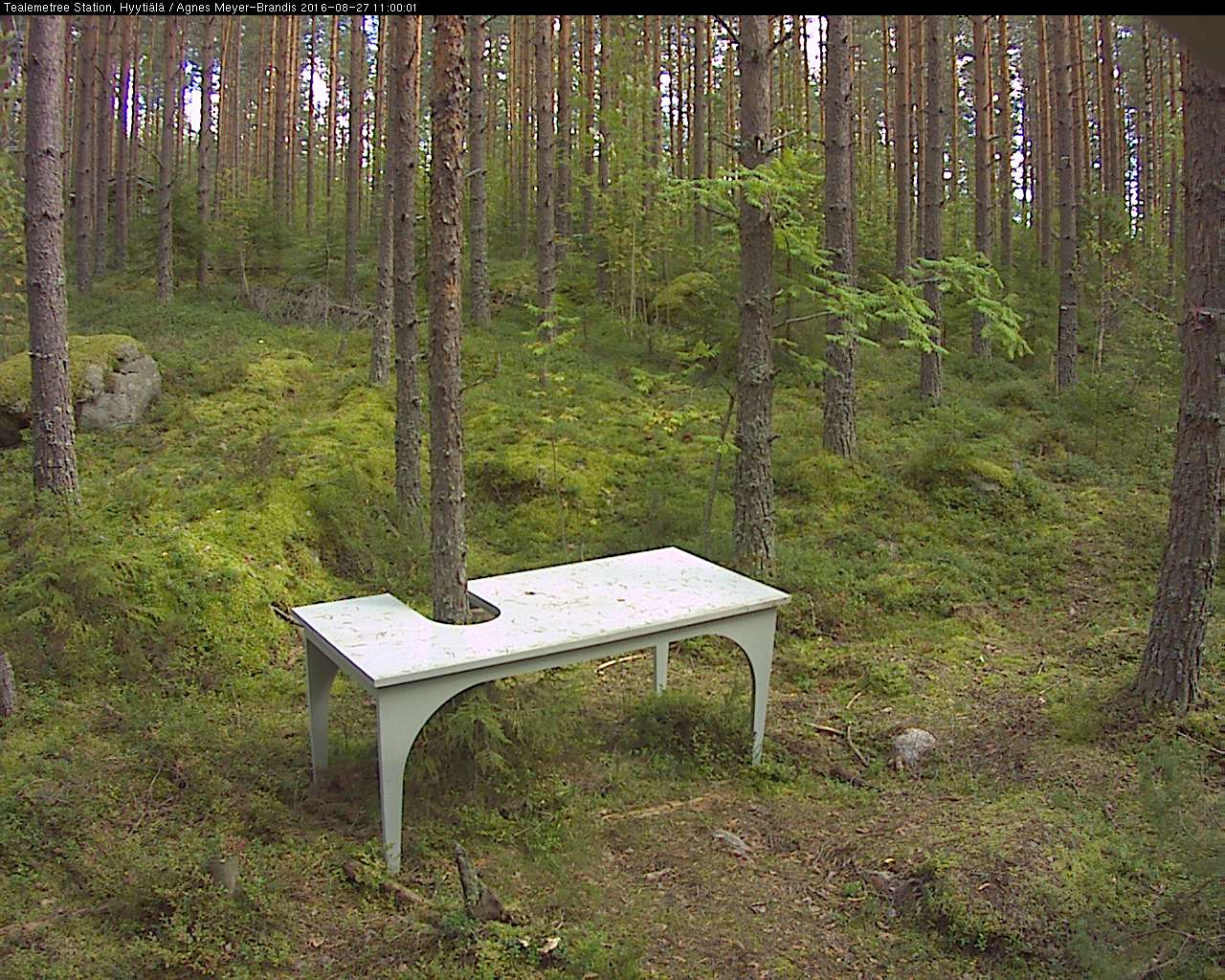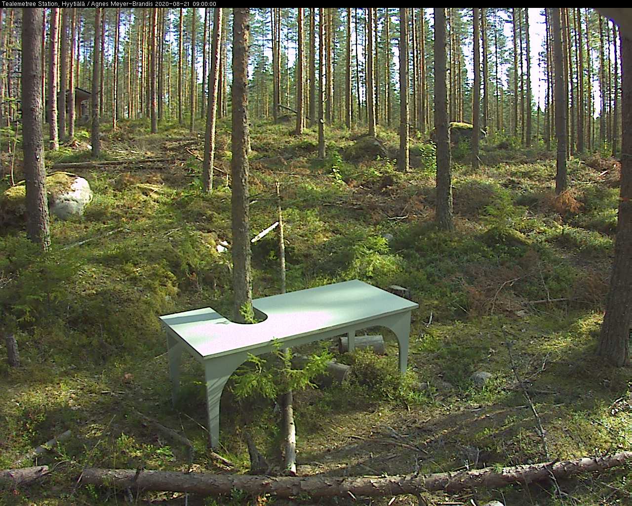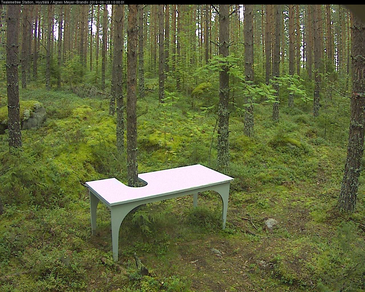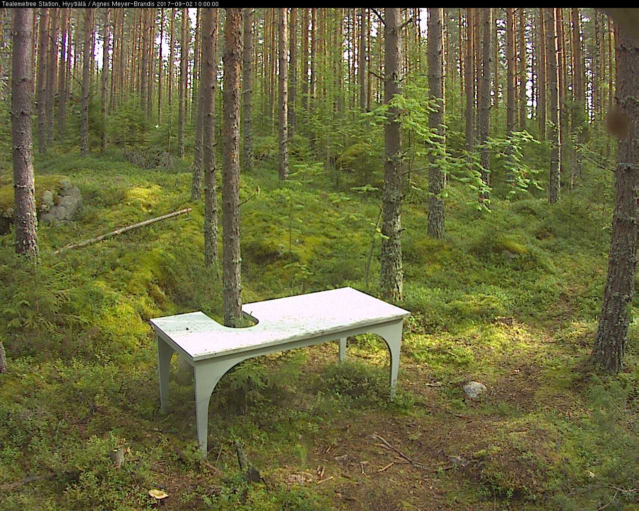 Agnes Meyer-Brandiksen työ Hyytiälässä alkoi tutustumalla aseman muihin tutkijoihin. Pystyäkseen tapaamaan ihmisiä metsässä, hän rakensi pöydän, josta muodostui kohtauspiste ja paikka teehetkille Agneksen ja puun kanssa.