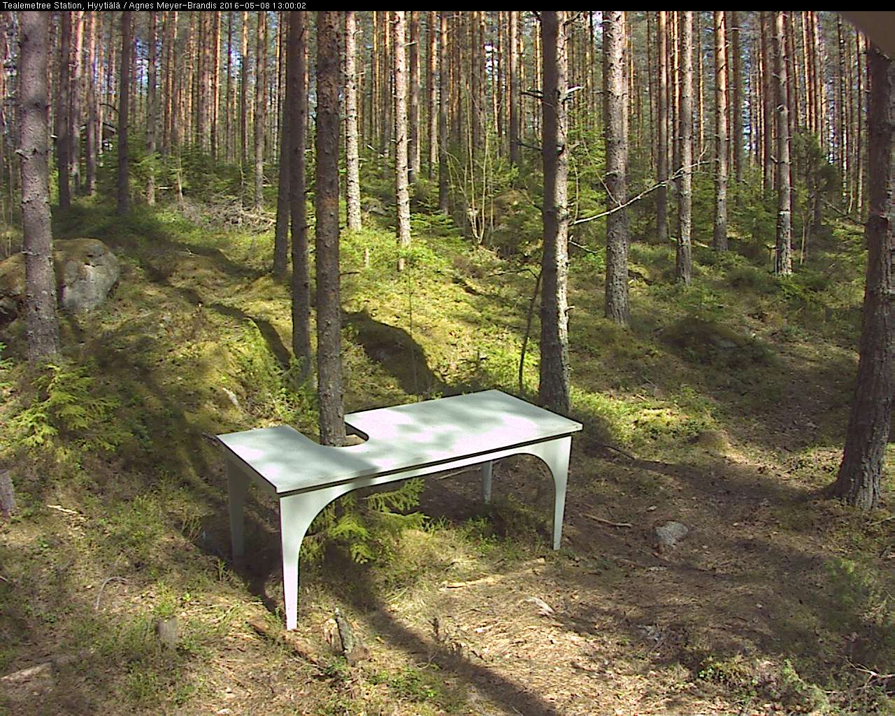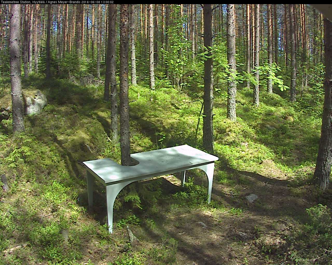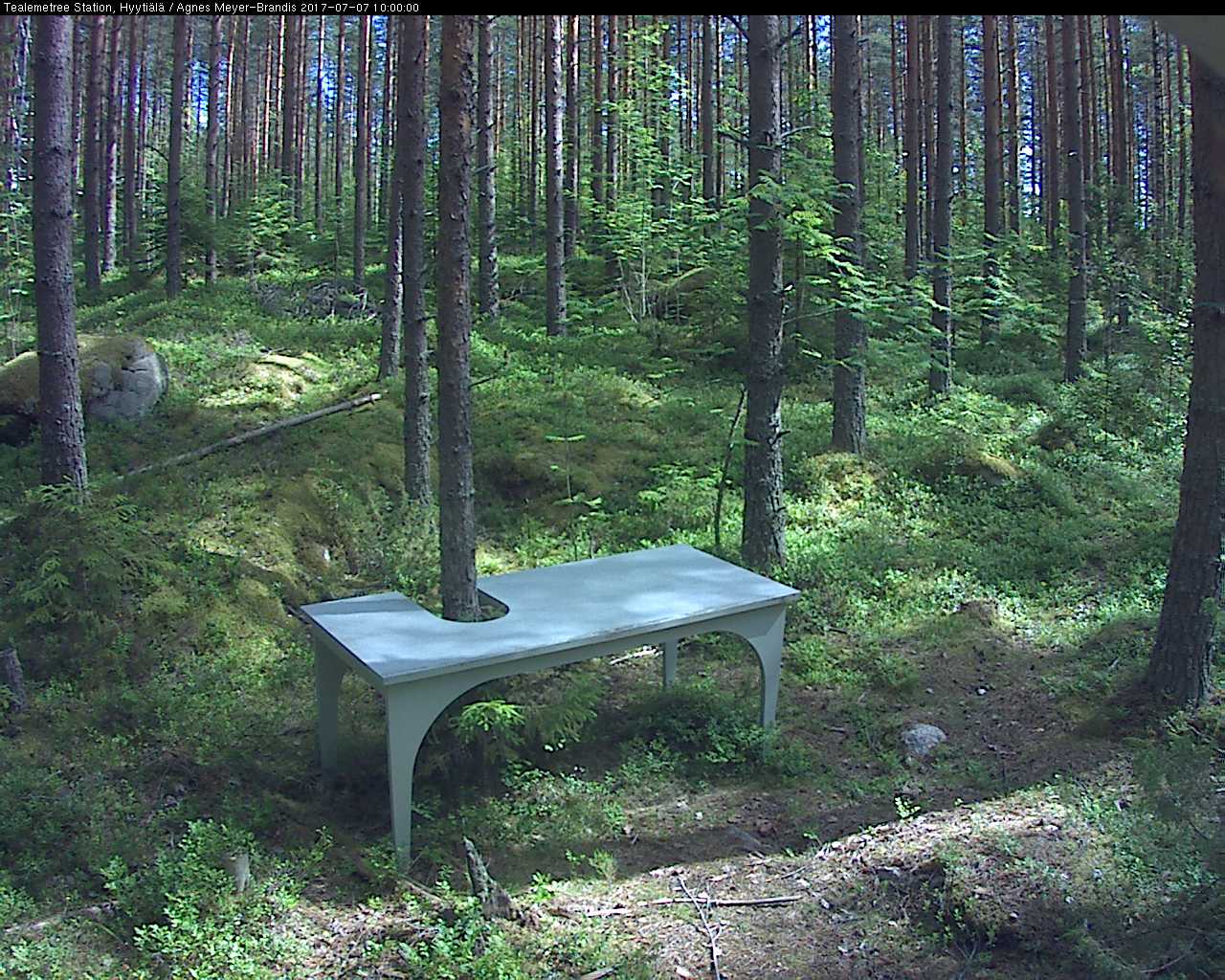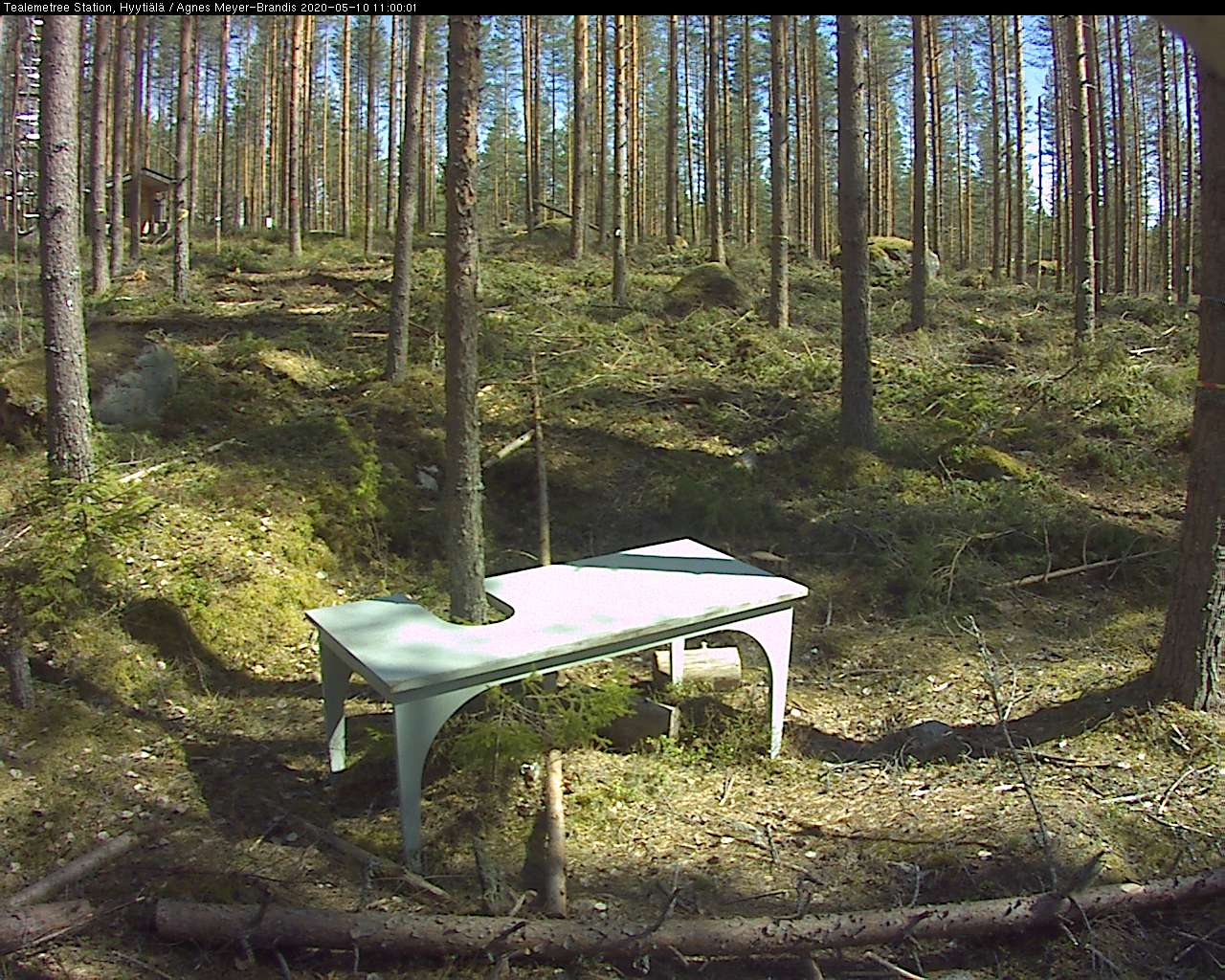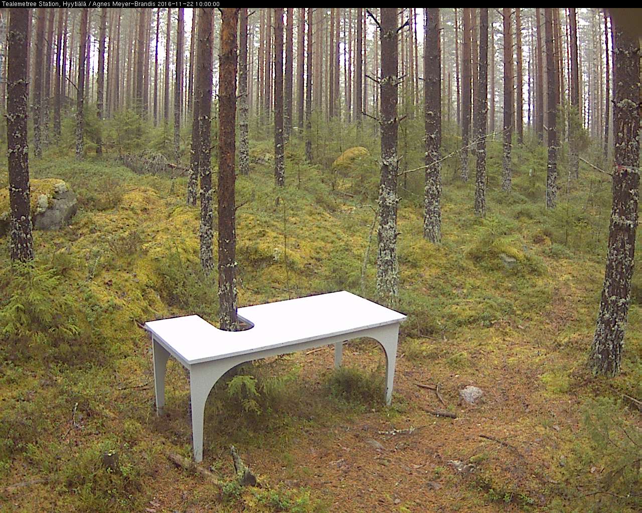 Agnes Meyer-Brandiksen työ Hyytiälässä alkoi tutustumalla aseman muihin tutkijoihin. Pystyäkseen tapaamaan ihmisiä metsässä, hän rakensi pöydän, josta muodostui kohtauspiste ja paikka teehetkille Agneksen ja puun kanssa.