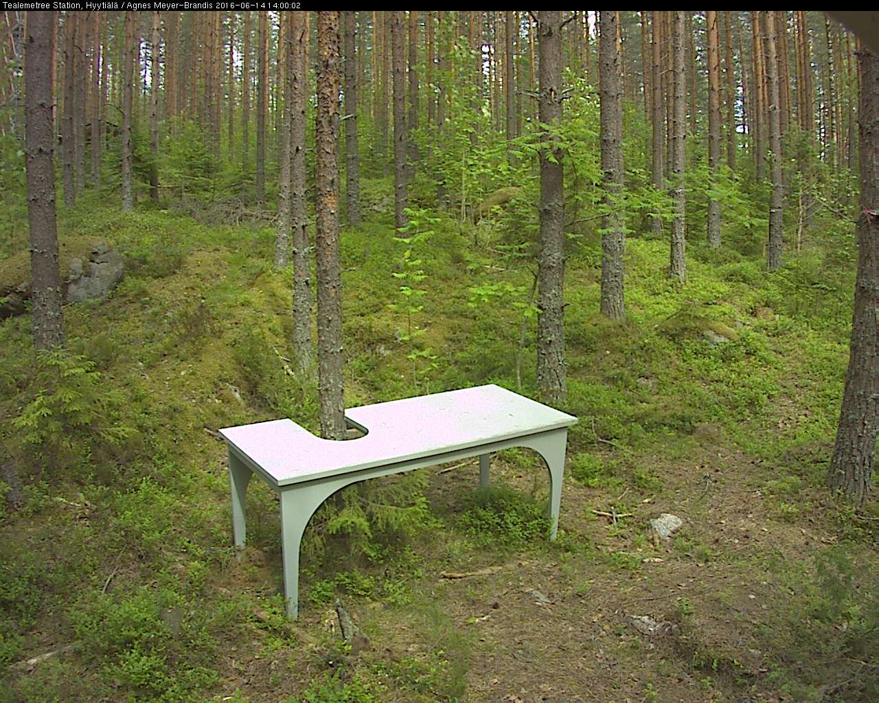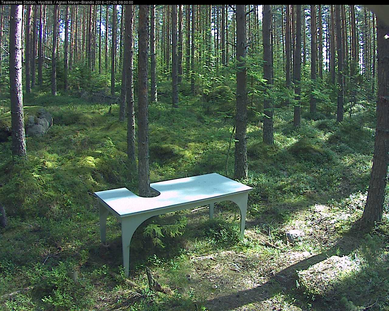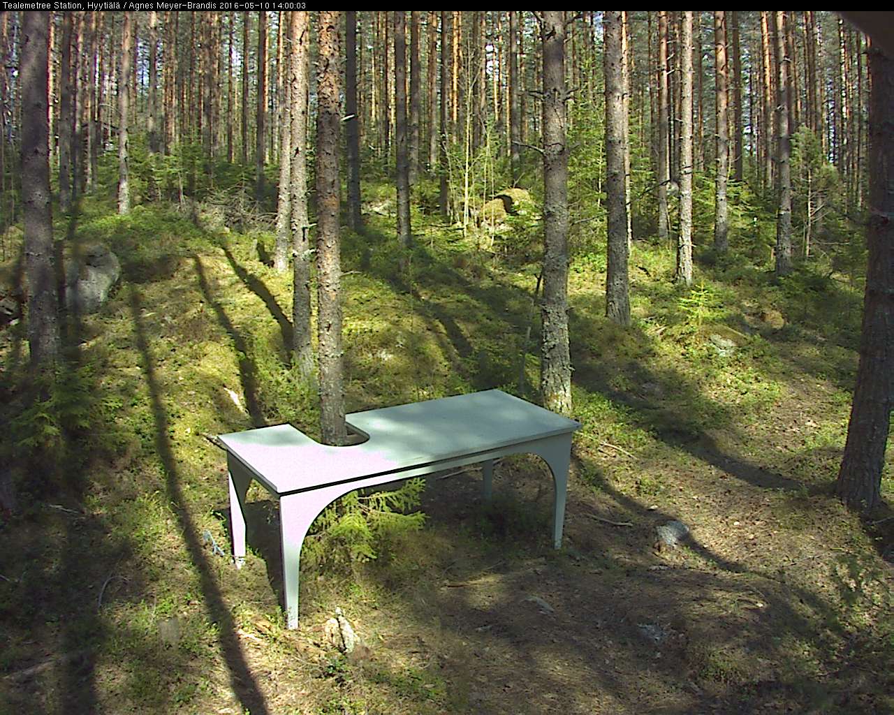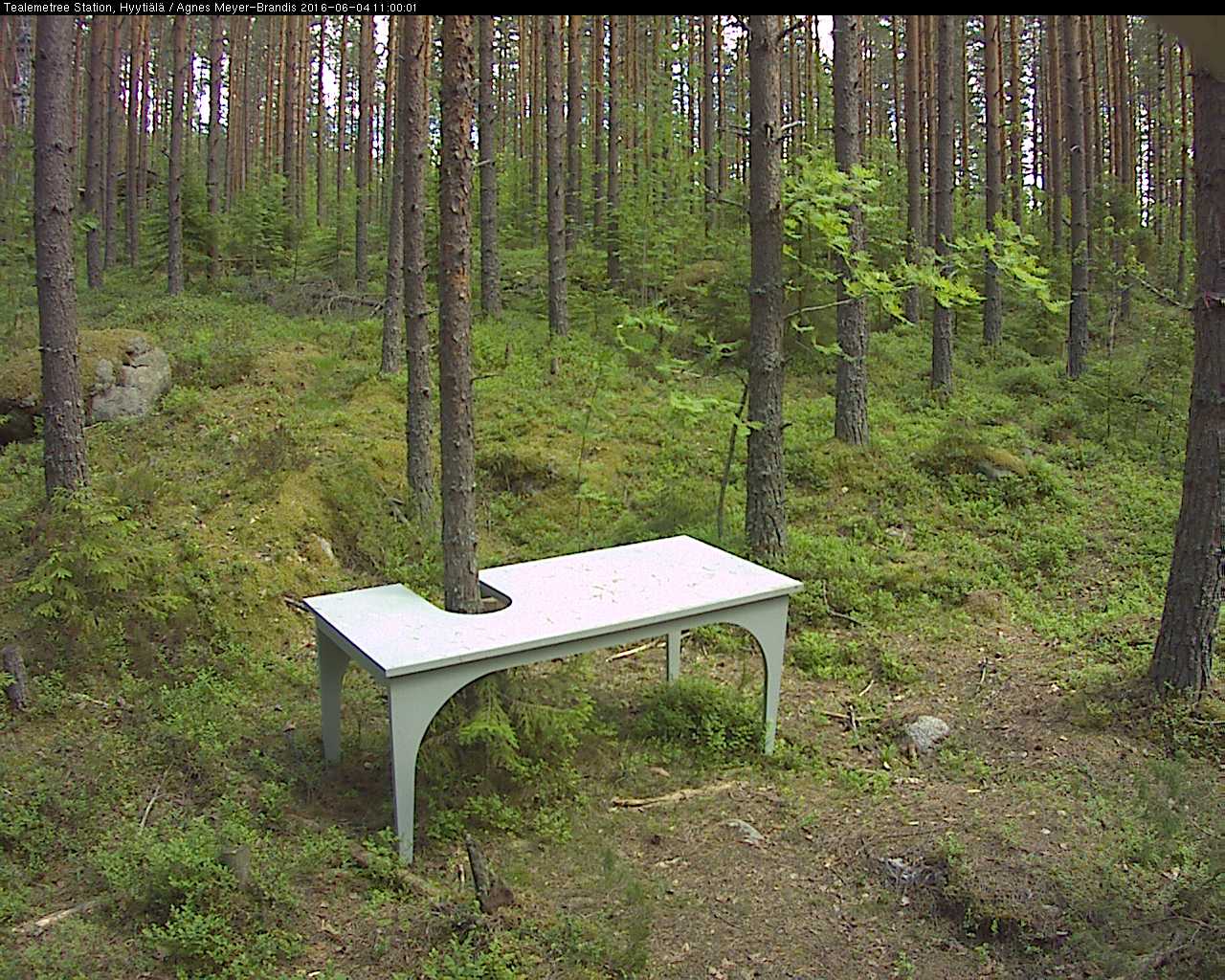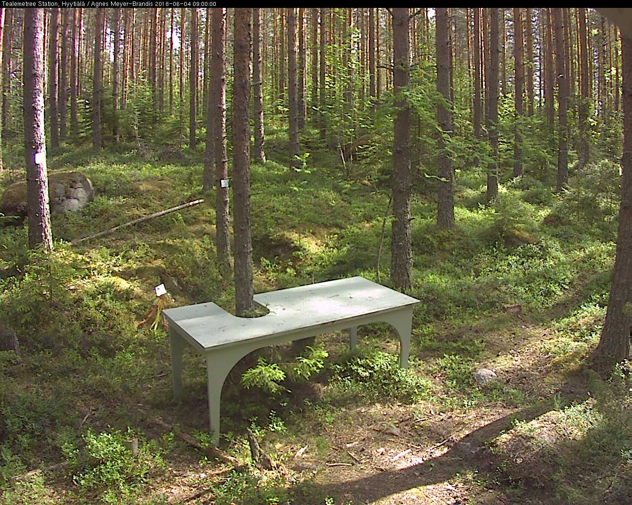 Agnes Meyer-Brandiksen työ Hyytiälässä alkoi tutustumalla aseman muihin tutkijoihin. Pystyäkseen tapaamaan ihmisiä metsässä, hän rakensi pöydän, josta muodostui kohtauspiste ja paikka teehetkille Agneksen ja puun kanssa.