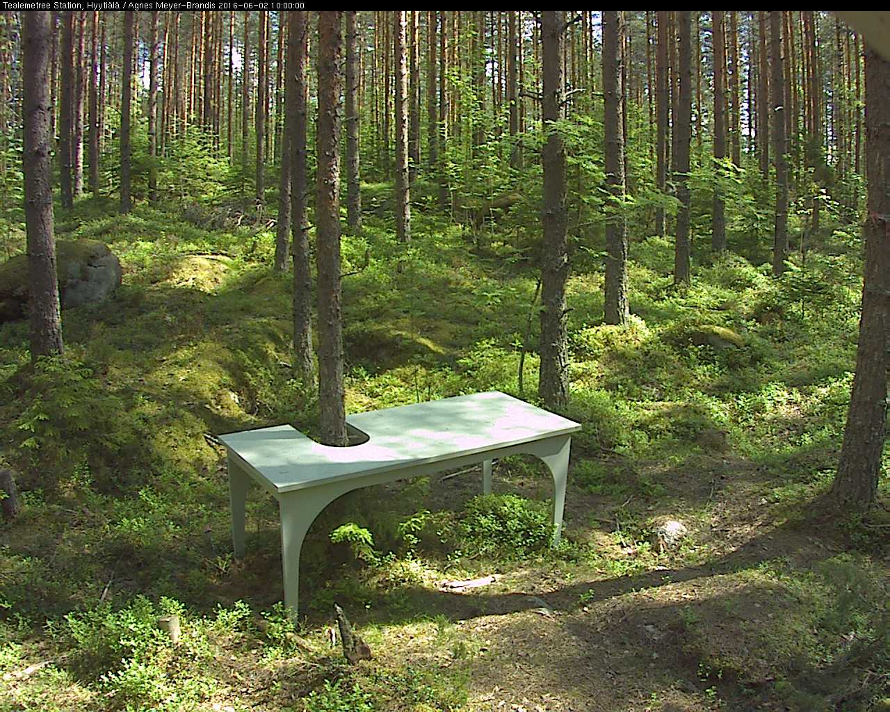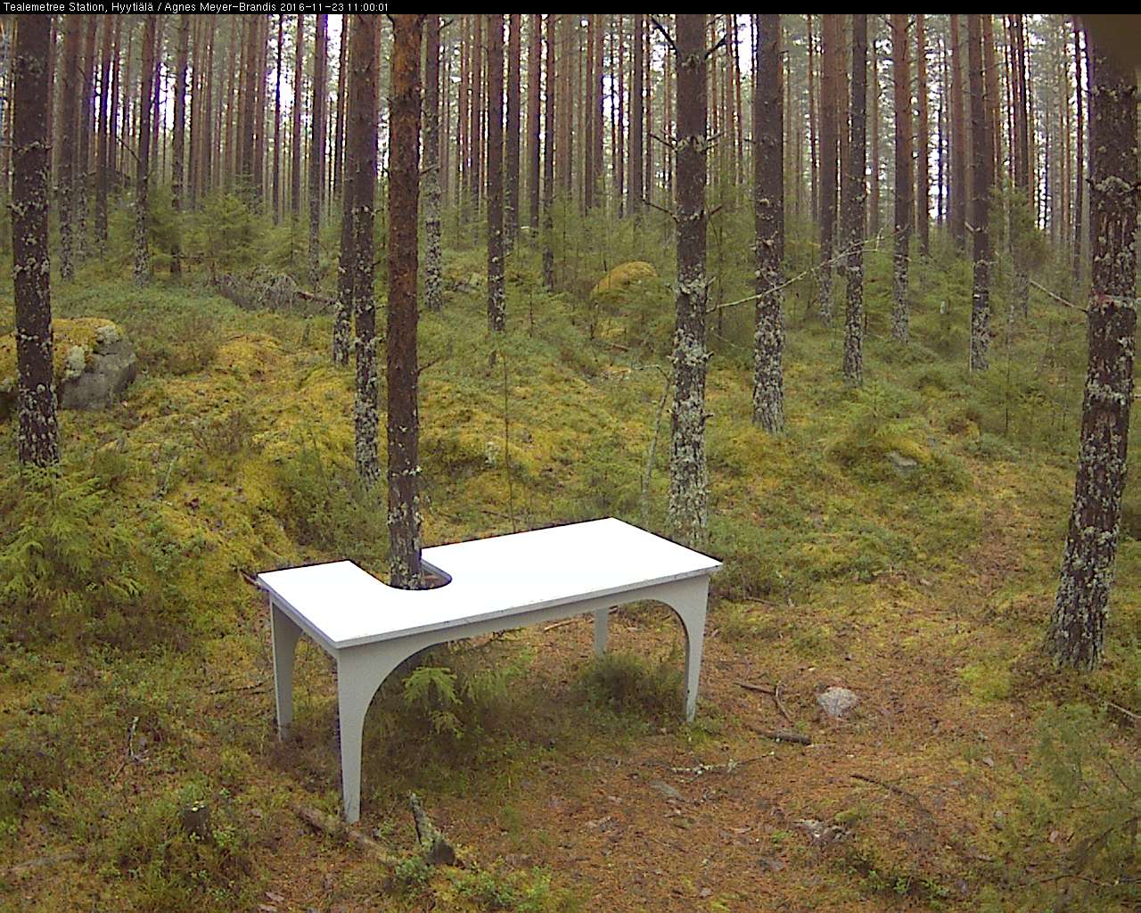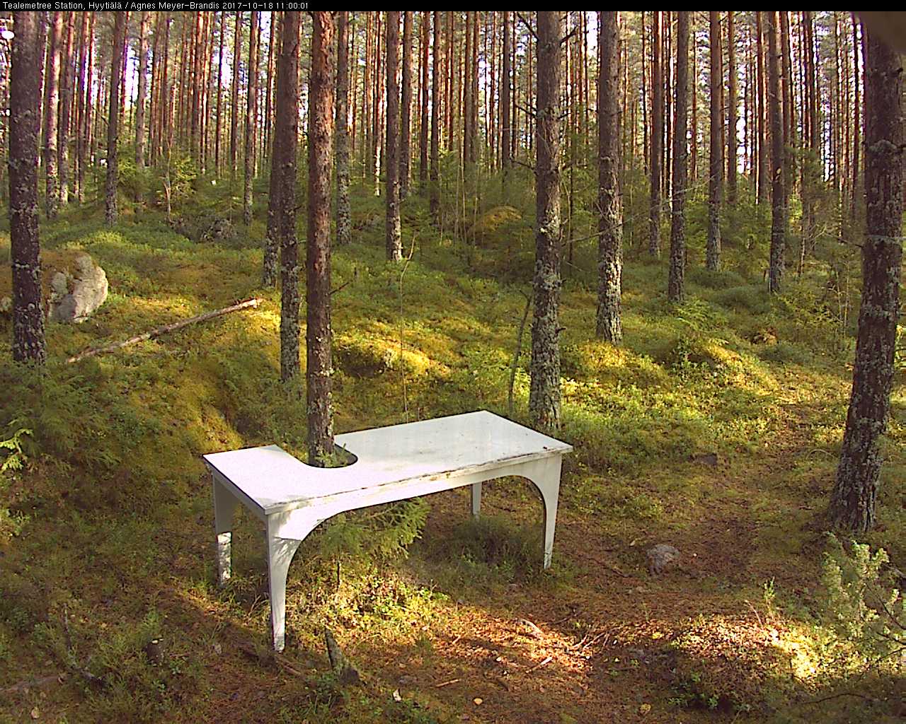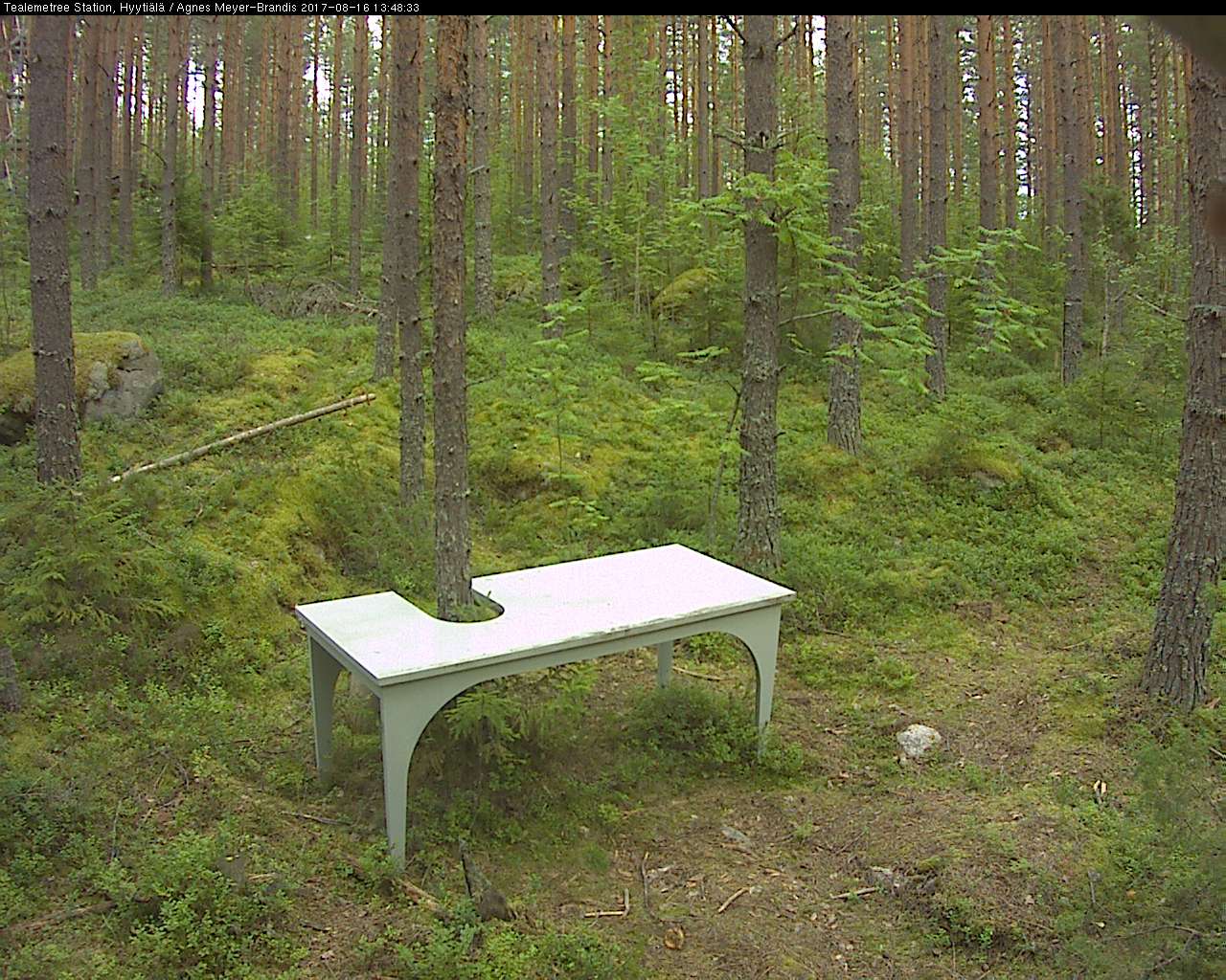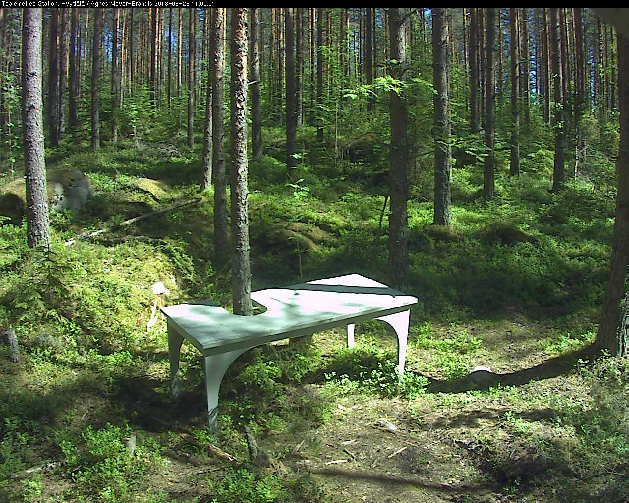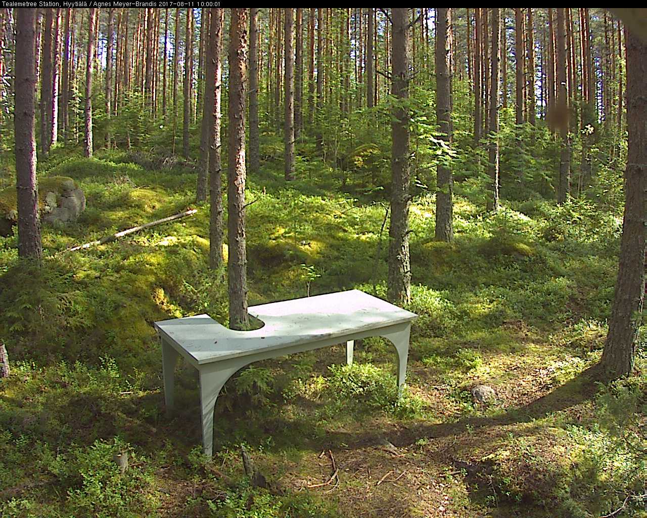 Agnes Meyer-Brandiksen työ Hyytiälässä alkoi tutustumalla aseman muihin tutkijoihin. Pystyäkseen tapaamaan ihmisiä metsässä, hän rakensi pöydän, josta muodostui kohtauspiste ja paikka teehetkille Agneksen ja puun kanssa.