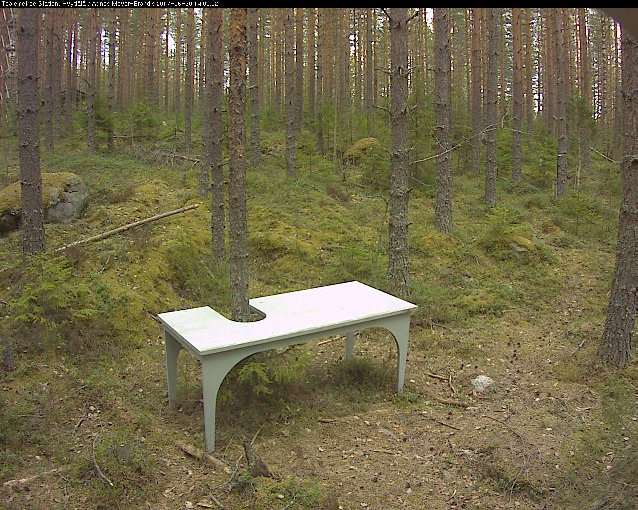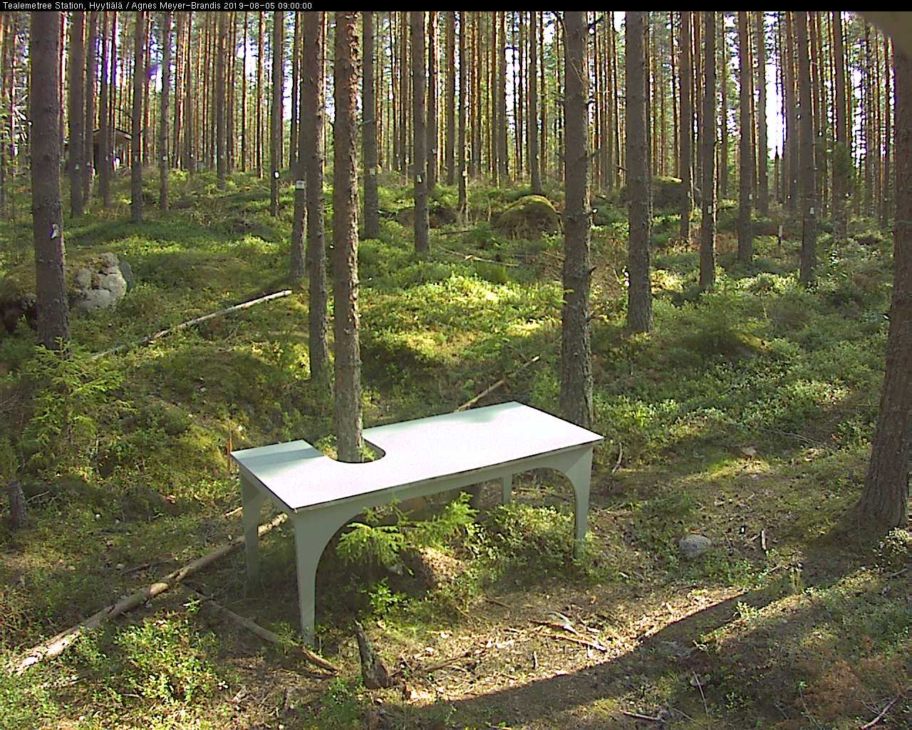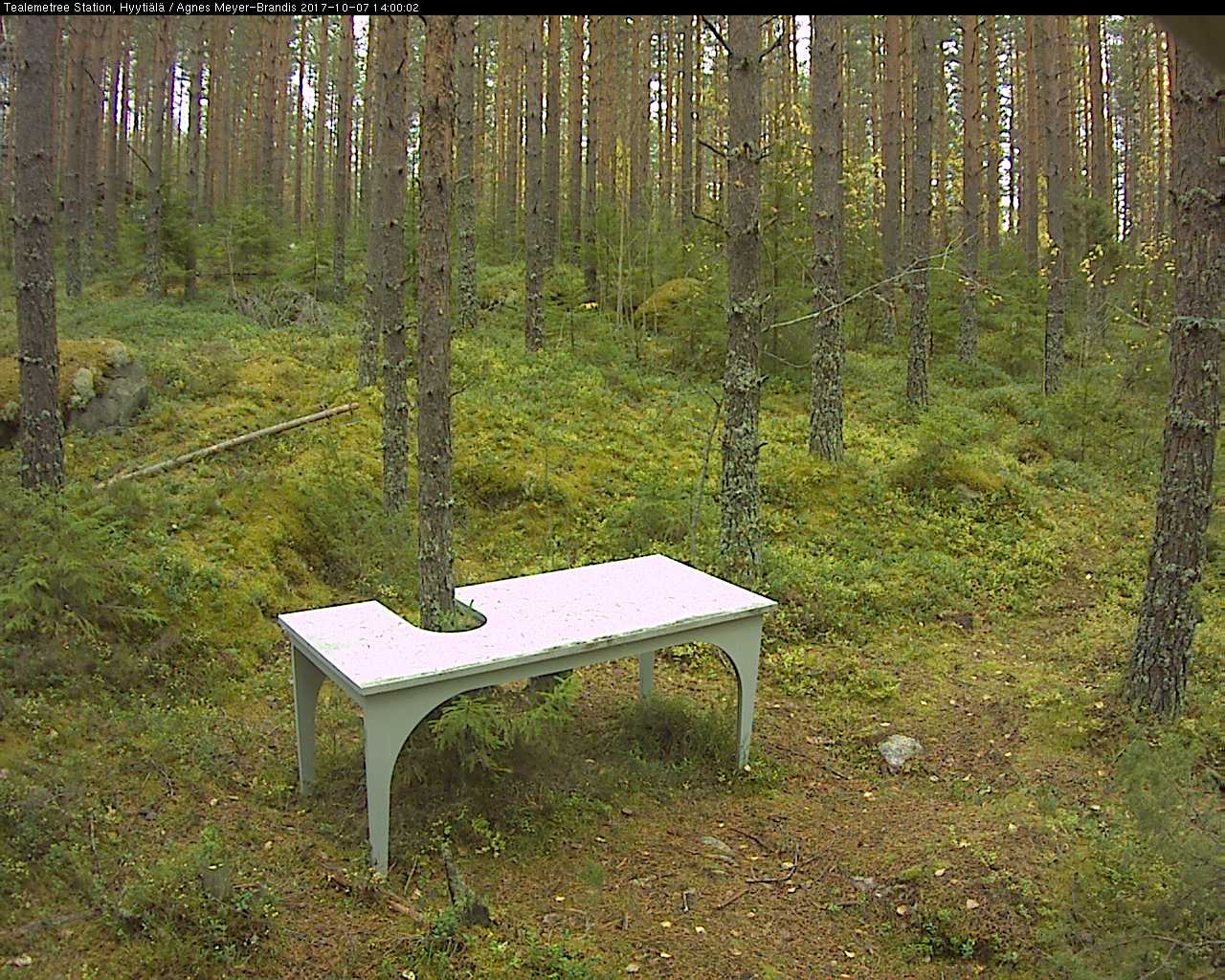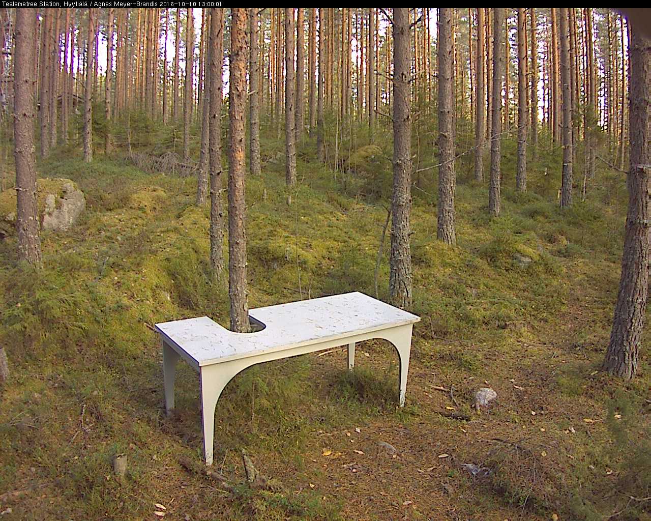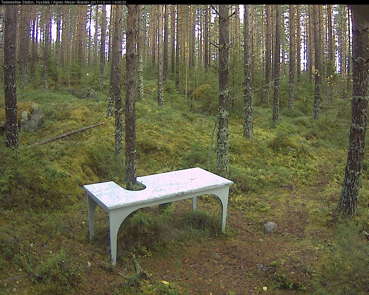 Agnes Meyer-Brandiksen työ Hyytiälässä alkoi tutustumalla aseman muihin tutkijoihin. Pystyäkseen tapaamaan ihmisiä metsässä, hän rakensi pöydän, josta muodostui kohtauspiste ja paikka teehetkille Agneksen ja puun kanssa.