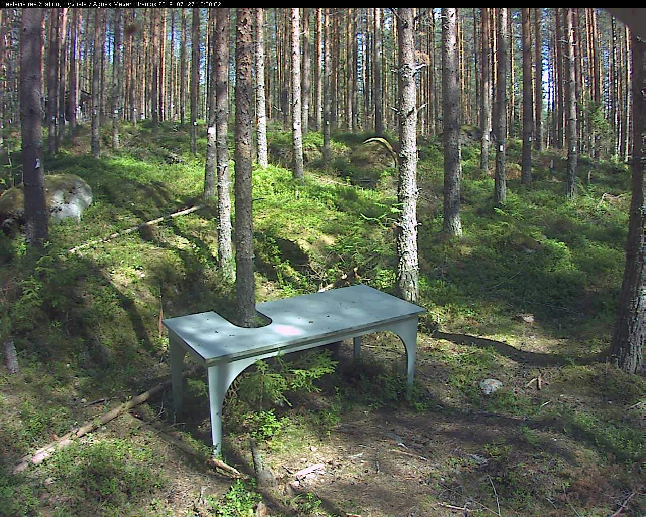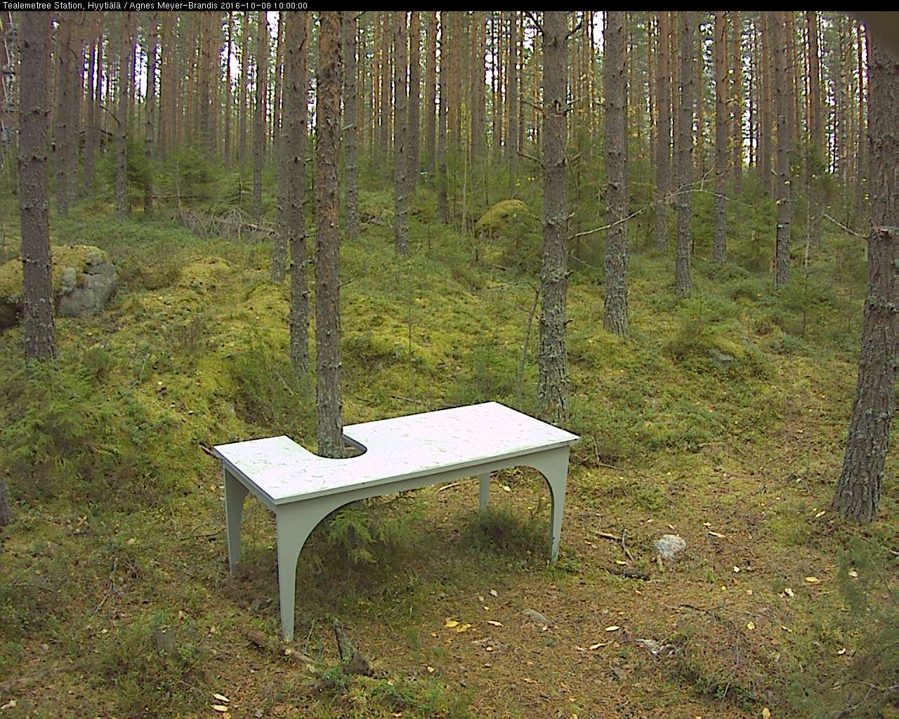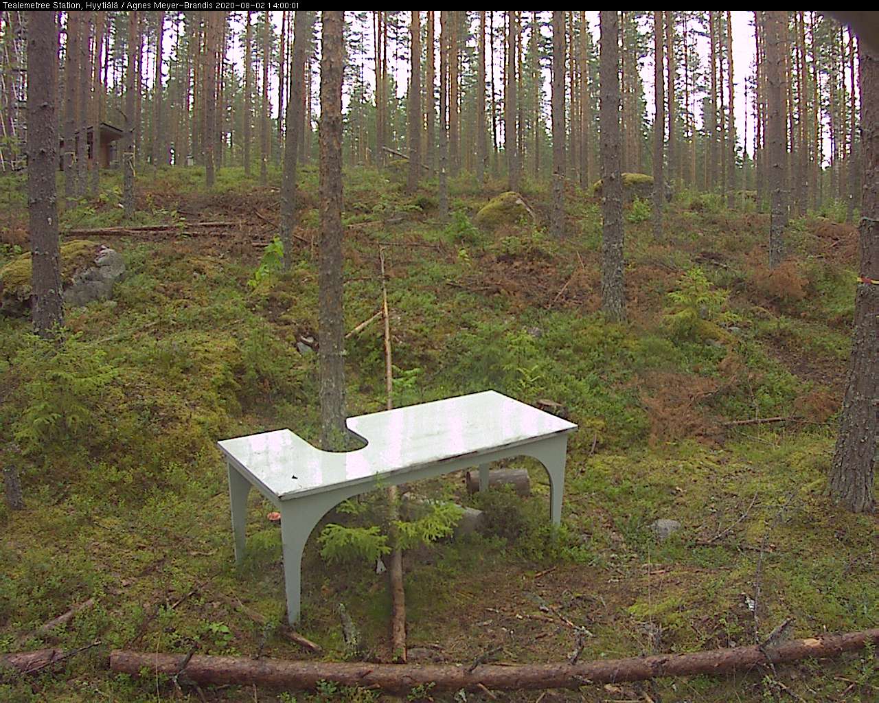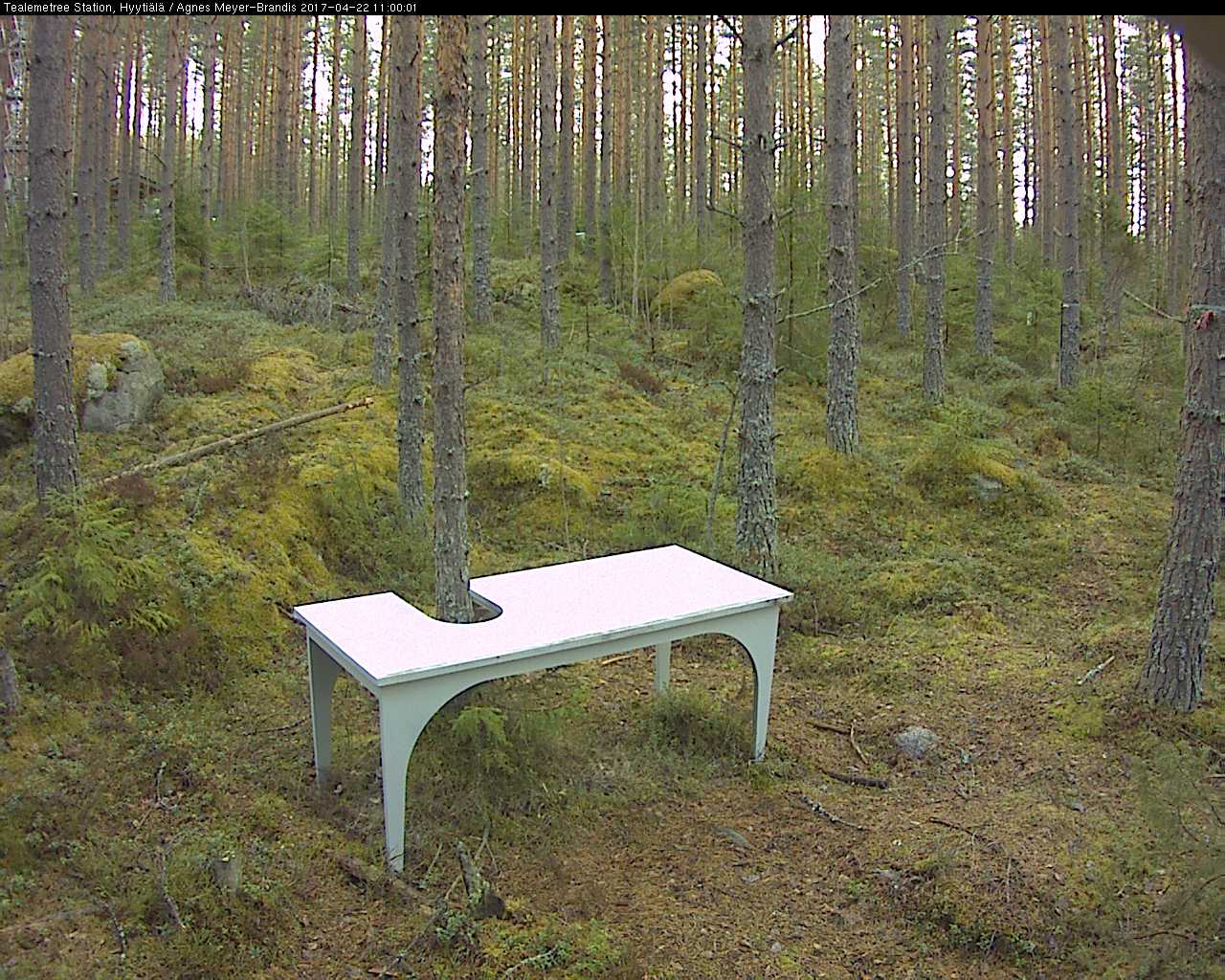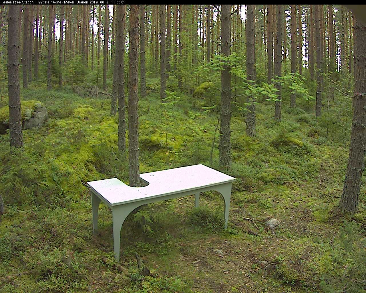 Agnes Meyer-Brandiksen työ Hyytiälässä alkoi tutustumalla aseman muihin tutkijoihin. Pystyäkseen tapaamaan ihmisiä metsässä, hän rakensi pöydän, josta muodostui kohtauspiste ja paikka teehetkille Agneksen ja puun kanssa.