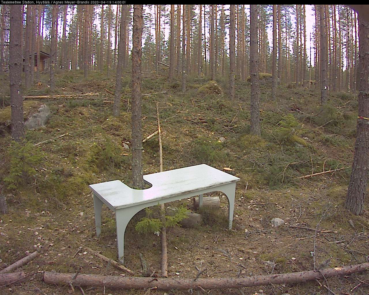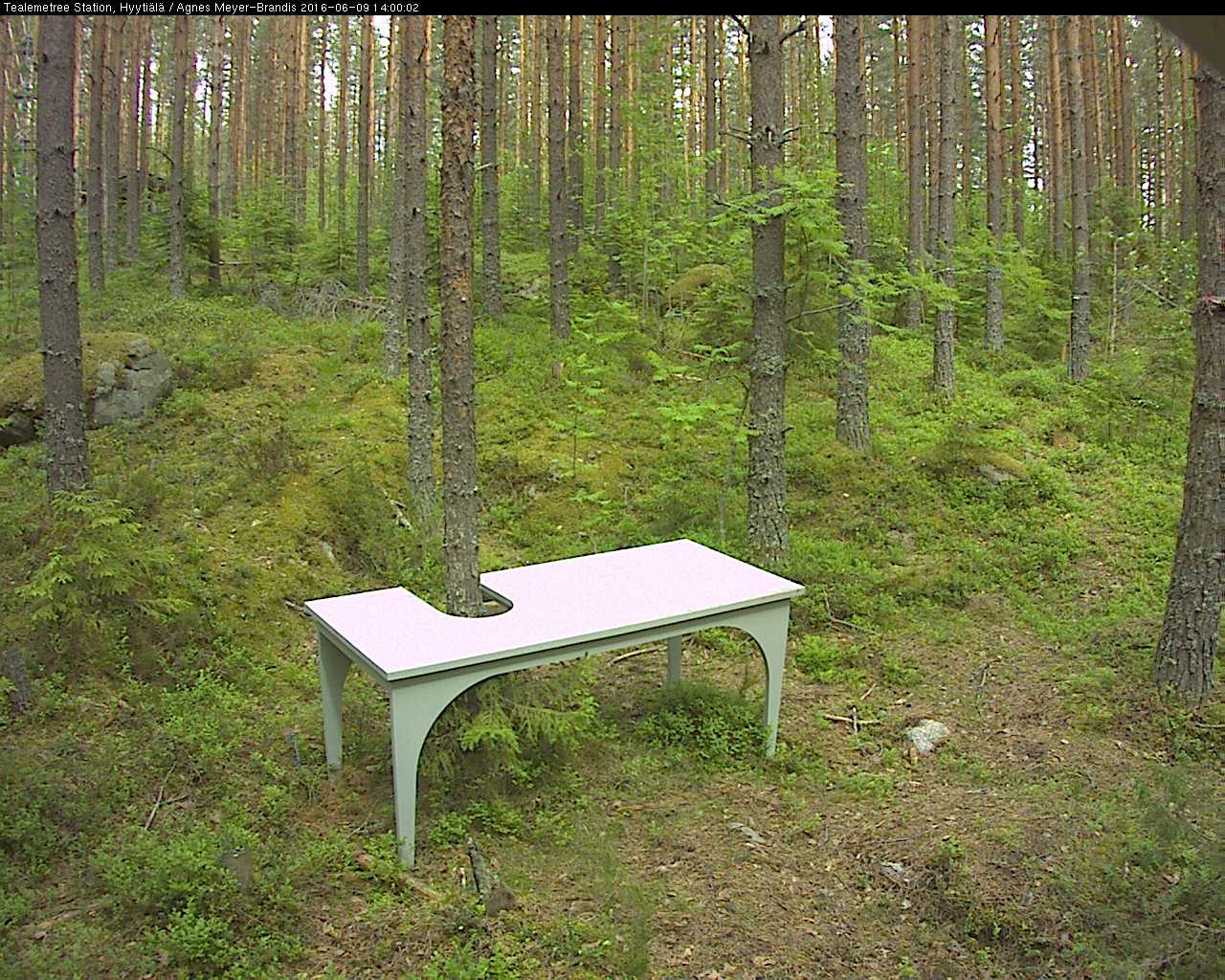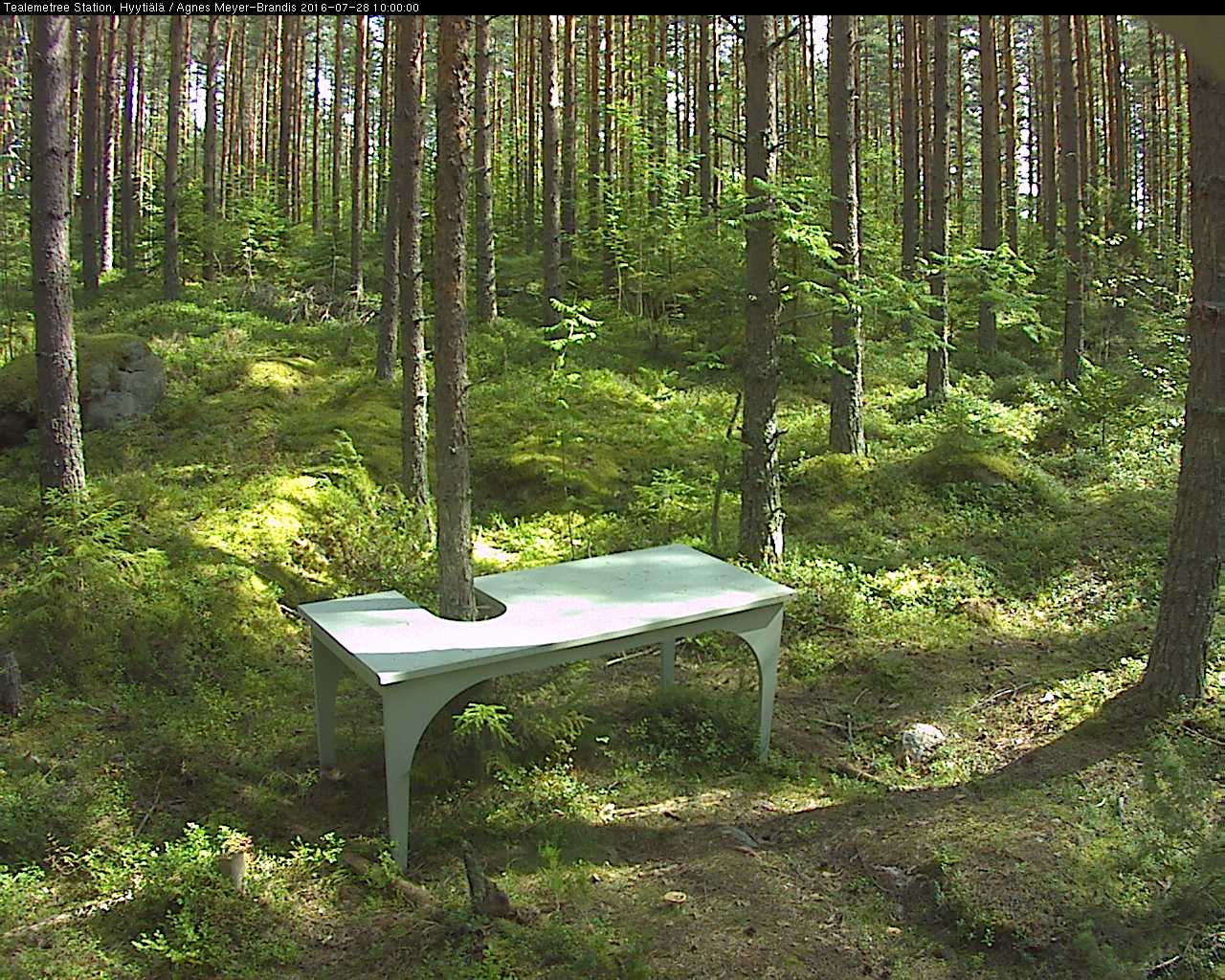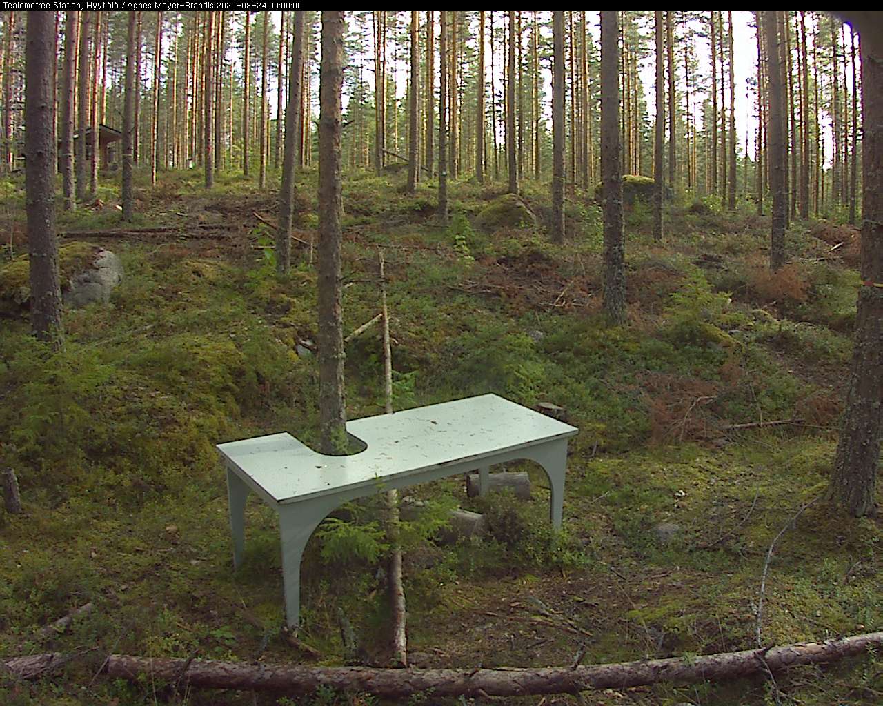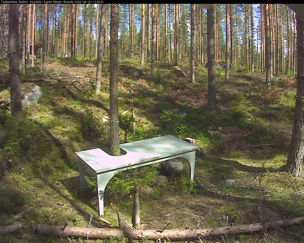 Agnes Meyer-Brandiksen työ Hyytiälässä alkoi tutustumalla aseman muihin tutkijoihin. Pystyäkseen tapaamaan ihmisiä metsässä, hän rakensi pöydän, josta muodostui kohtauspiste ja paikka teehetkille Agneksen ja puun kanssa.