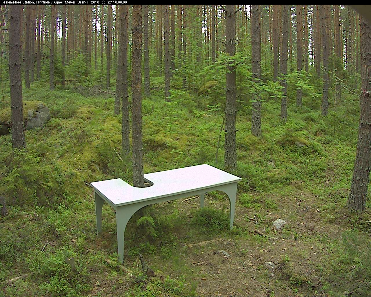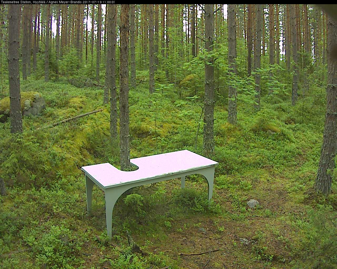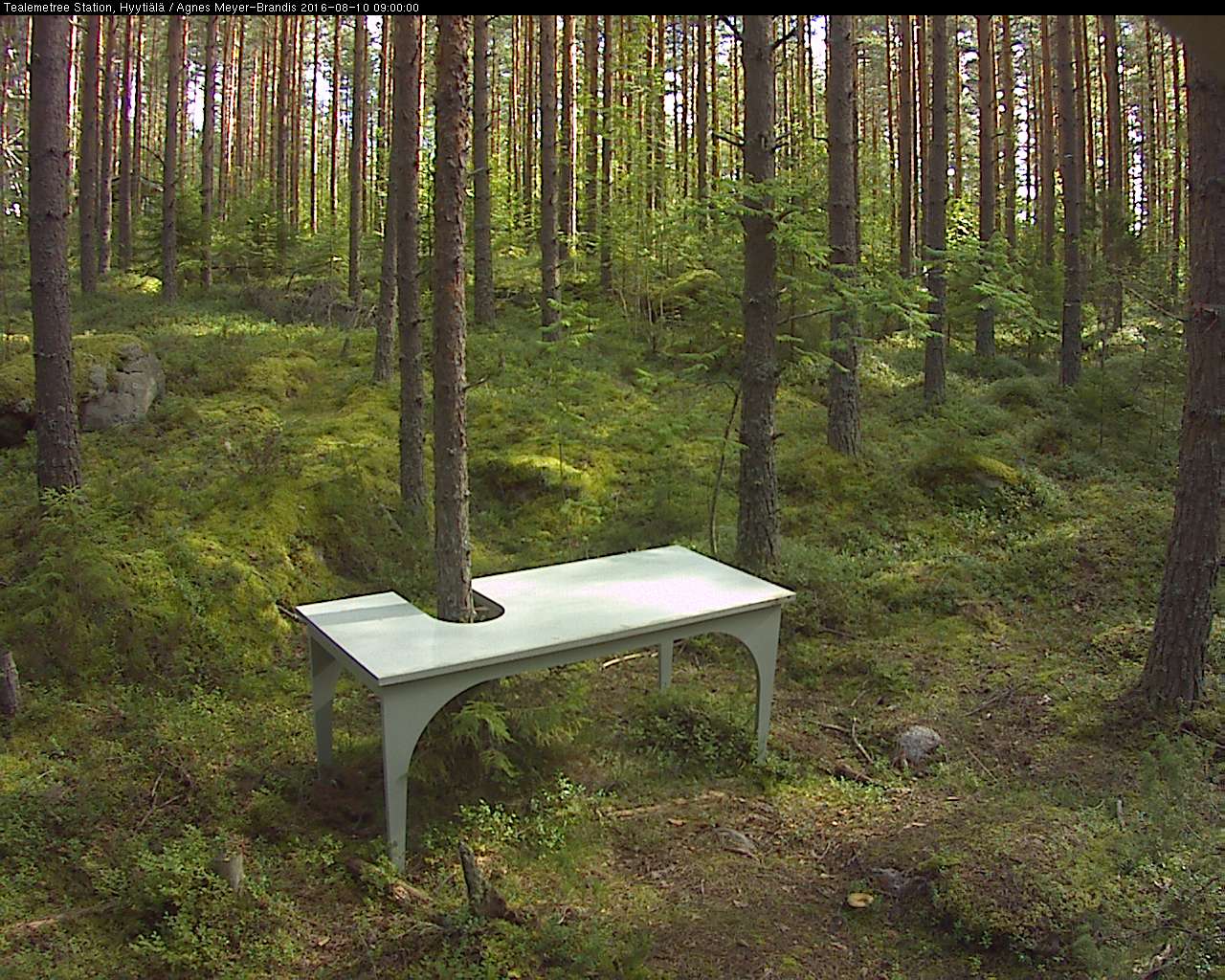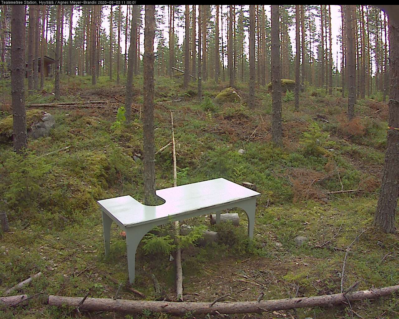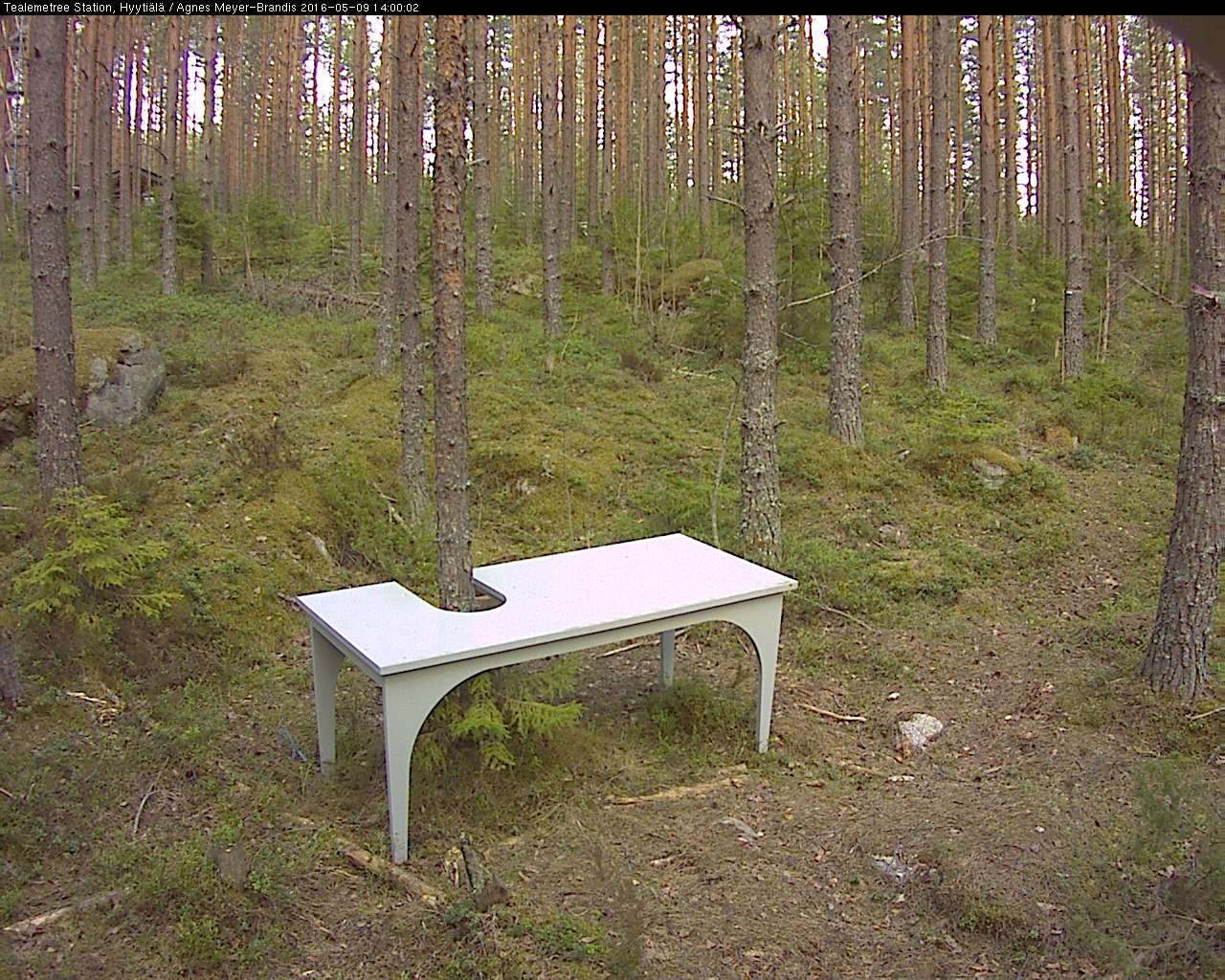 Agnes Meyer-Brandiksen työ Hyytiälässä alkoi tutustumalla aseman muihin tutkijoihin. Pystyäkseen tapaamaan ihmisiä metsässä, hän rakensi pöydän, josta muodostui kohtauspiste ja paikka teehetkille Agneksen ja puun kanssa.