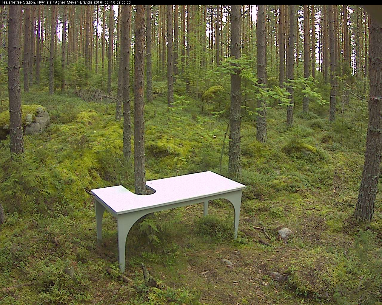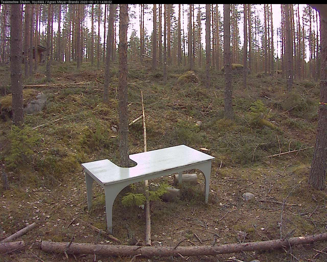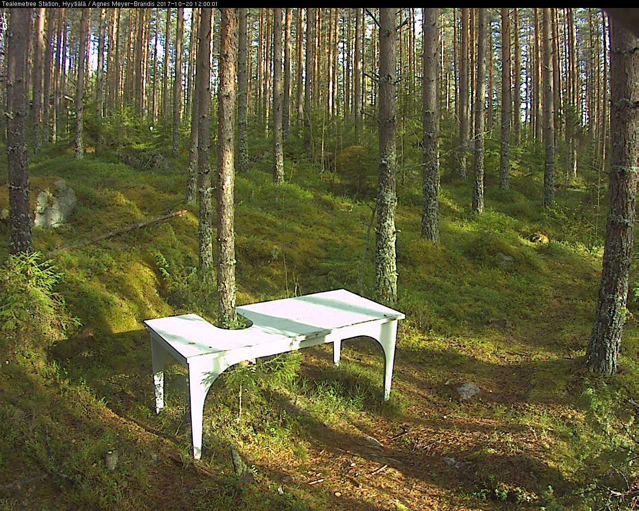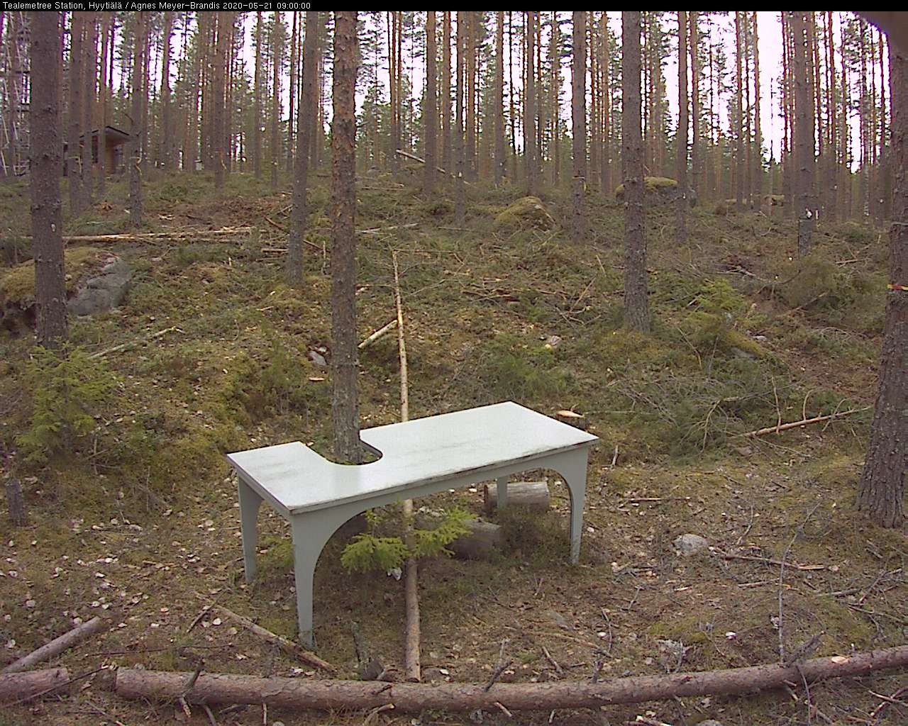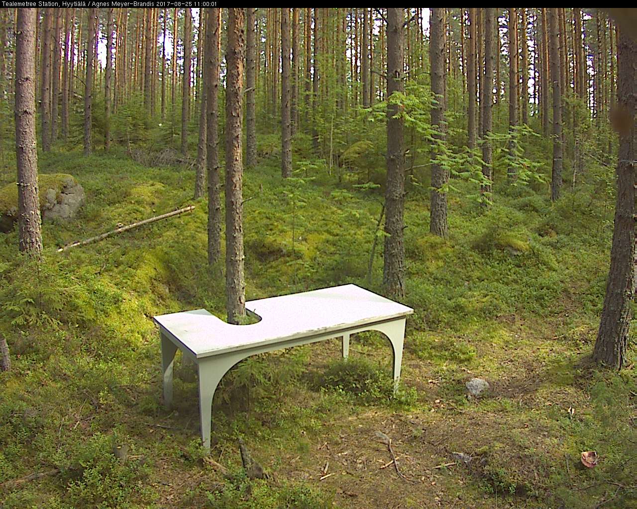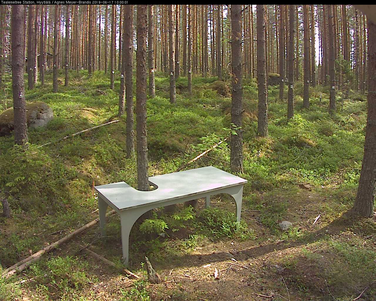 Agnes Meyer-Brandiksen työ Hyytiälässä alkoi tutustumalla aseman muihin tutkijoihin. Pystyäkseen tapaamaan ihmisiä metsässä, hän rakensi pöydän, josta muodostui kohtauspiste ja paikka teehetkille Agneksen ja puun kanssa.