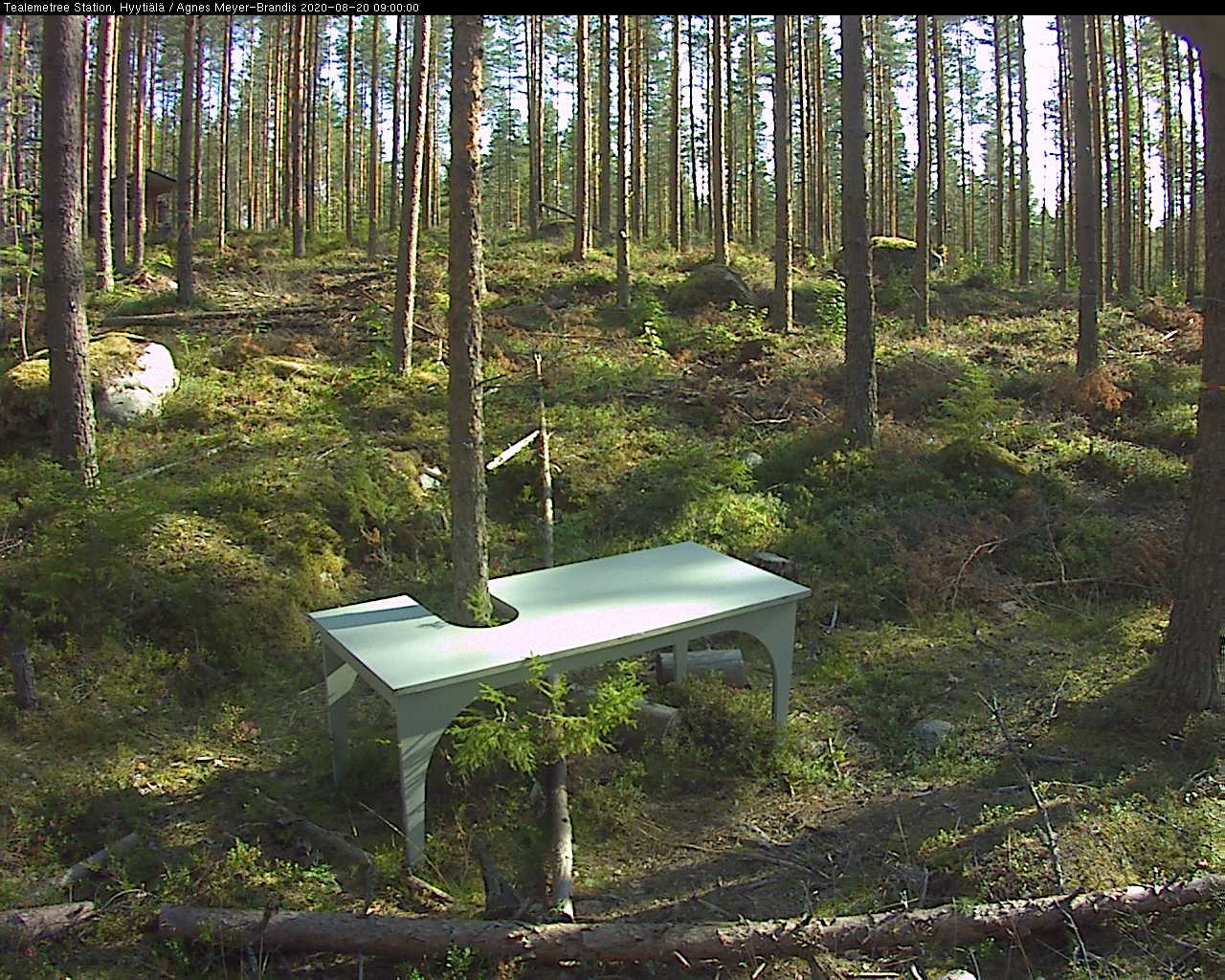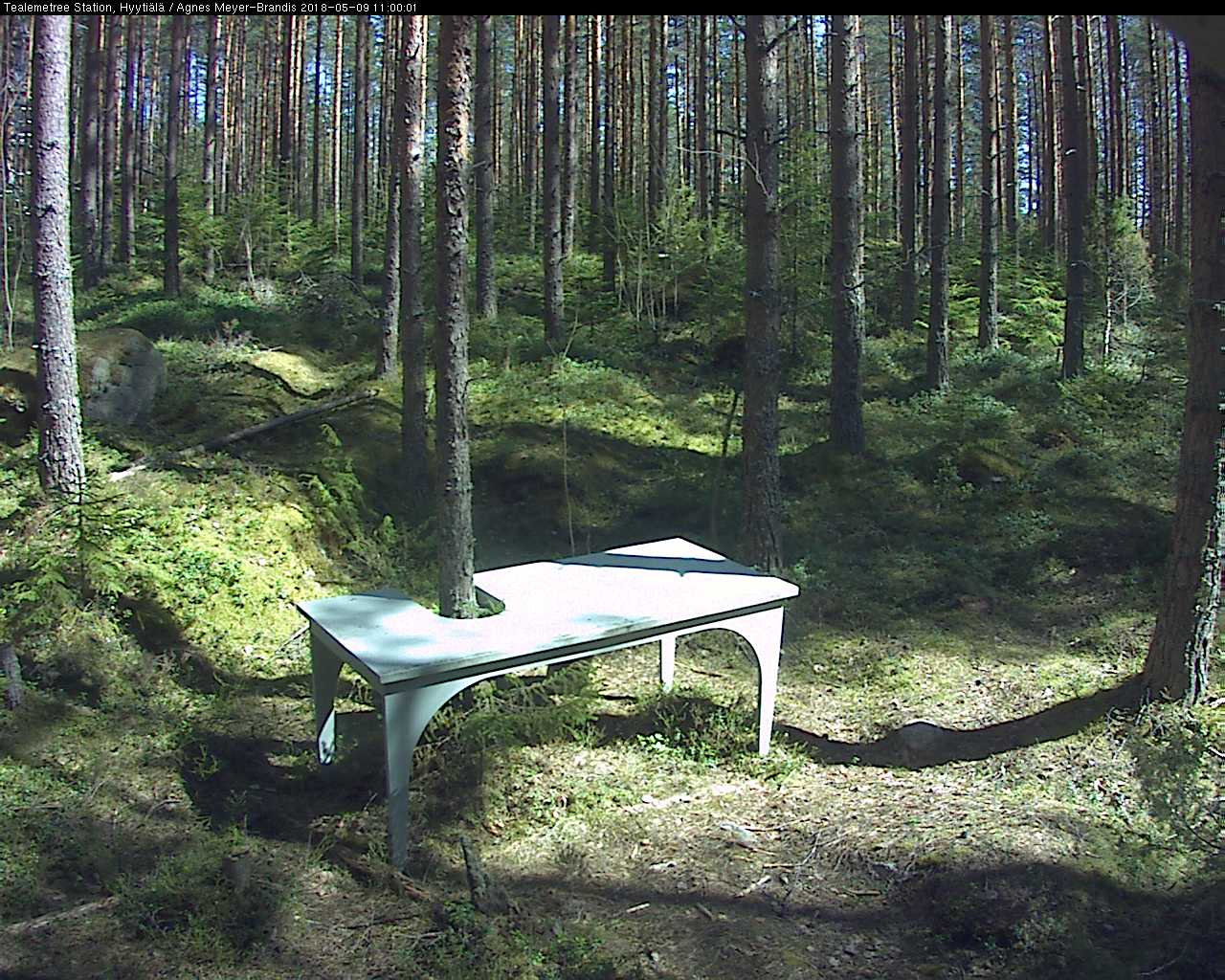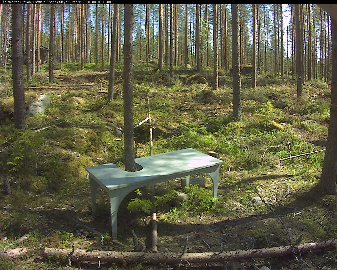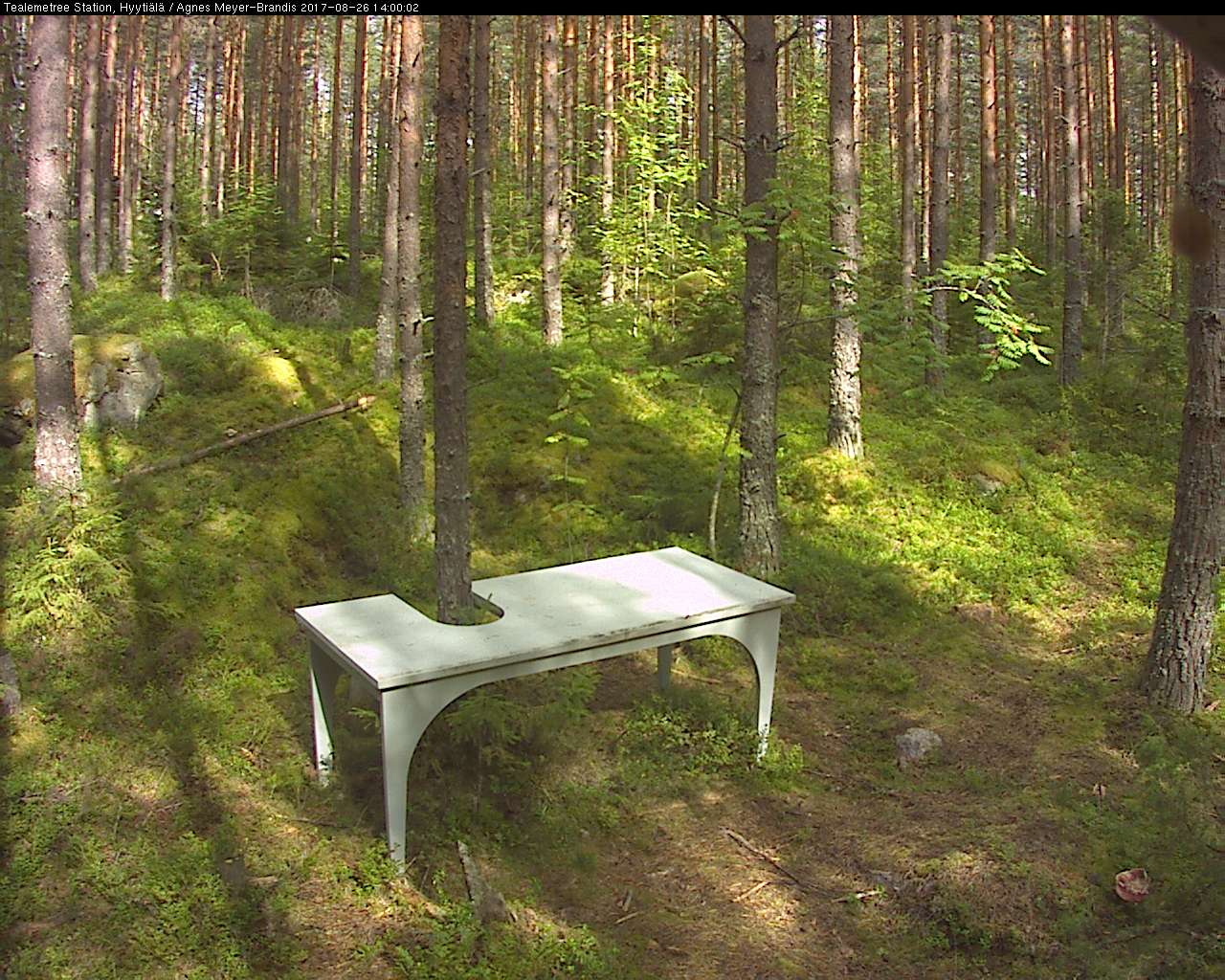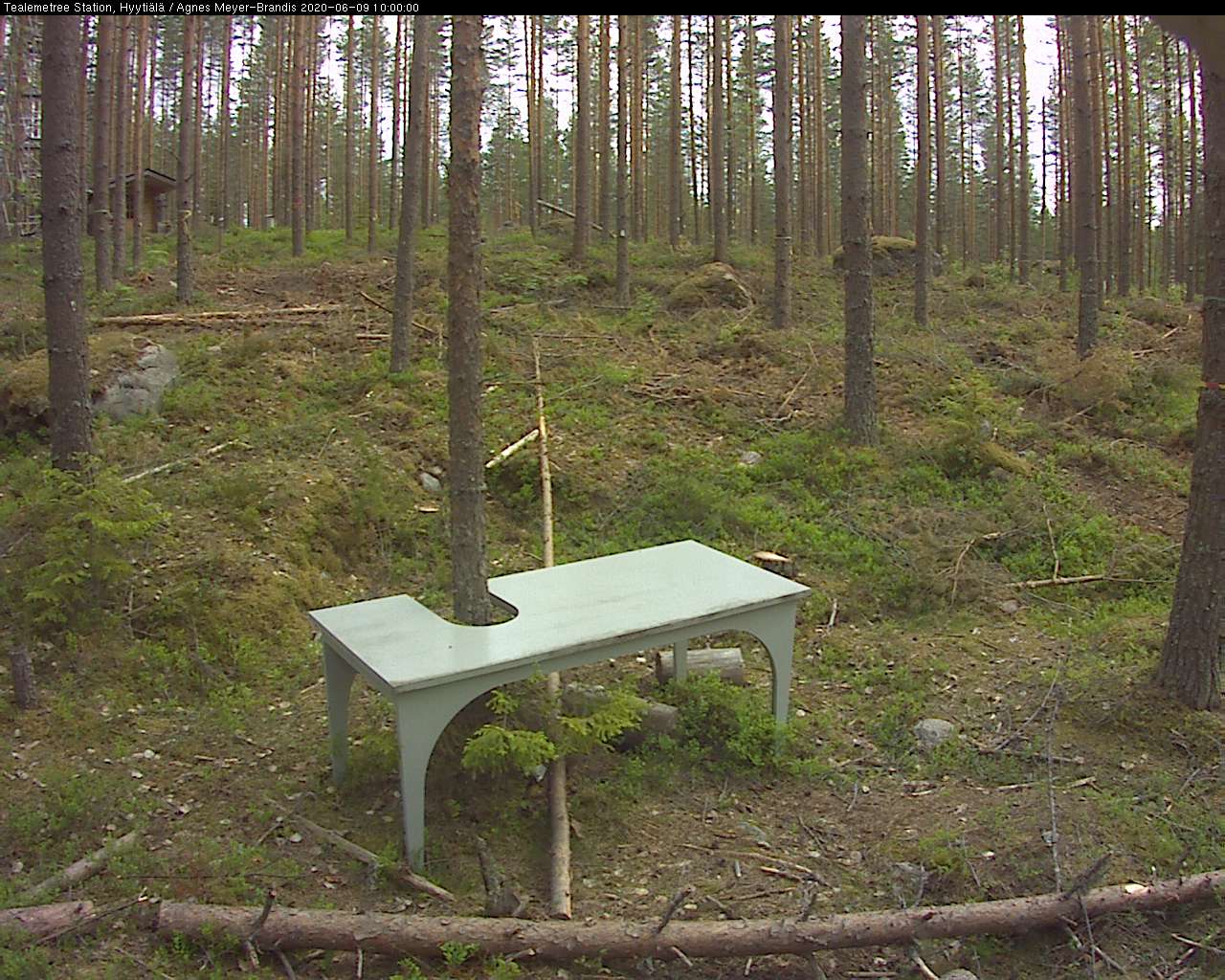 Agnes Meyer-Brandiksen työ Hyytiälässä alkoi tutustumalla aseman muihin tutkijoihin. Pystyäkseen tapaamaan ihmisiä metsässä, hän rakensi pöydän, josta muodostui kohtauspiste ja paikka teehetkille Agneksen ja puun kanssa.