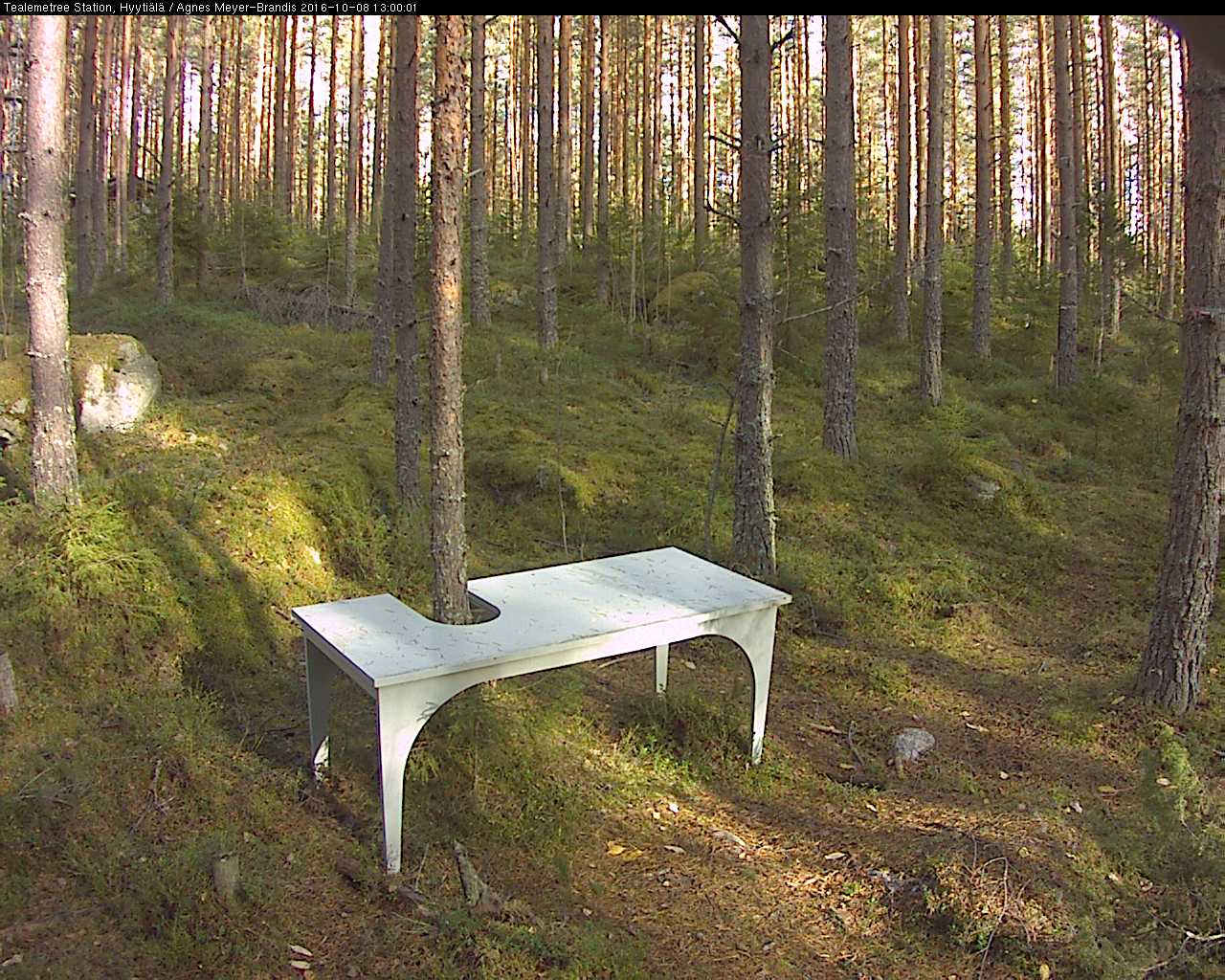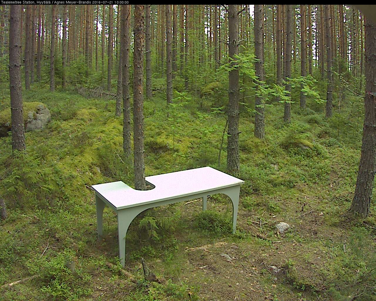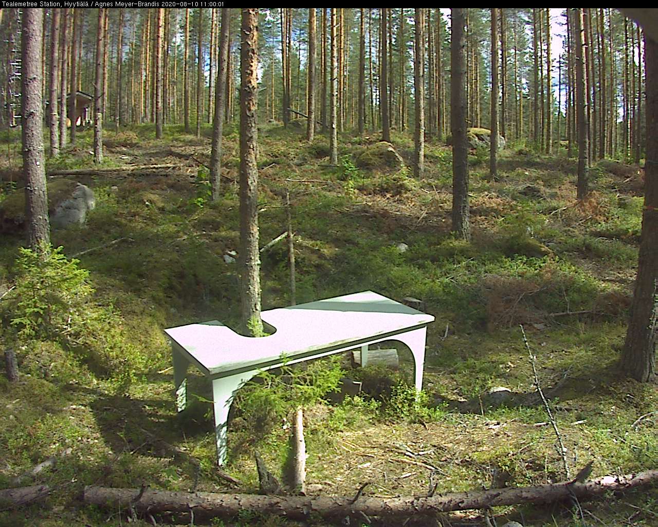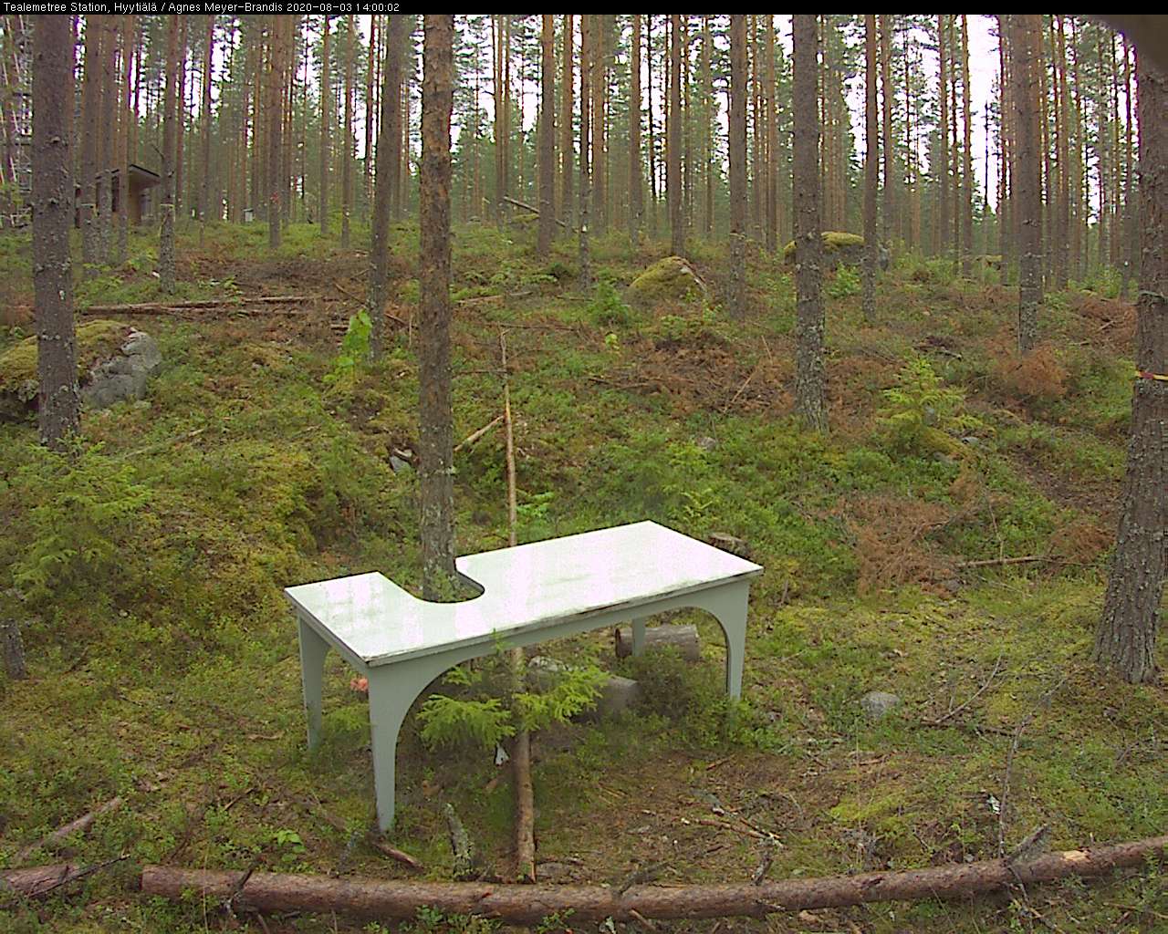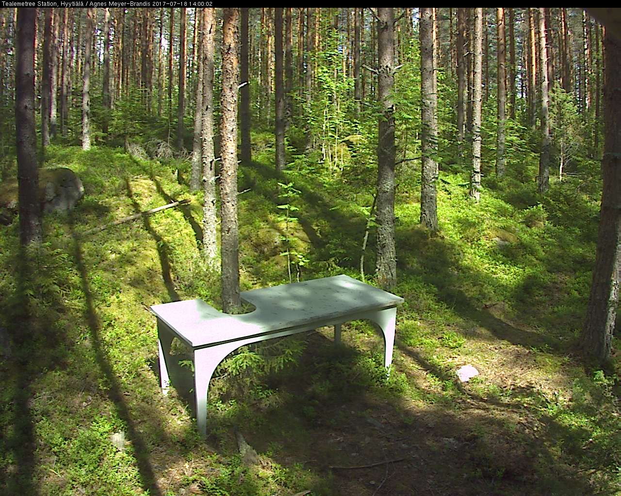 Agnes Meyer-Brandiksen työ Hyytiälässä alkoi tutustumalla aseman muihin tutkijoihin. Pystyäkseen tapaamaan ihmisiä metsässä, hän rakensi pöydän, josta muodostui kohtauspiste ja paikka teehetkille Agneksen ja puun kanssa.