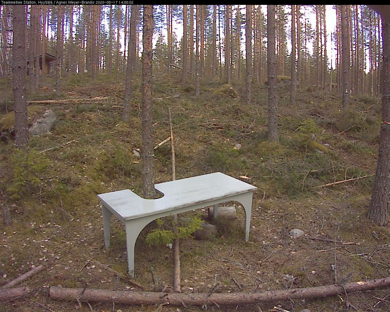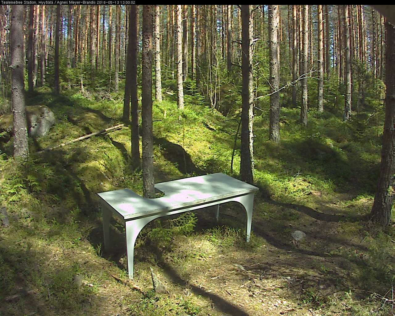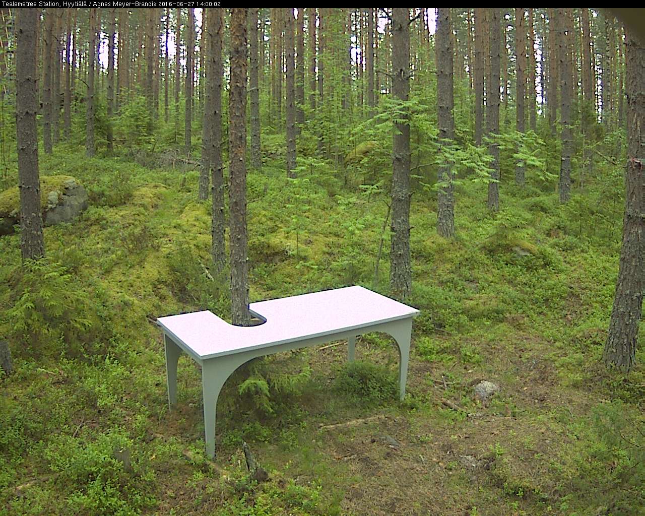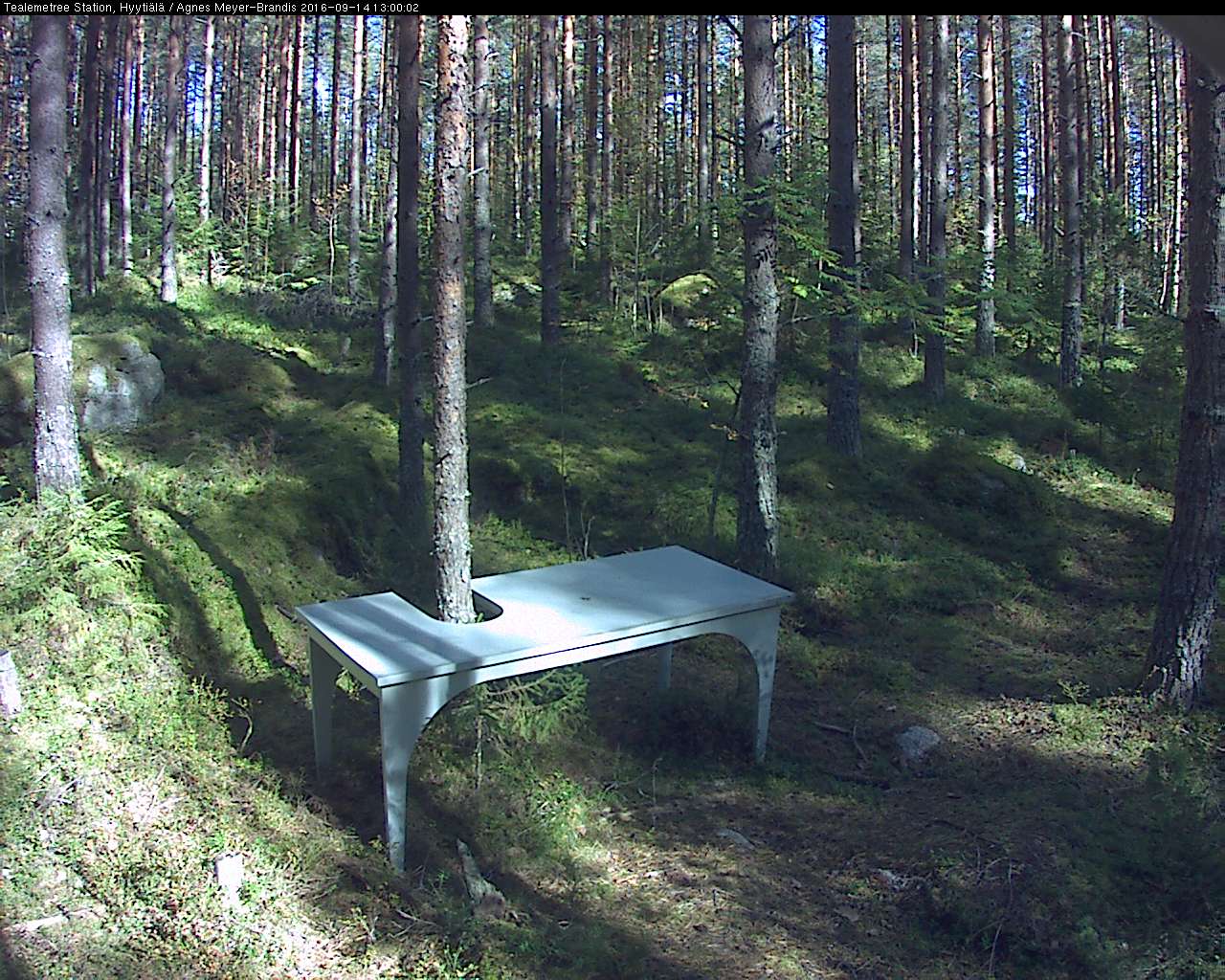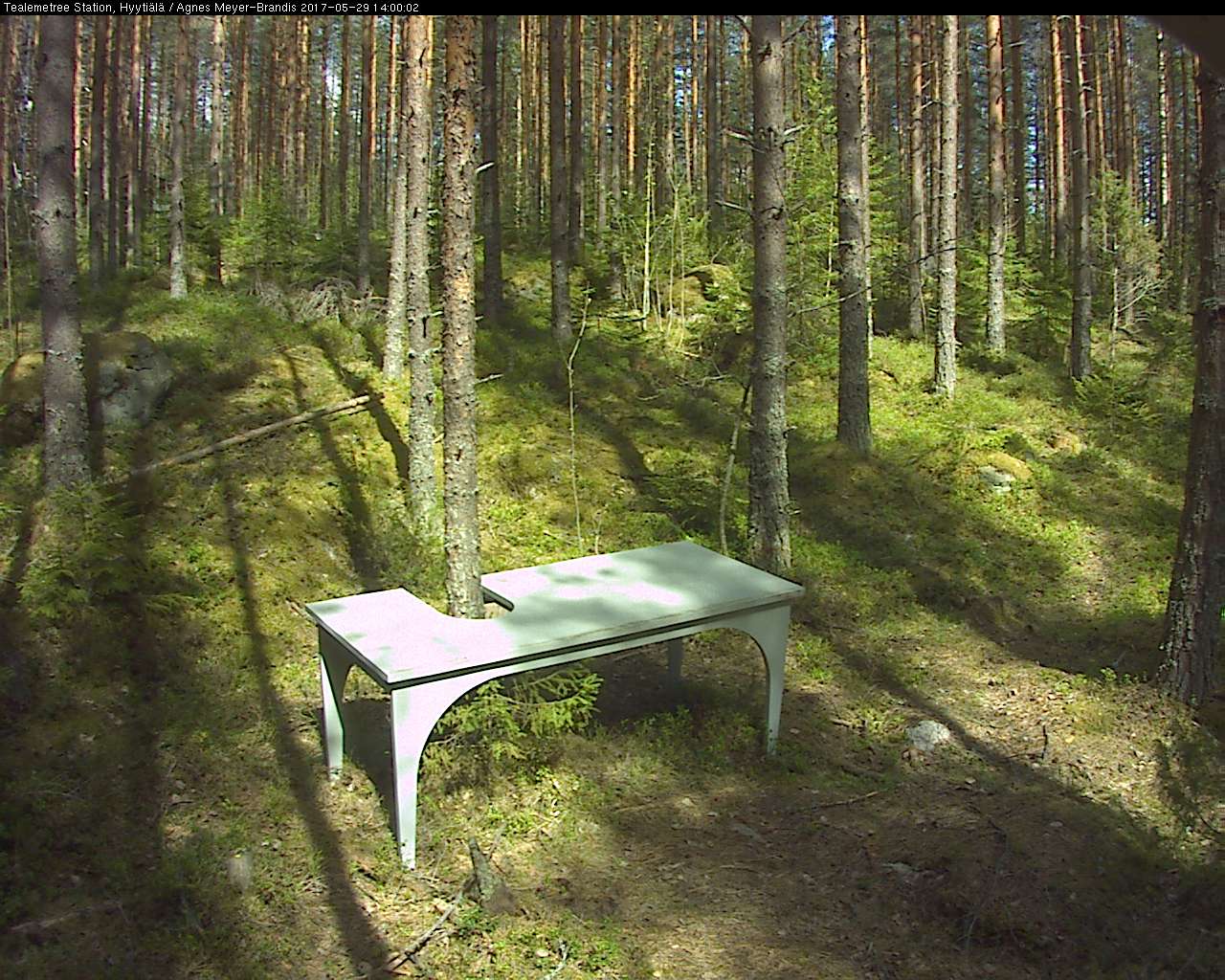 Agnes Meyer-Brandiksen työ Hyytiälässä alkoi tutustumalla aseman muihin tutkijoihin. Pystyäkseen tapaamaan ihmisiä metsässä, hän rakensi pöydän, josta muodostui kohtauspiste ja paikka teehetkille Agneksen ja puun kanssa.