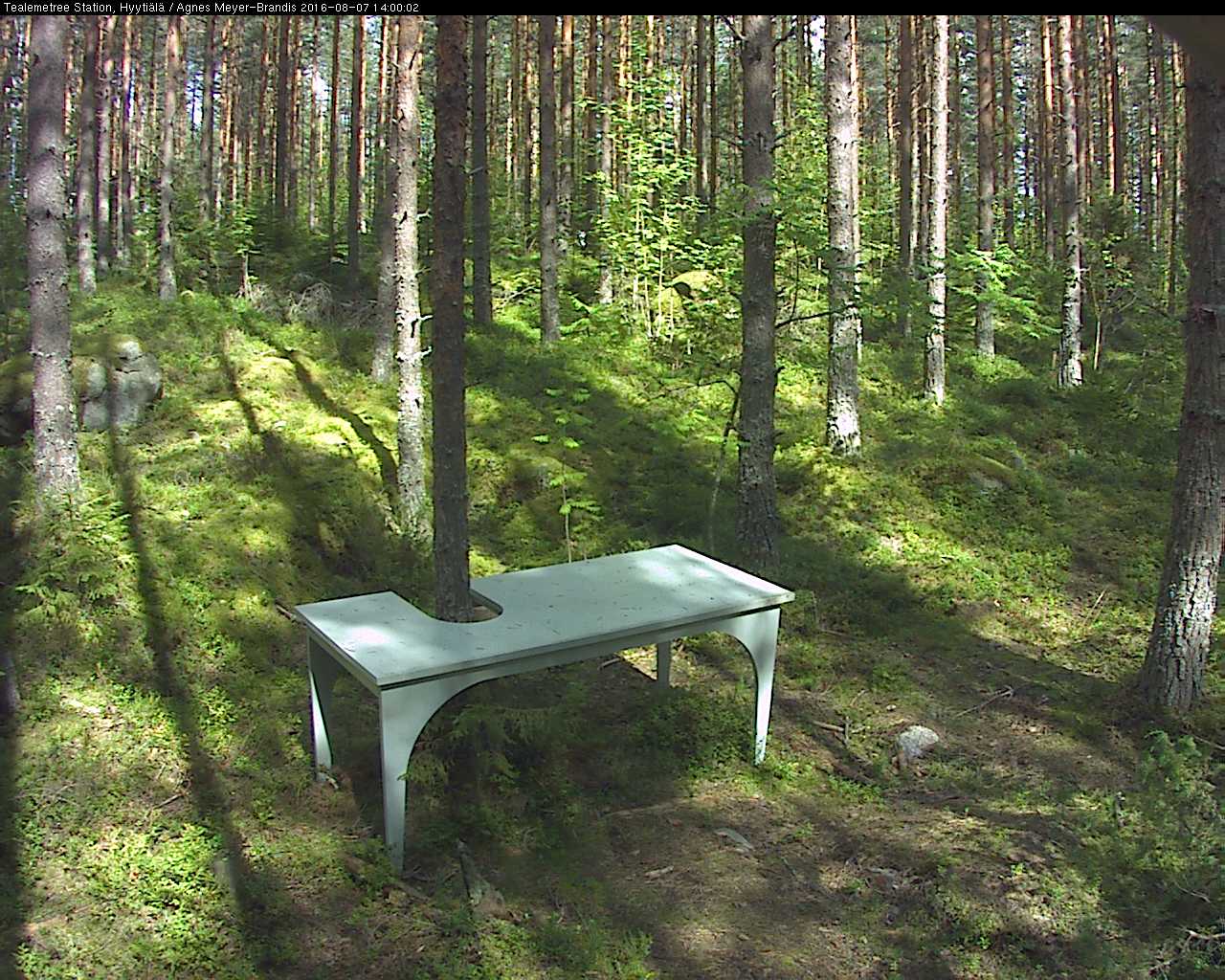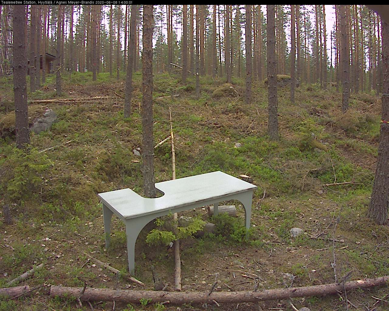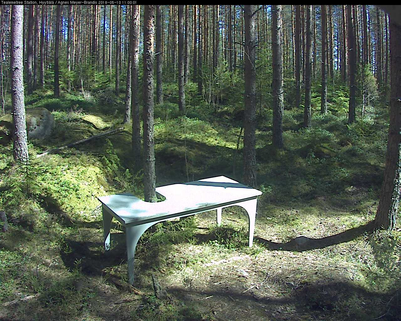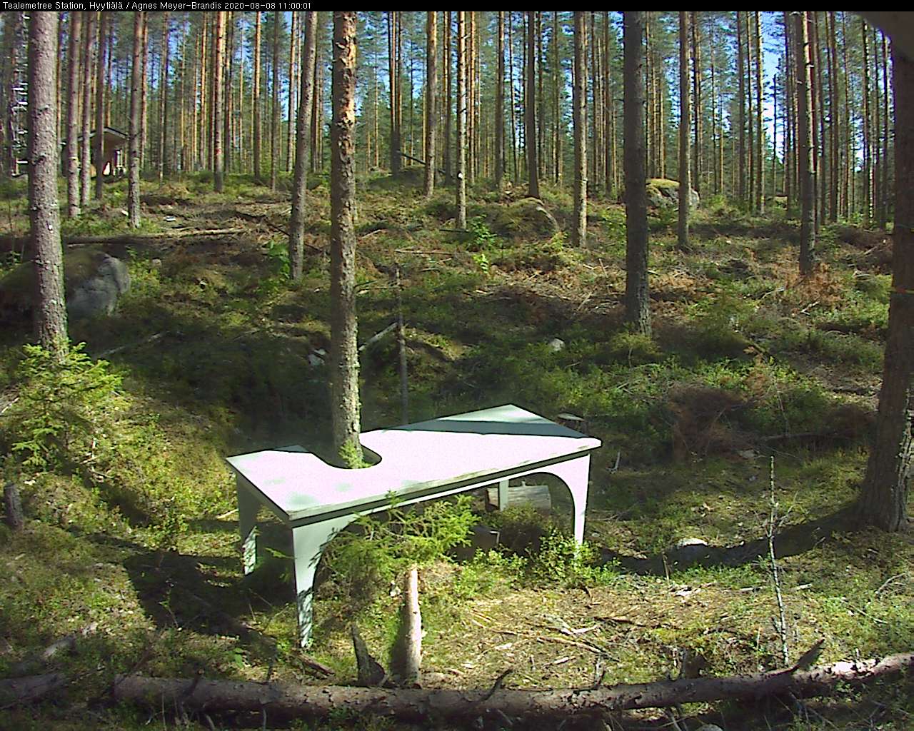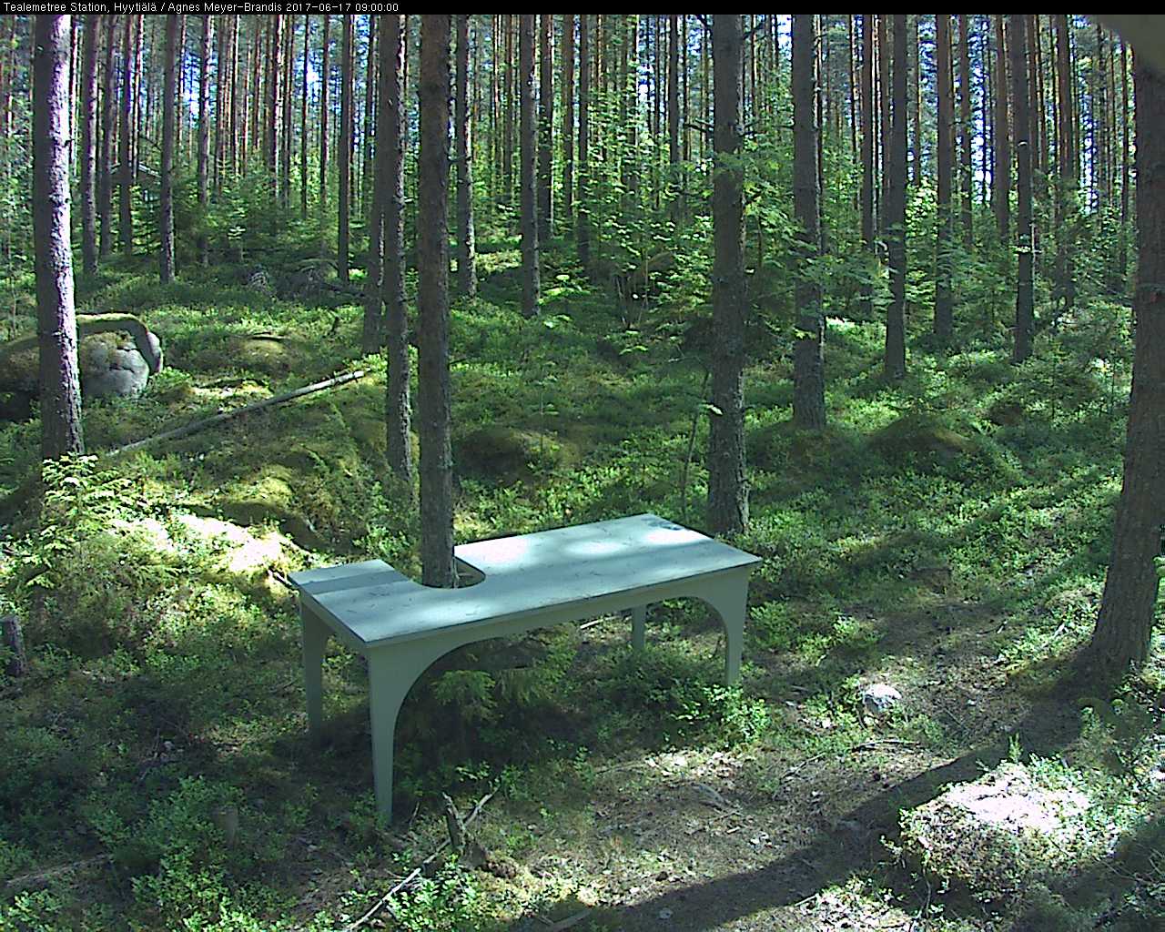 Agnes Meyer-Brandiksen työ Hyytiälässä alkoi tutustumalla aseman muihin tutkijoihin. Pystyäkseen tapaamaan ihmisiä metsässä, hän rakensi pöydän, josta muodostui kohtauspiste ja paikka teehetkille Agneksen ja puun kanssa.