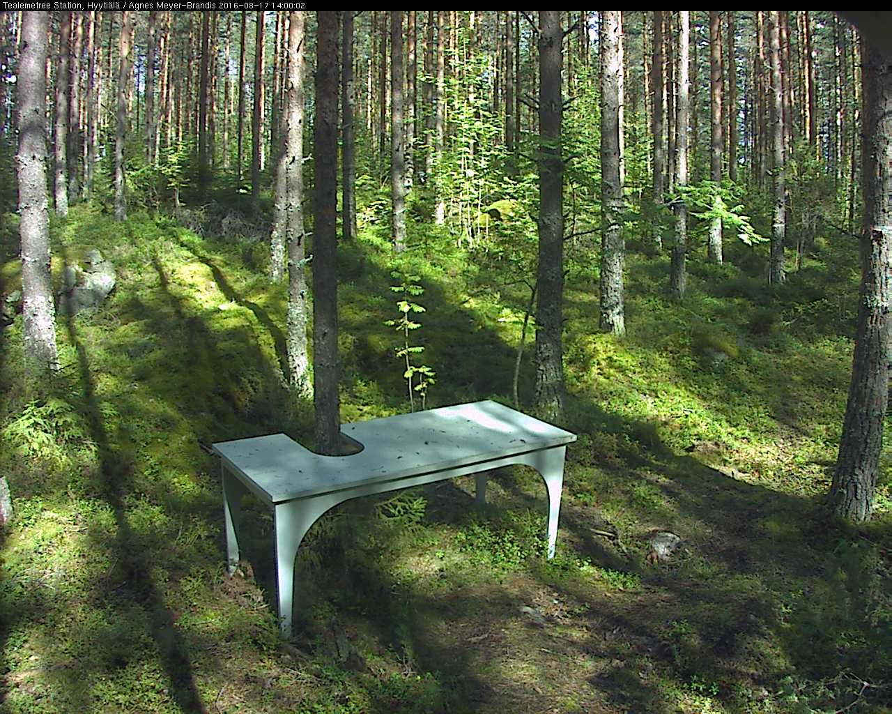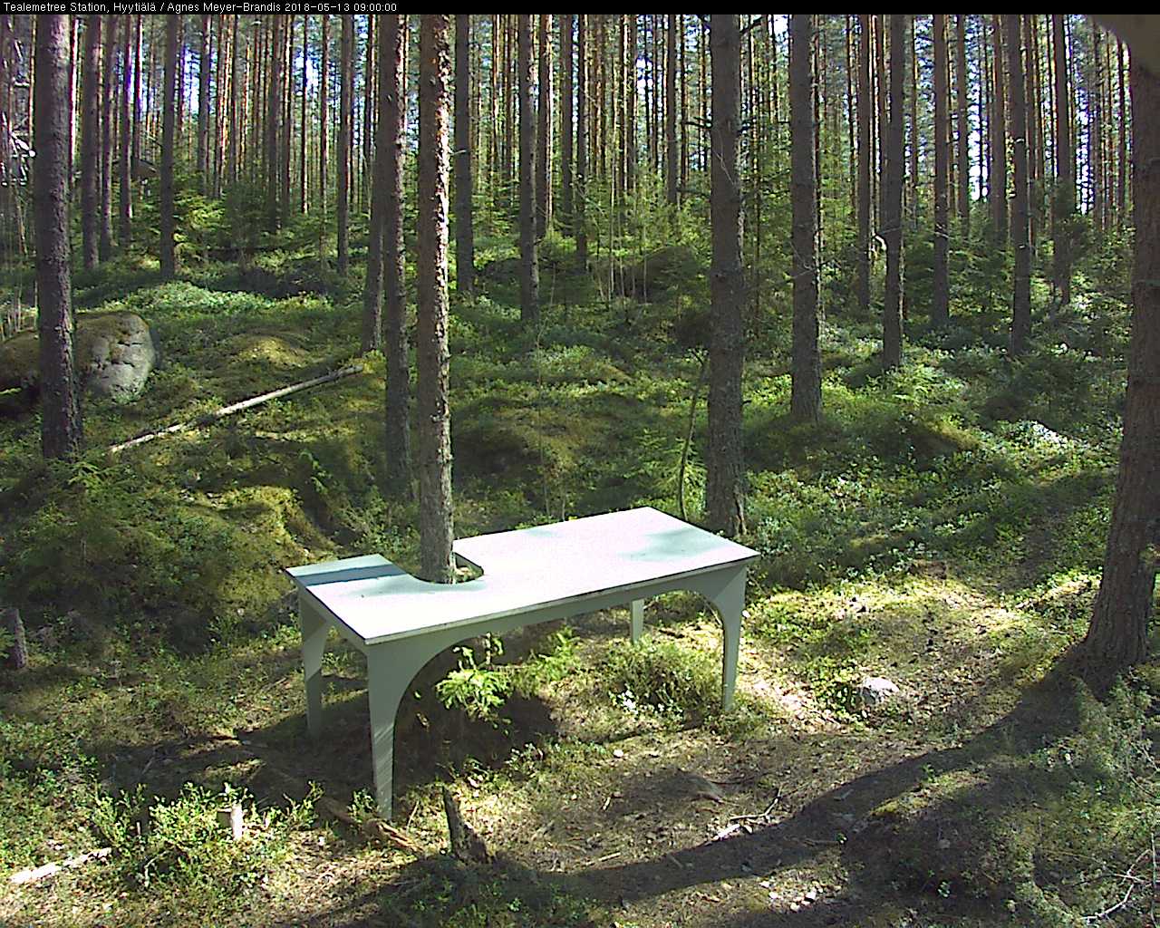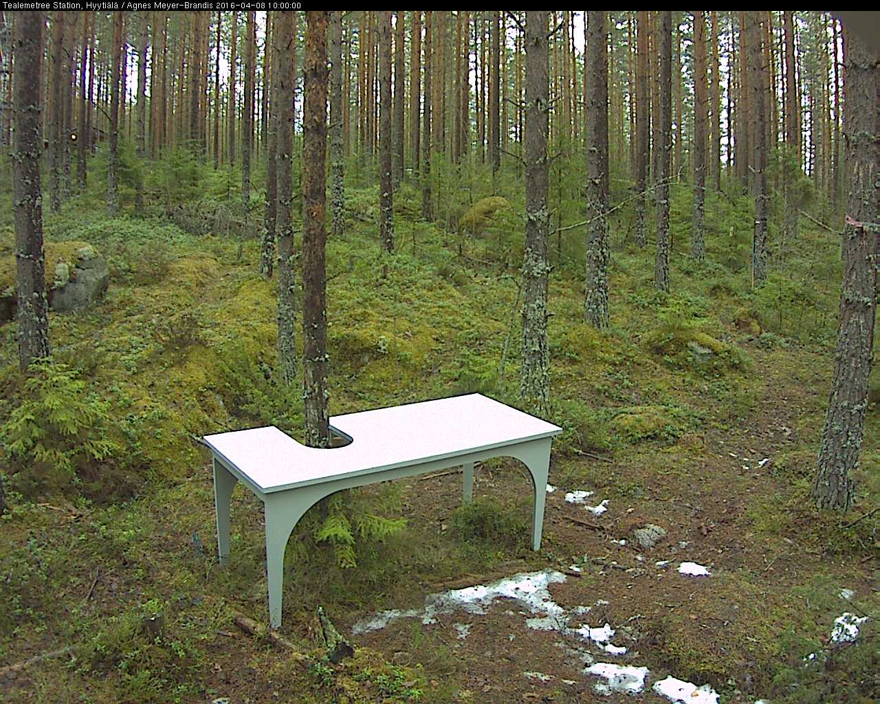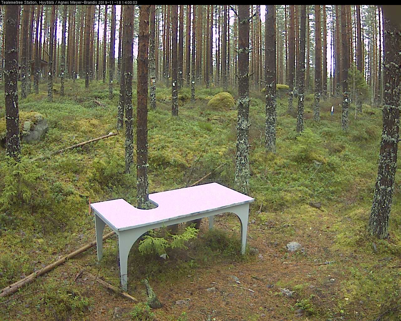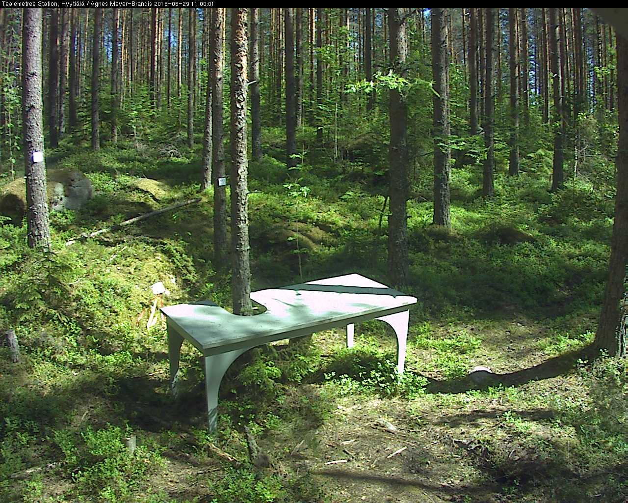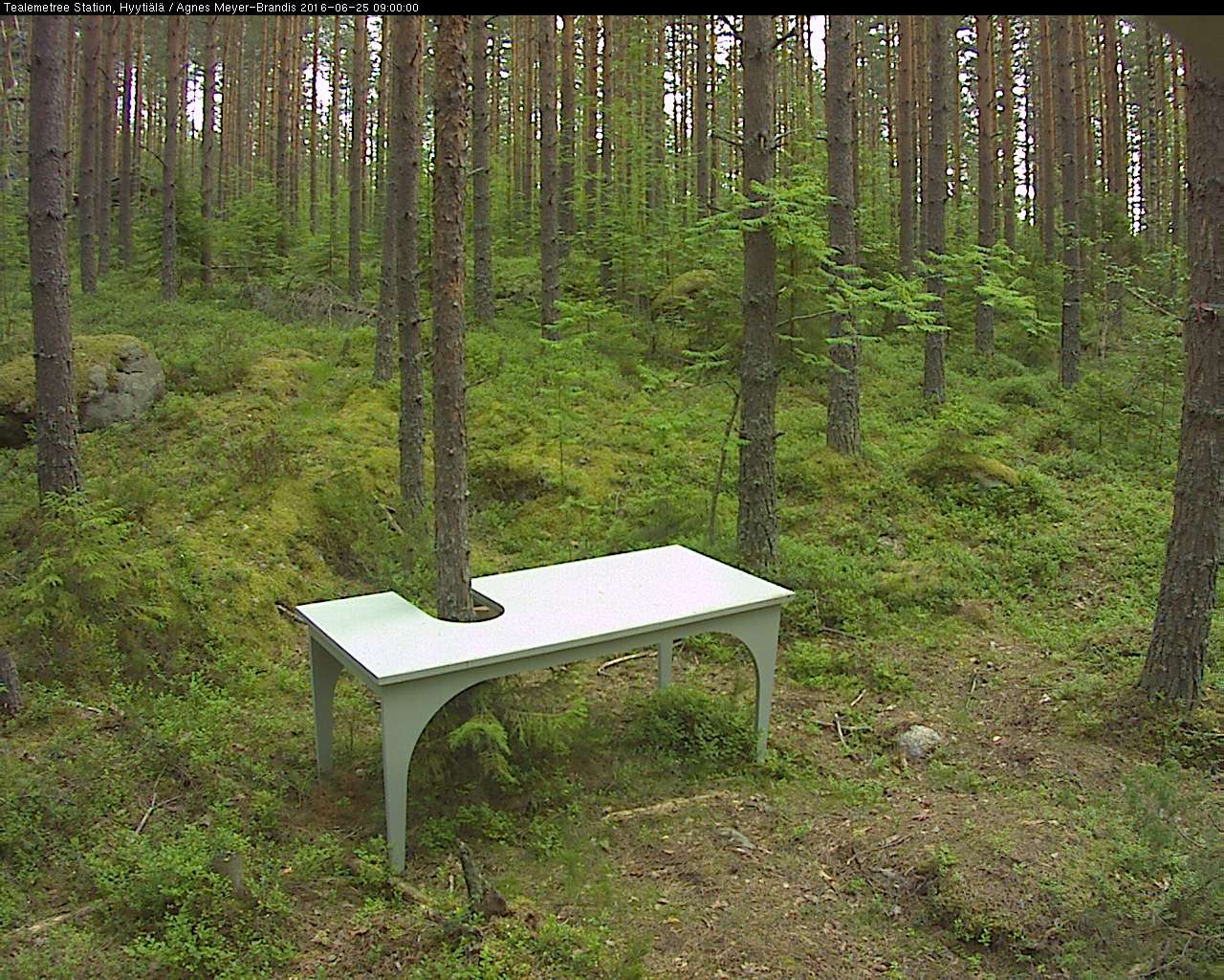Agnes Meyer-Brandiksen työ Hyytiälässä alkoi tutustumalla aseman muihin tutkijoihin. Pystyäkseen tapaamaan ihmisiä metsässä, hän rakensi pöydän, josta muodostui kohtauspiste ja paikka teehetkille Agneksen ja puun kanssa.