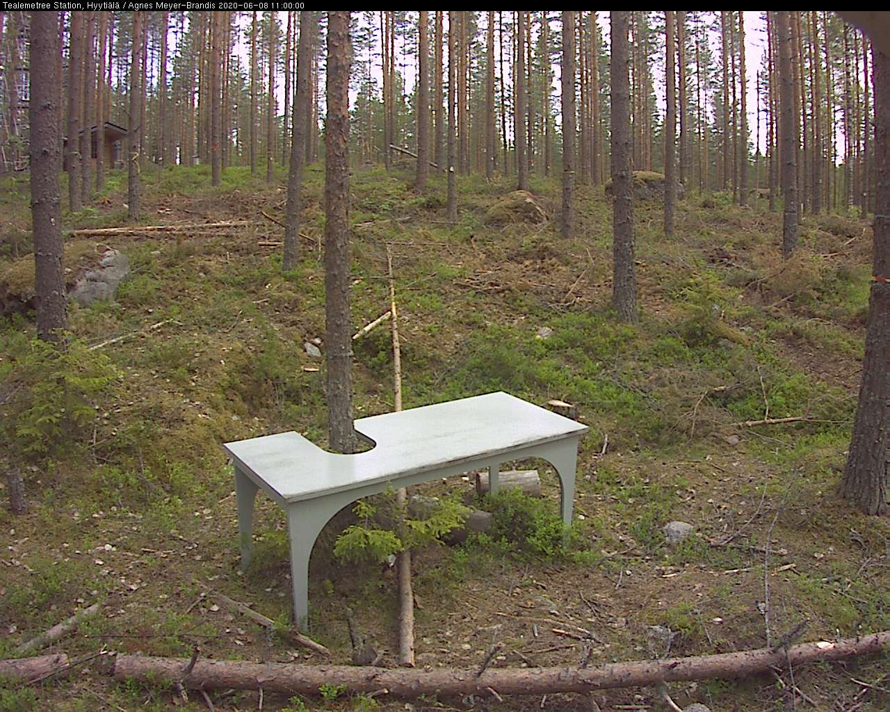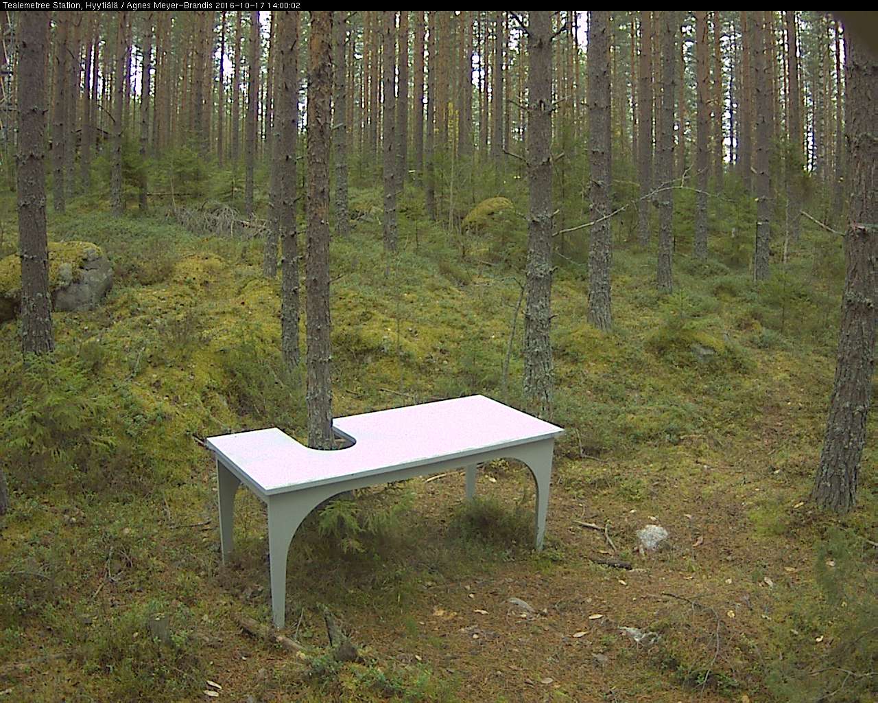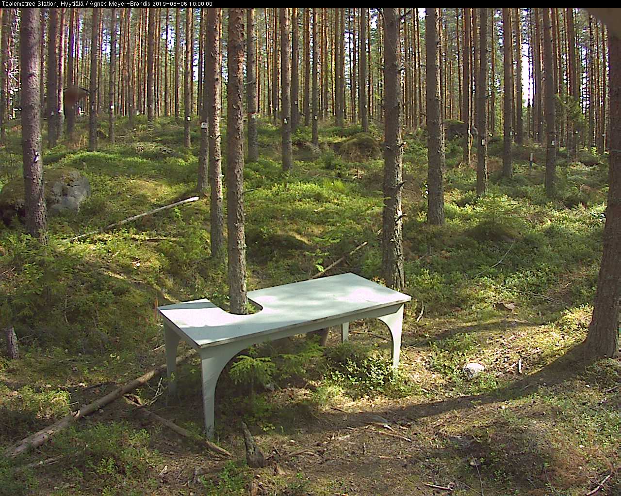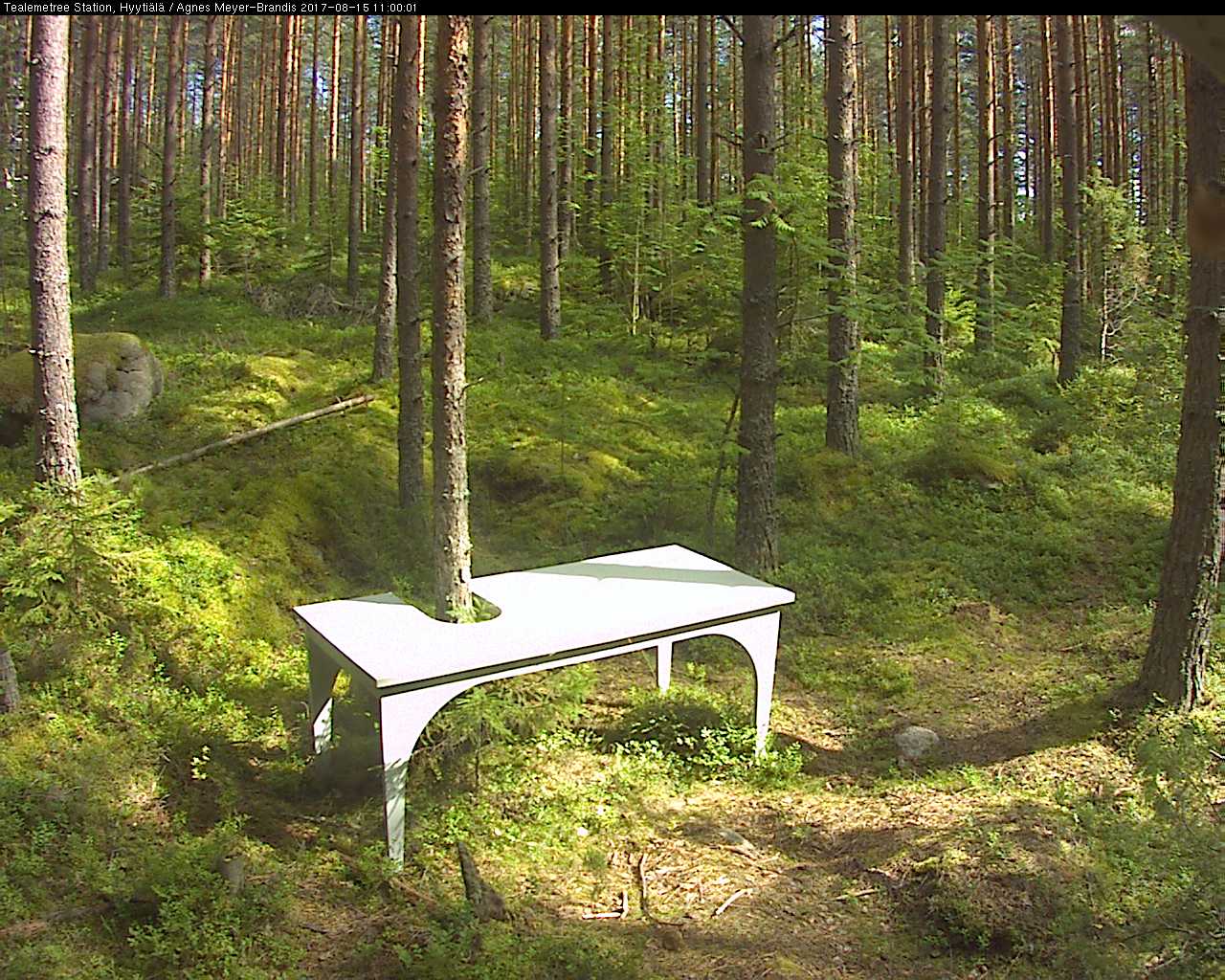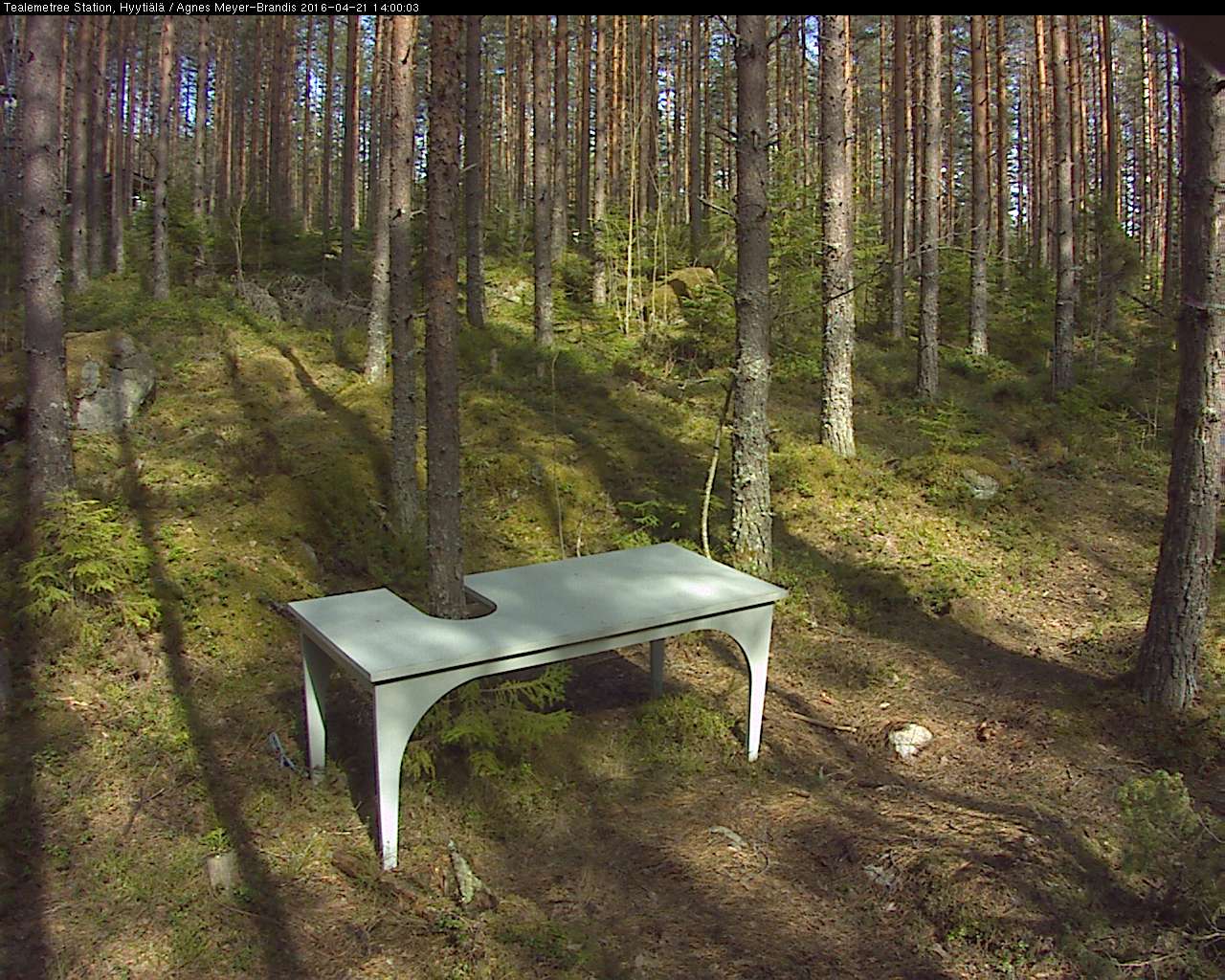 Agnes Meyer-Brandiksen työ Hyytiälässä alkoi tutustumalla aseman muihin tutkijoihin. Pystyäkseen tapaamaan ihmisiä metsässä, hän rakensi pöydän, josta muodostui kohtauspiste ja paikka teehetkille Agneksen ja puun kanssa.