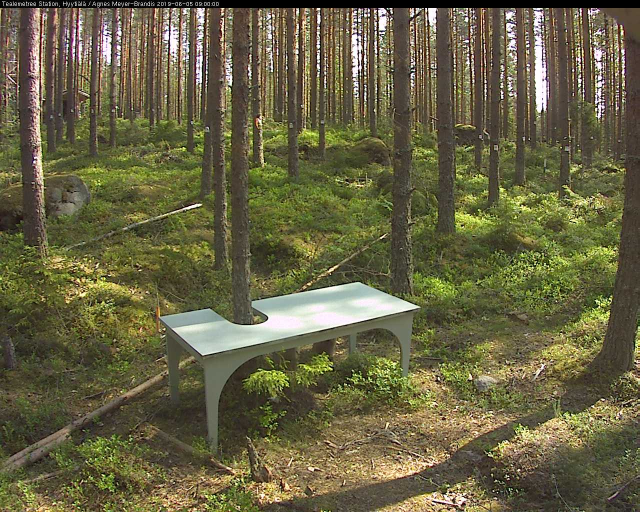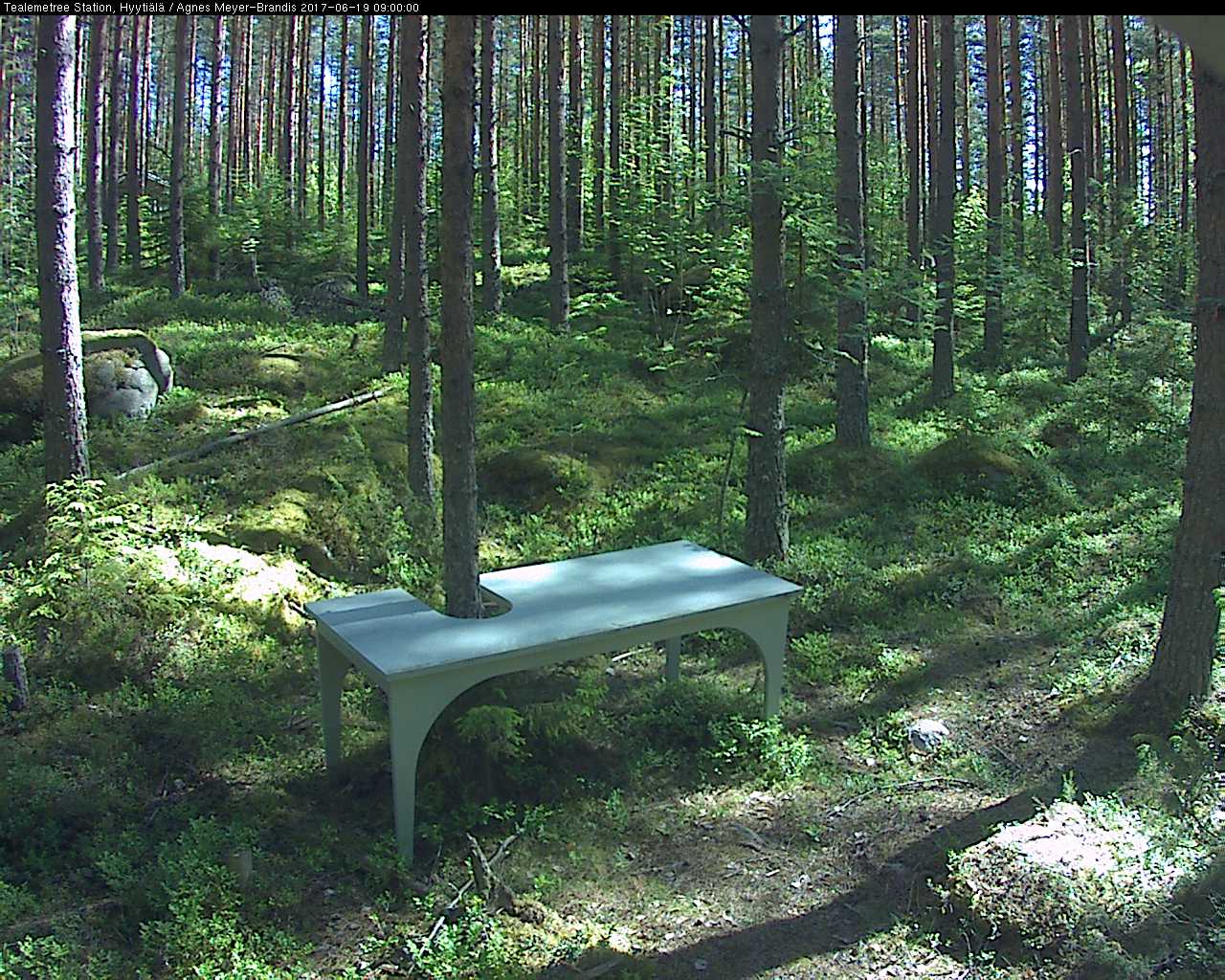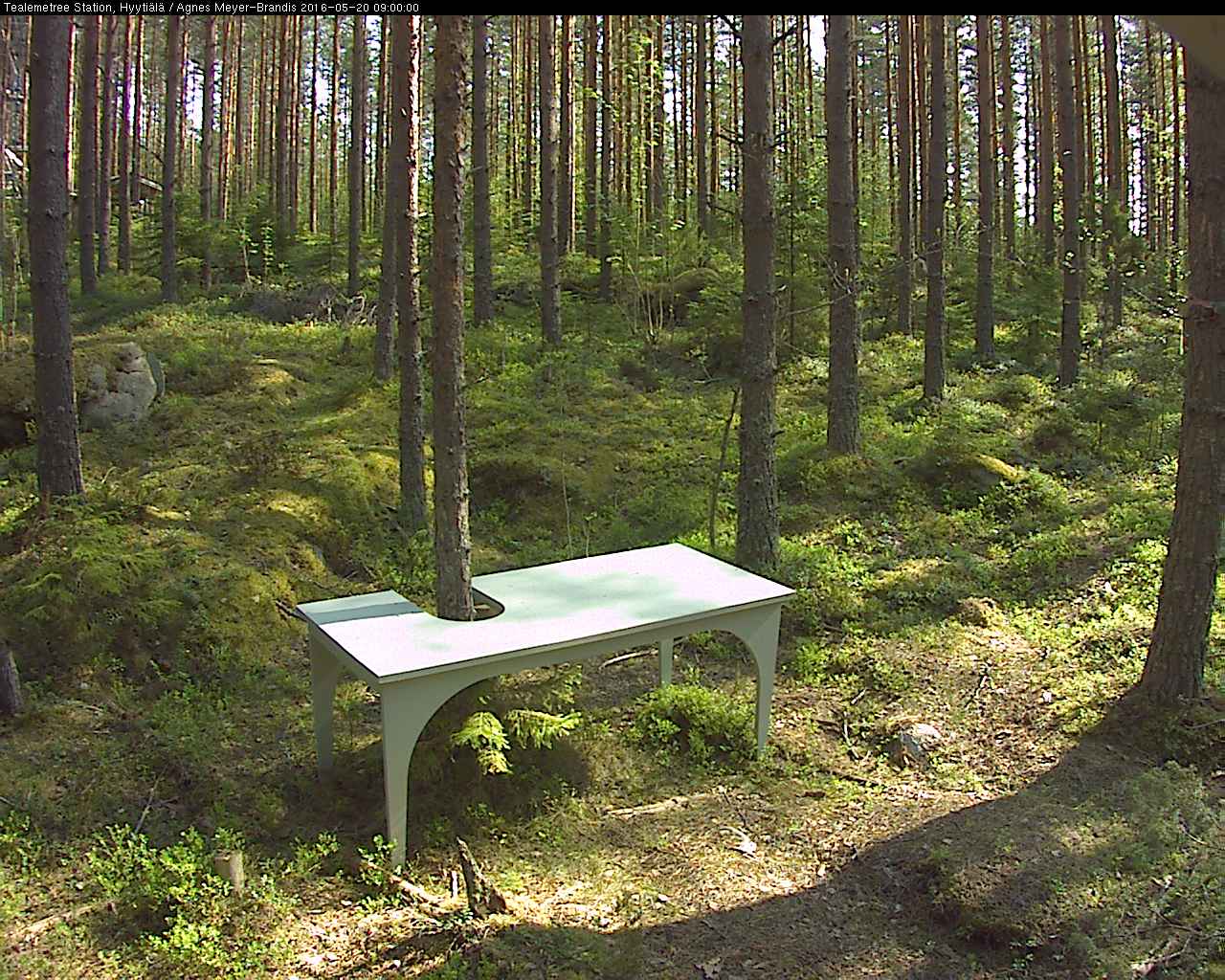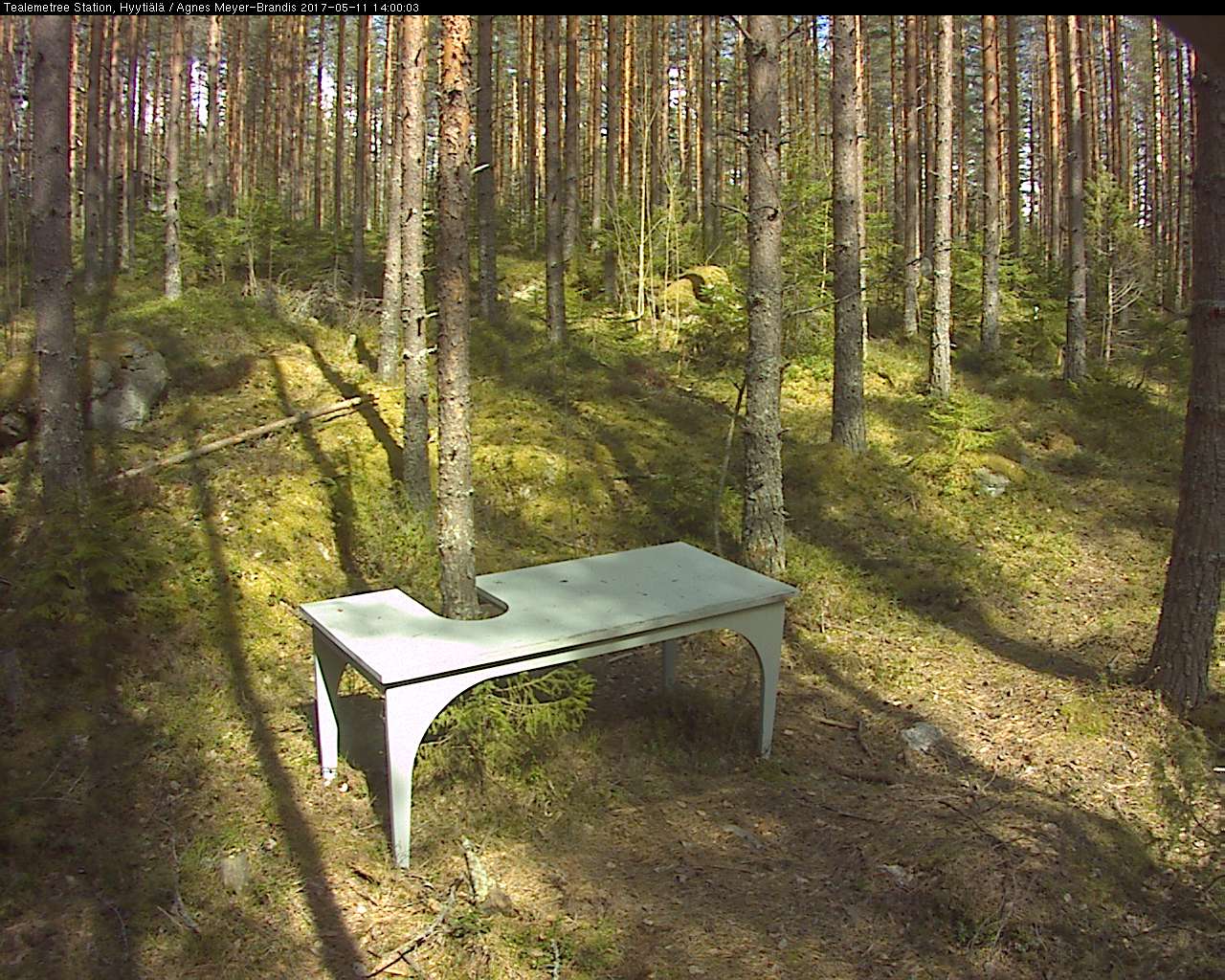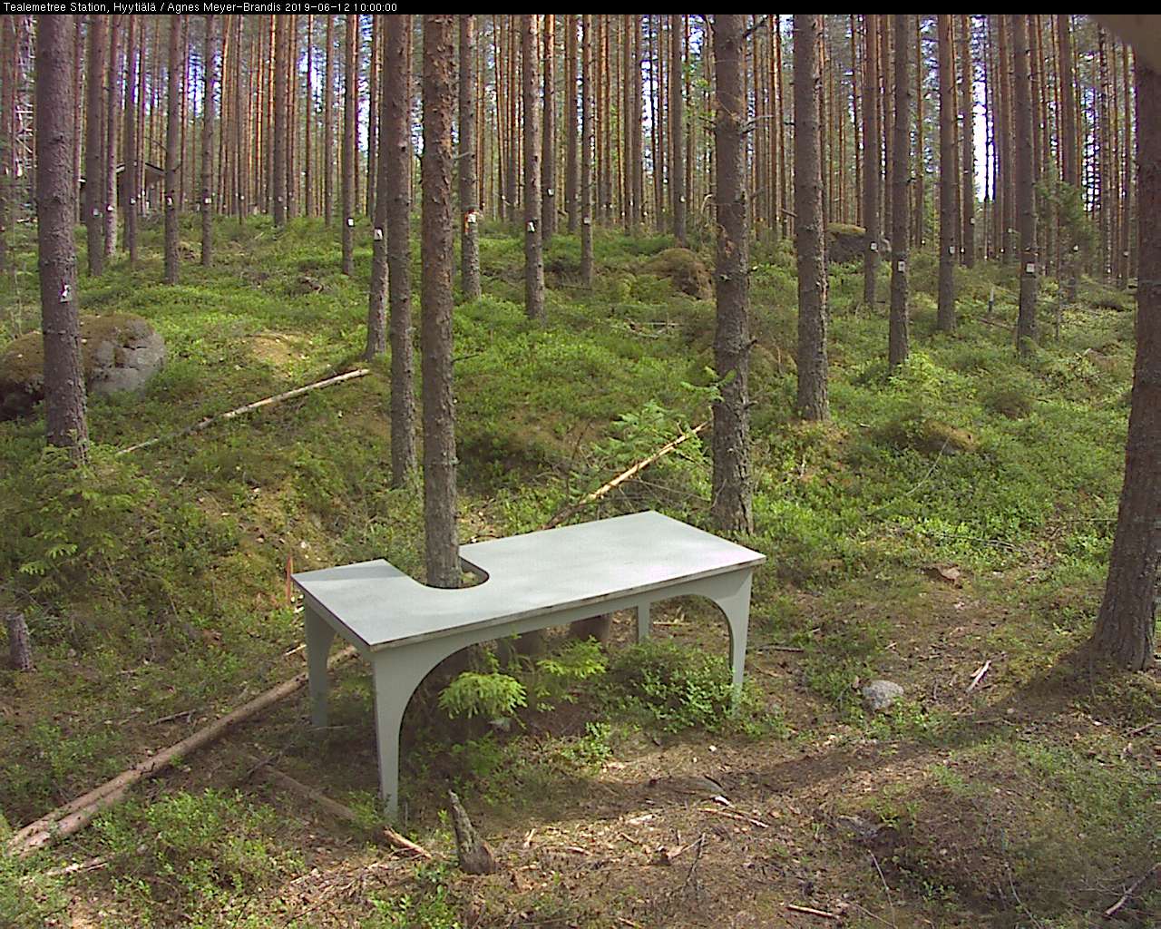 Agnes Meyer-Brandiksen työ Hyytiälässä alkoi tutustumalla aseman muihin tutkijoihin. Pystyäkseen tapaamaan ihmisiä metsässä, hän rakensi pöydän, josta muodostui kohtauspiste ja paikka teehetkille Agneksen ja puun kanssa.