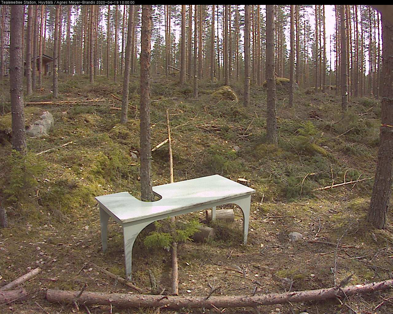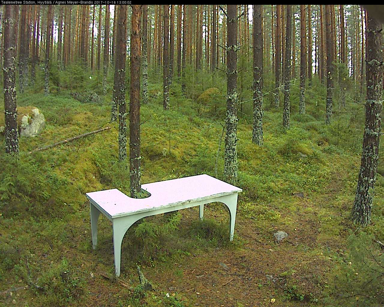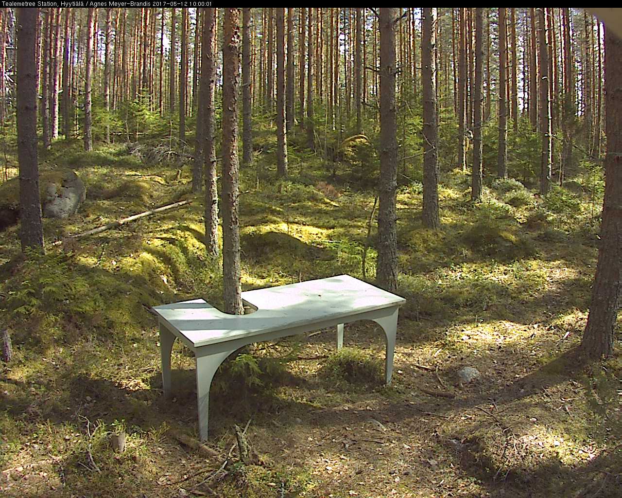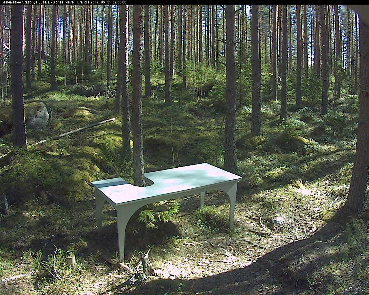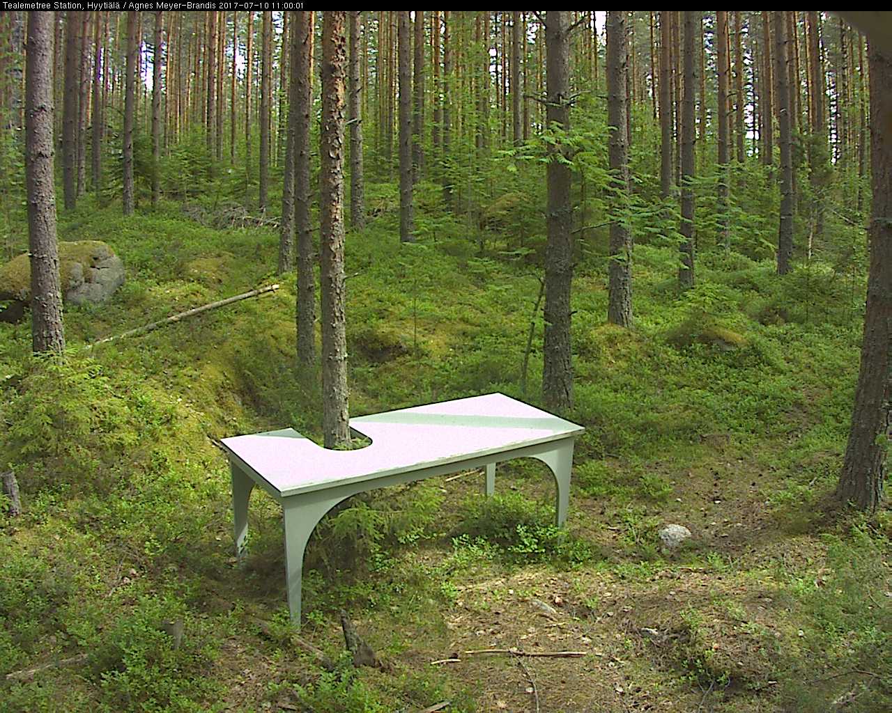 Agnes Meyer-Brandiksen työ Hyytiälässä alkoi tutustumalla aseman muihin tutkijoihin. Pystyäkseen tapaamaan ihmisiä metsässä, hän rakensi pöydän, josta muodostui kohtauspiste ja paikka teehetkille Agneksen ja puun kanssa.