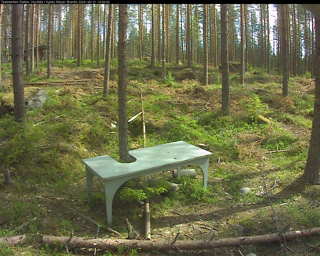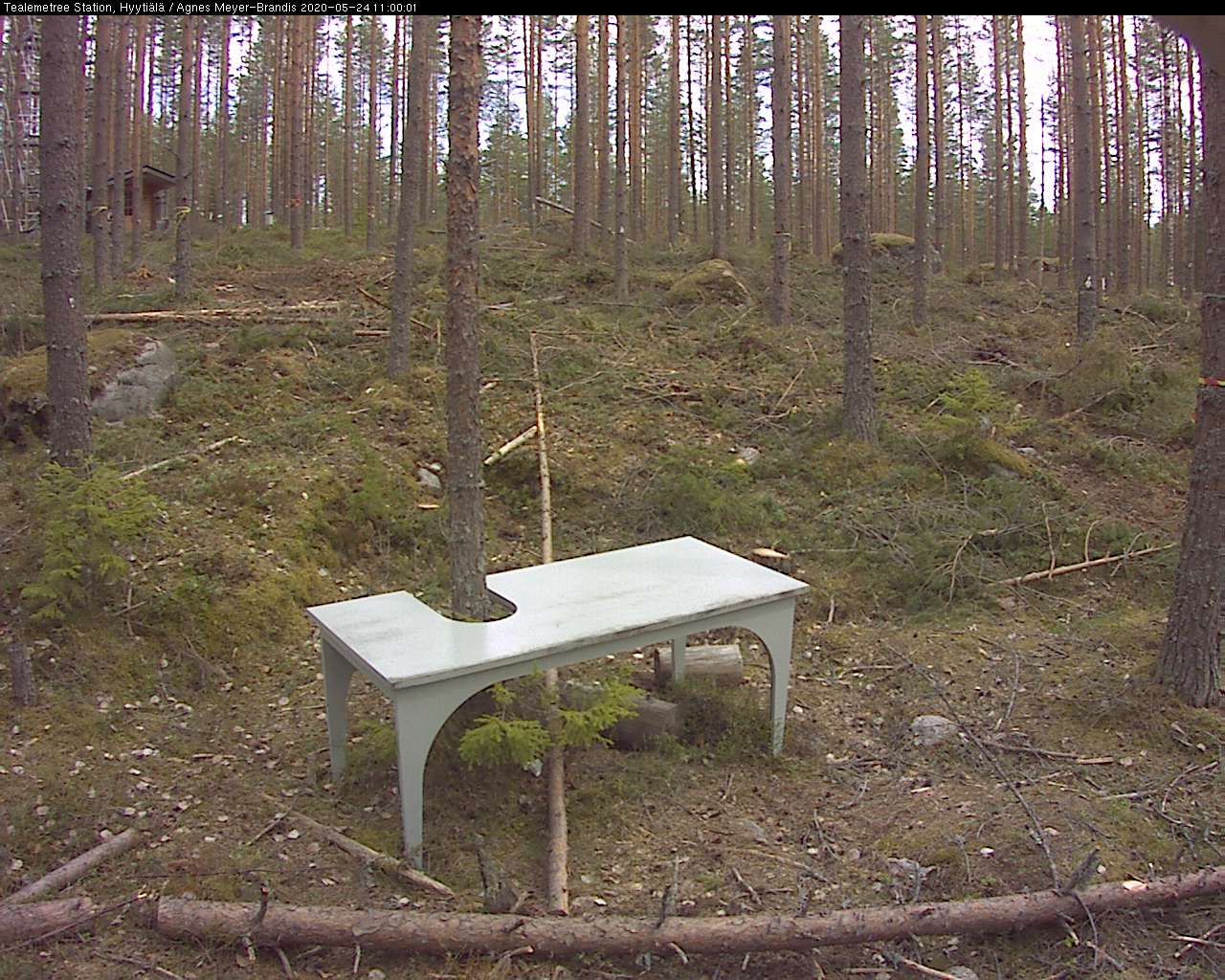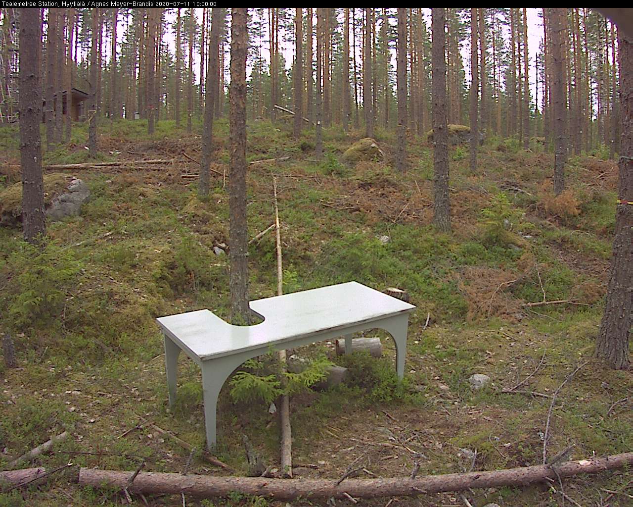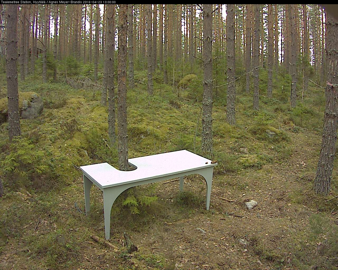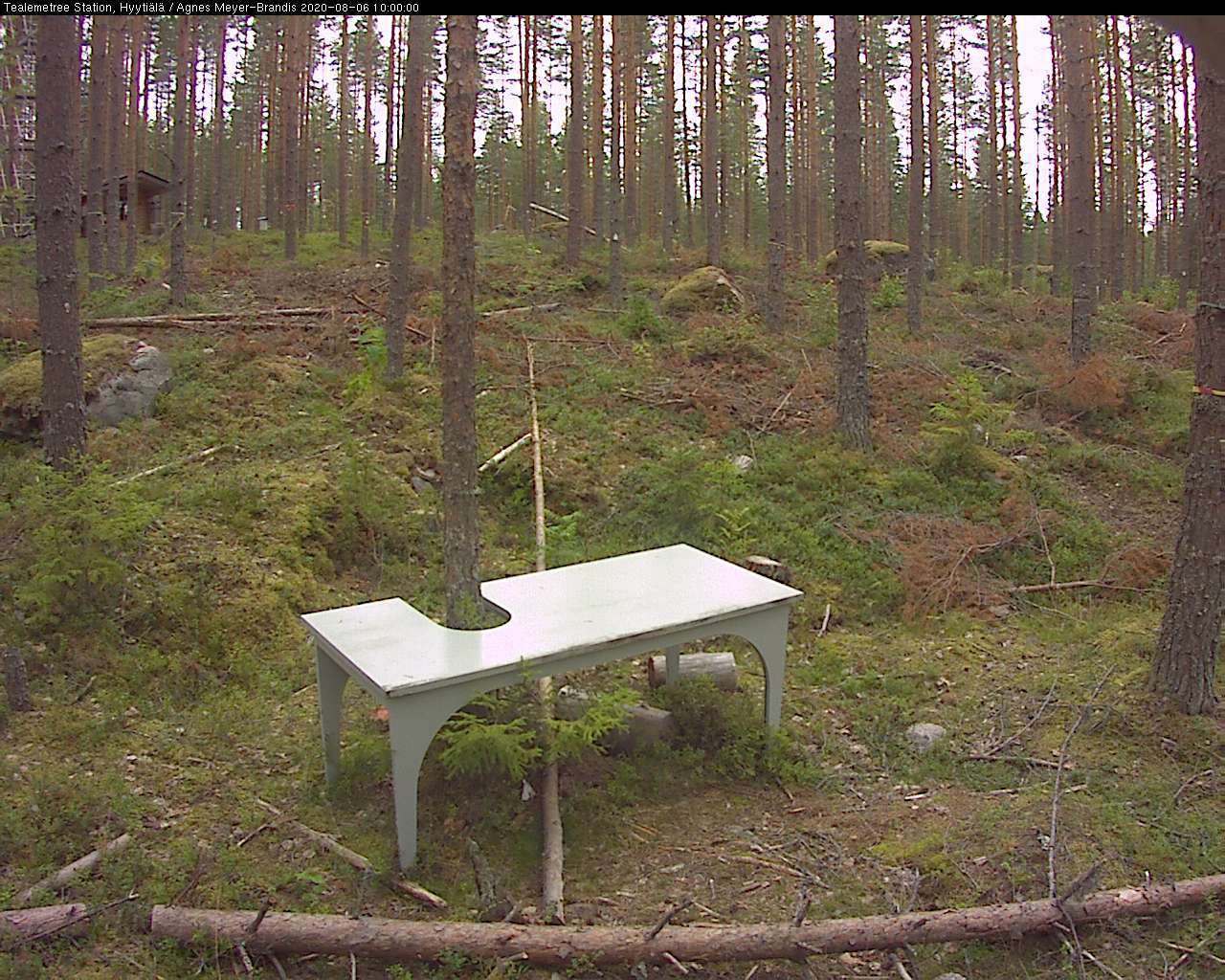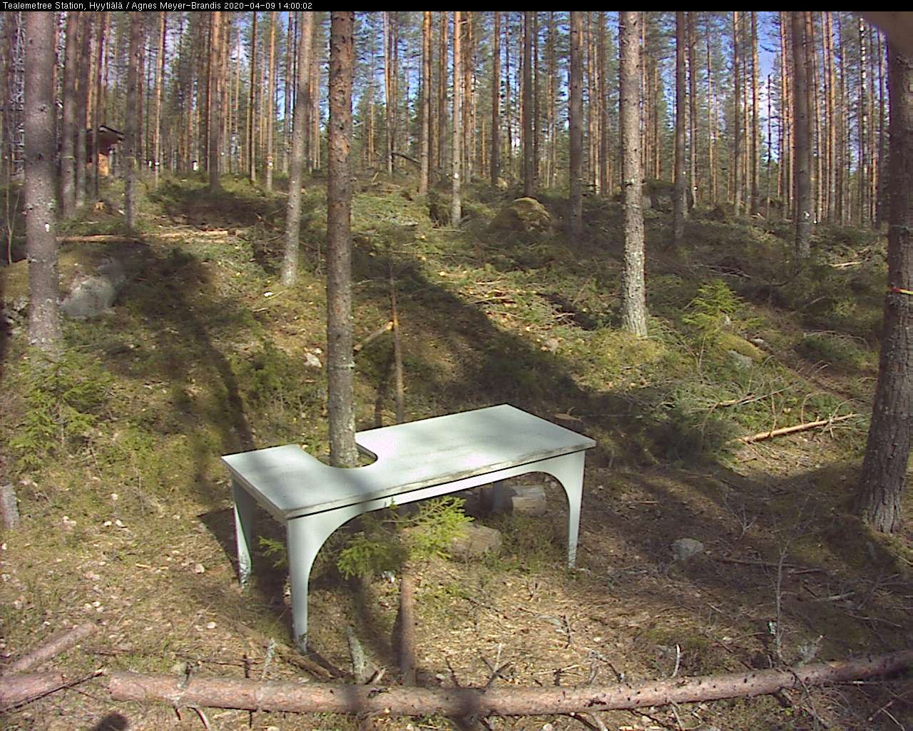 Agnes Meyer-Brandiksen työ Hyytiälässä alkoi tutustumalla aseman muihin tutkijoihin. Pystyäkseen tapaamaan ihmisiä metsässä, hän rakensi pöydän, josta muodostui kohtauspiste ja paikka teehetkille Agneksen ja puun kanssa.