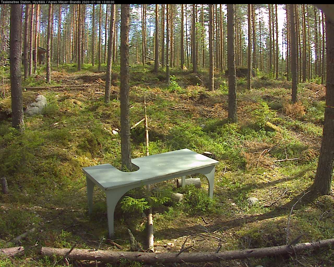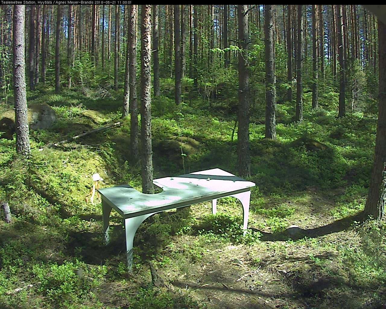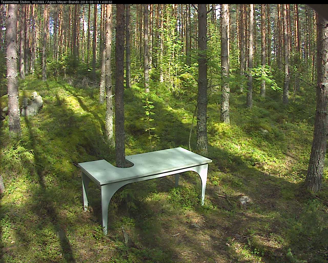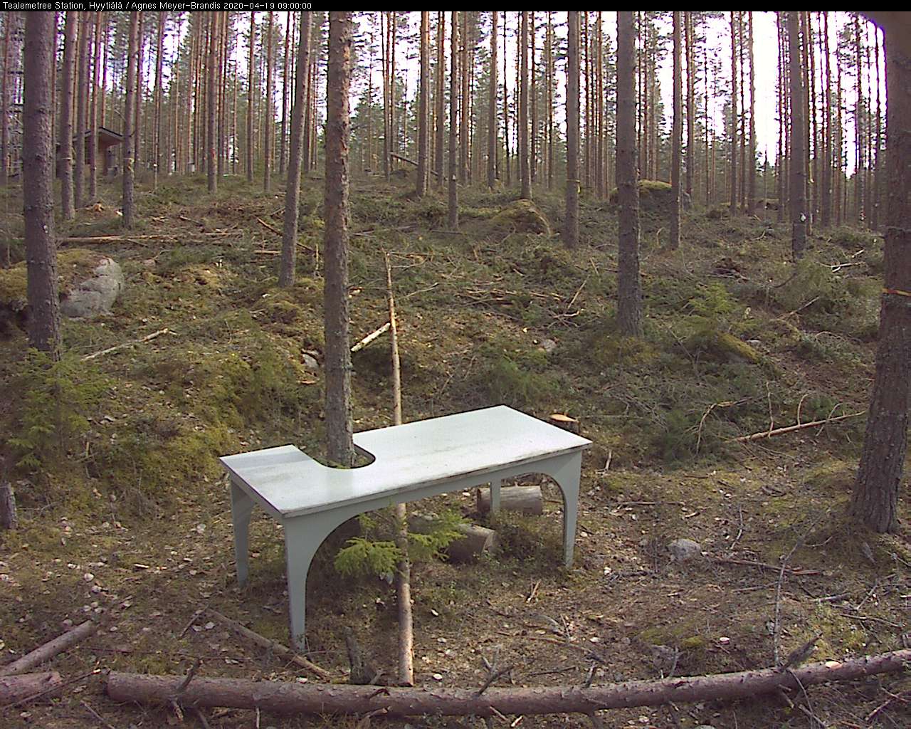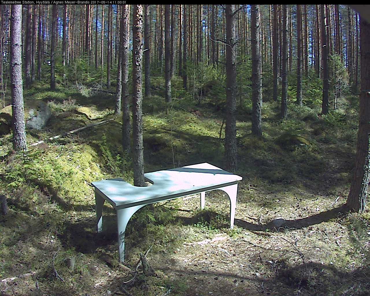 Agnes Meyer-Brandiksen työ Hyytiälässä alkoi tutustumalla aseman muihin tutkijoihin. Pystyäkseen tapaamaan ihmisiä metsässä, hän rakensi pöydän, josta muodostui kohtauspiste ja paikka teehetkille Agneksen ja puun kanssa.