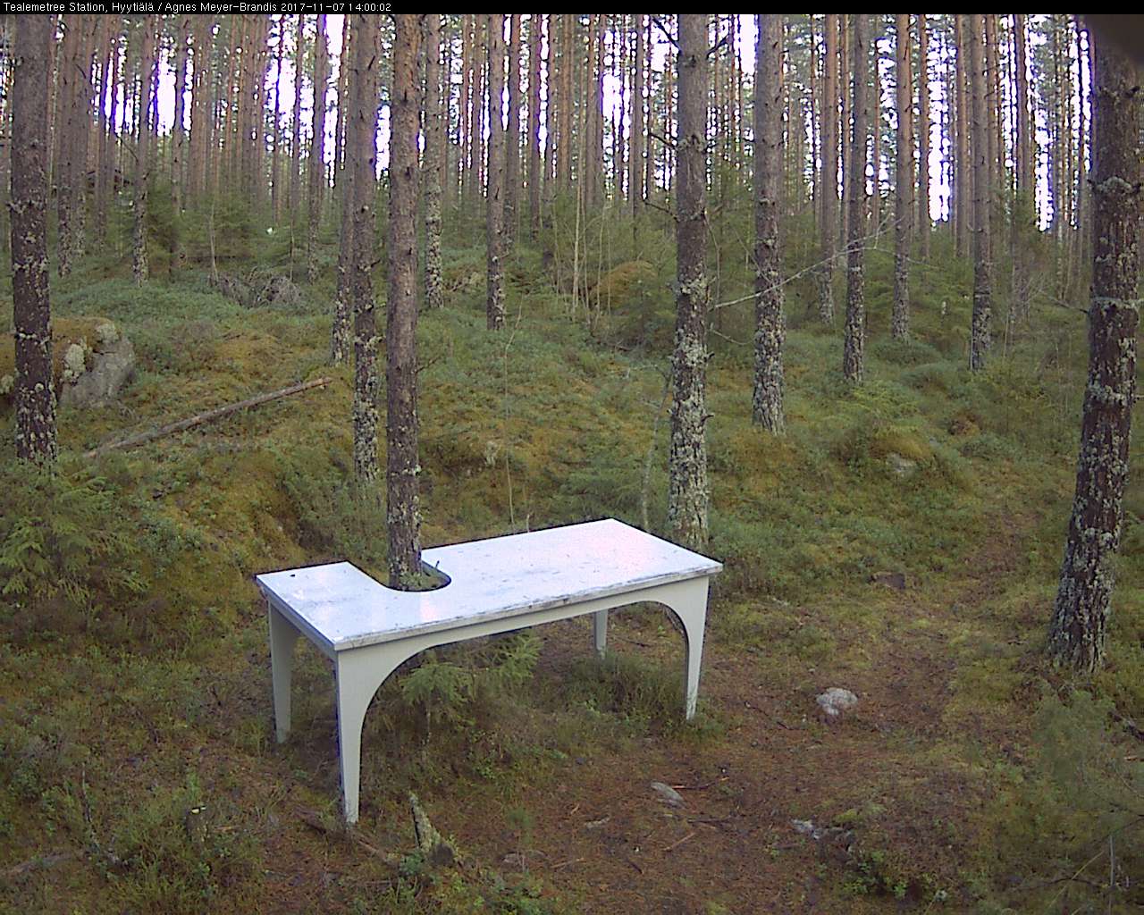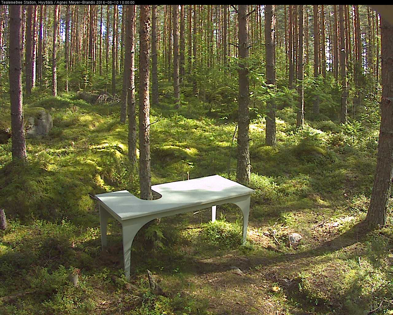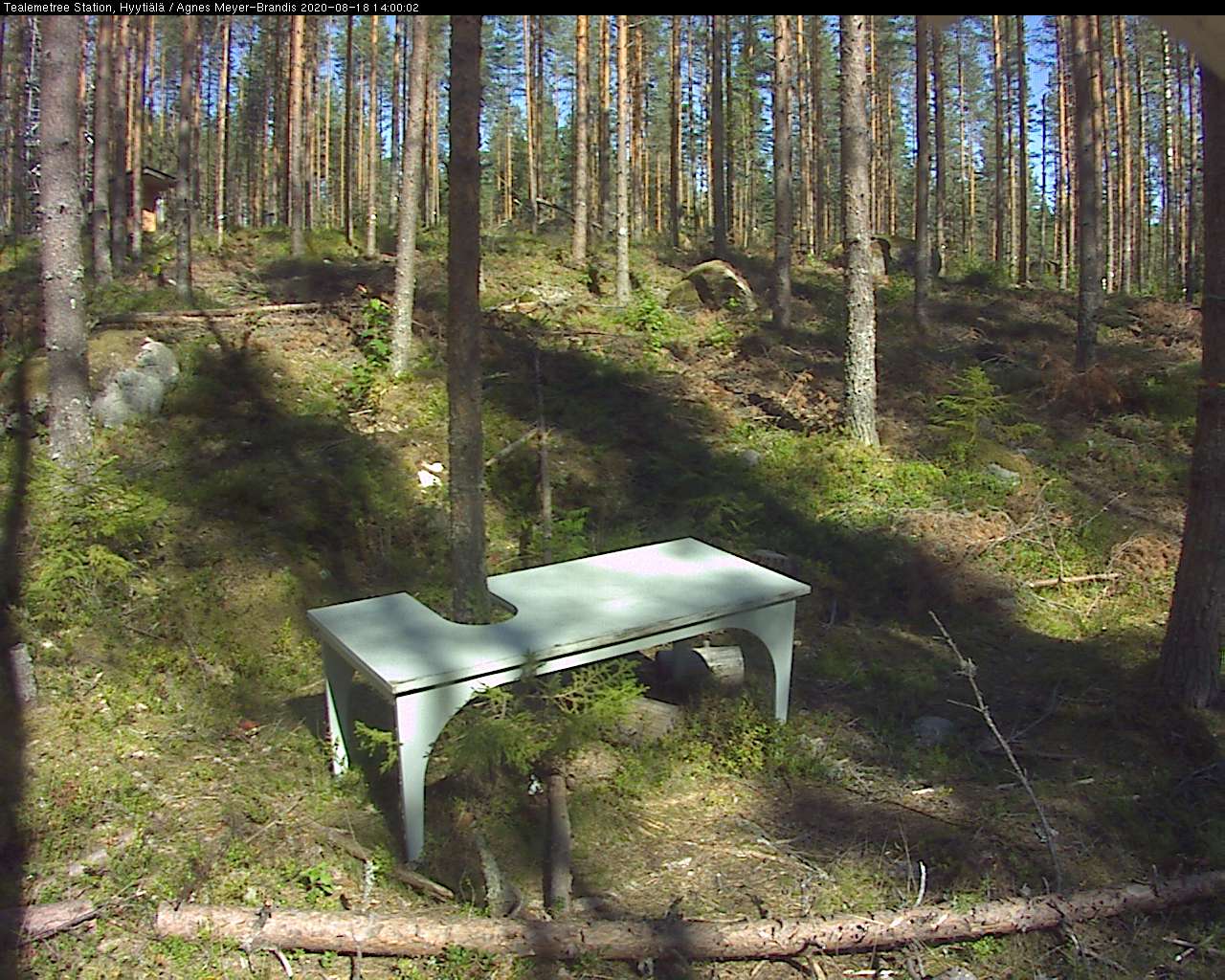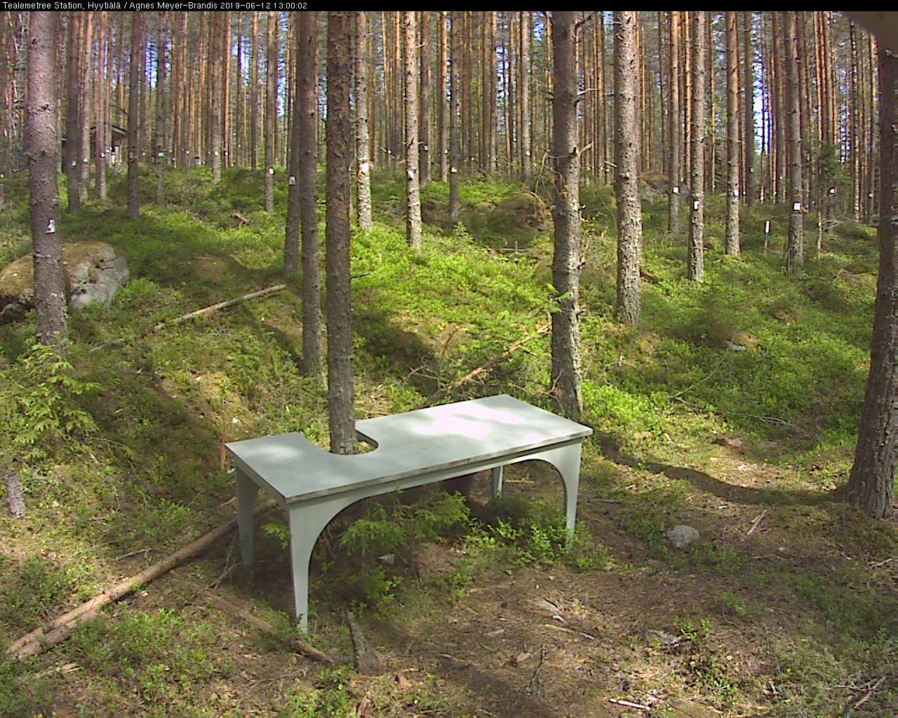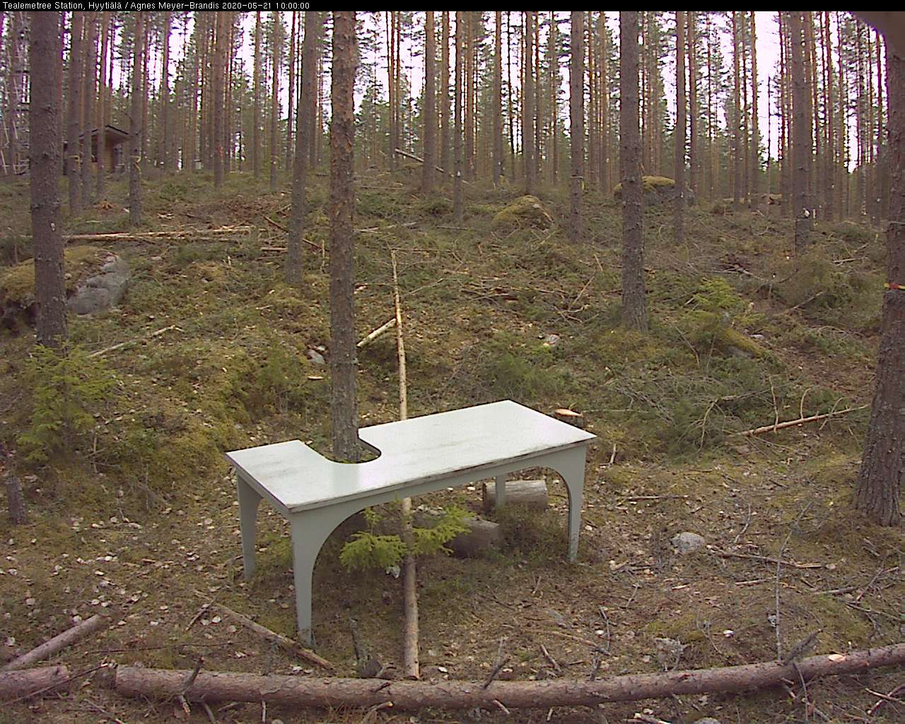 Agnes Meyer-Brandiksen työ Hyytiälässä alkoi tutustumalla aseman muihin tutkijoihin. Pystyäkseen tapaamaan ihmisiä metsässä, hän rakensi pöydän, josta muodostui kohtauspiste ja paikka teehetkille Agneksen ja puun kanssa.