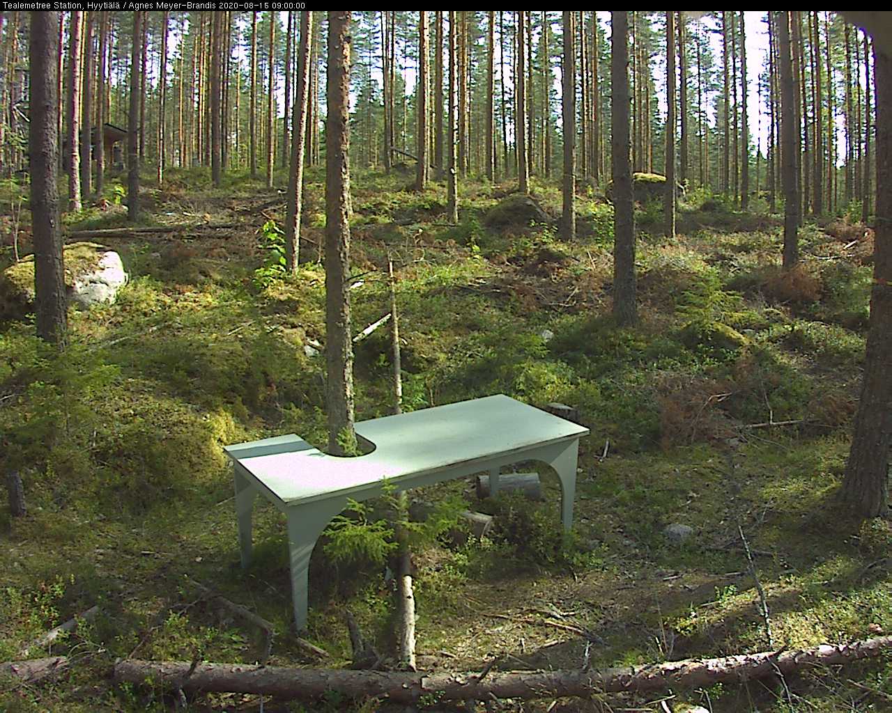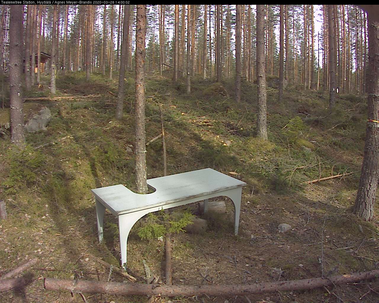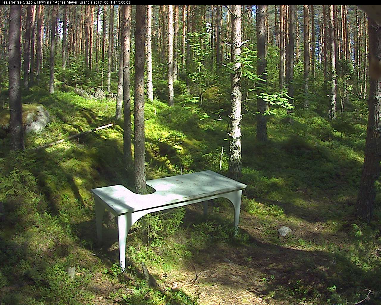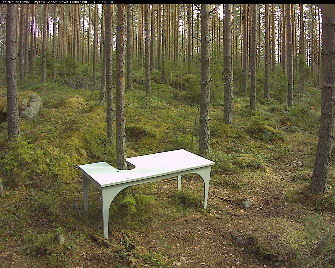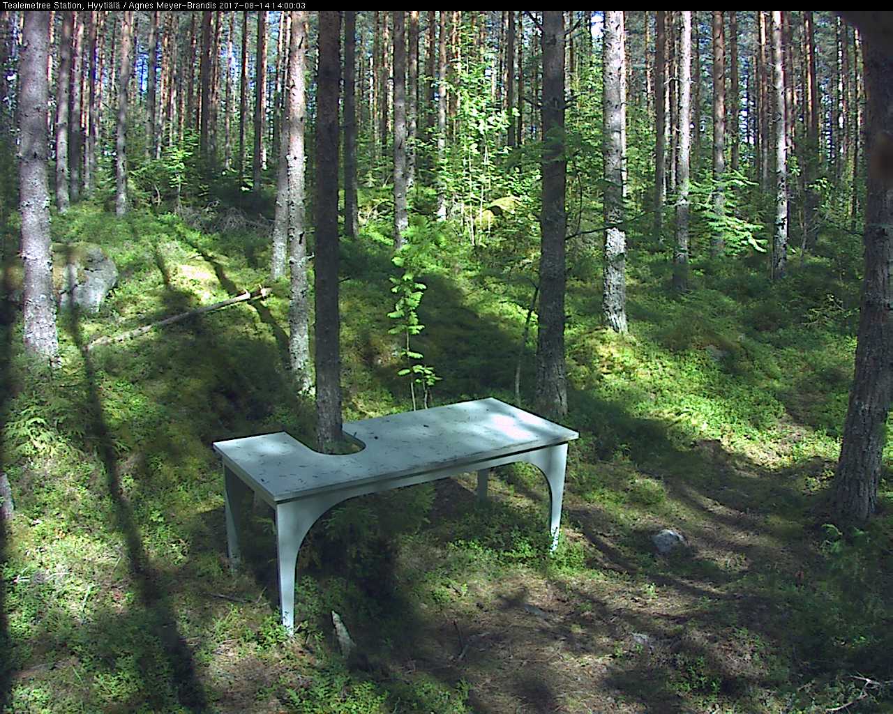 Agnes Meyer-Brandiksen työ Hyytiälässä alkoi tutustumalla aseman muihin tutkijoihin. Pystyäkseen tapaamaan ihmisiä metsässä, hän rakensi pöydän, josta muodostui kohtauspiste ja paikka teehetkille Agneksen ja puun kanssa.