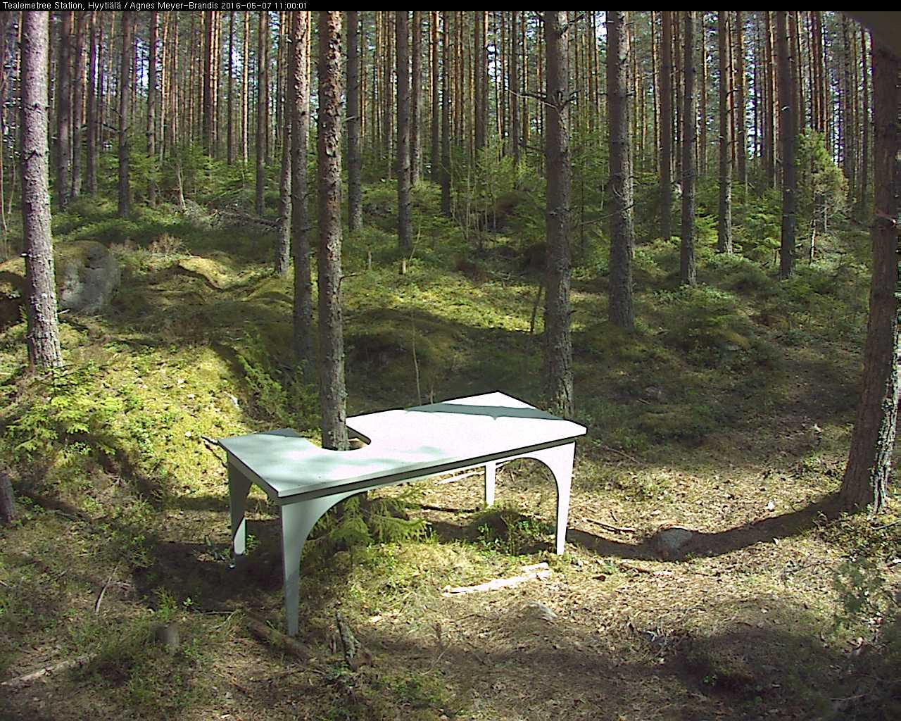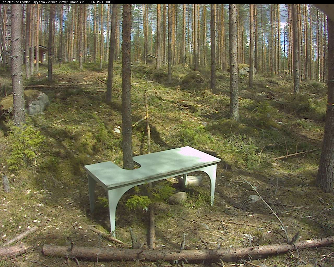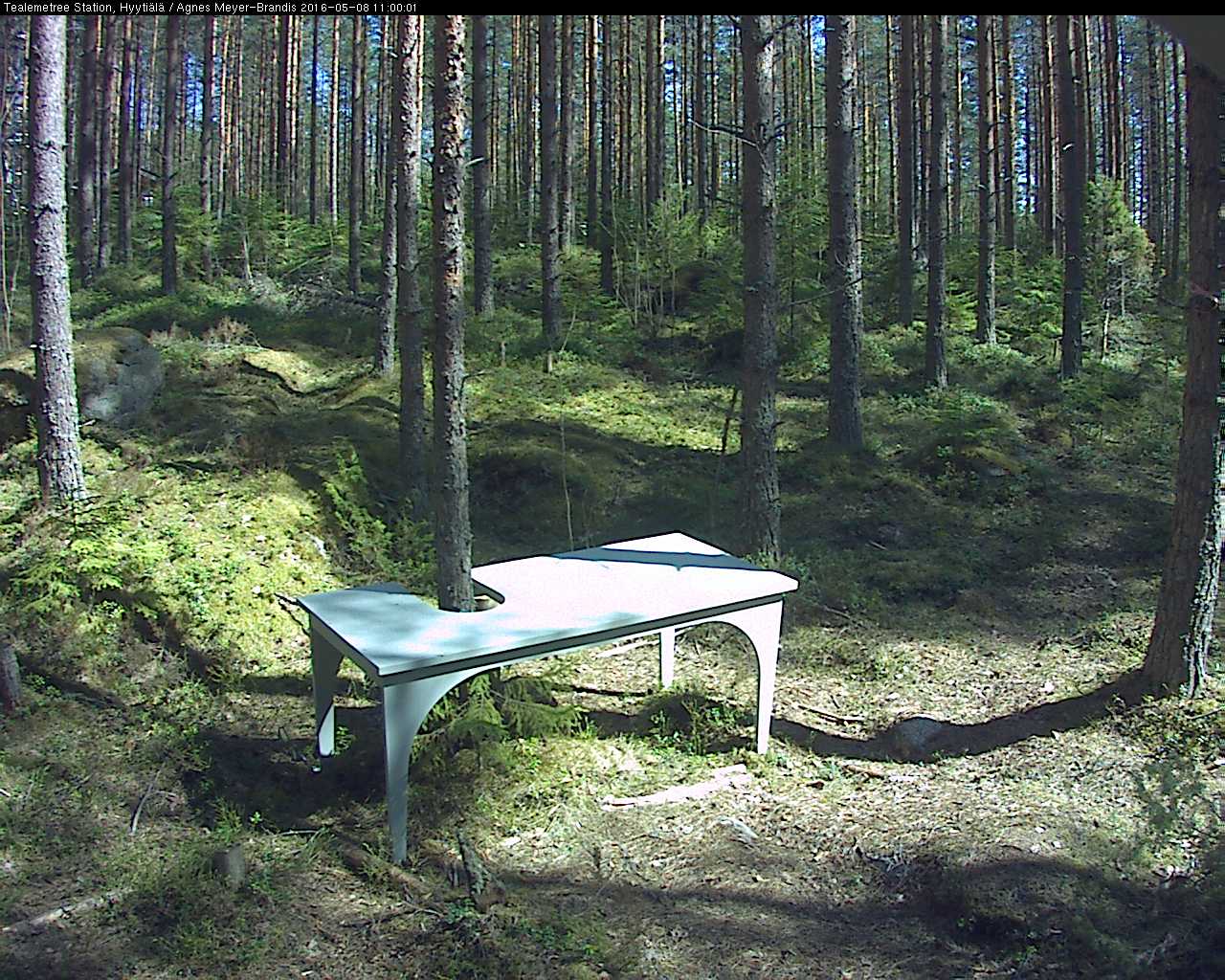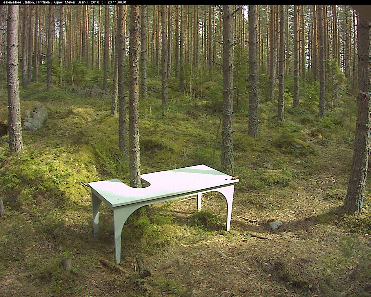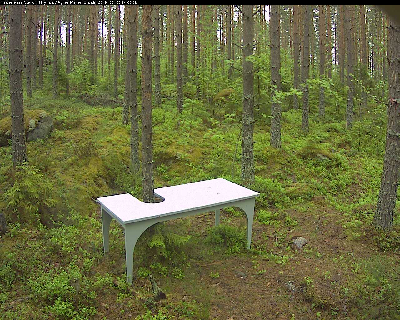 Agnes Meyer-Brandiksen työ Hyytiälässä alkoi tutustumalla aseman muihin tutkijoihin. Pystyäkseen tapaamaan ihmisiä metsässä, hän rakensi pöydän, josta muodostui kohtauspiste ja paikka teehetkille Agneksen ja puun kanssa.