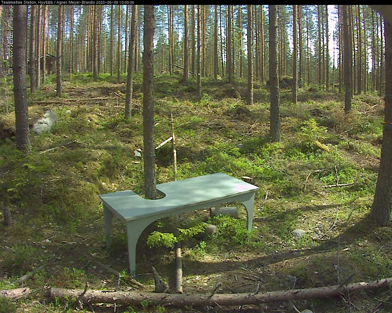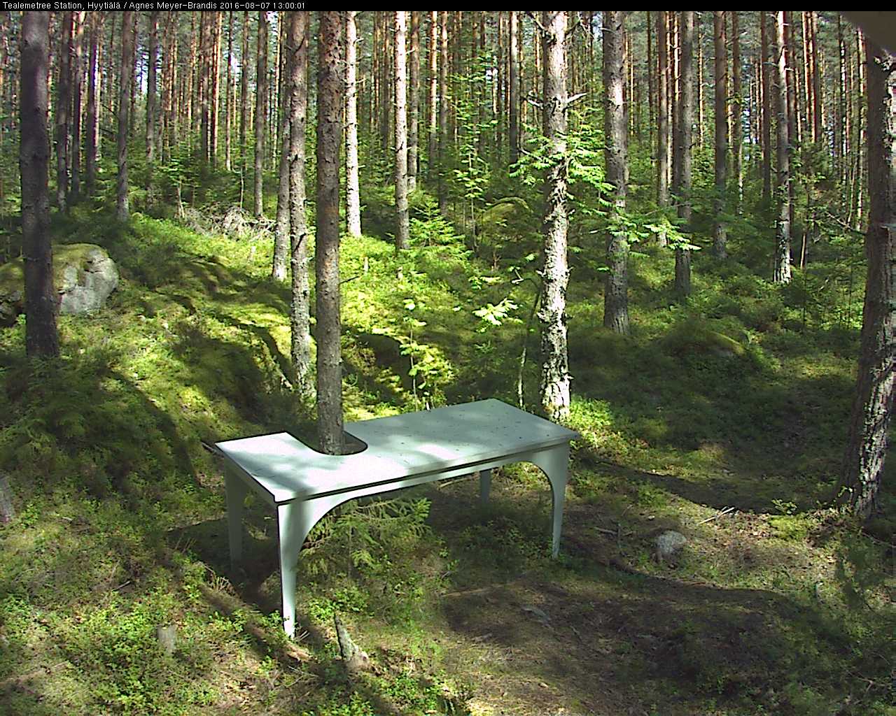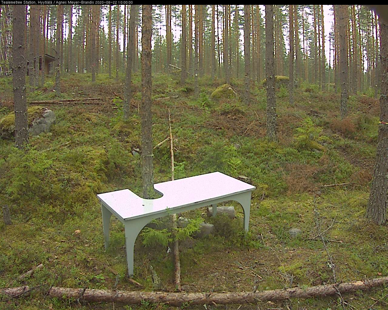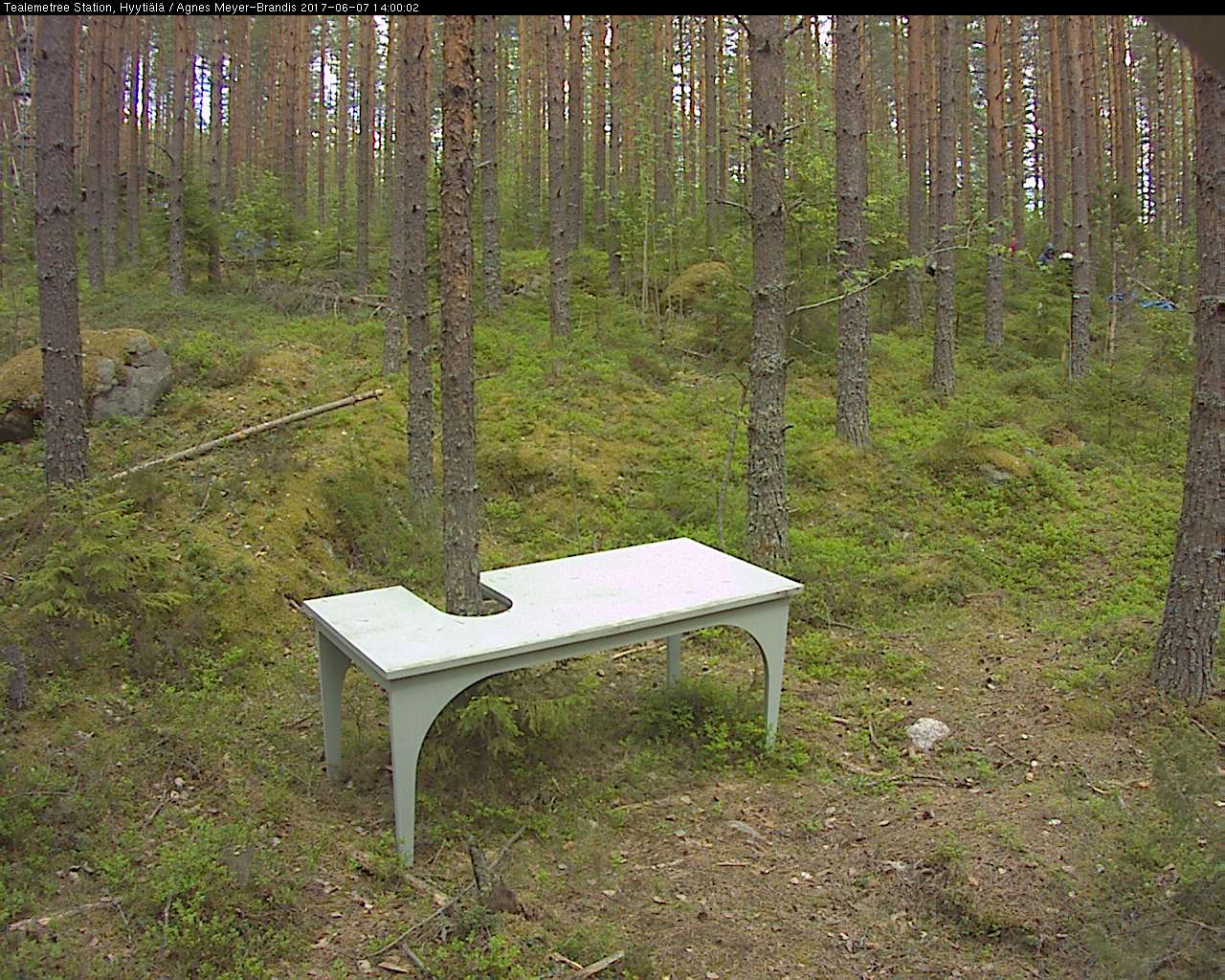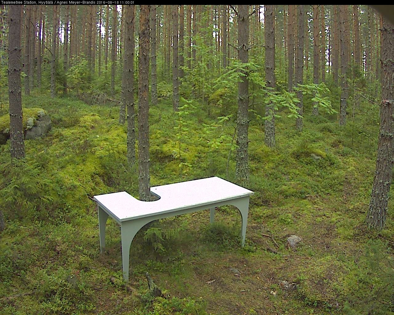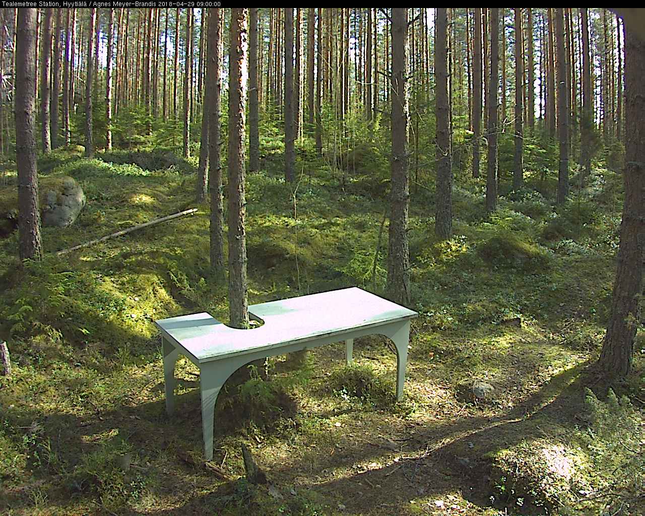 Agnes Meyer-Brandiksen työ Hyytiälässä alkoi tutustumalla aseman muihin tutkijoihin. Pystyäkseen tapaamaan ihmisiä metsässä, hän rakensi pöydän, josta muodostui kohtauspiste ja paikka teehetkille Agneksen ja puun kanssa.