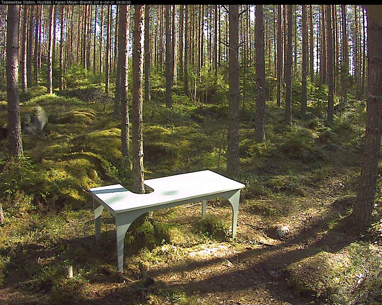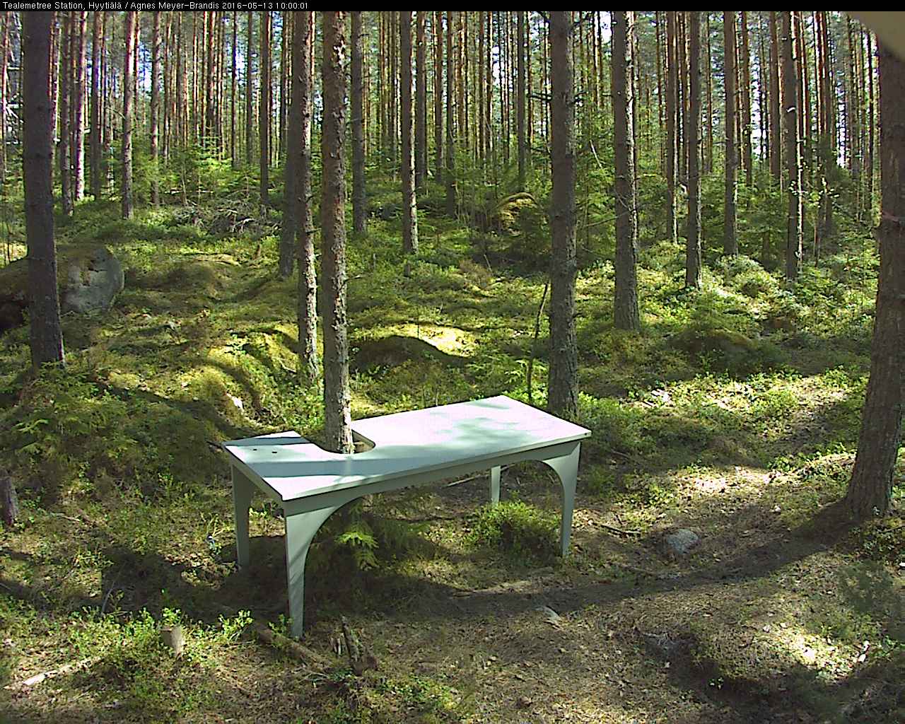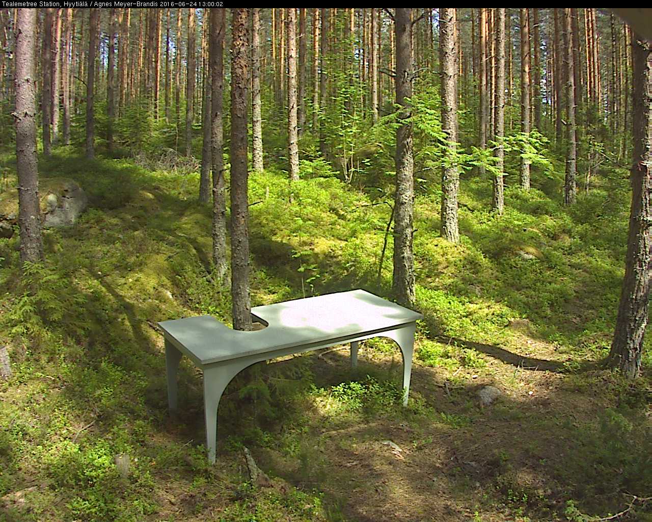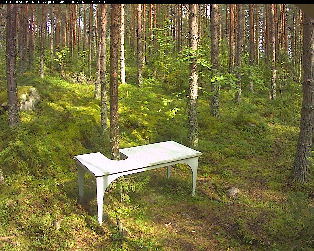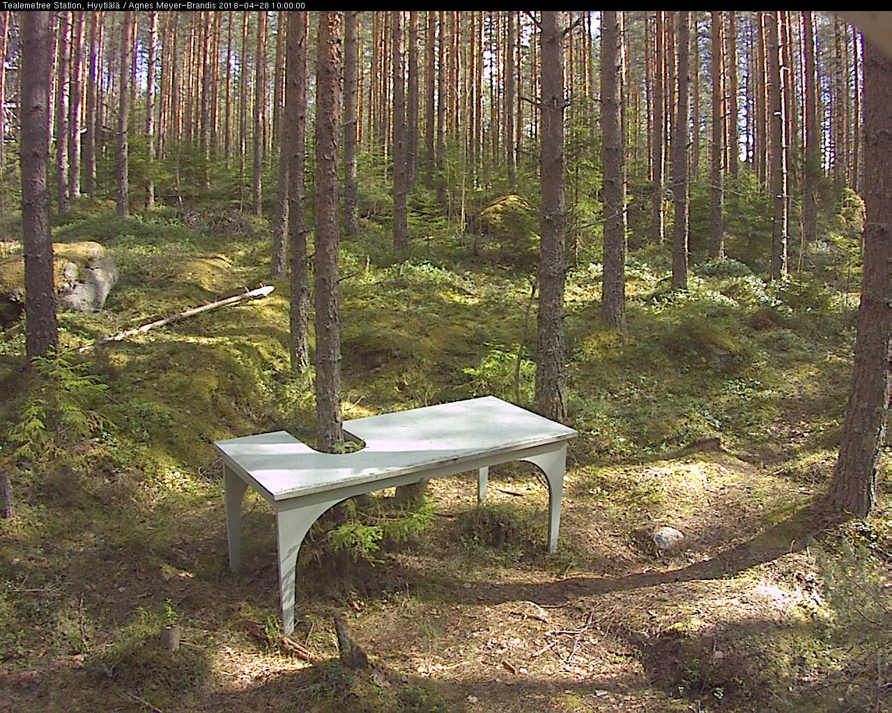 Agnes Meyer-Brandiksen työ Hyytiälässä alkoi tutustumalla aseman muihin tutkijoihin. Pystyäkseen tapaamaan ihmisiä metsässä, hän rakensi pöydän, josta muodostui kohtauspiste ja paikka teehetkille Agneksen ja puun kanssa.
