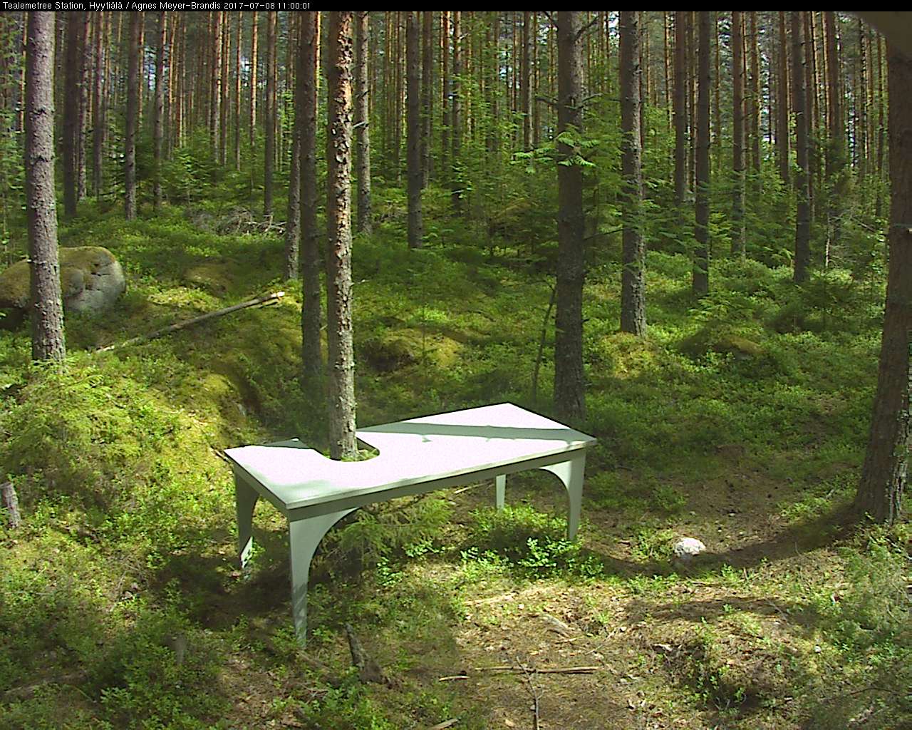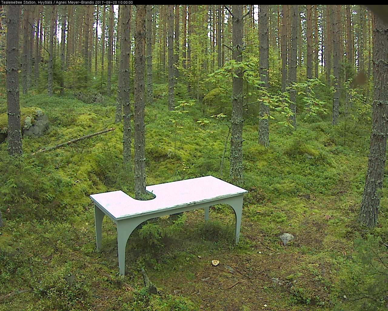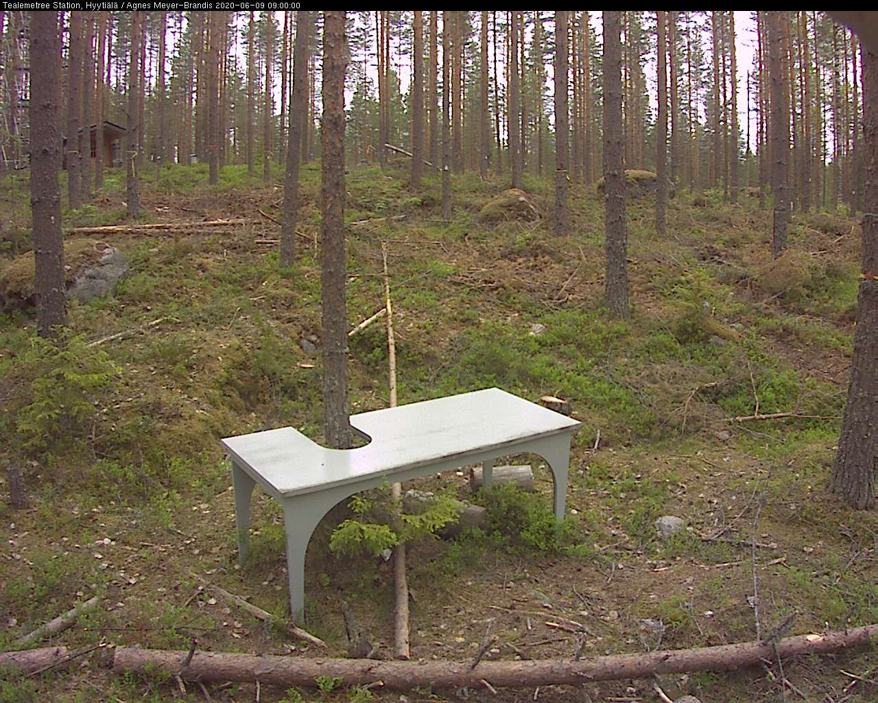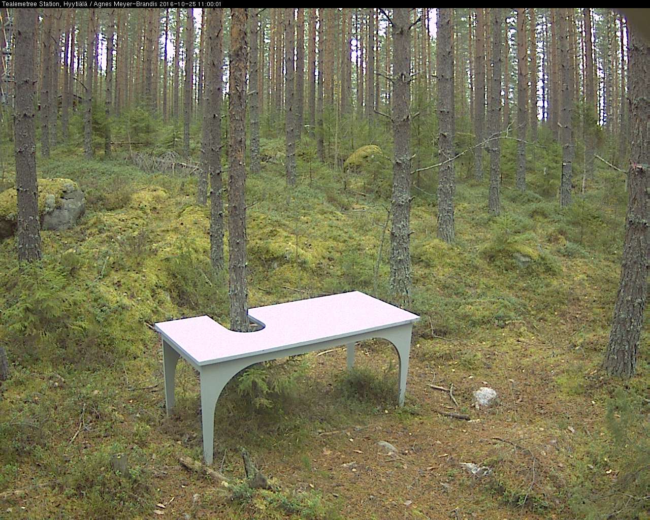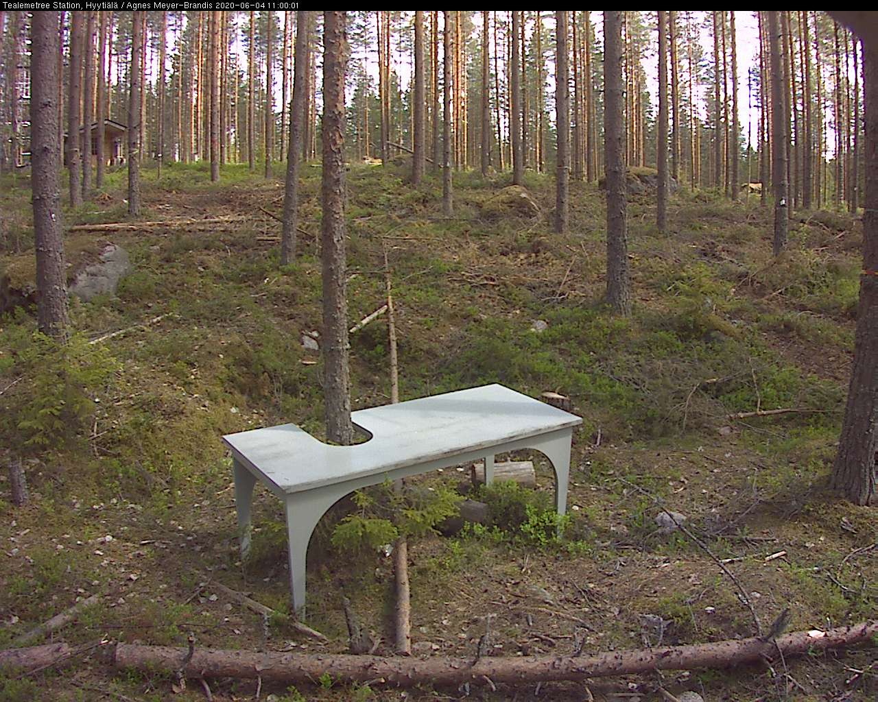 Agnes Meyer-Brandiksen työ Hyytiälässä alkoi tutustumalla aseman muihin tutkijoihin. Pystyäkseen tapaamaan ihmisiä metsässä, hän rakensi pöydän, josta muodostui kohtauspiste ja paikka teehetkille Agneksen ja puun kanssa.
