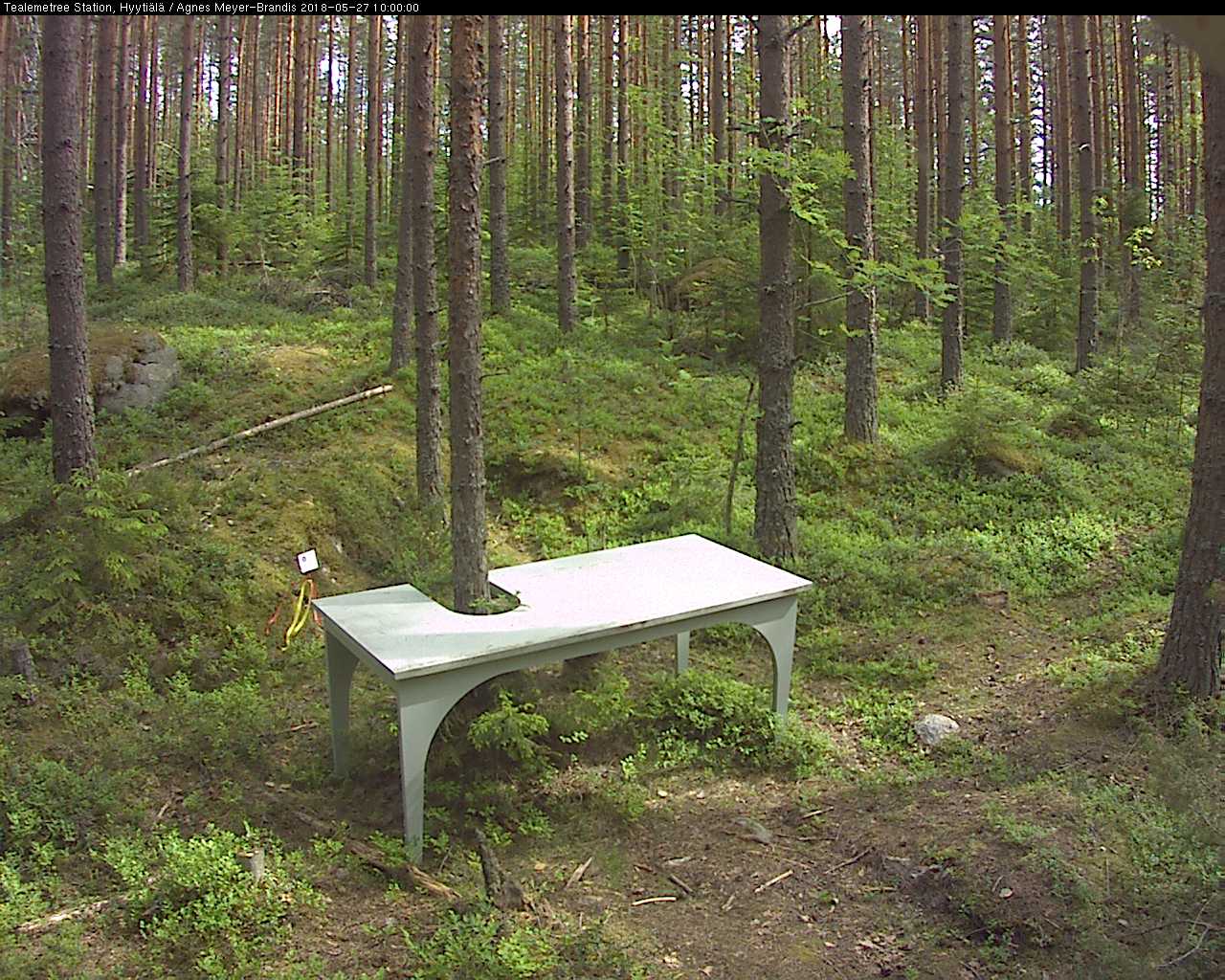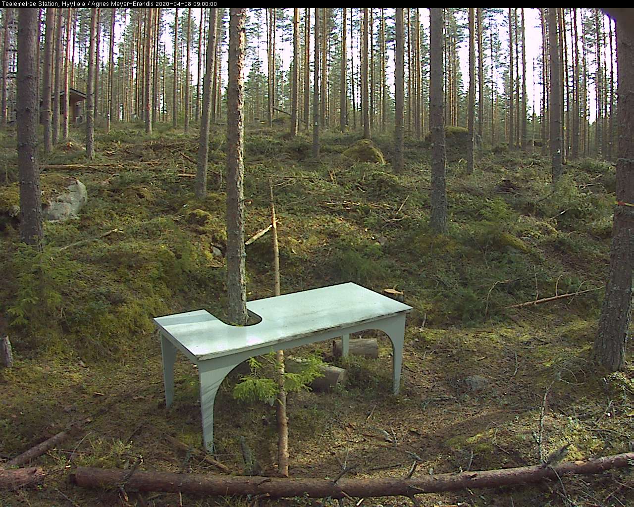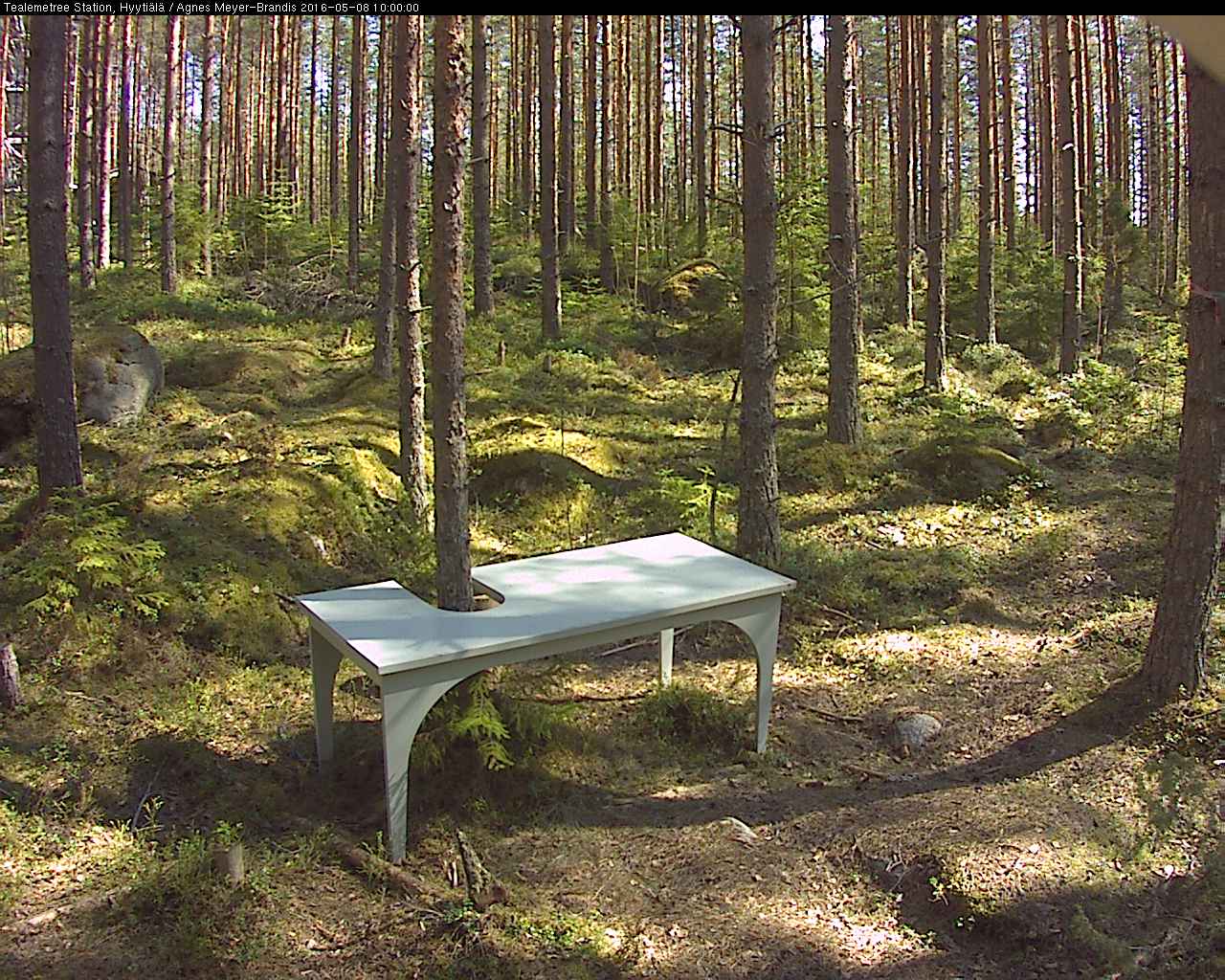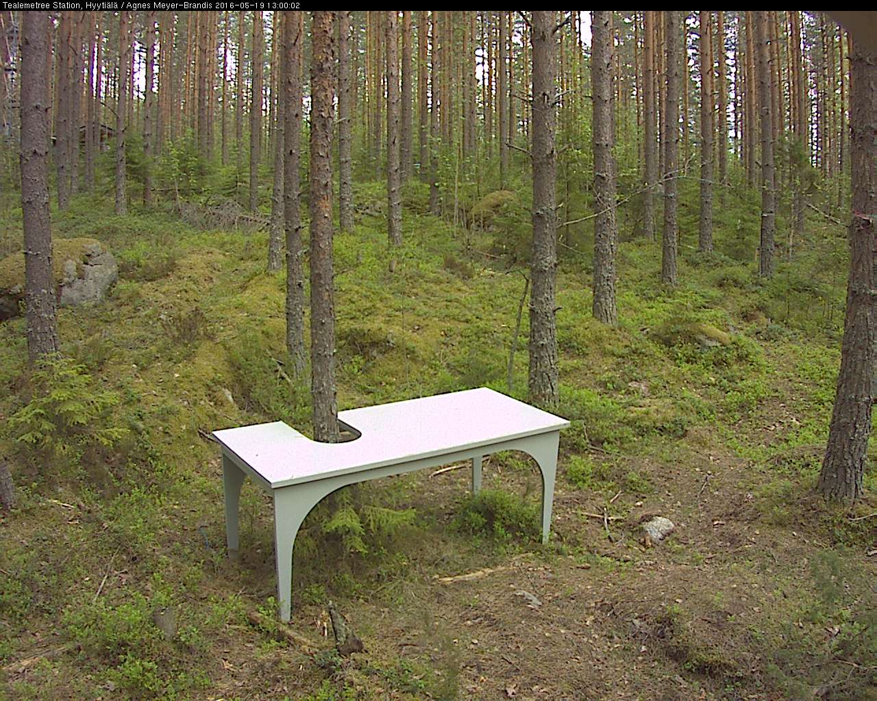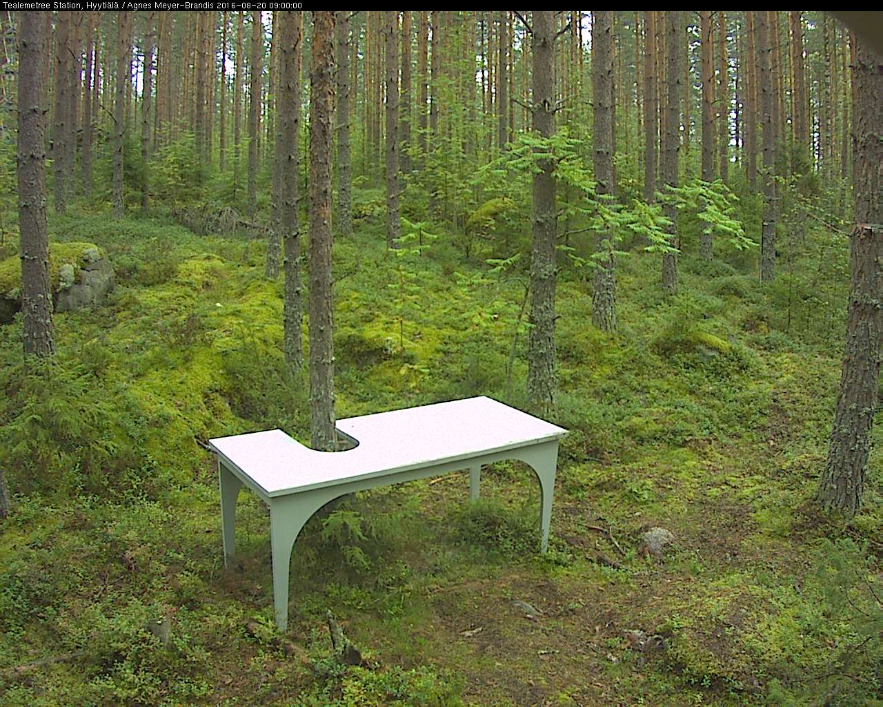 Agnes Meyer-Brandiksen työ Hyytiälässä alkoi tutustumalla aseman muihin tutkijoihin. Pystyäkseen tapaamaan ihmisiä metsässä, hän rakensi pöydän, josta muodostui kohtauspiste ja paikka teehetkille Agneksen ja puun kanssa.