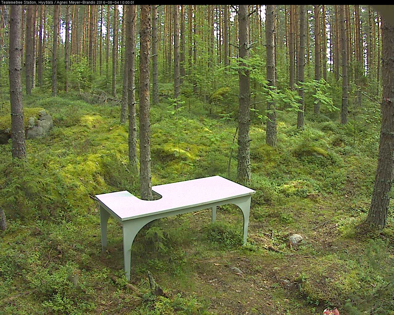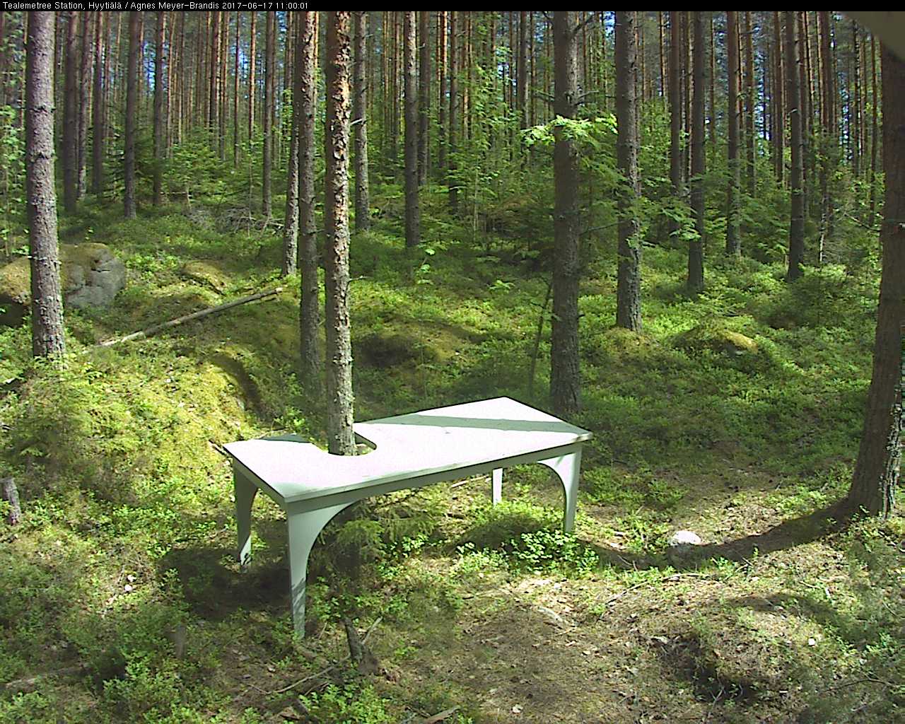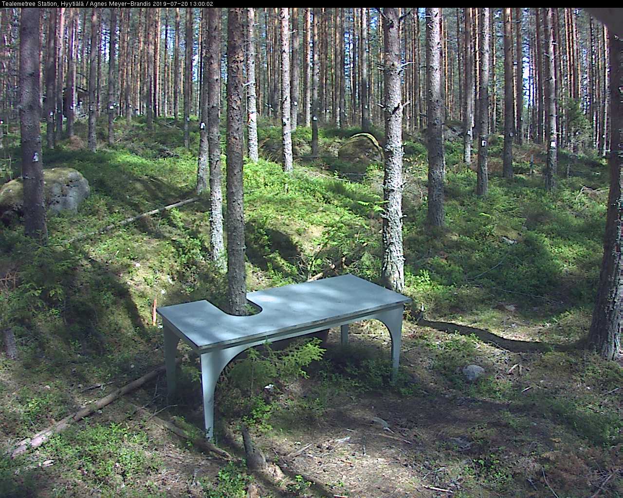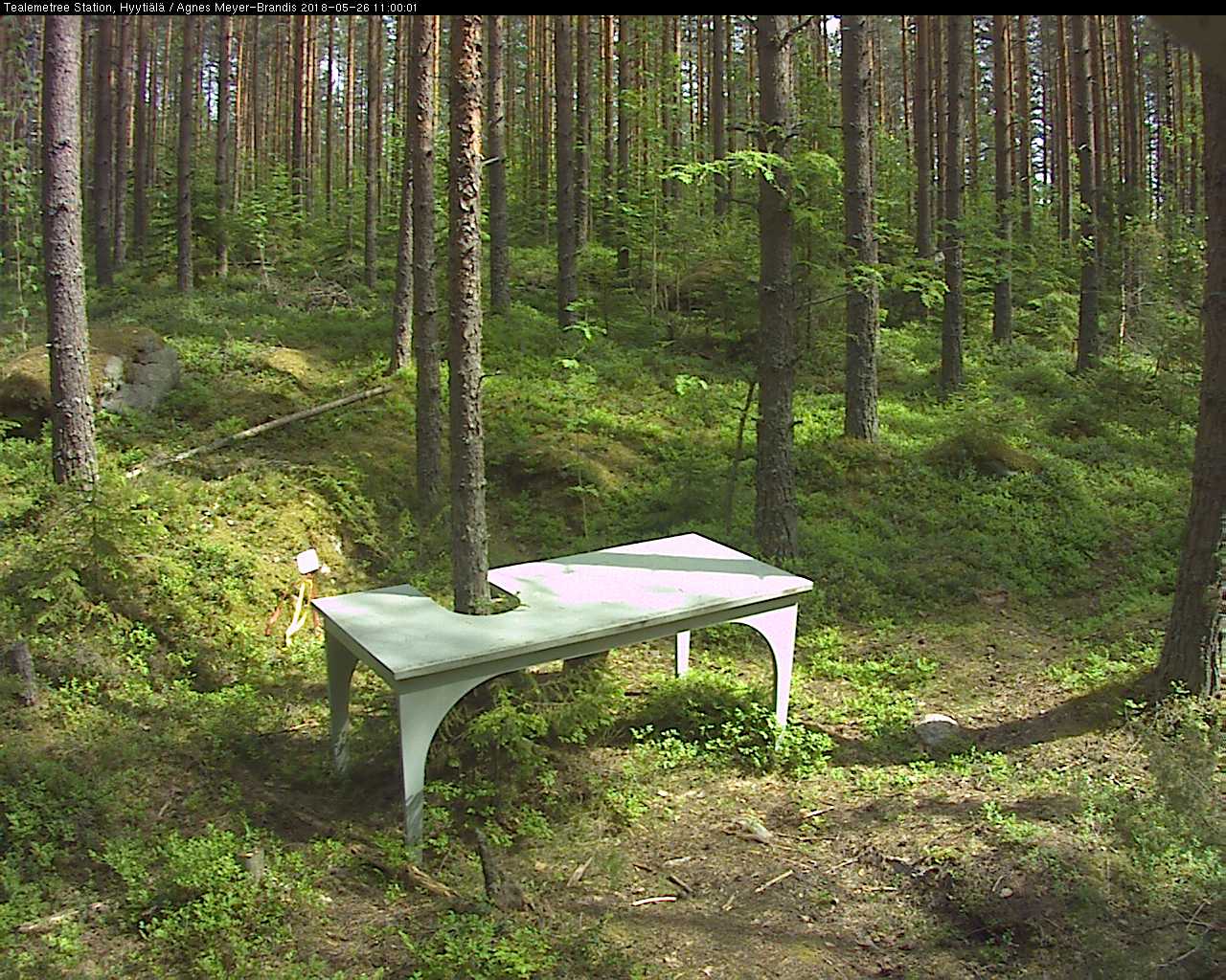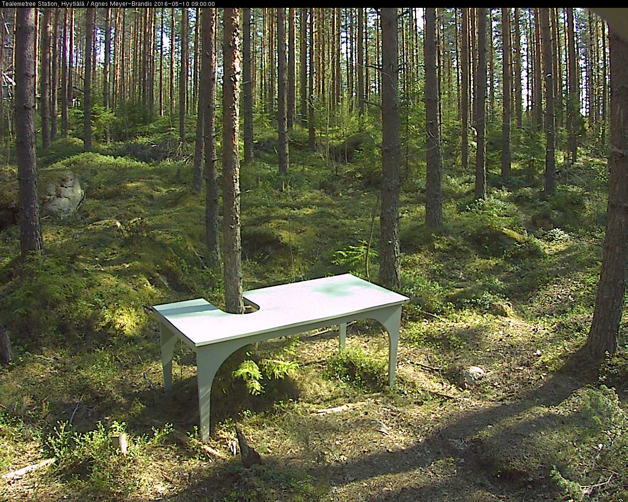 Agnes Meyer-Brandiksen työ Hyytiälässä alkoi tutustumalla aseman muihin tutkijoihin. Pystyäkseen tapaamaan ihmisiä metsässä, hän rakensi pöydän, josta muodostui kohtauspiste ja paikka teehetkille Agneksen ja puun kanssa.