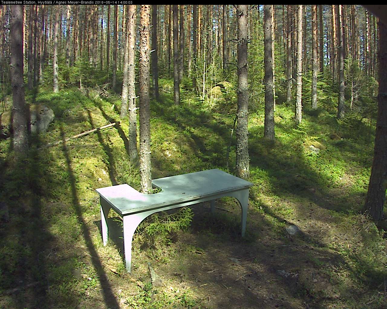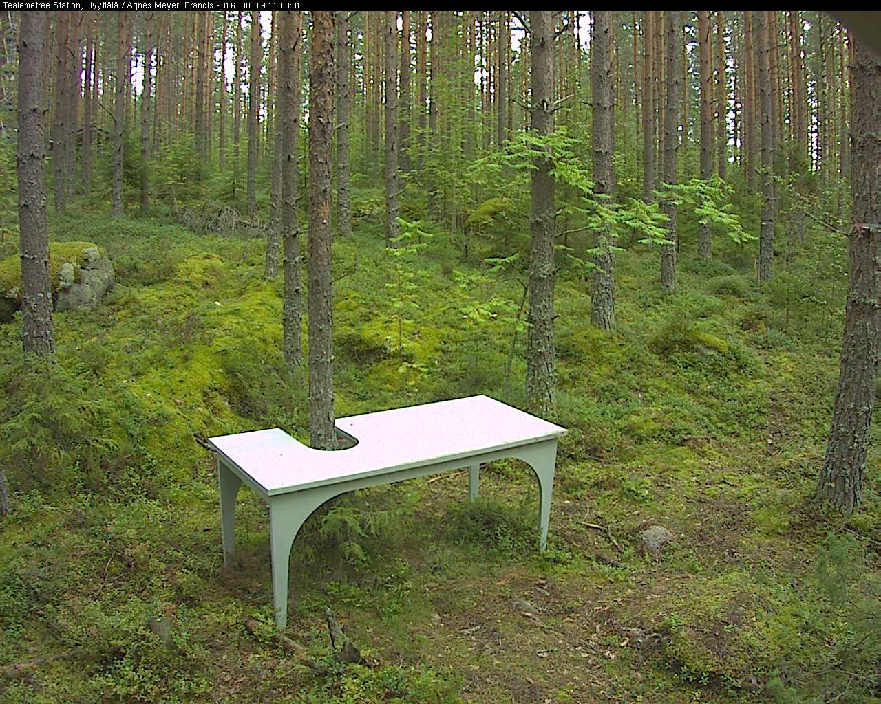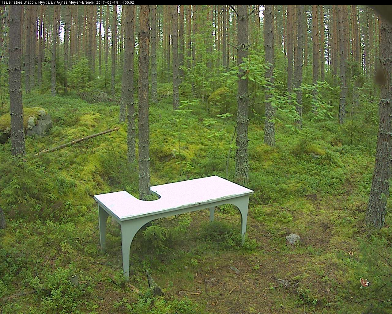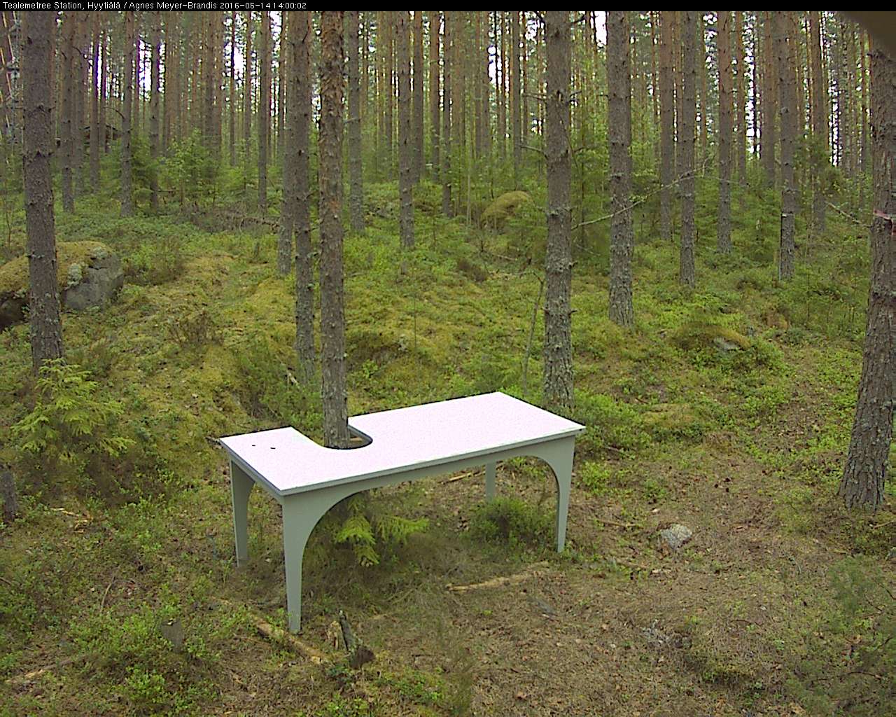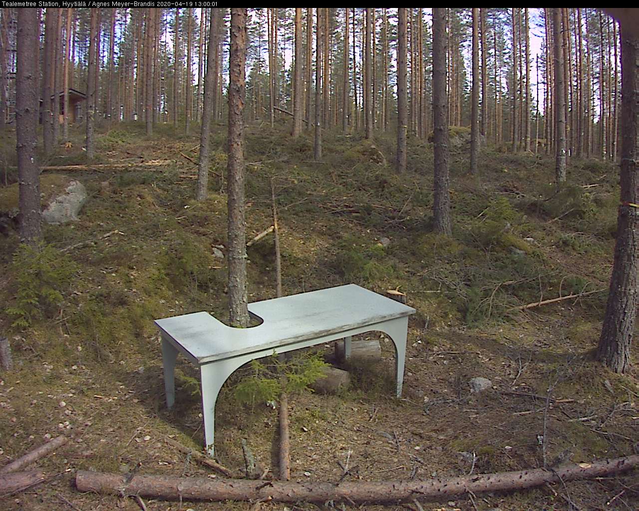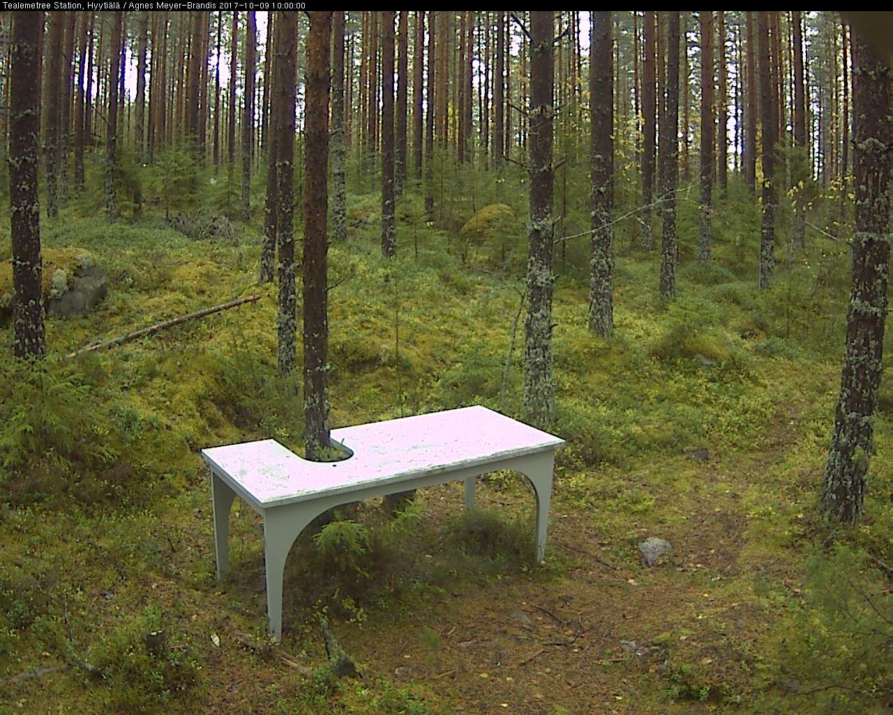 Agnes Meyer-Brandiksen työ Hyytiälässä alkoi tutustumalla aseman muihin tutkijoihin. Pystyäkseen tapaamaan ihmisiä metsässä, hän rakensi pöydän, josta muodostui kohtauspiste ja paikka teehetkille Agneksen ja puun kanssa.