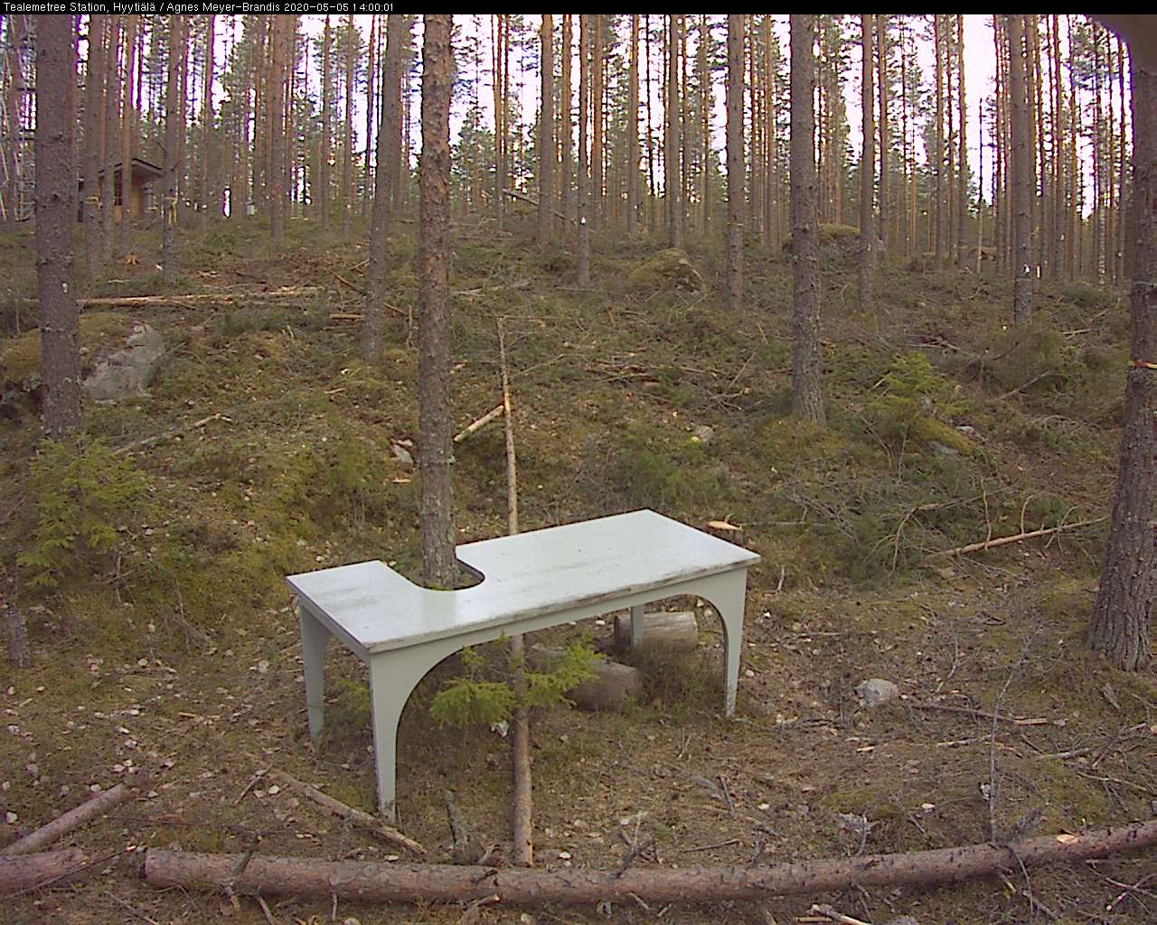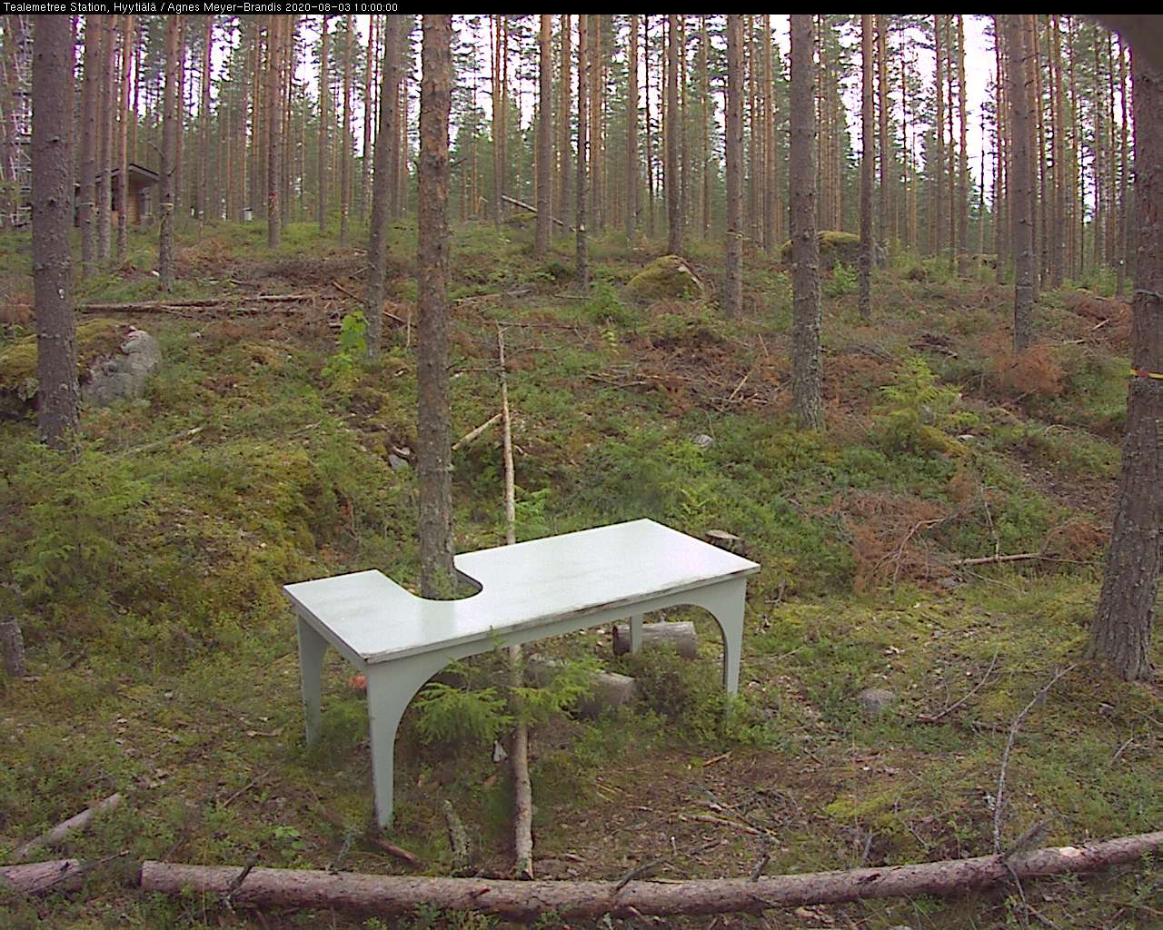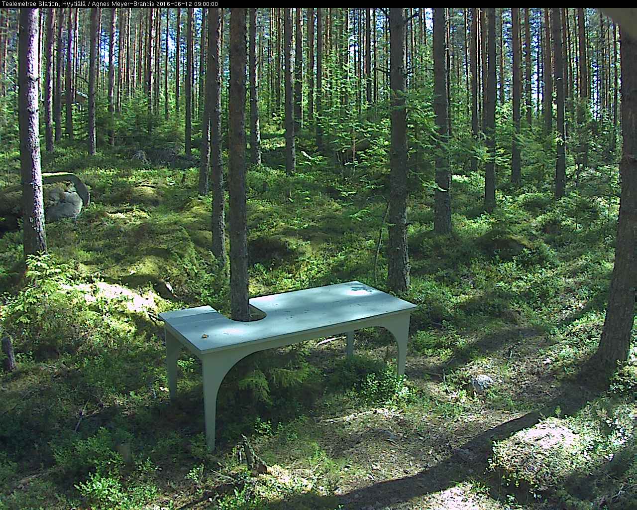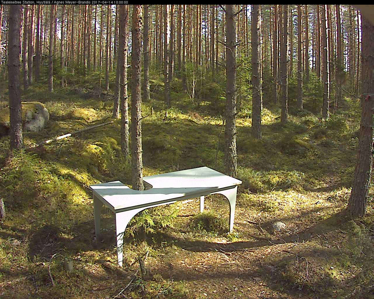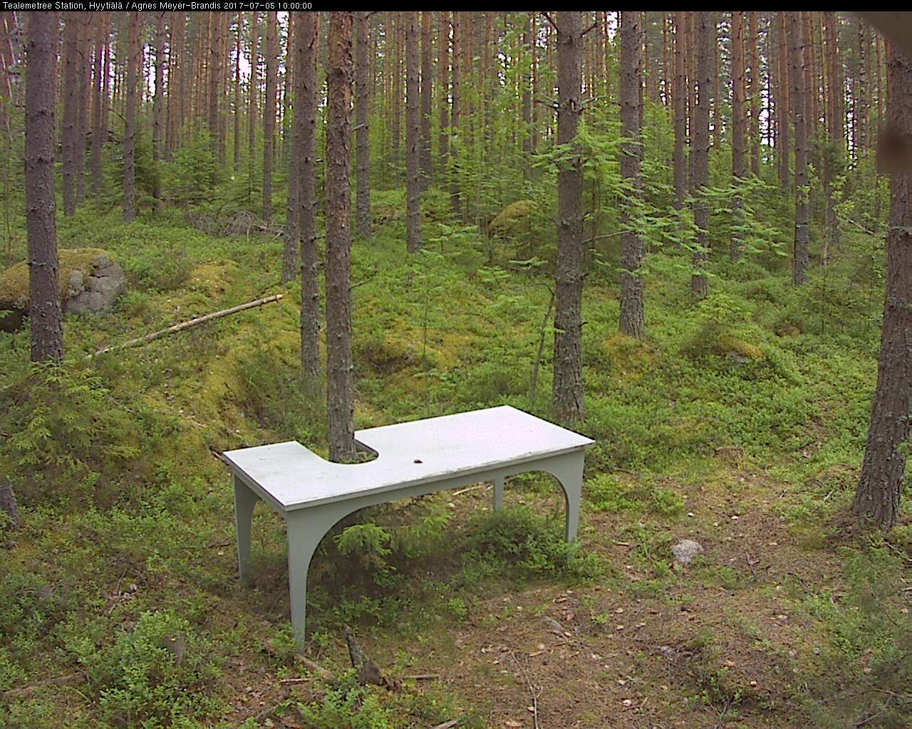Agnes Meyer-Brandiksen työ Hyytiälässä alkoi tutustumalla aseman muihin tutkijoihin. Pystyäkseen tapaamaan ihmisiä metsässä, hän rakensi pöydän, josta muodostui kohtauspiste ja paikka teehetkille Agneksen ja puun kanssa.