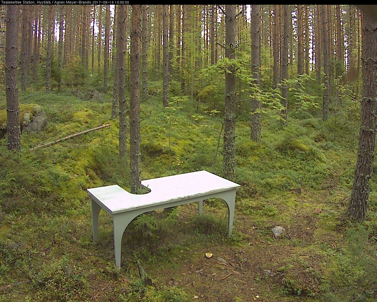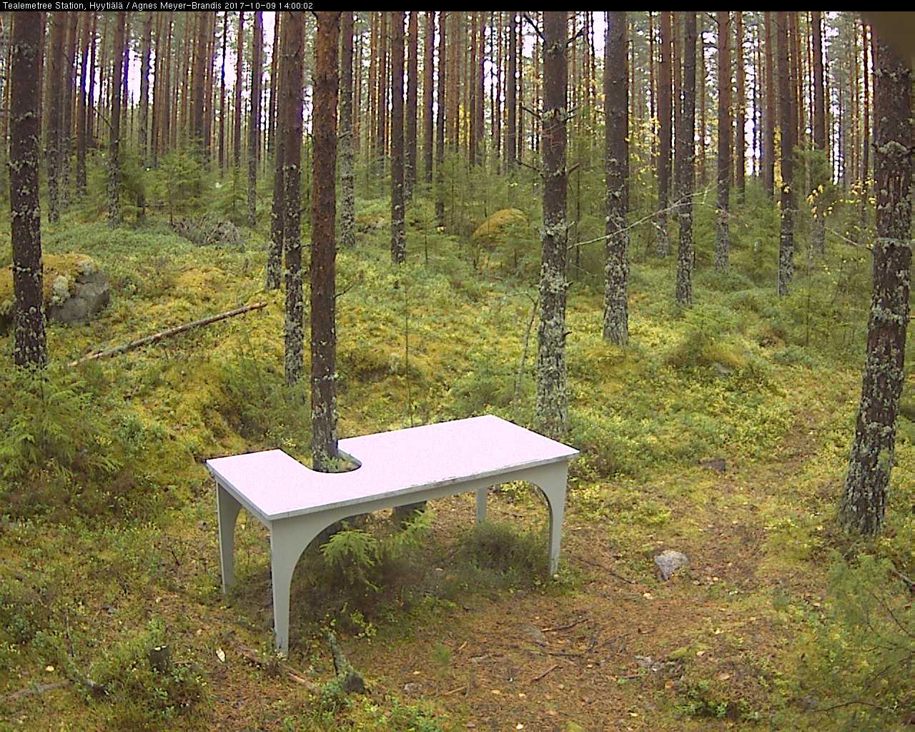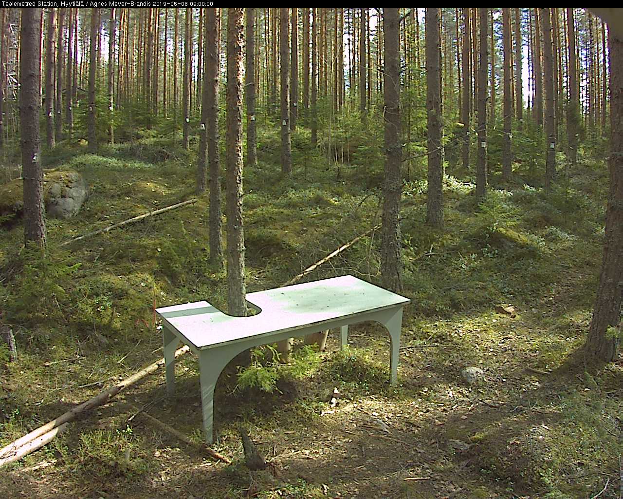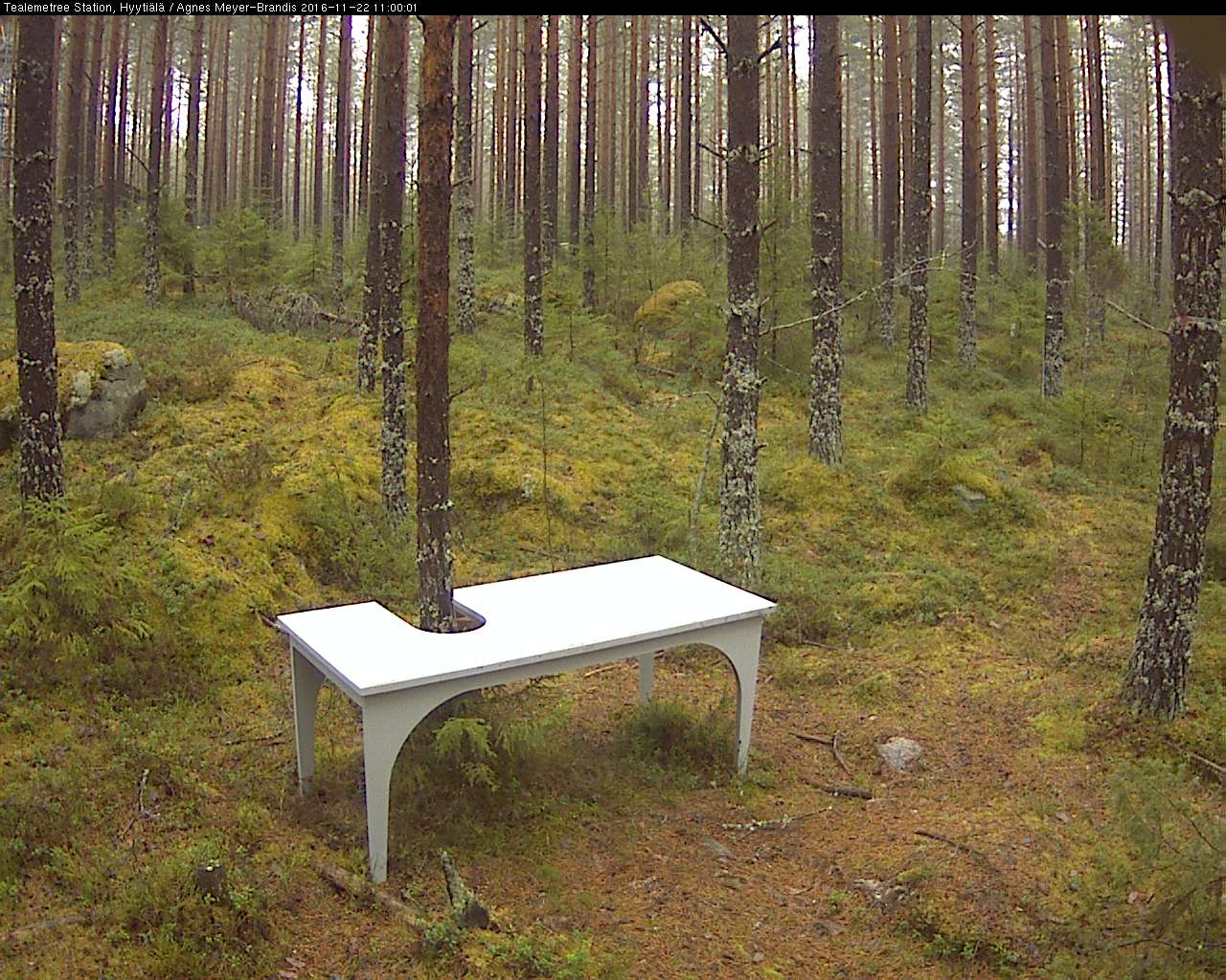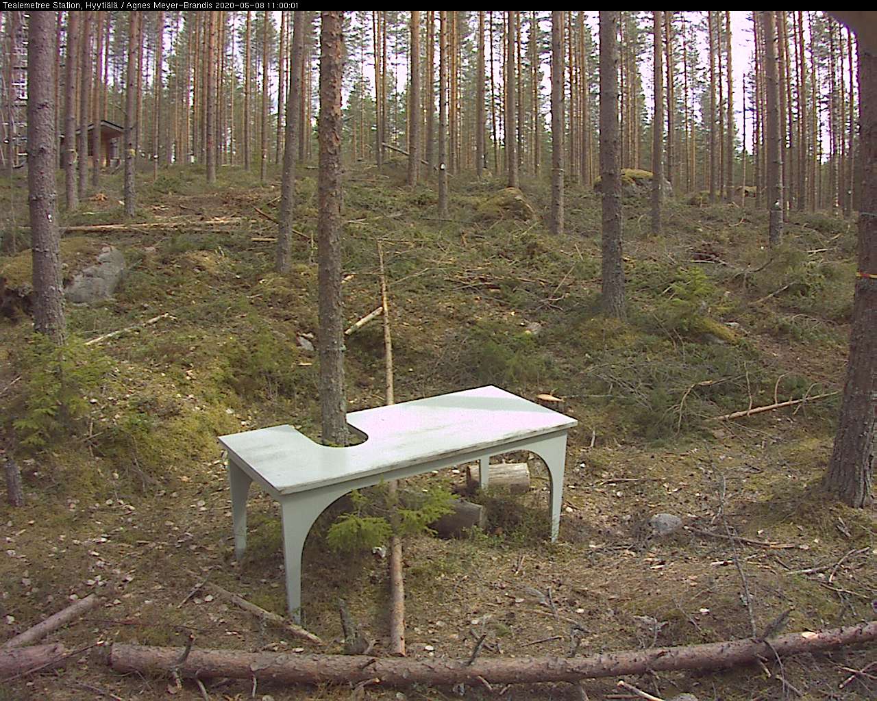 Agnes Meyer-Brandiksen työ Hyytiälässä alkoi tutustumalla aseman muihin tutkijoihin. Pystyäkseen tapaamaan ihmisiä metsässä, hän rakensi pöydän, josta muodostui kohtauspiste ja paikka teehetkille Agneksen ja puun kanssa.