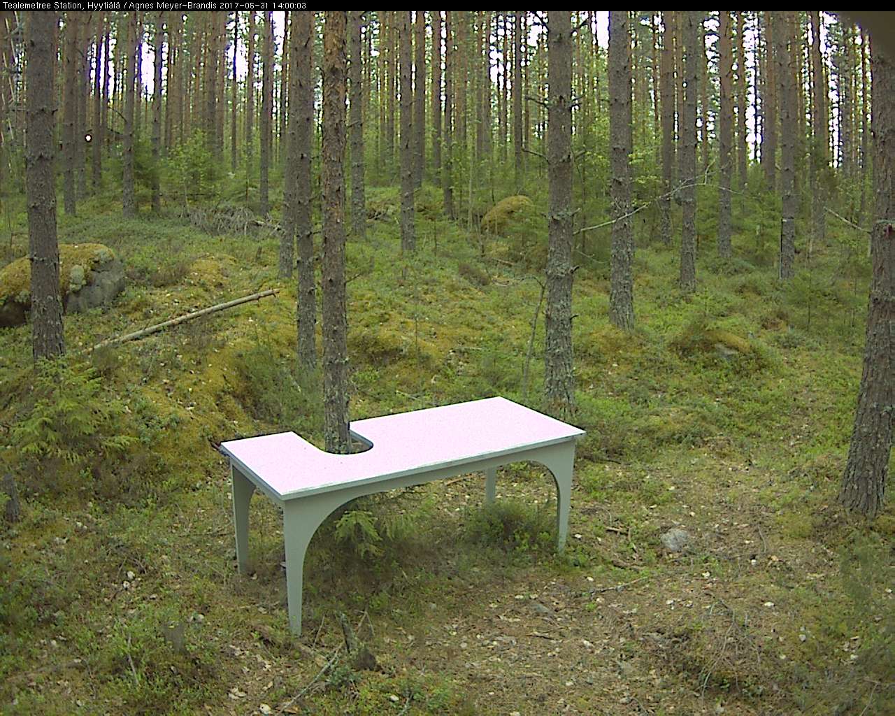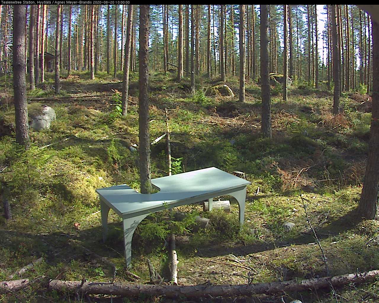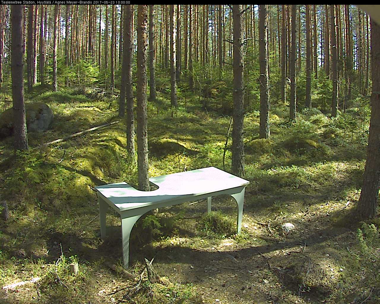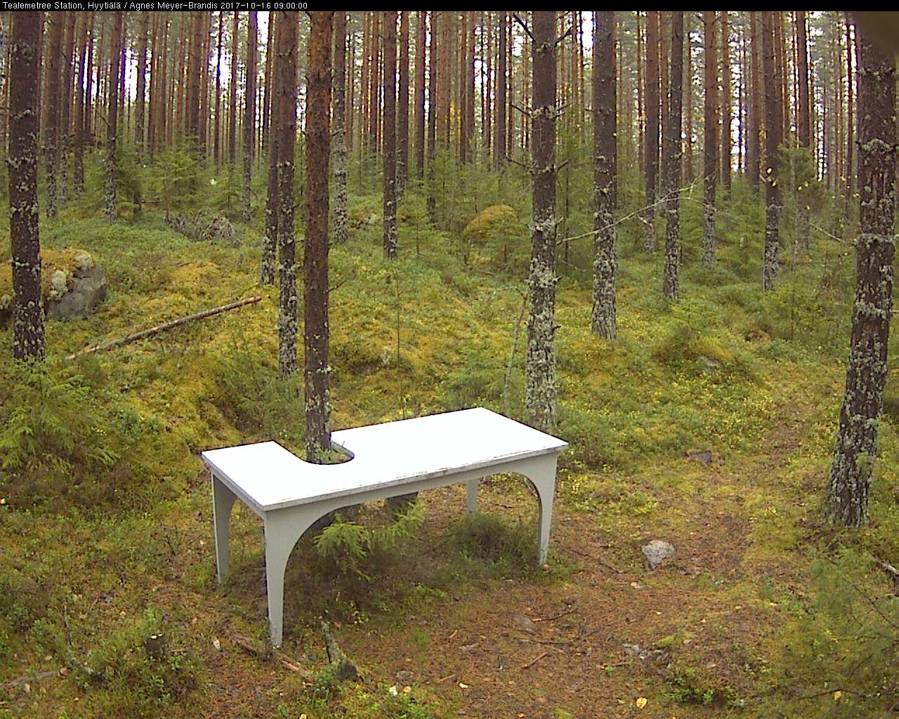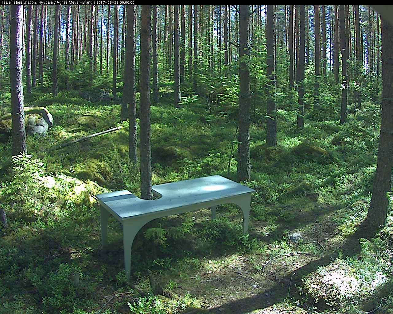 Agnes Meyer-Brandiksen työ Hyytiälässä alkoi tutustumalla aseman muihin tutkijoihin. Pystyäkseen tapaamaan ihmisiä metsässä, hän rakensi pöydän, josta muodostui kohtauspiste ja paikka teehetkille Agneksen ja puun kanssa.
