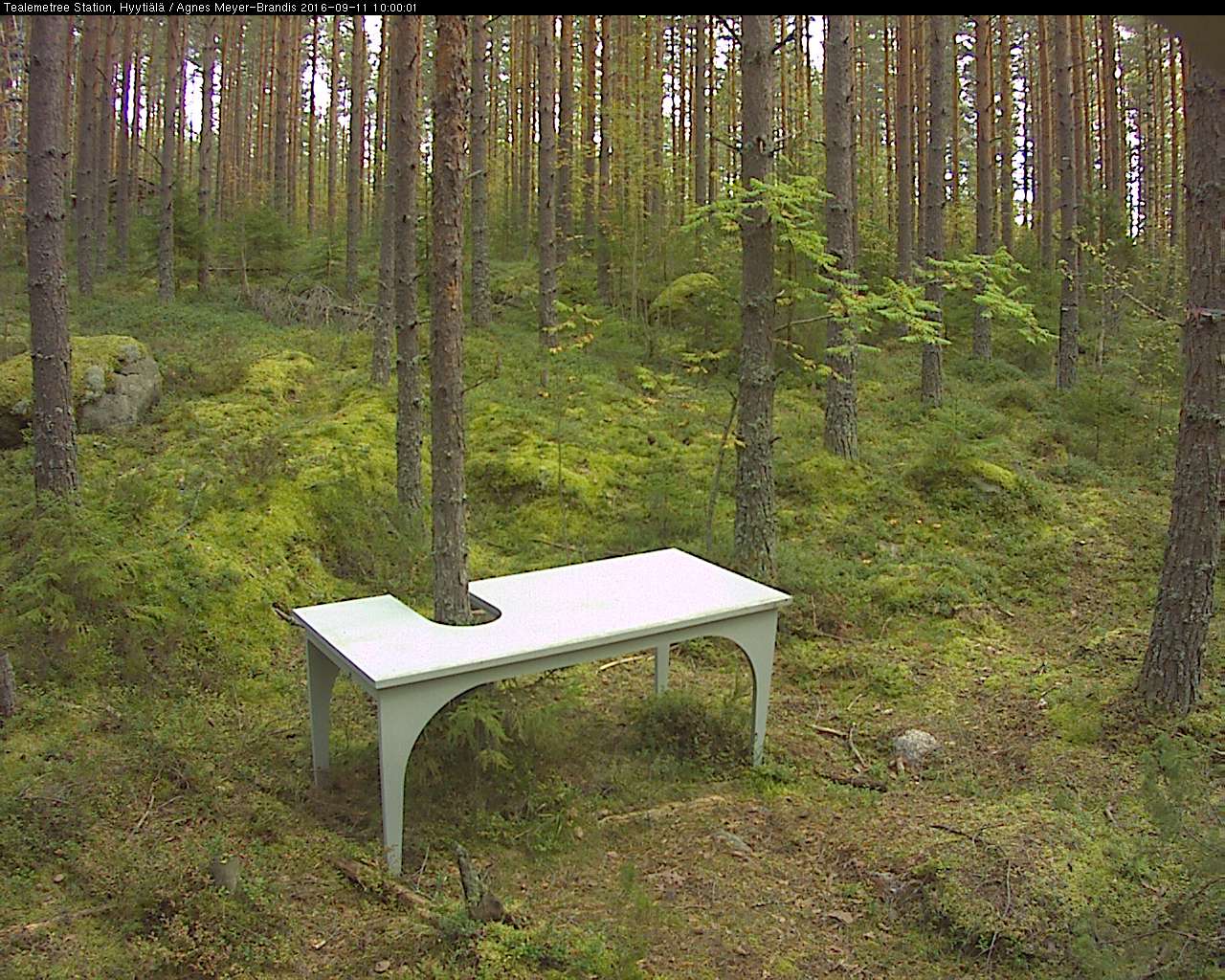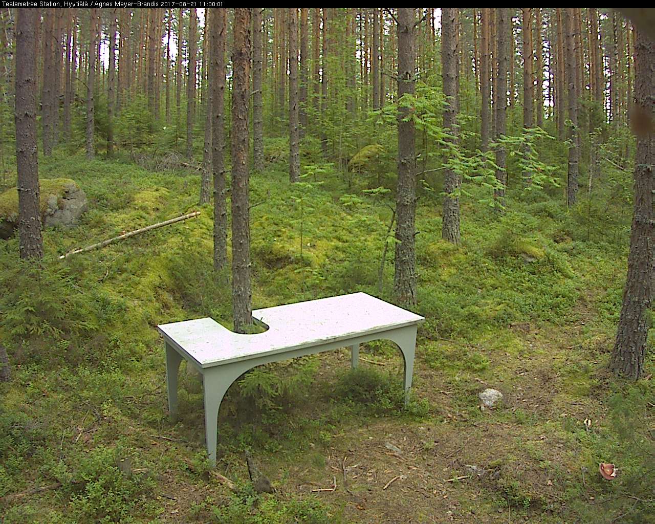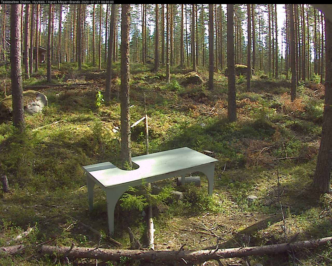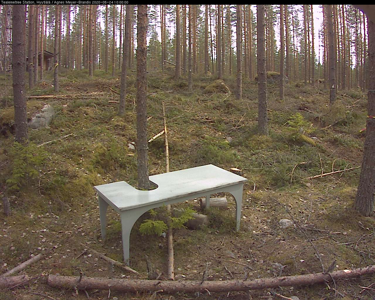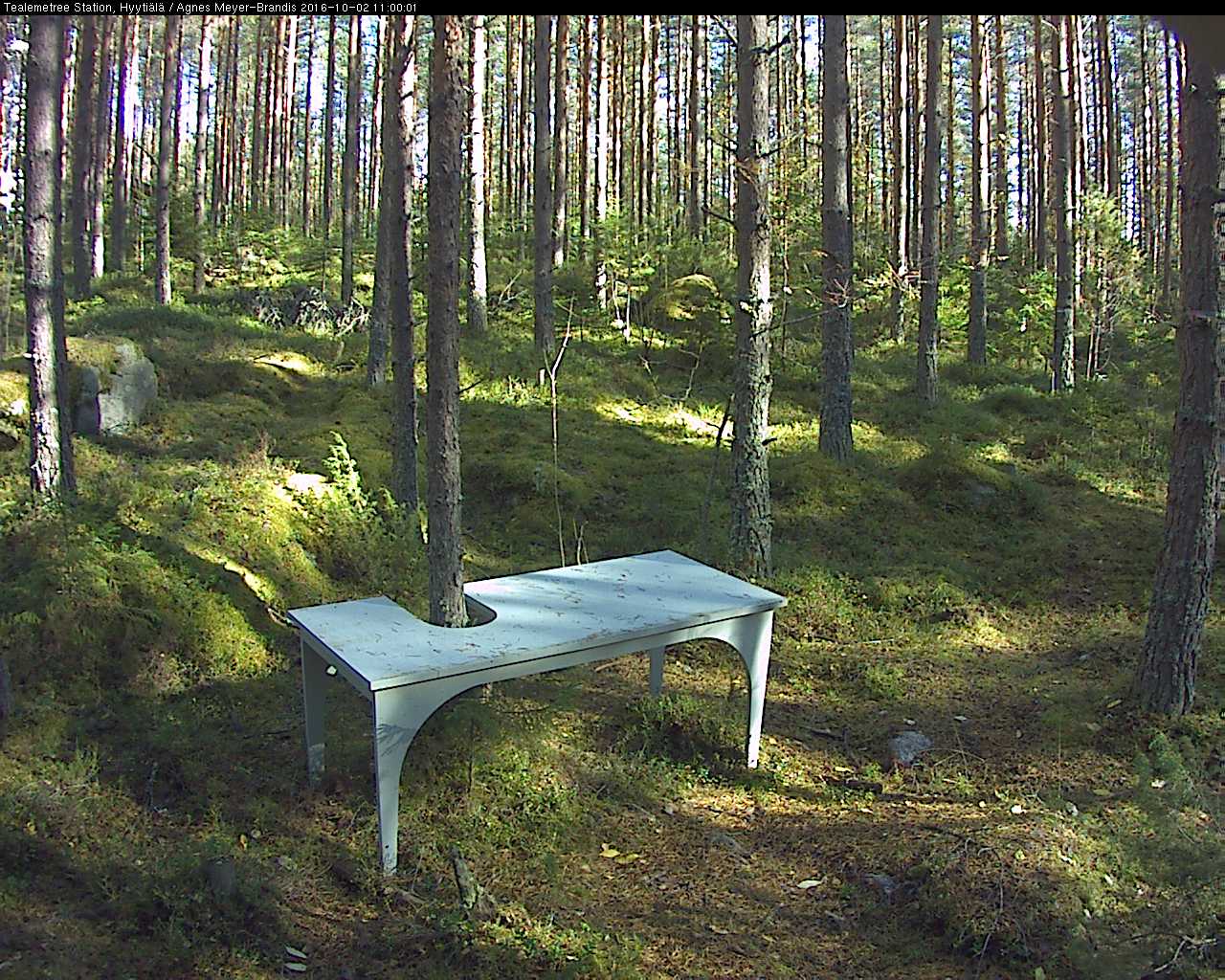 Agnes Meyer-Brandiksen työ Hyytiälässä alkoi tutustumalla aseman muihin tutkijoihin. Pystyäkseen tapaamaan ihmisiä metsässä, hän rakensi pöydän, josta muodostui kohtauspiste ja paikka teehetkille Agneksen ja puun kanssa.