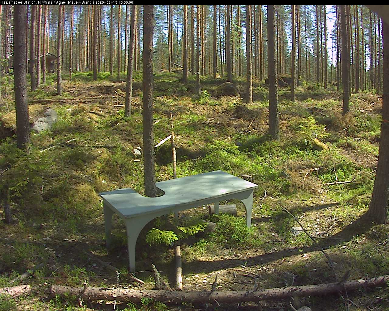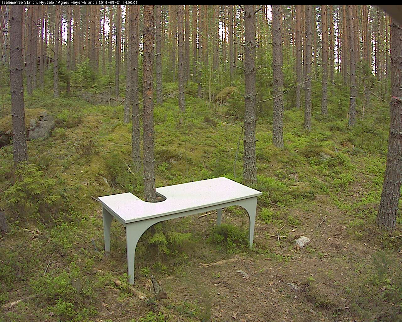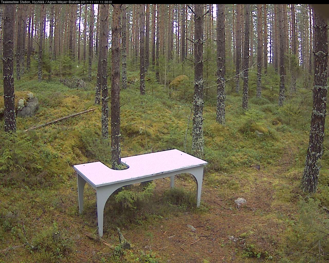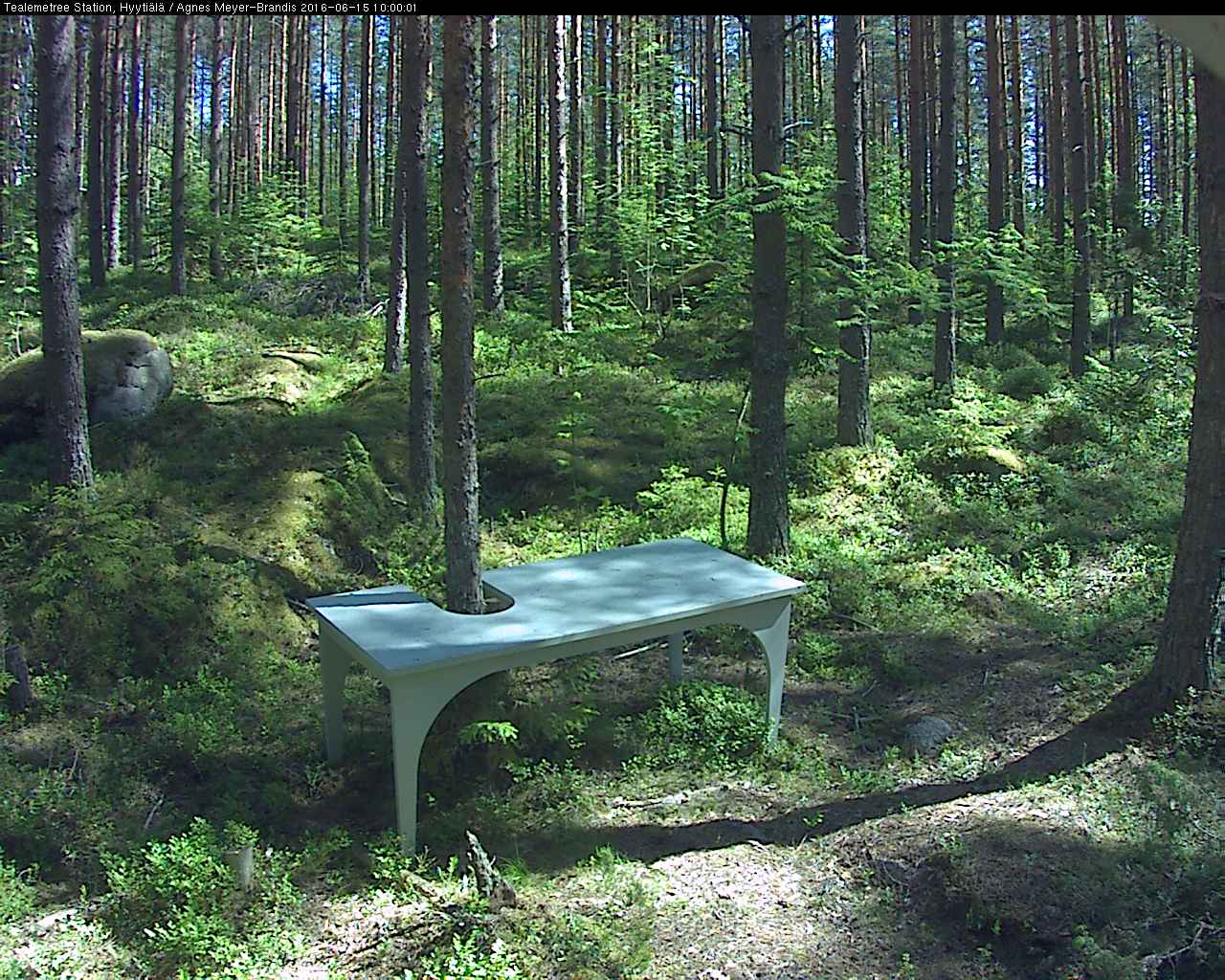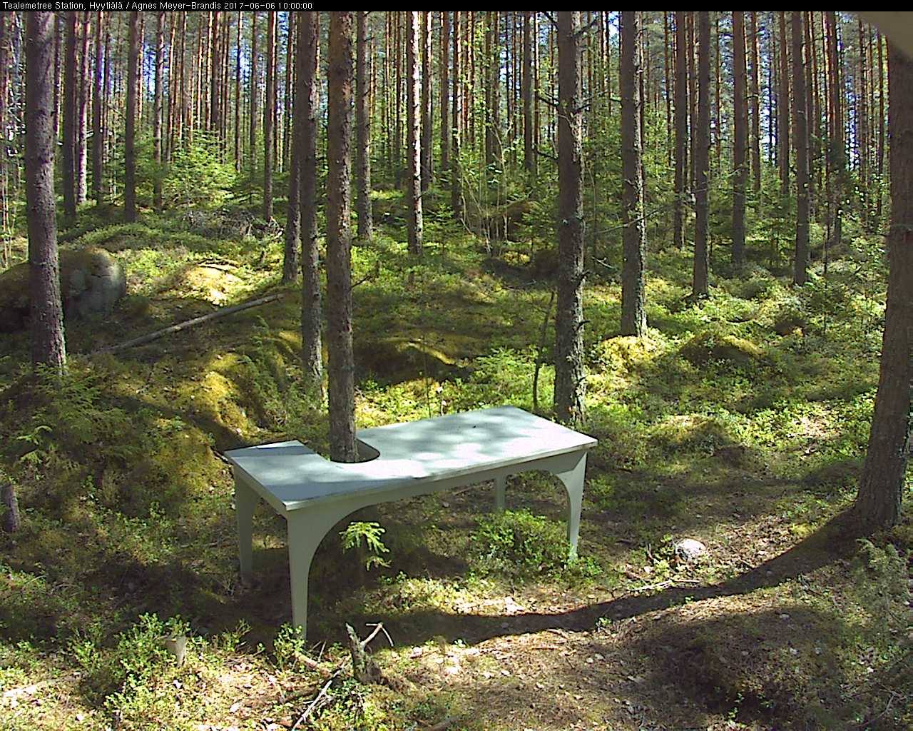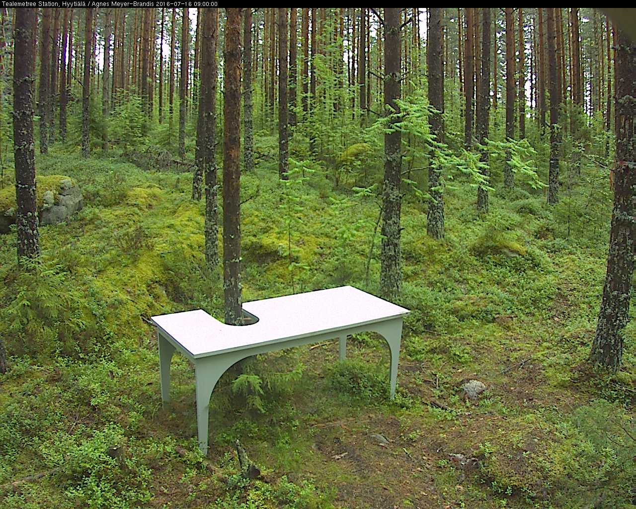 Agnes Meyer-Brandiksen työ Hyytiälässä alkoi tutustumalla aseman muihin tutkijoihin. Pystyäkseen tapaamaan ihmisiä metsässä, hän rakensi pöydän, josta muodostui kohtauspiste ja paikka teehetkille Agneksen ja puun kanssa.