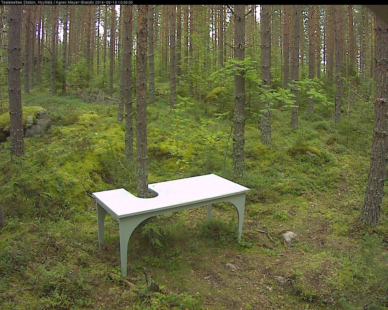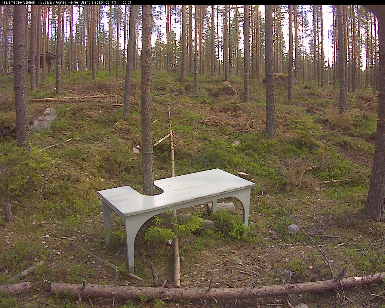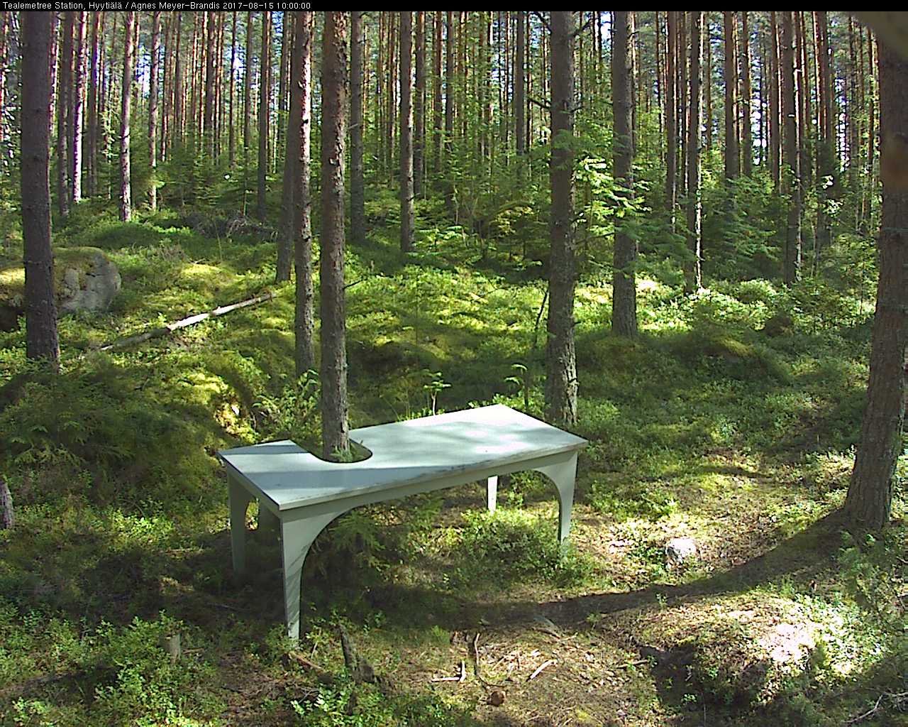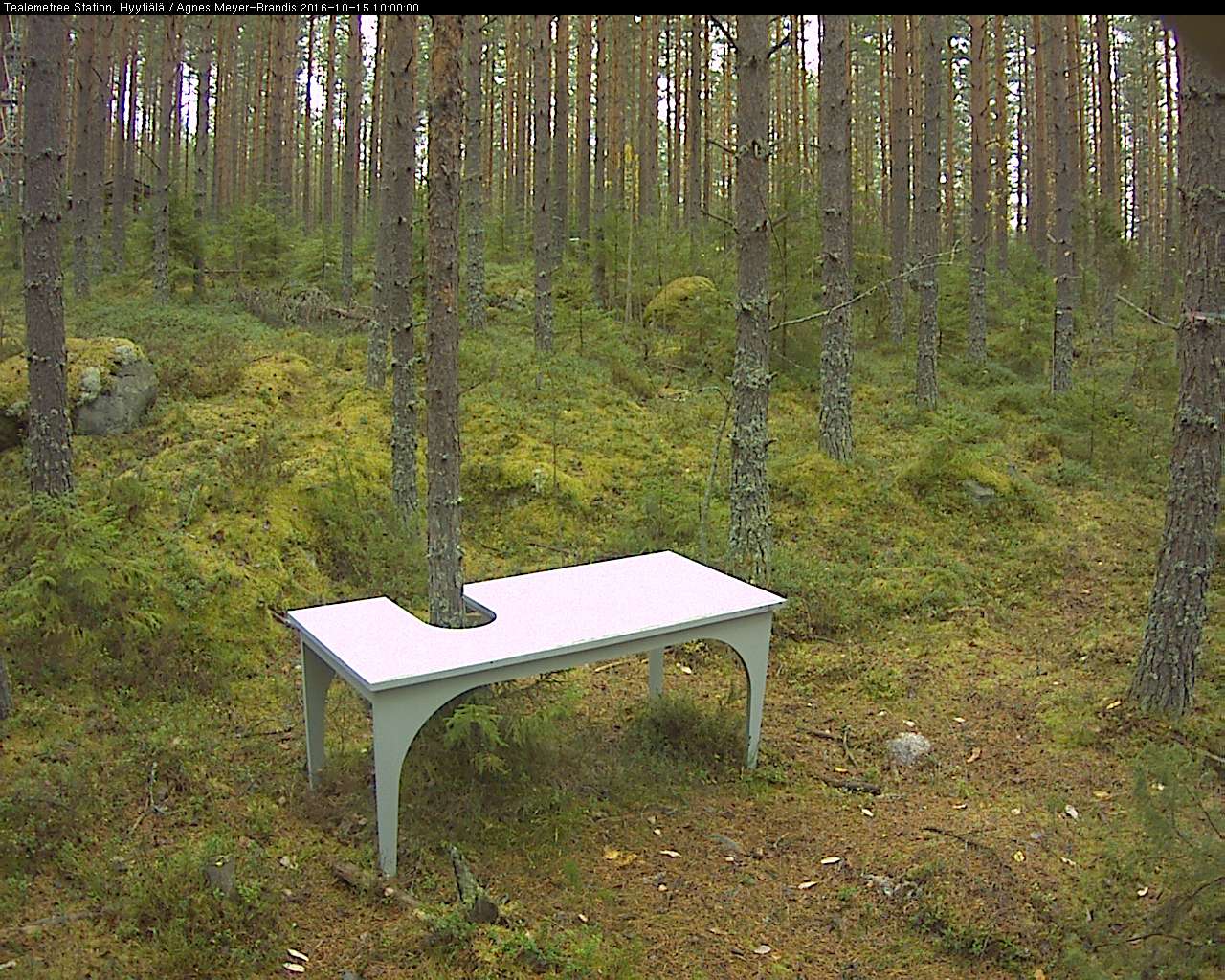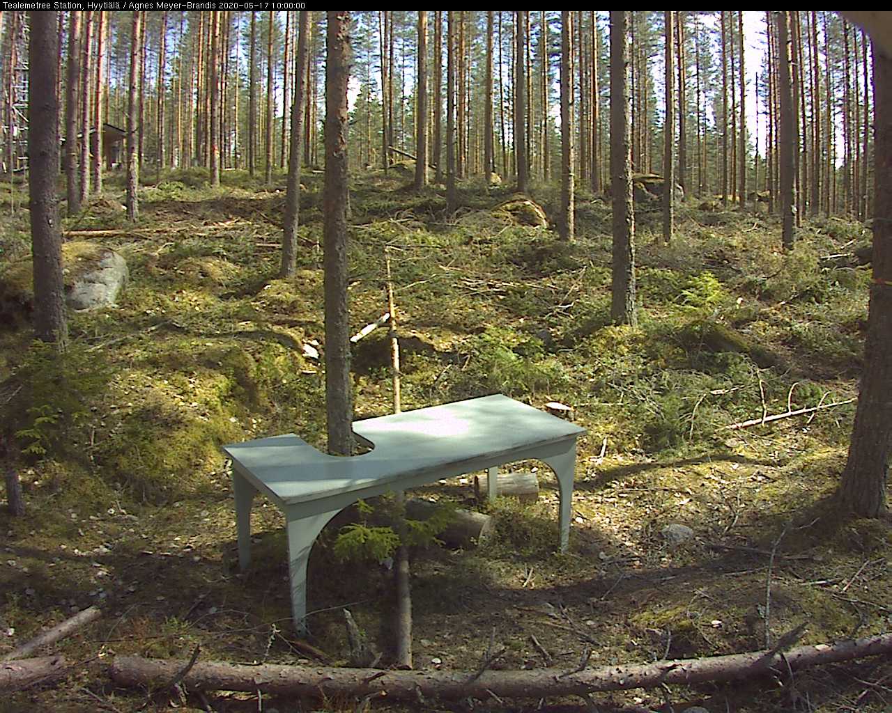 Agnes Meyer-Brandiksen työ Hyytiälässä alkoi tutustumalla aseman muihin tutkijoihin. Pystyäkseen tapaamaan ihmisiä metsässä, hän rakensi pöydän, josta muodostui kohtauspiste ja paikka teehetkille Agneksen ja puun kanssa.