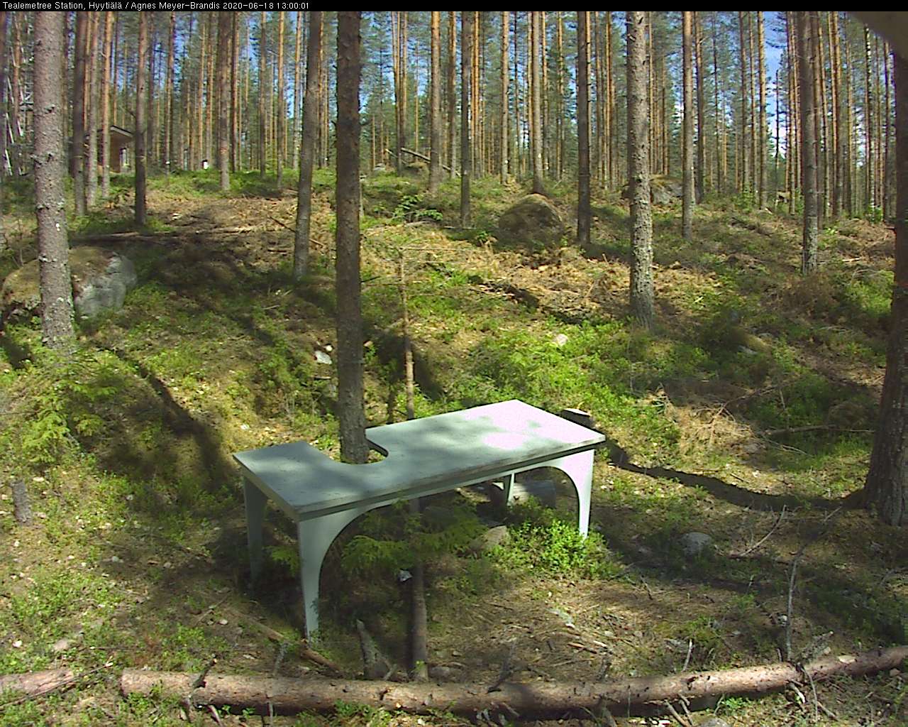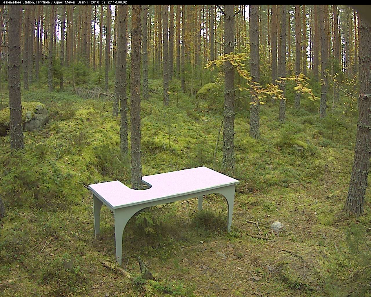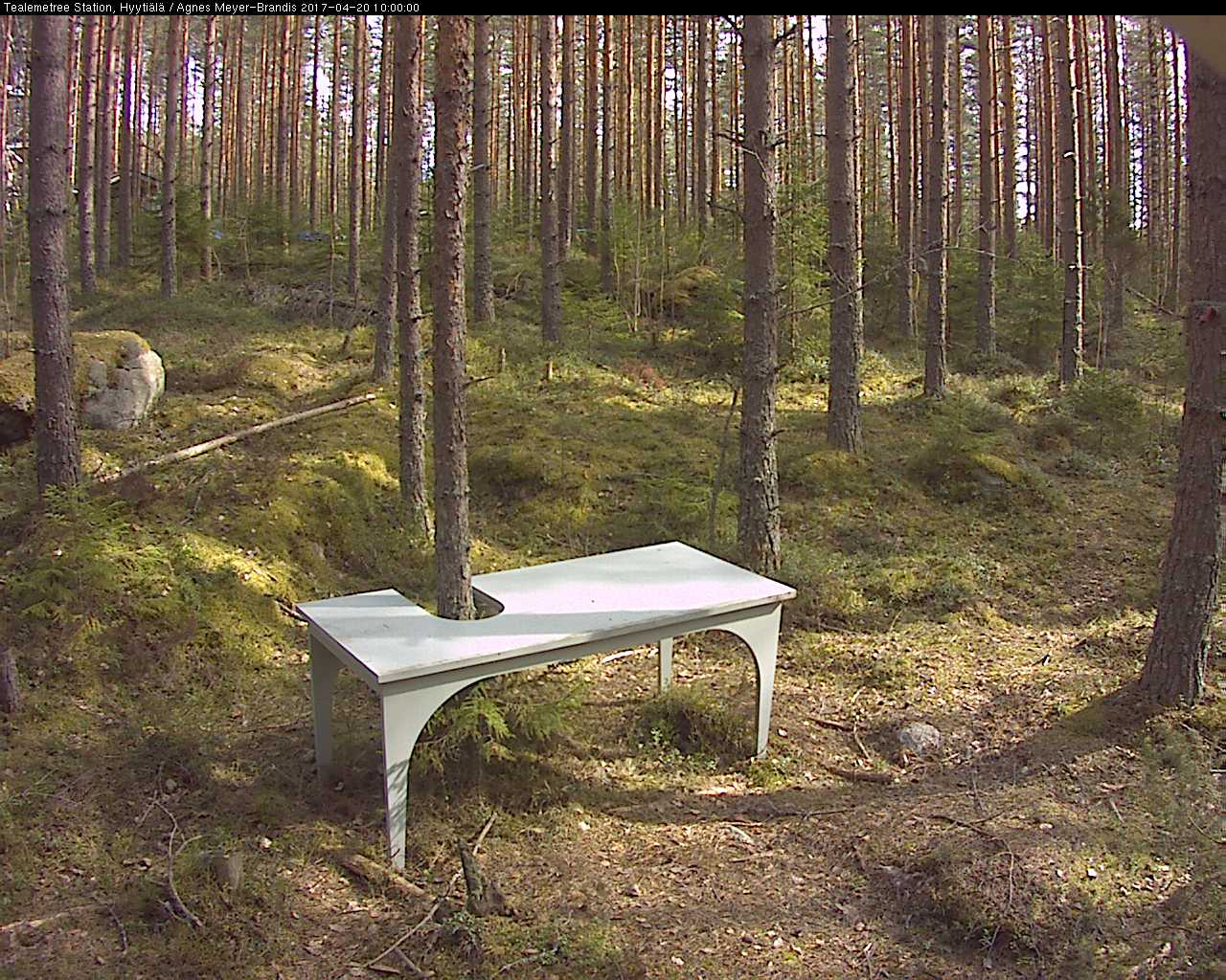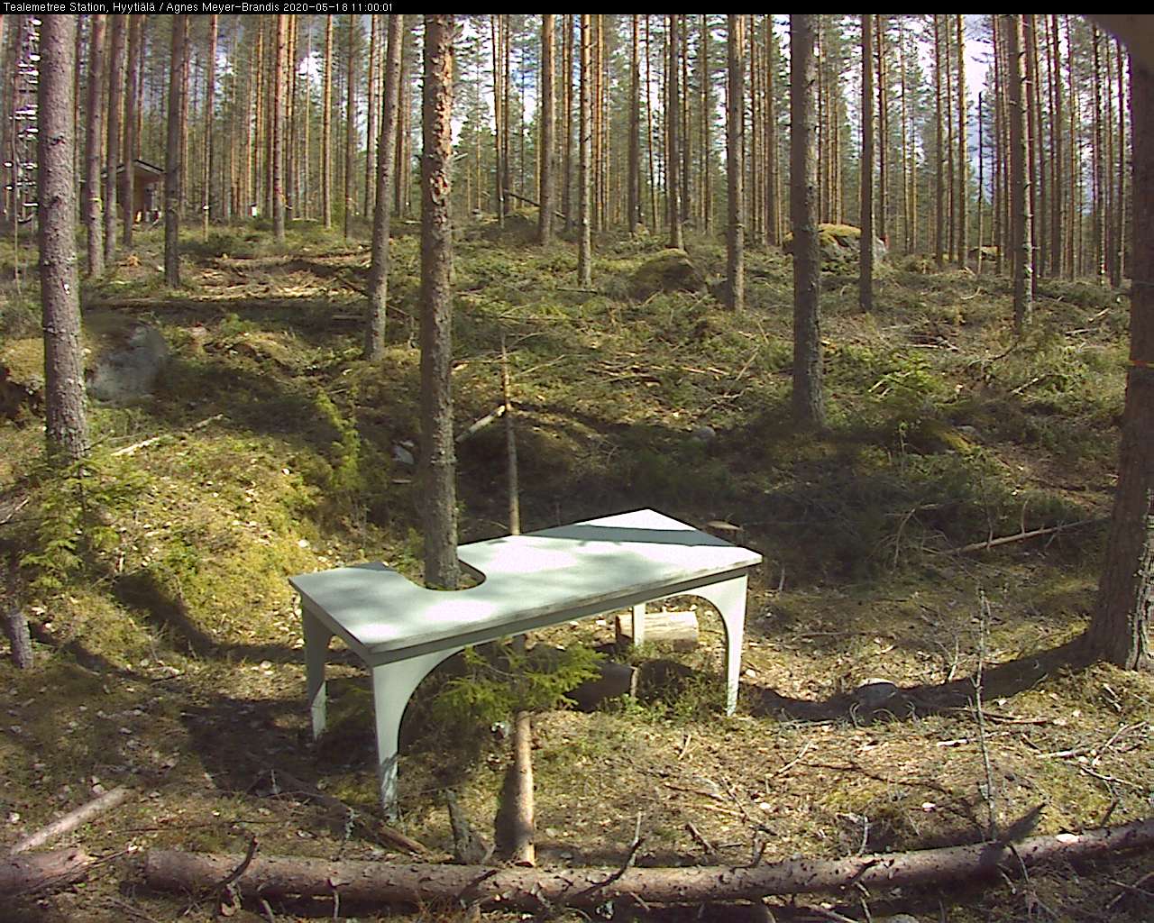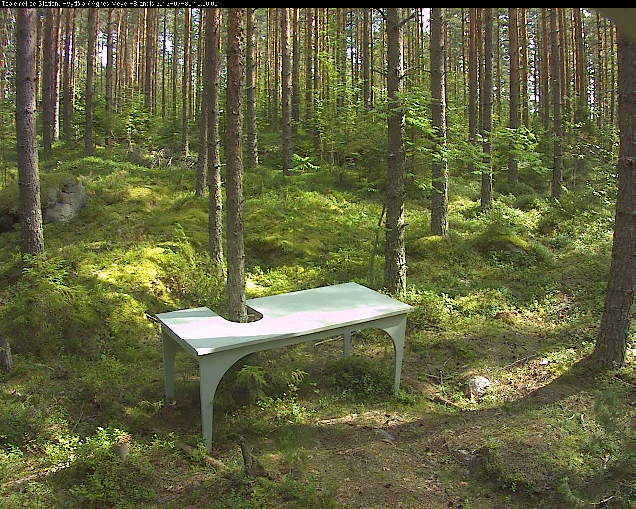 Agnes Meyer-Brandiksen työ Hyytiälässä alkoi tutustumalla aseman muihin tutkijoihin. Pystyäkseen tapaamaan ihmisiä metsässä, hän rakensi pöydän, josta muodostui kohtauspiste ja paikka teehetkille Agneksen ja puun kanssa.