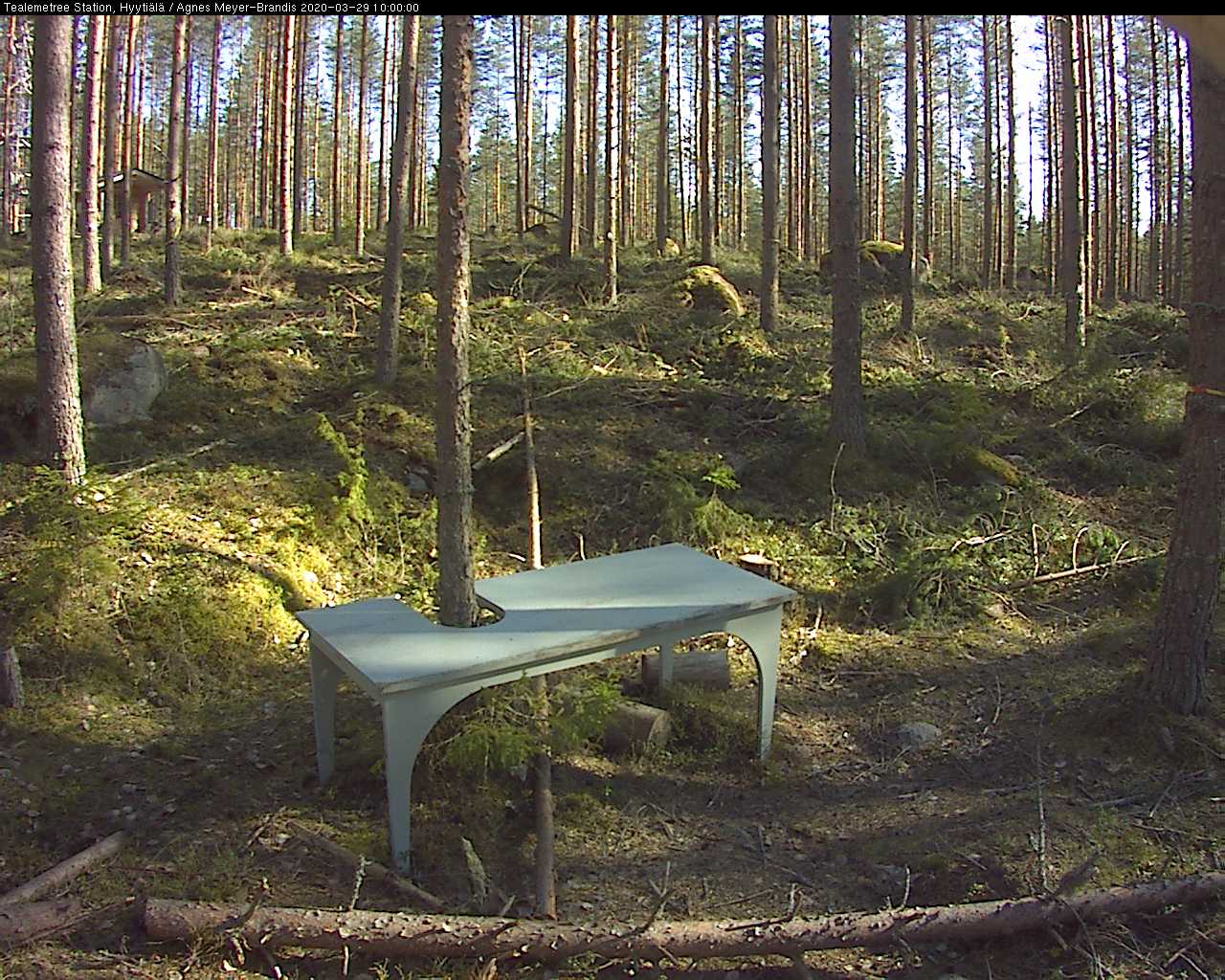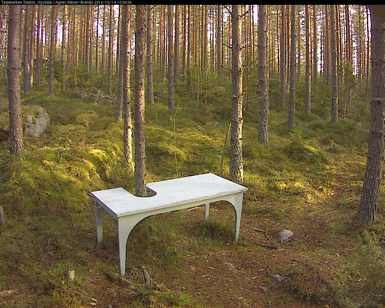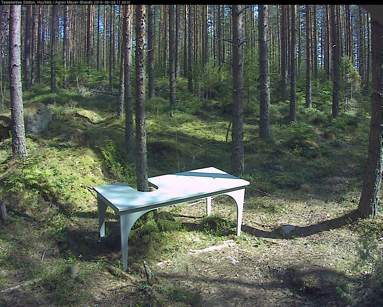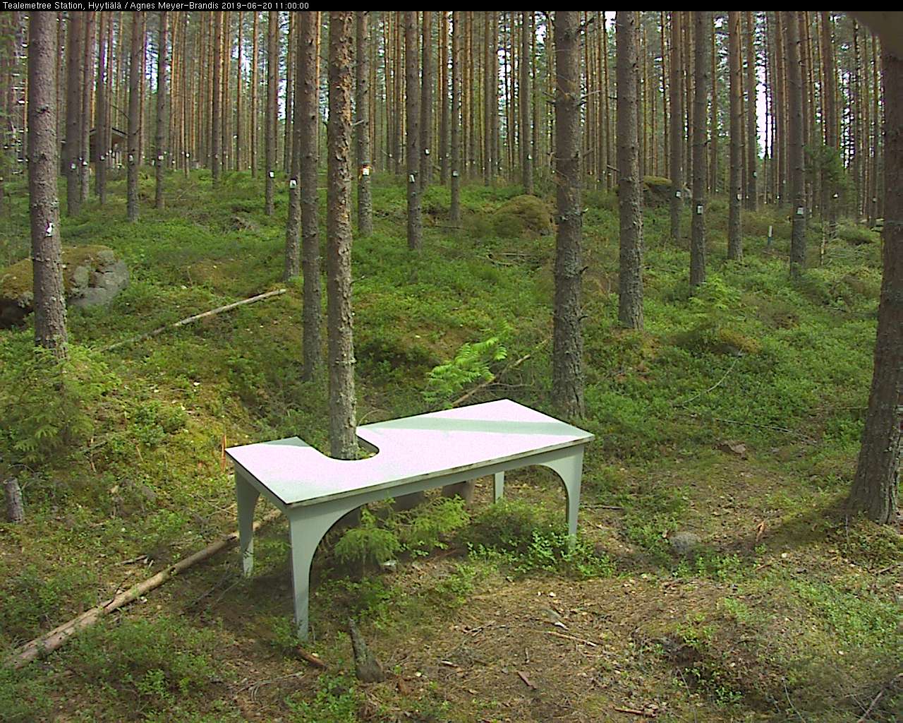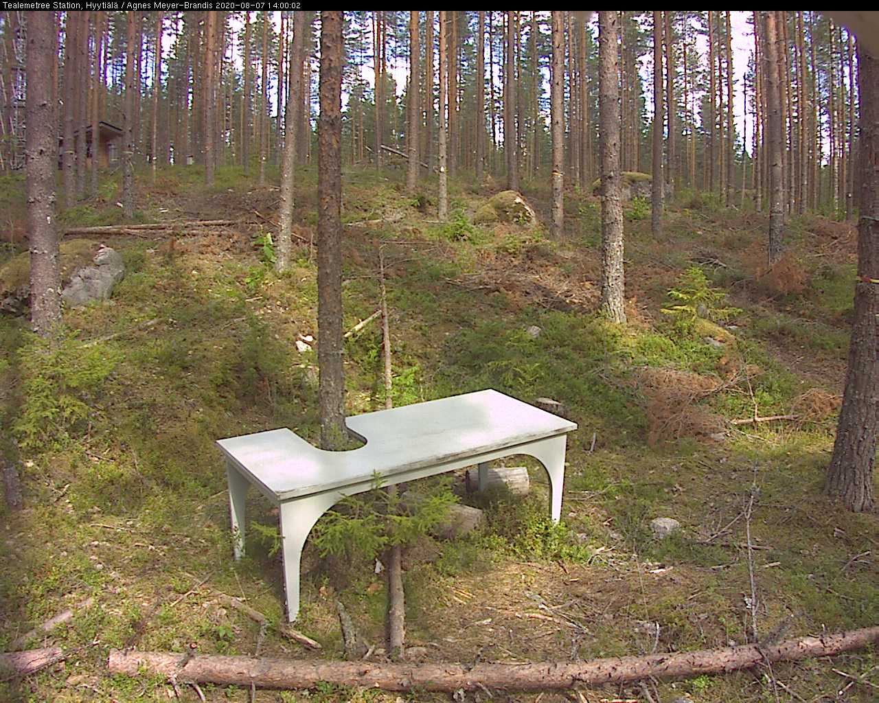 Agnes Meyer-Brandiksen työ Hyytiälässä alkoi tutustumalla aseman muihin tutkijoihin. Pystyäkseen tapaamaan ihmisiä metsässä, hän rakensi pöydän, josta muodostui kohtauspiste ja paikka teehetkille Agneksen ja puun kanssa.