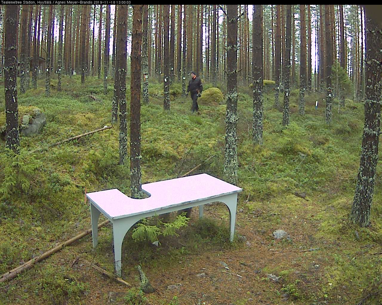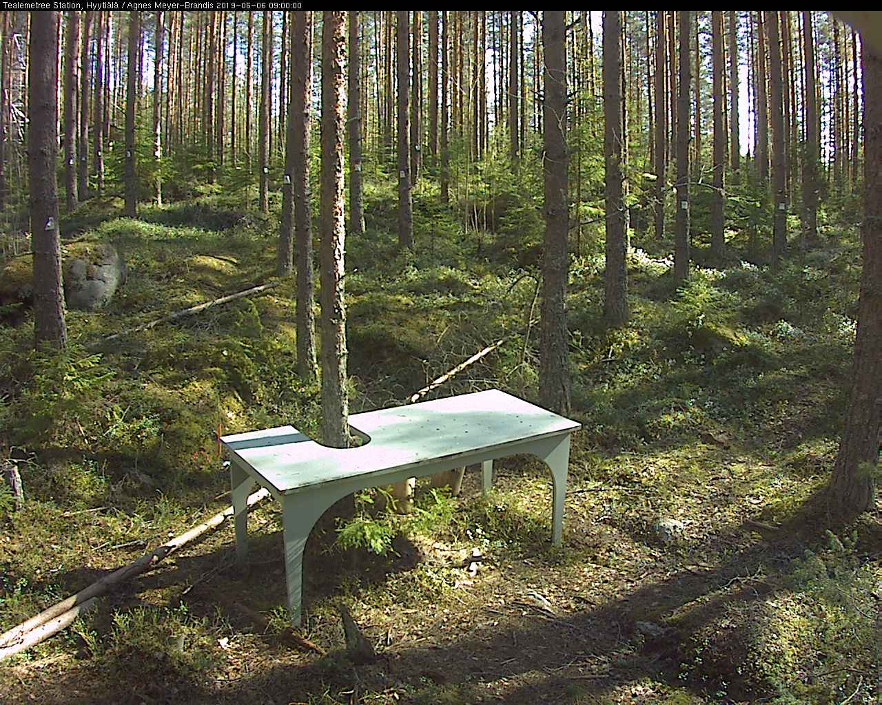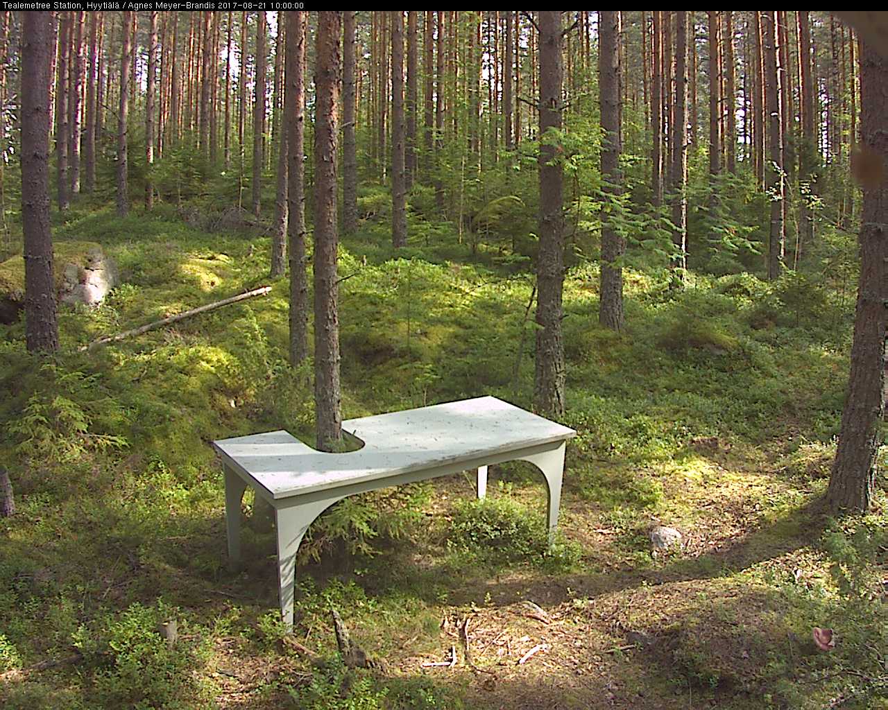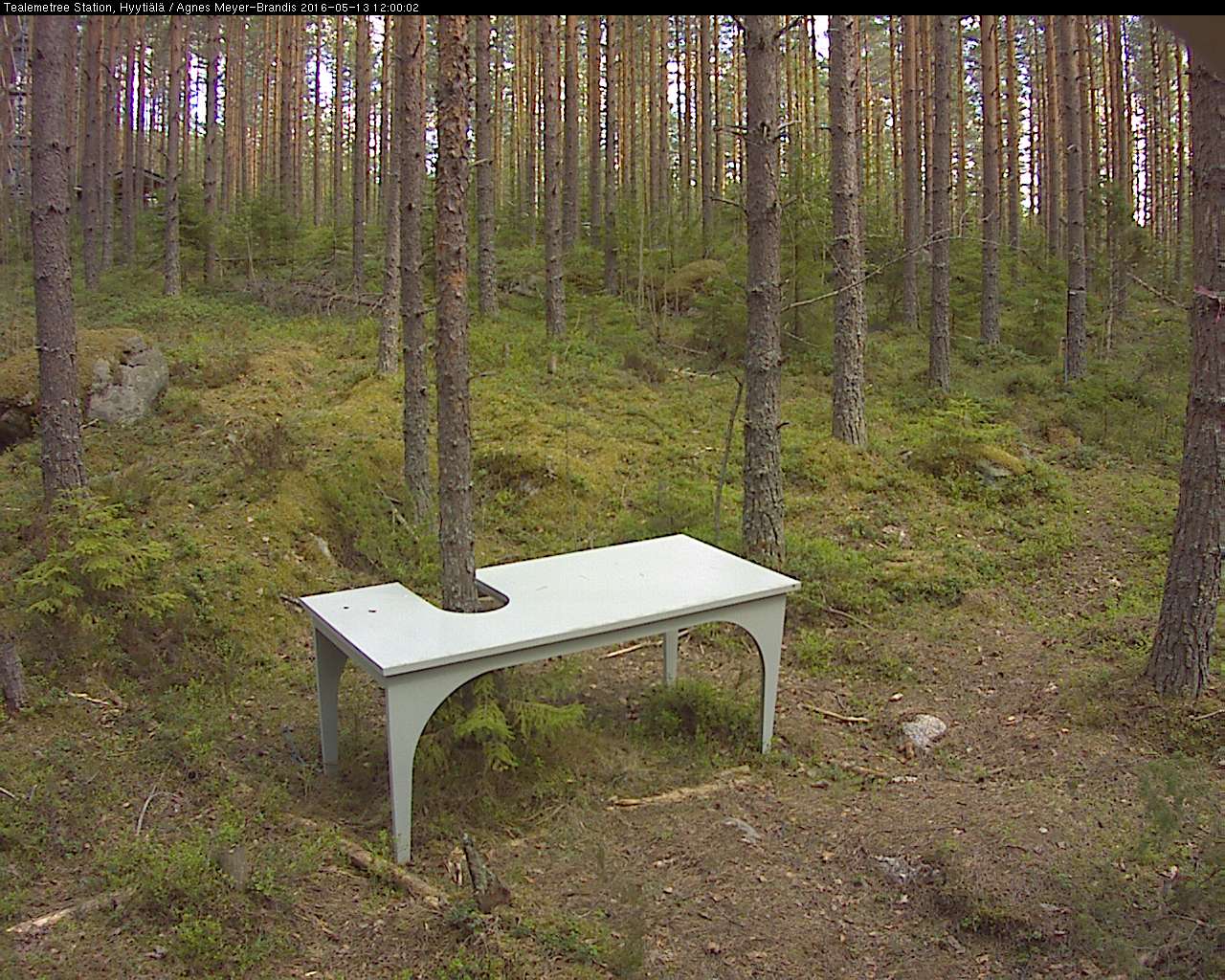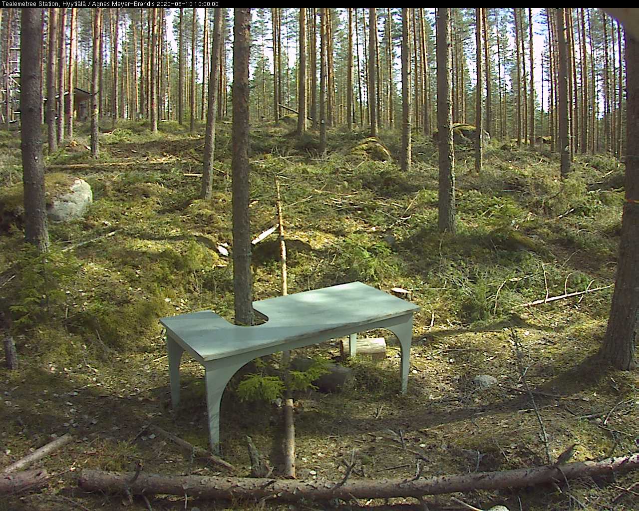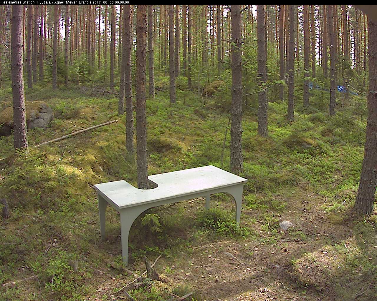Agnes Meyer-Brandiksen työ Hyytiälässä alkoi tutustumalla aseman muihin tutkijoihin. Pystyäkseen tapaamaan ihmisiä metsässä, hän rakensi pöydän, josta muodostui kohtauspiste ja paikka teehetkille Agneksen ja puun kanssa.