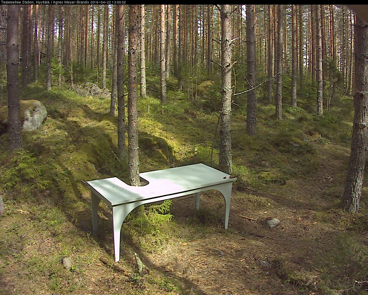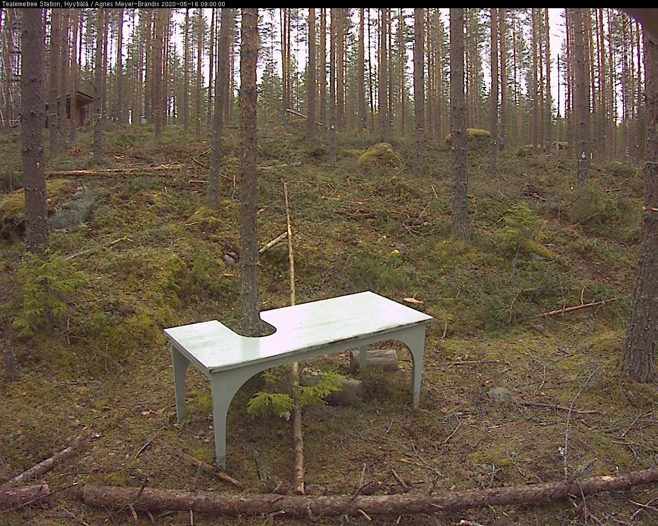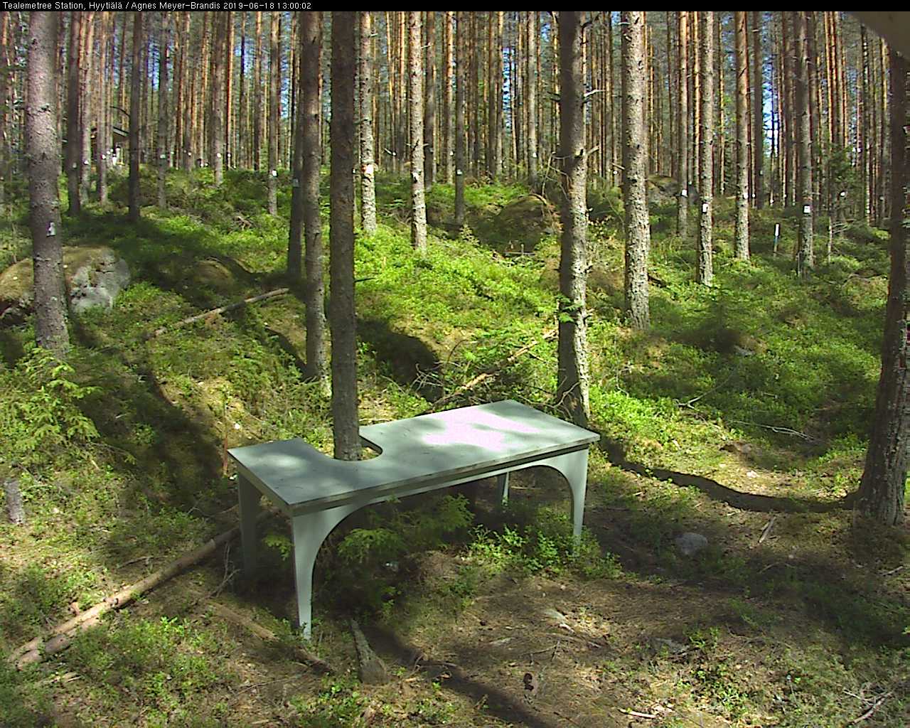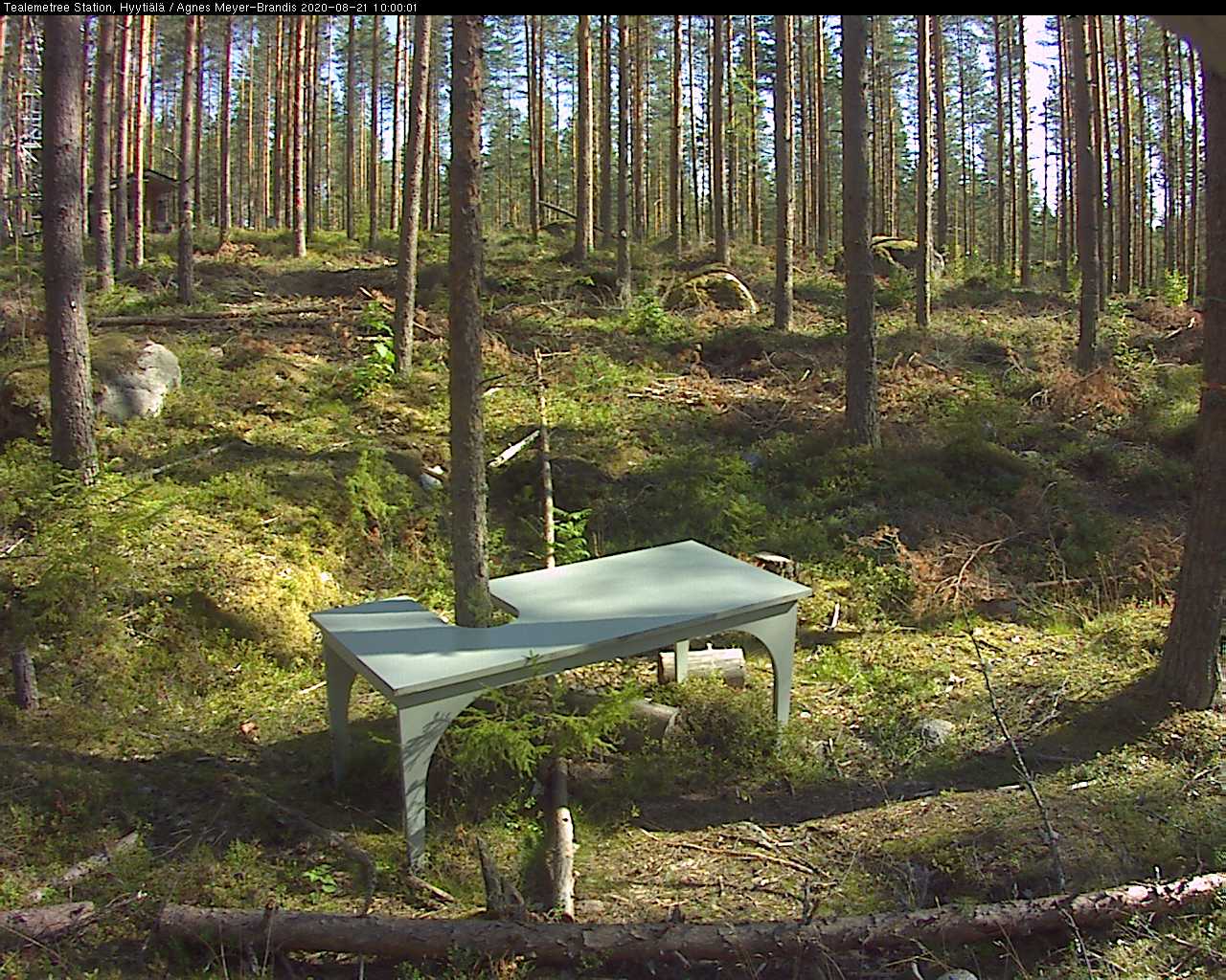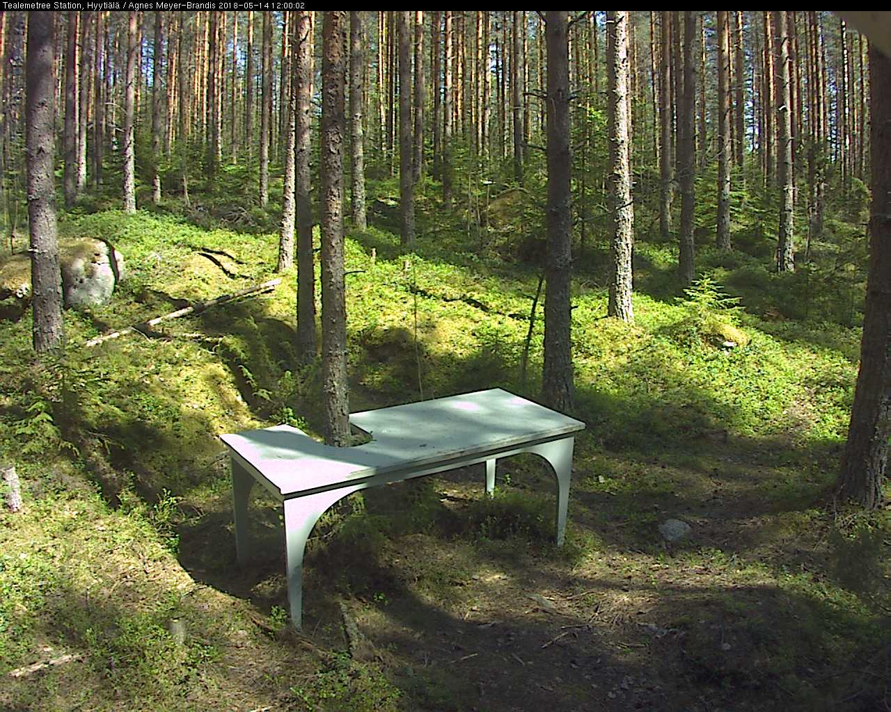 Agnes Meyer-Brandiksen työ Hyytiälässä alkoi tutustumalla aseman muihin tutkijoihin. Pystyäkseen tapaamaan ihmisiä metsässä, hän rakensi pöydän, josta muodostui kohtauspiste ja paikka teehetkille Agneksen ja puun kanssa.