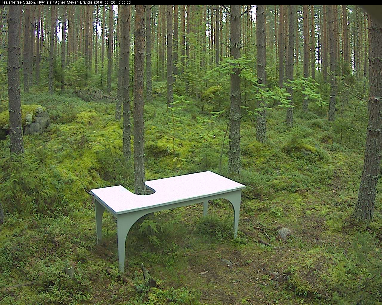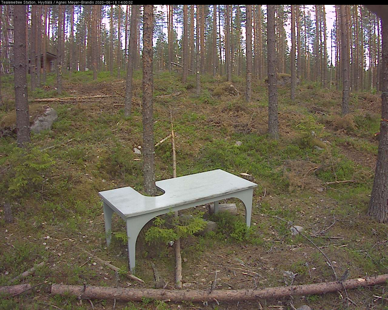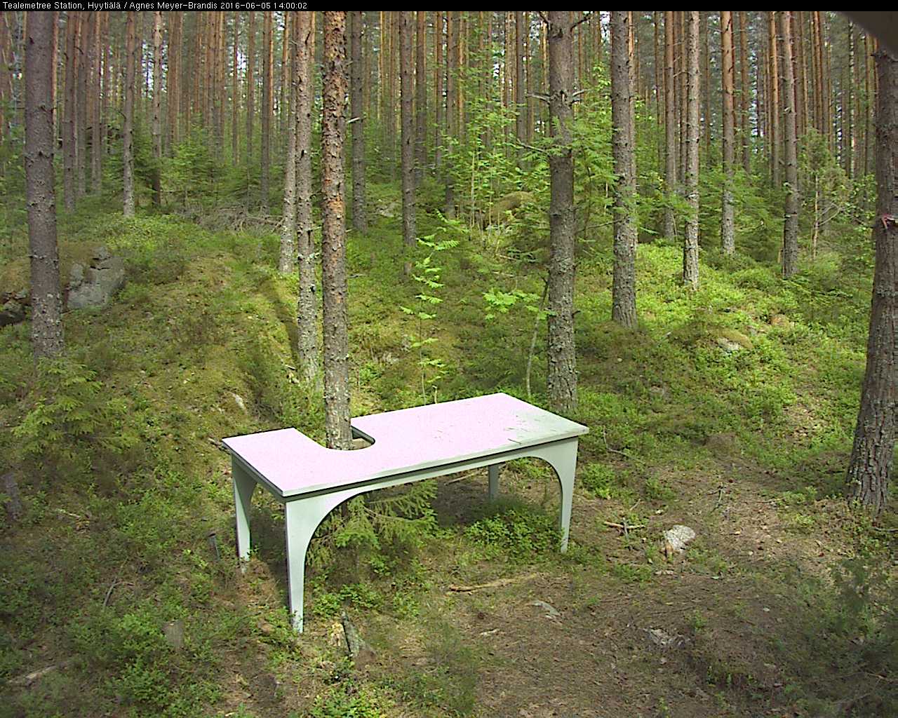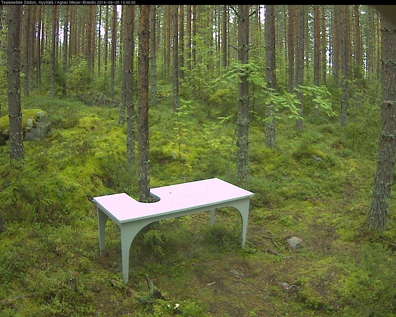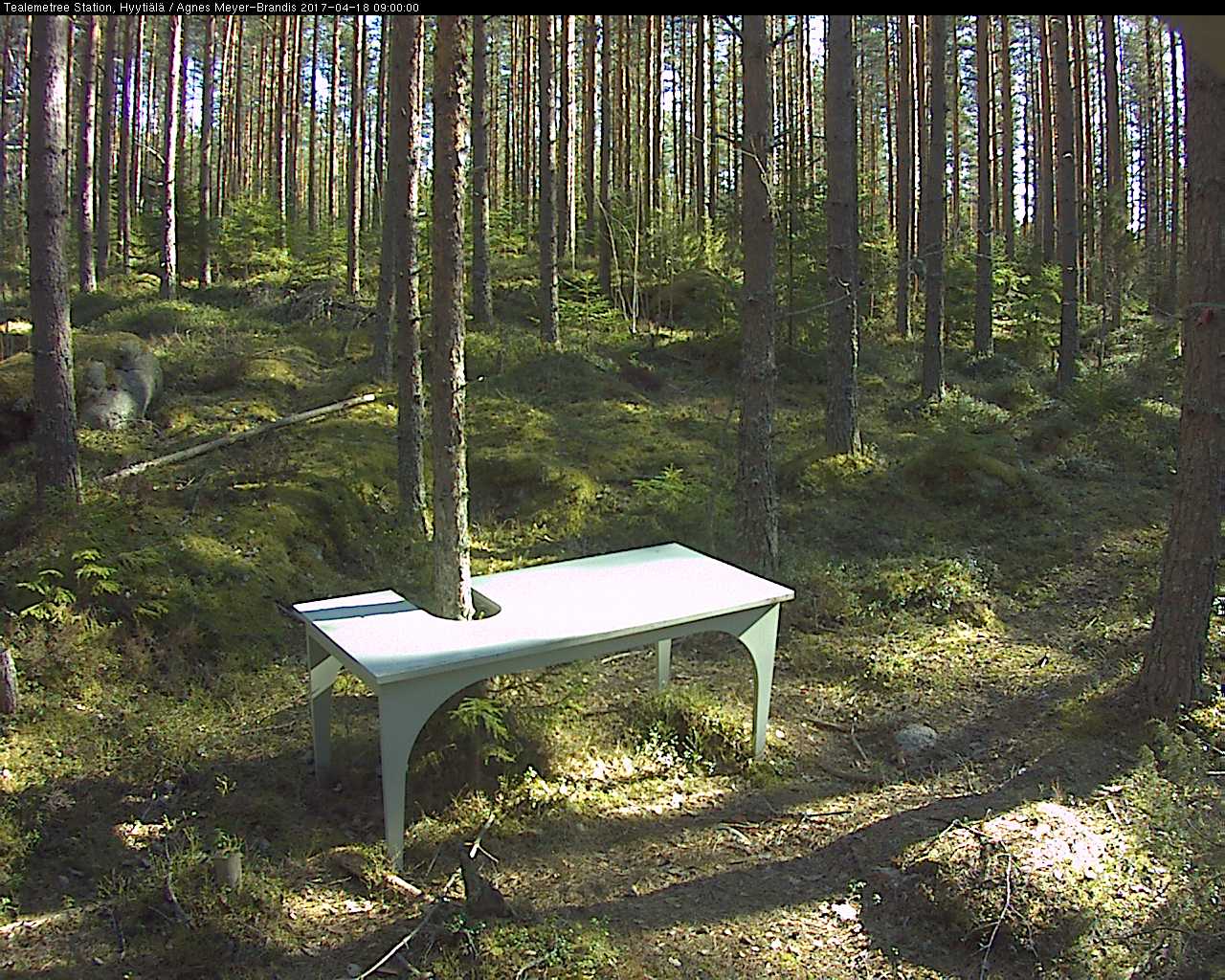 Agnes Meyer-Brandiksen työ Hyytiälässä alkoi tutustumalla aseman muihin tutkijoihin. Pystyäkseen tapaamaan ihmisiä metsässä, hän rakensi pöydän, josta muodostui kohtauspiste ja paikka teehetkille Agneksen ja puun kanssa.