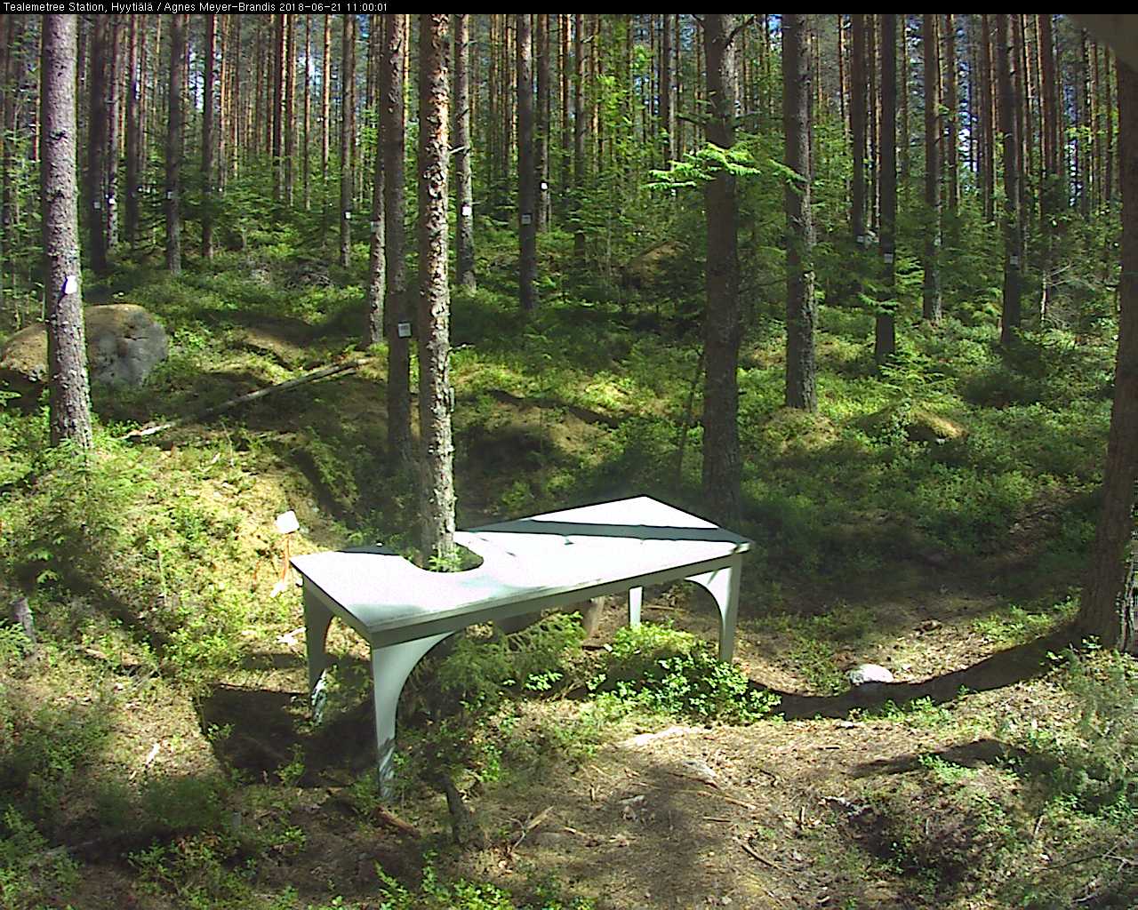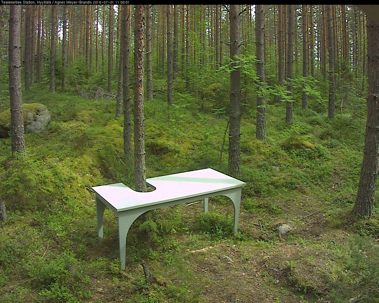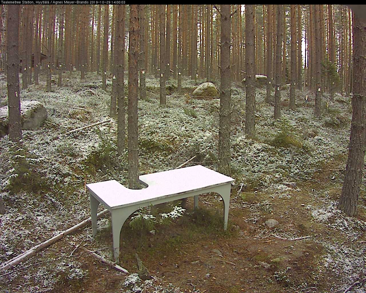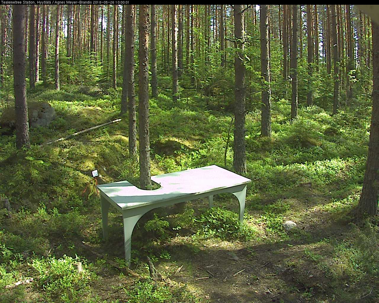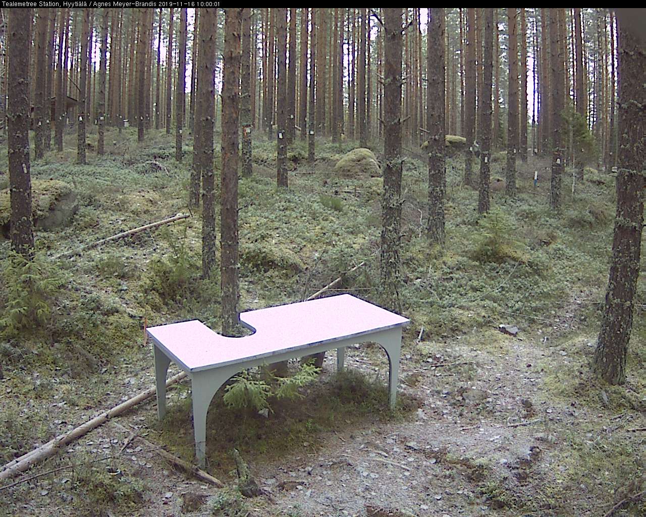 Agnes Meyer-Brandiksen työ Hyytiälässä alkoi tutustumalla aseman muihin tutkijoihin. Pystyäkseen tapaamaan ihmisiä metsässä, hän rakensi pöydän, josta muodostui kohtauspiste ja paikka teehetkille Agneksen ja puun kanssa.