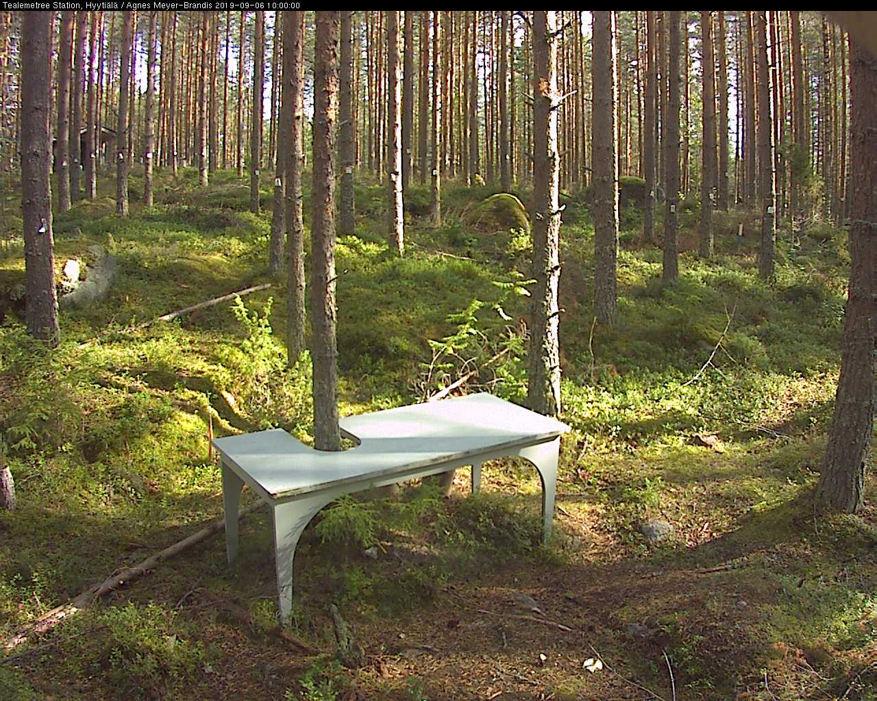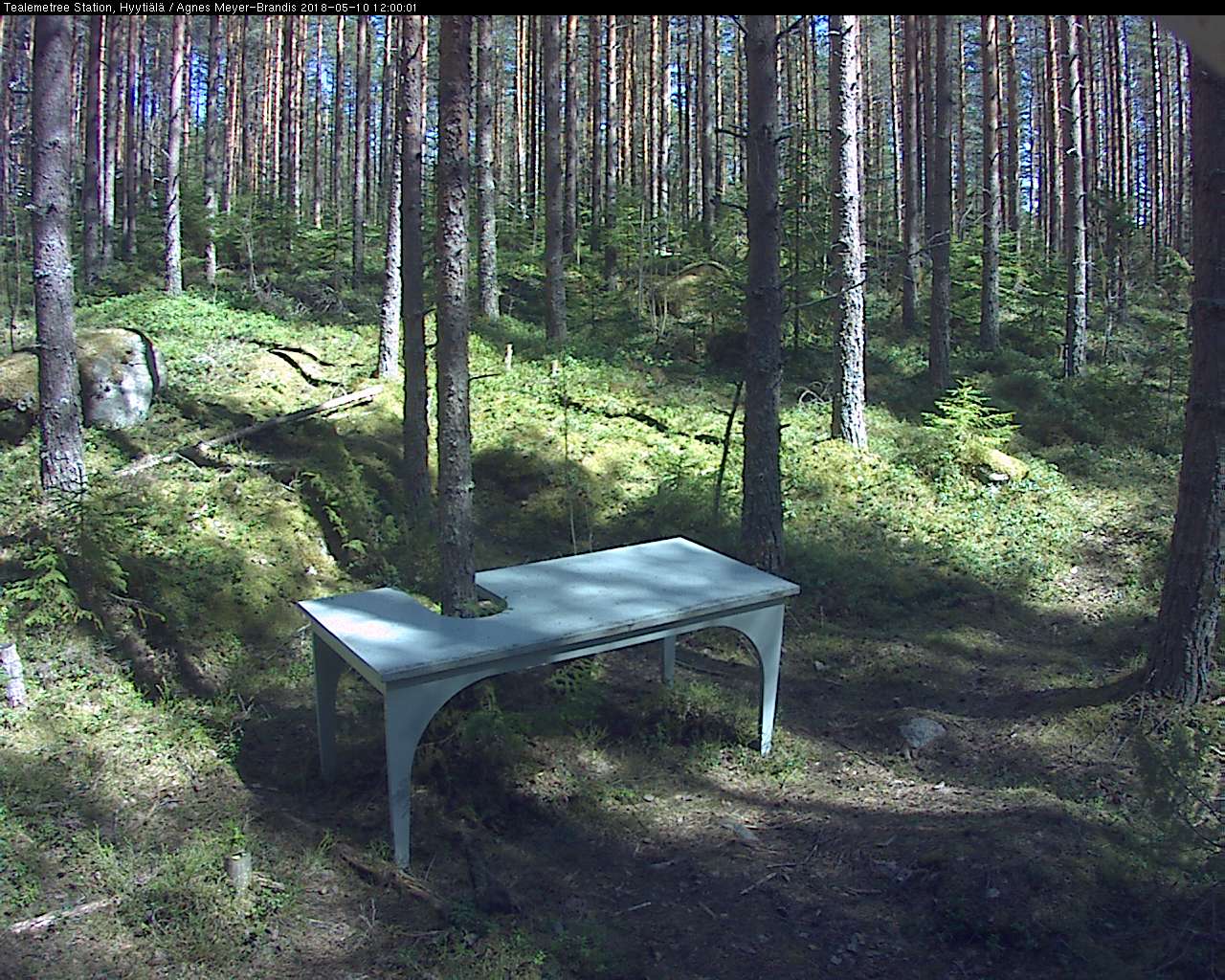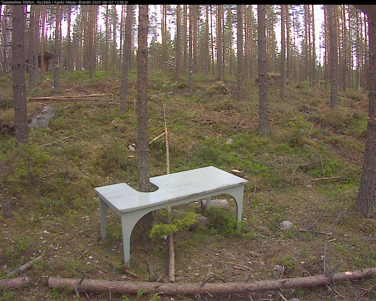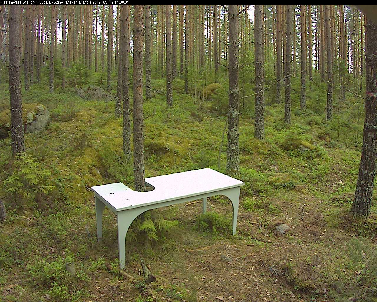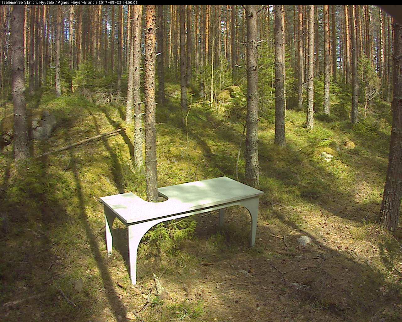 Agnes Meyer-Brandiksen työ Hyytiälässä alkoi tutustumalla aseman muihin tutkijoihin. Pystyäkseen tapaamaan ihmisiä metsässä, hän rakensi pöydän, josta muodostui kohtauspiste ja paikka teehetkille Agneksen ja puun kanssa.