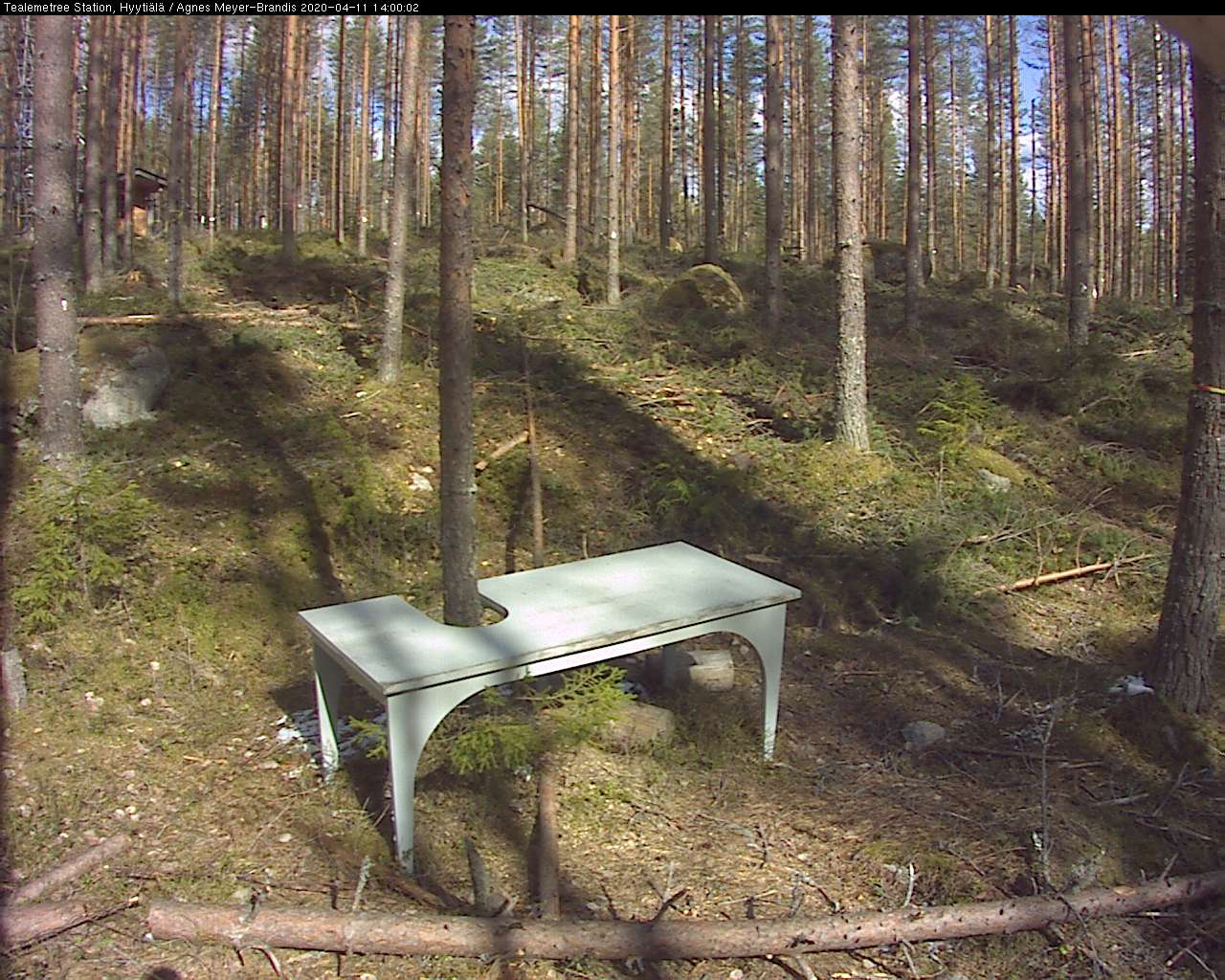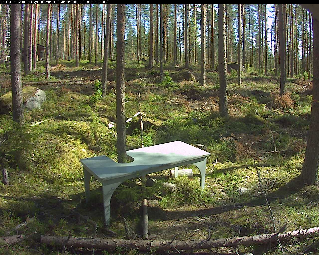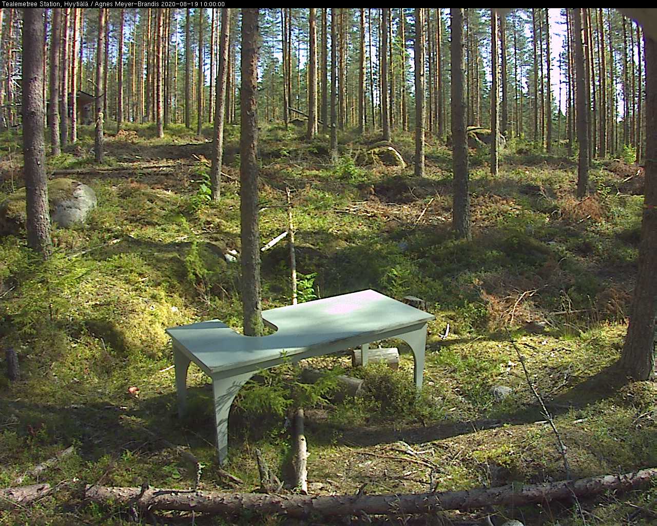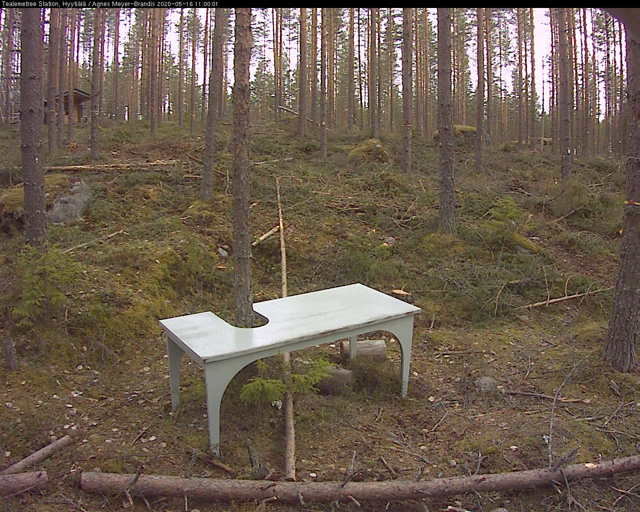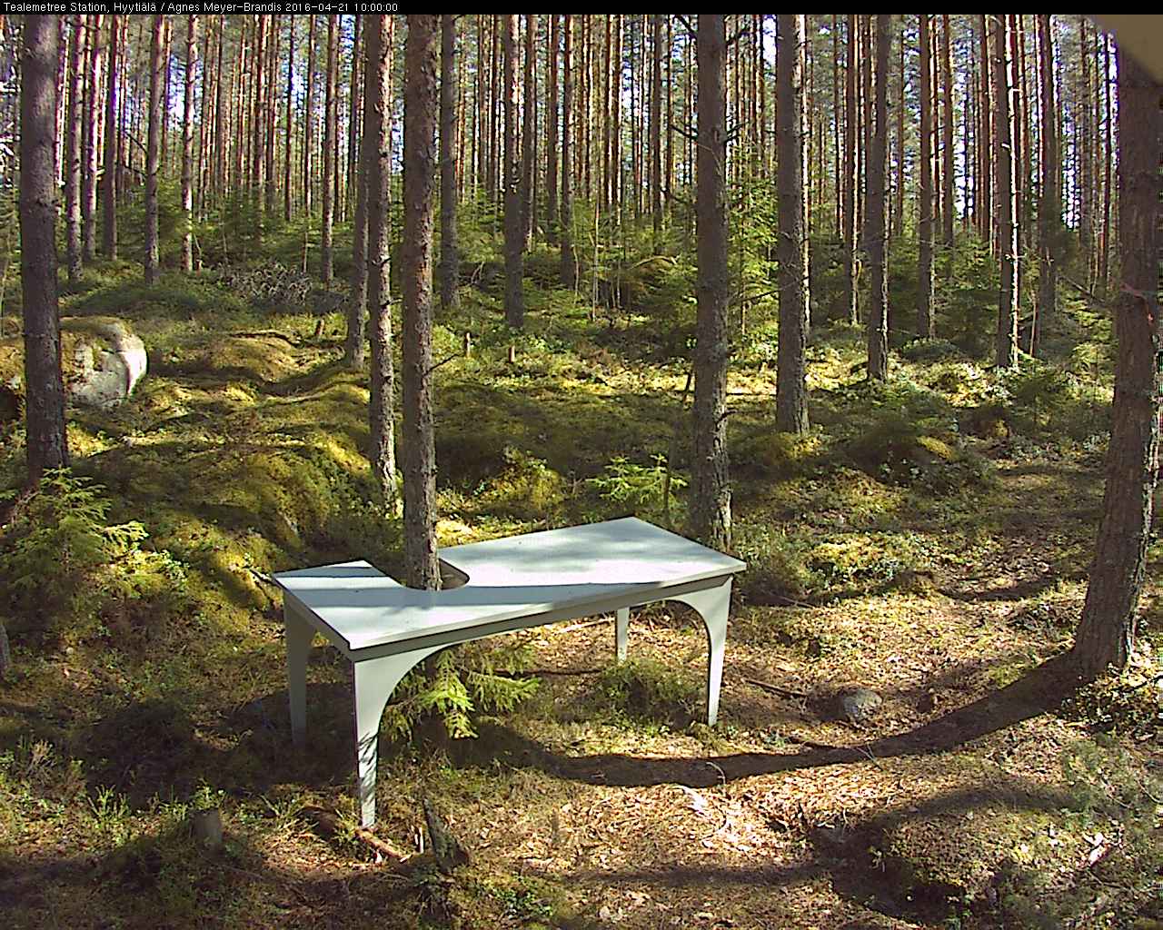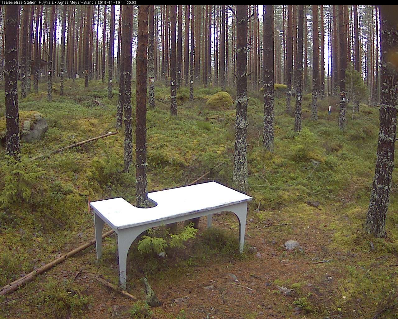 Agnes Meyer-Brandiksen työ Hyytiälässä alkoi tutustumalla aseman muihin tutkijoihin. Pystyäkseen tapaamaan ihmisiä metsässä, hän rakensi pöydän, josta muodostui kohtauspiste ja paikka teehetkille Agneksen ja puun kanssa.